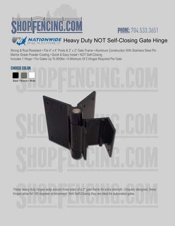 These heavy duty hinges wrap around three sides of a 2" gate frame for extra strength. Uniquely designed, these hinges allow for 180 degrees of movement. Non Self-Closing they are ideal for automated gates.