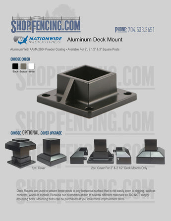 Deck Mounts are used to secure fence posts to any horizontal surface that is not easily open to digging such as concrete, wood or asphalt. Because our customers attach to several different materials we DO NOT supply mounting bolts. Mounting bolts can be purchased at you local home improvement store.