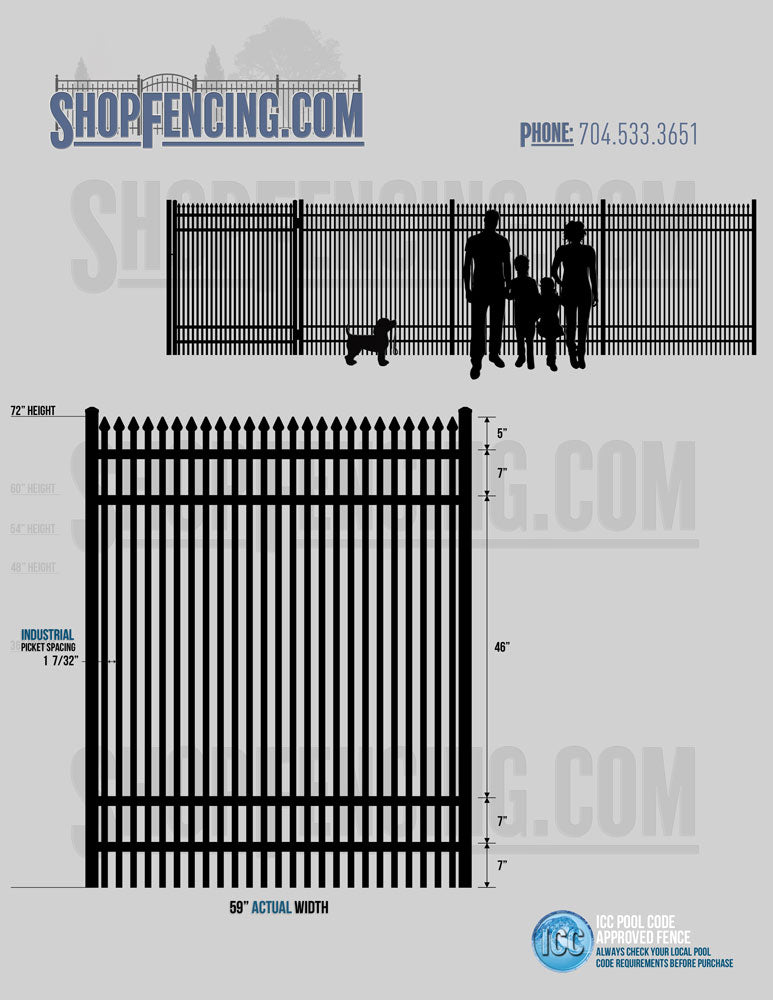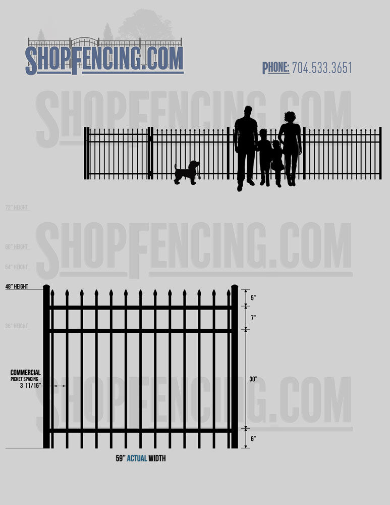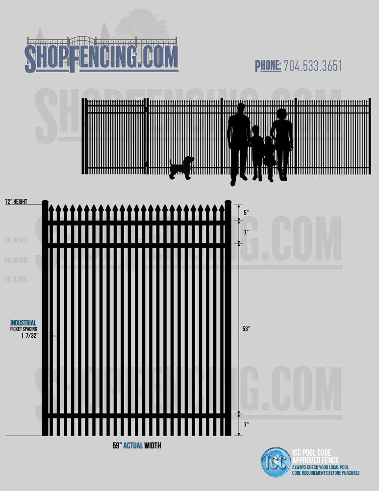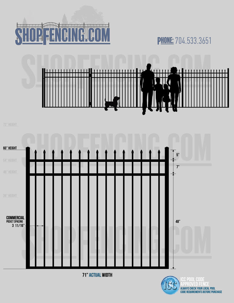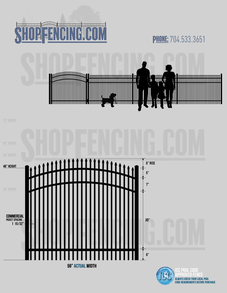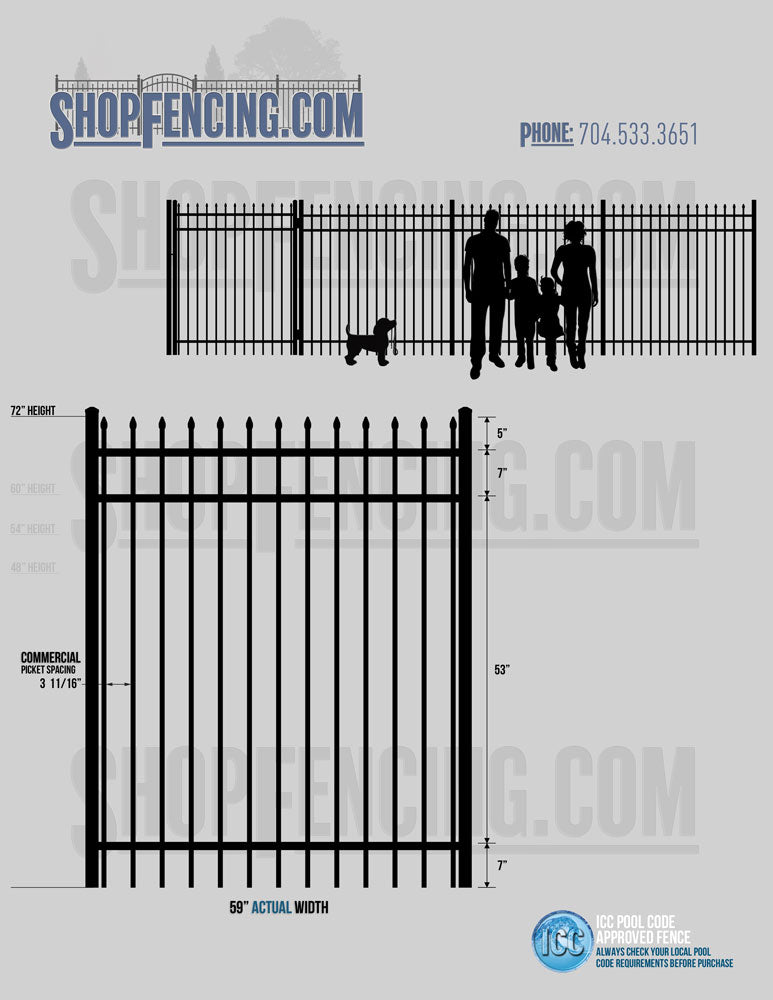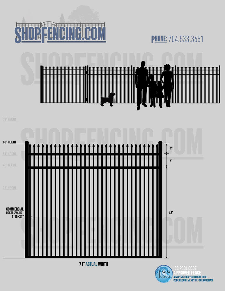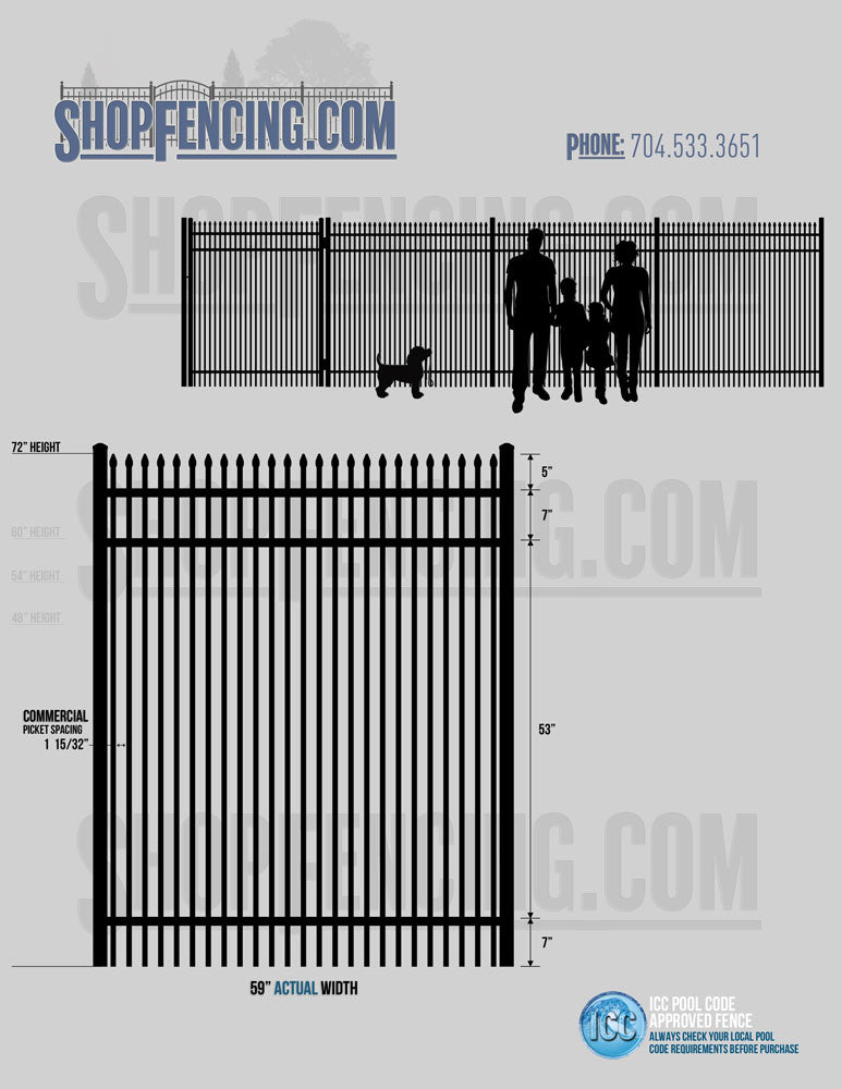 Standard Picket Design: 60" Flush Bottom and 72" Heights. Double Picket Design: 48", 54", 60" and 72" Heights. Check your local pool codes before purchasing.