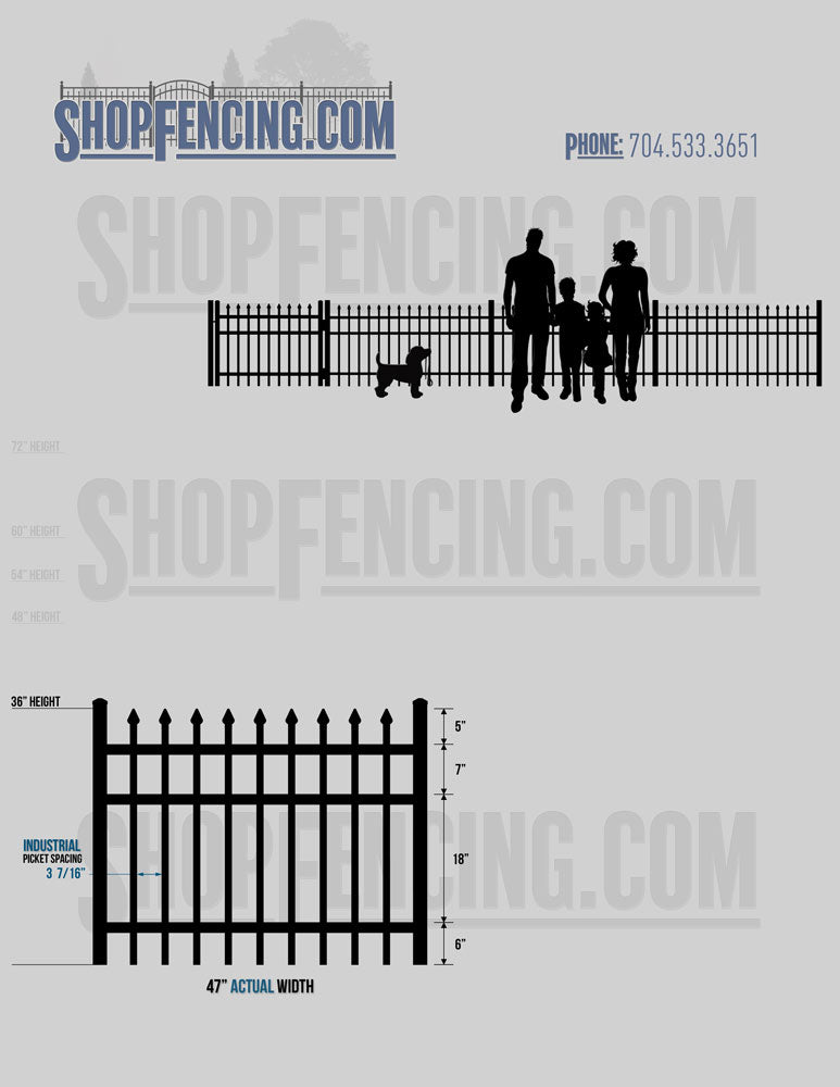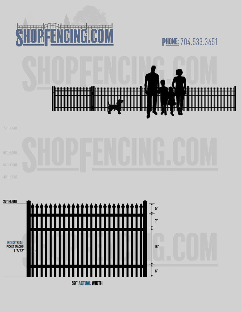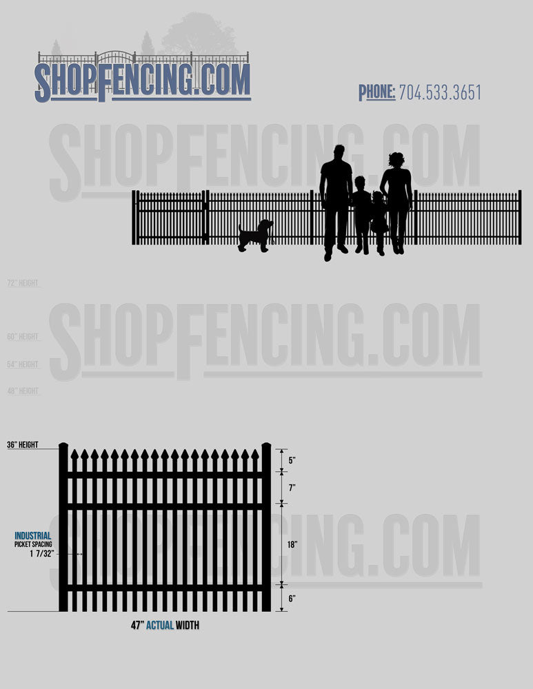 Grades: Commercial 3/4"sq. Pickets x .055" Wall & 1 1/4"sq. Rails x .080" Wall • Industrial 1"sq. Pickets x .060" Wall & 1 1/2"sq. Rails x .080" Wall