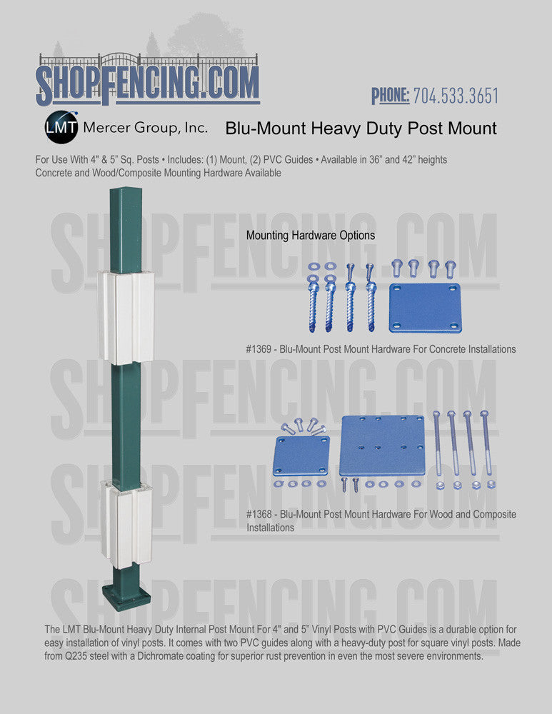 The LMT Blu-Mount Heavy Duty Internal Post Mount For 4" and 5” Vinyl Posts with PVC Guides is a durable option for easy installation of vinyl posts. It comes with two PVC guides along with a heavy-duty post for square vinyl posts. Made from Q235 steel with a Dichromate coating for superior rust prevention in even the most severe environments.