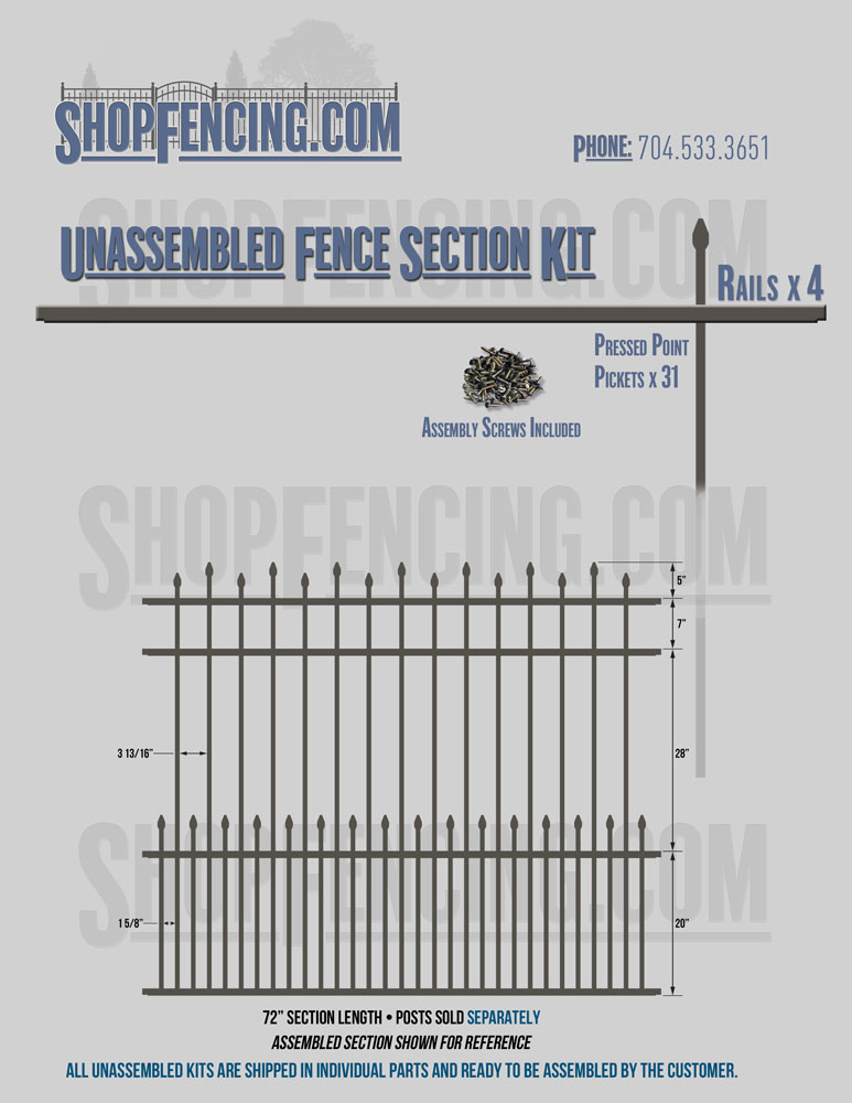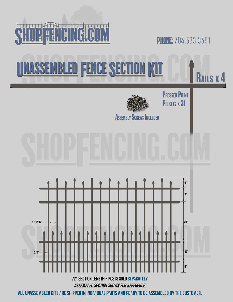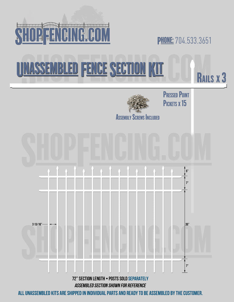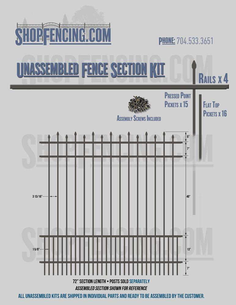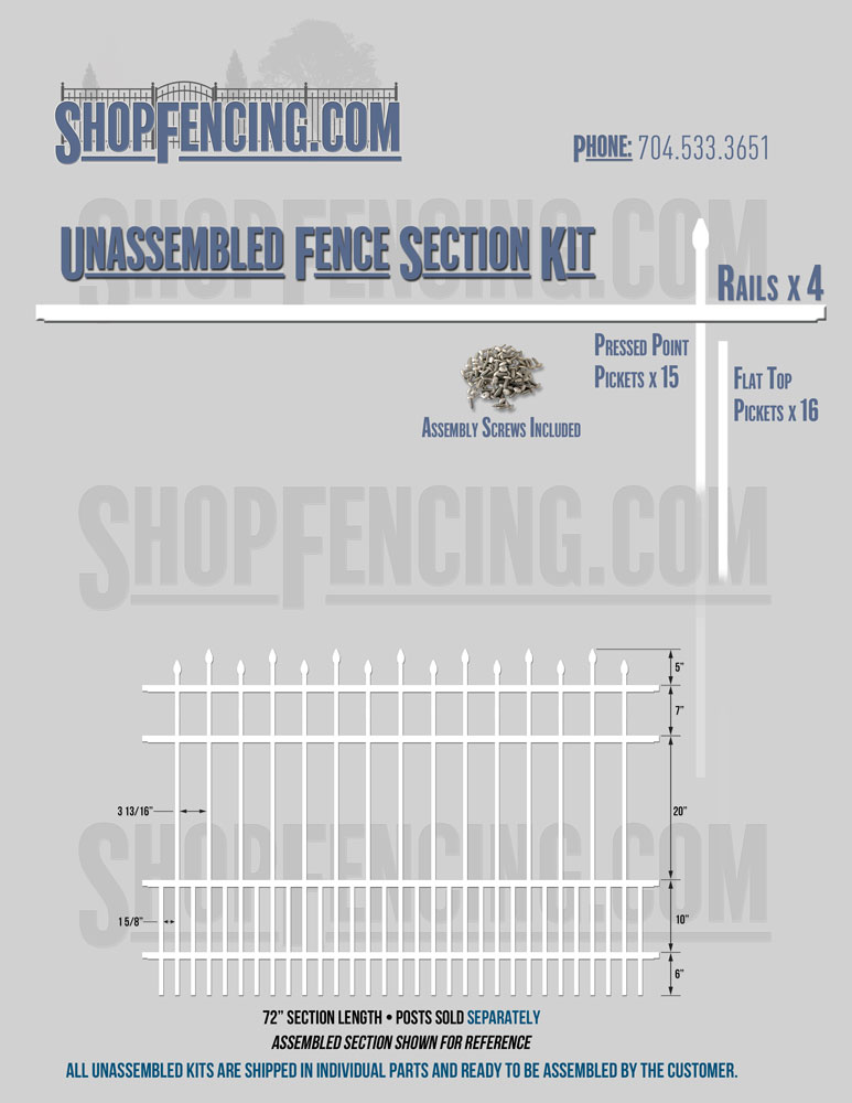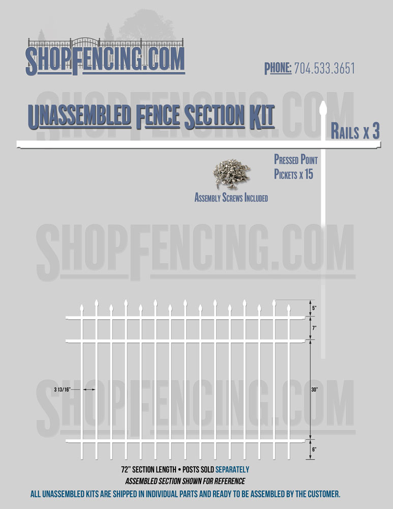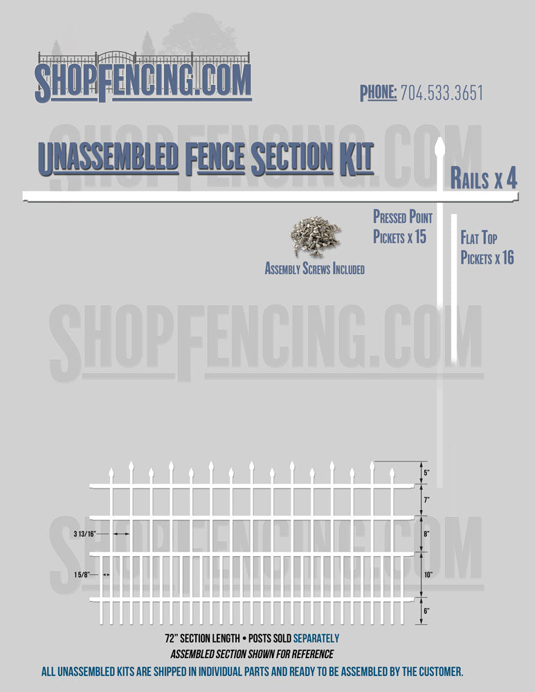 Assembled Fence Sections are completed fence sections ready for installation. All pickets are fastened to the rails and all rails are spaced to fit the matching style posts. Unassembled Fence Sections are shipped to you in kit form. Each kit will include rails, pickets and screws. For example, a Standard Picket, 3 Rail Fence Section kit would include, 3 Rails, 15 Pickets and 45 Screws. Please note that the assembly of fence sections is a labor intensive process. See our Assembly Instructions HERE.