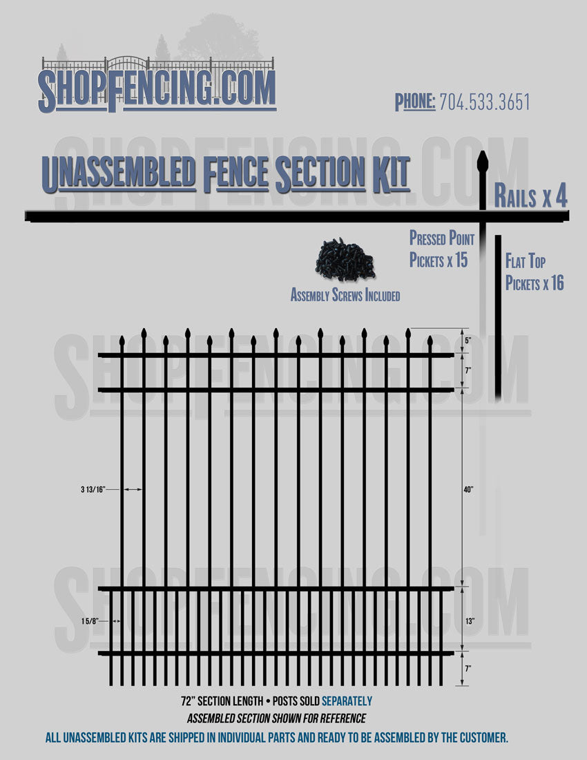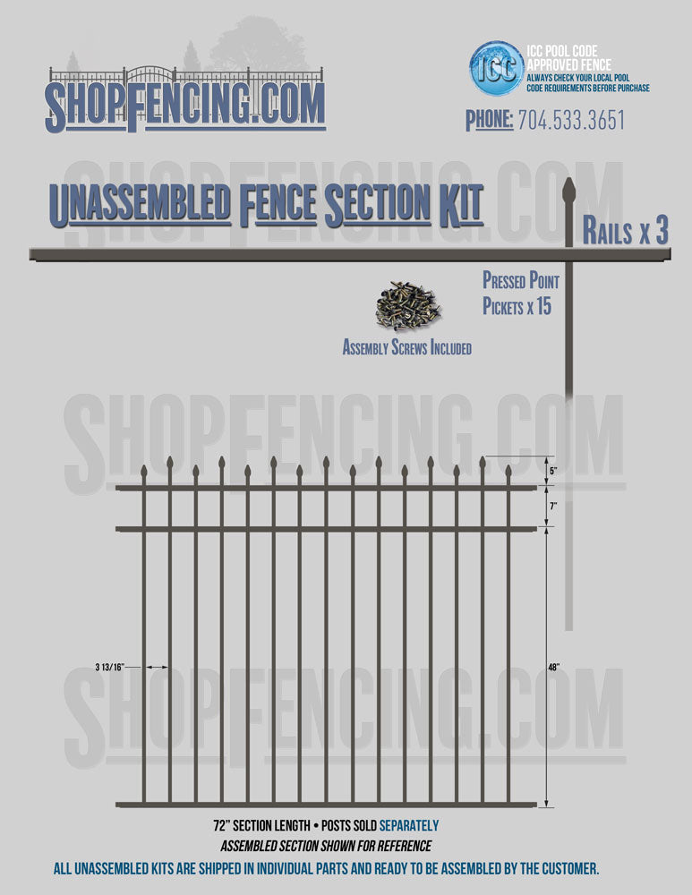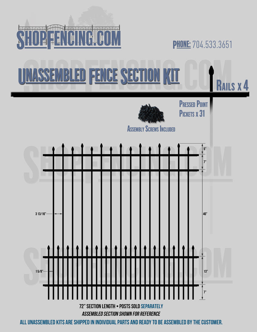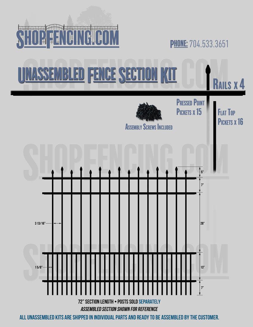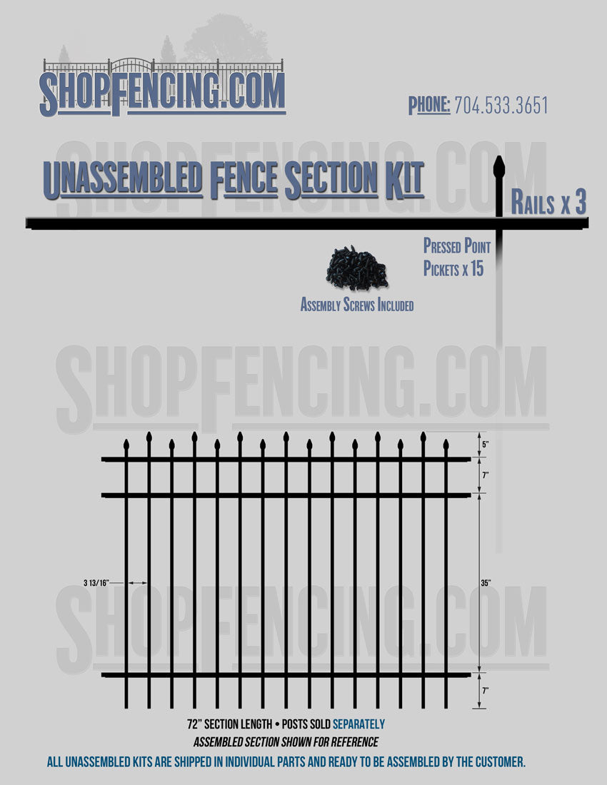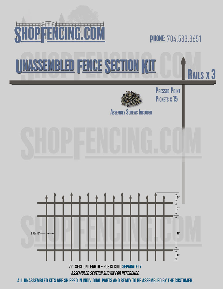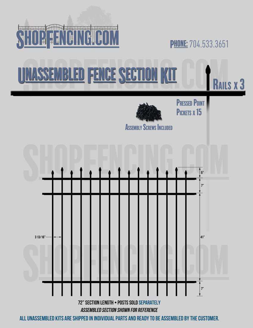 Assembled Fence Sections are completed fence sections ready for installation. All pickets are fastened to the rails and all rails are spaced to fit the matching style posts. Unassembled Fence Sections are shipped to you in kit form. Each kit will include rails, pickets and screws. For example, a Standard Picket, 3 Rail Fence Section kit would include, 3 Rails, 15 Pickets and 45 Screws. Please note that the assembly of fence sections is a labor intensive process. See our Assembly Instructions HERE.