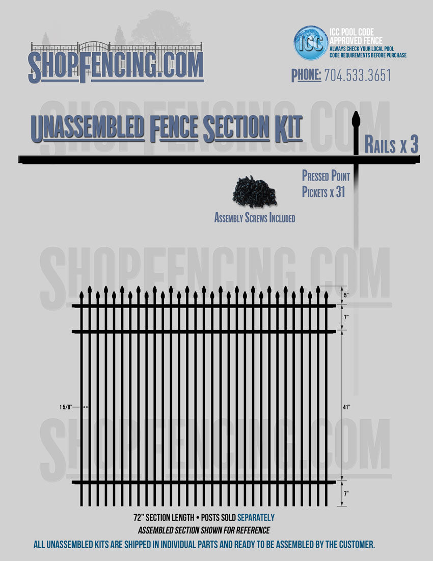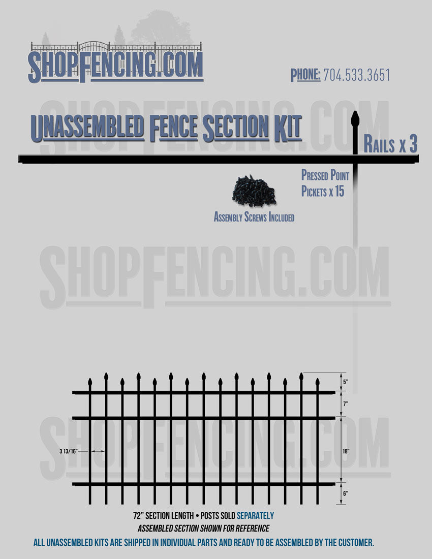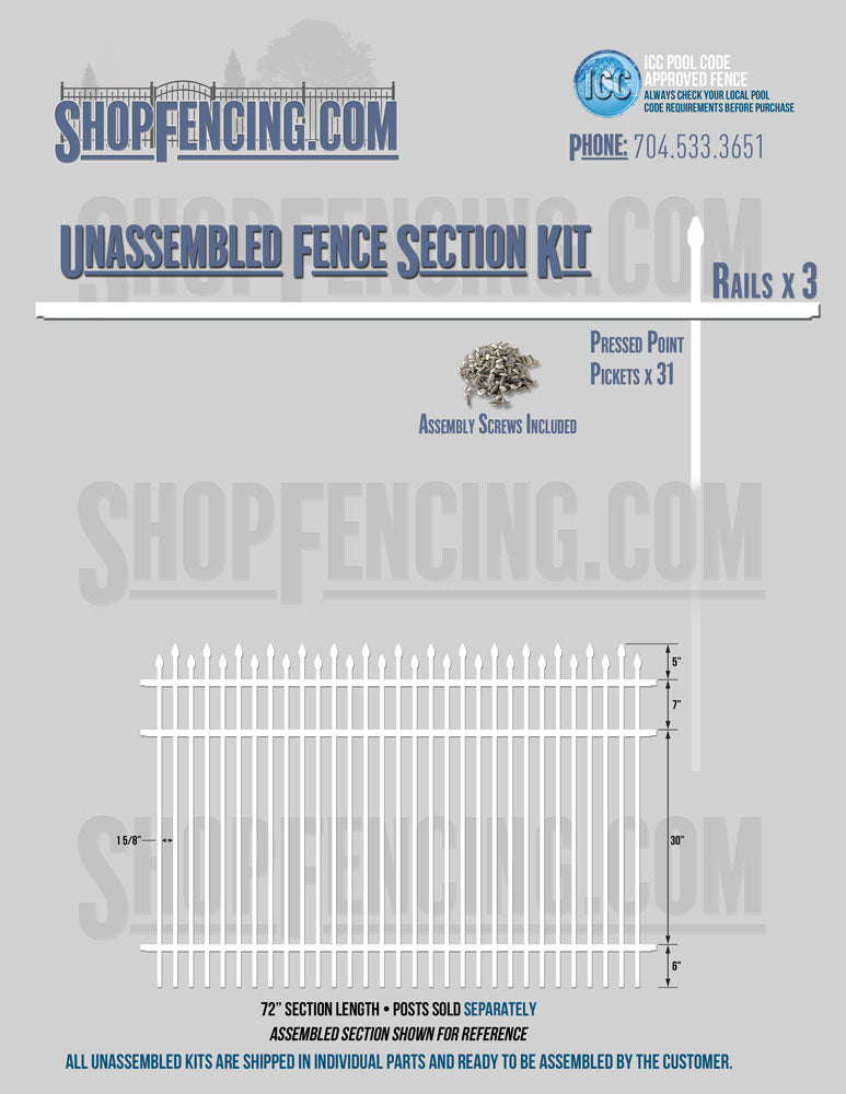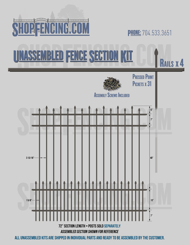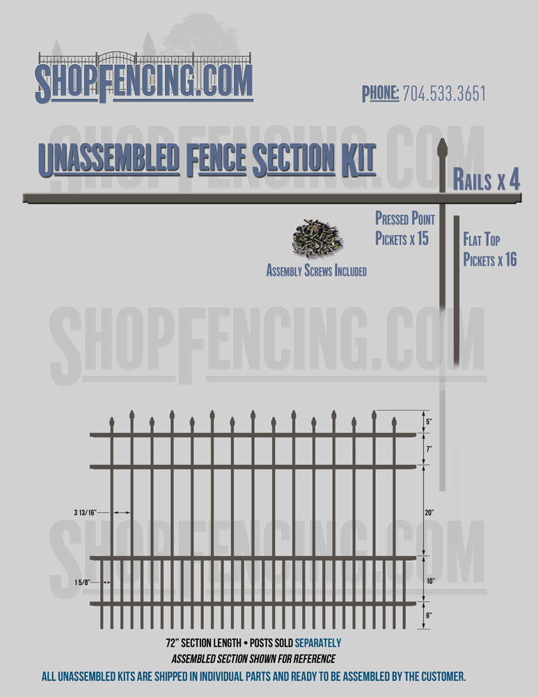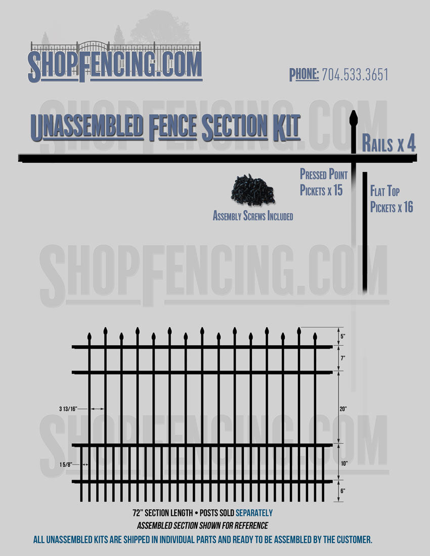 Assembled Fence Sections are completed fence sections ready for installation. All pickets are fastened to the rails and all rails are spaced to fit the matching style posts. Unassembled Fence Sections are shipped to you in kit form. Each kit will include rails, pickets and screws. For example, a Standard Picket, 3 Rail Fence Section kit would include, 3 Rails, 15 Pickets and 45 Screws. Please note that the assembly of fence sections is a labor intensive process. See our Assembly Instructions HERE.
