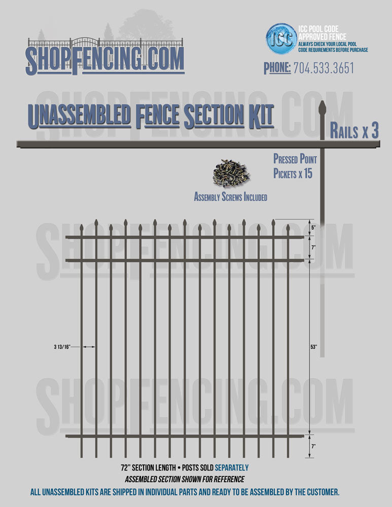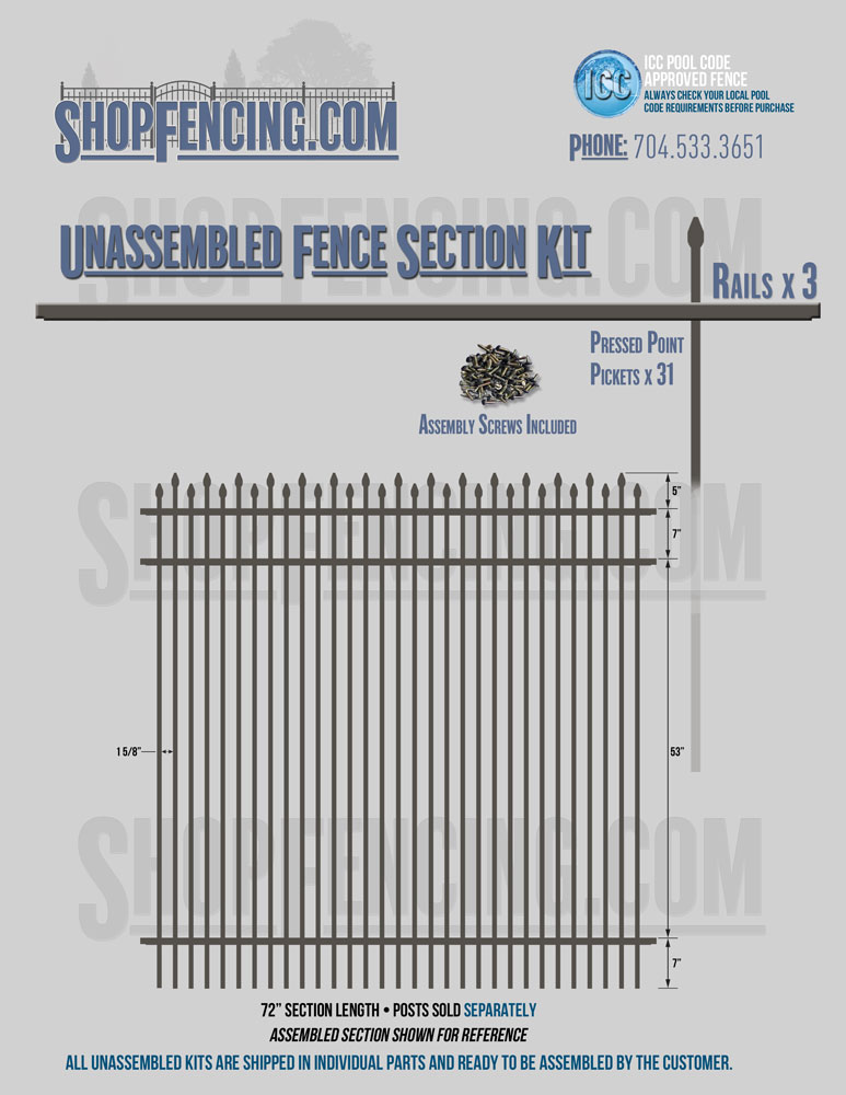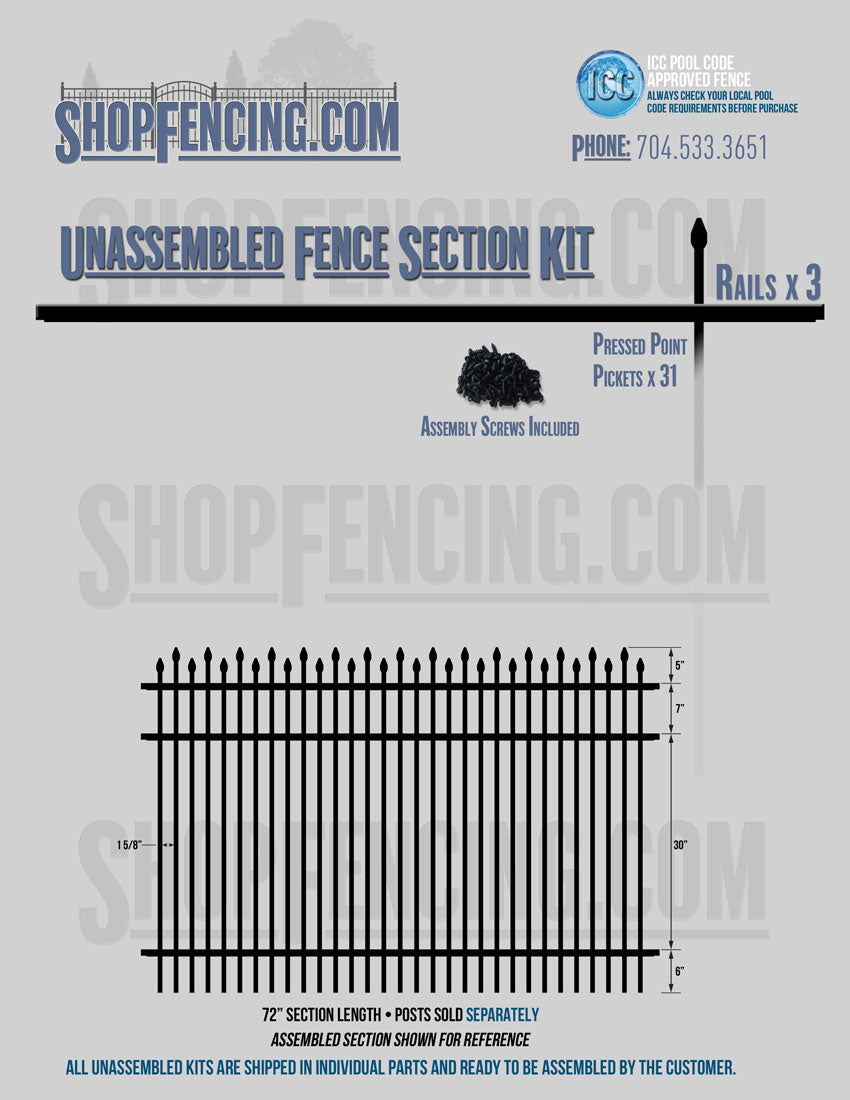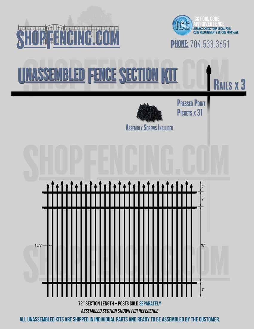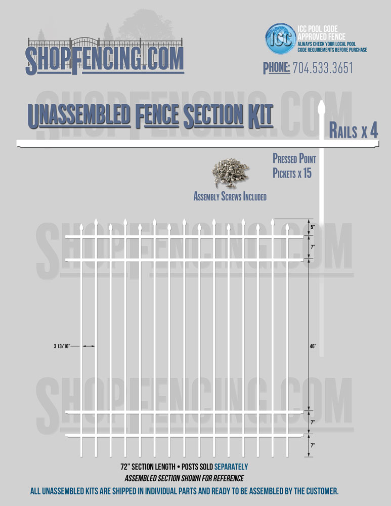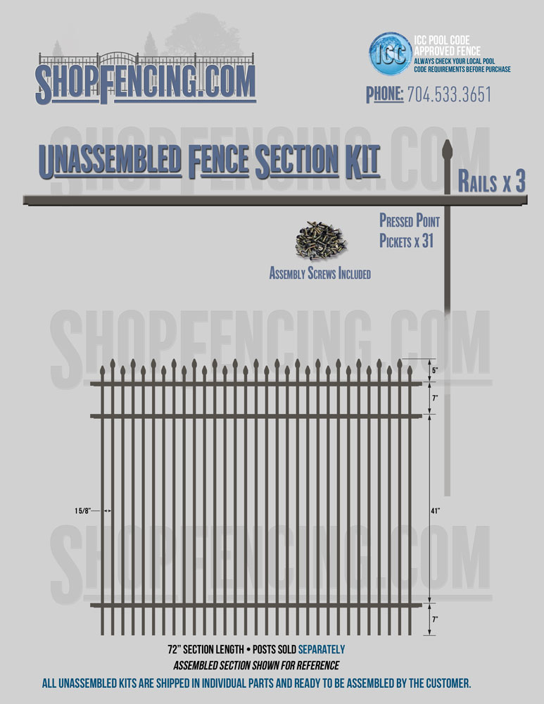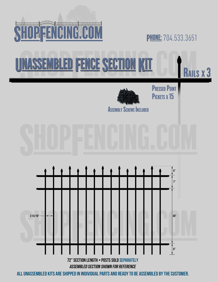 Assembled Fence Sections are completed fence sections ready for installation. All pickets are fastened to the rails and all rails are spaced to fit the matching style posts. Unassembled Fence Sections are shipped to you in kit form. Each kit will include rails, pickets and screws. For example, a Standard Picket, 3 Rail Fence Section kit would include, 3 Rails, 15 Pickets and 45 Screws. Please note that the assembly of fence sections is a labor intensive process. See our Assembly Instructions HERE.