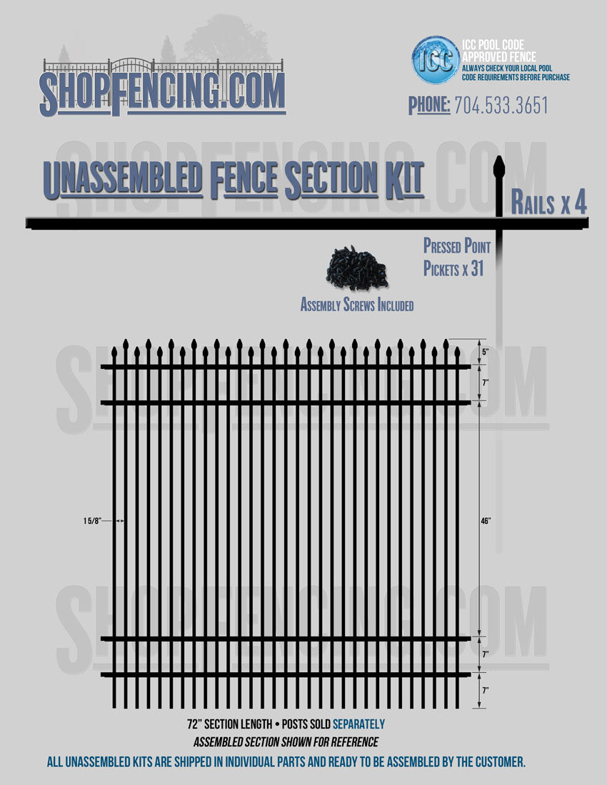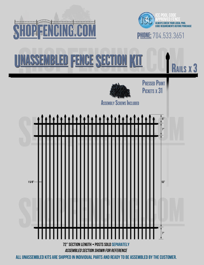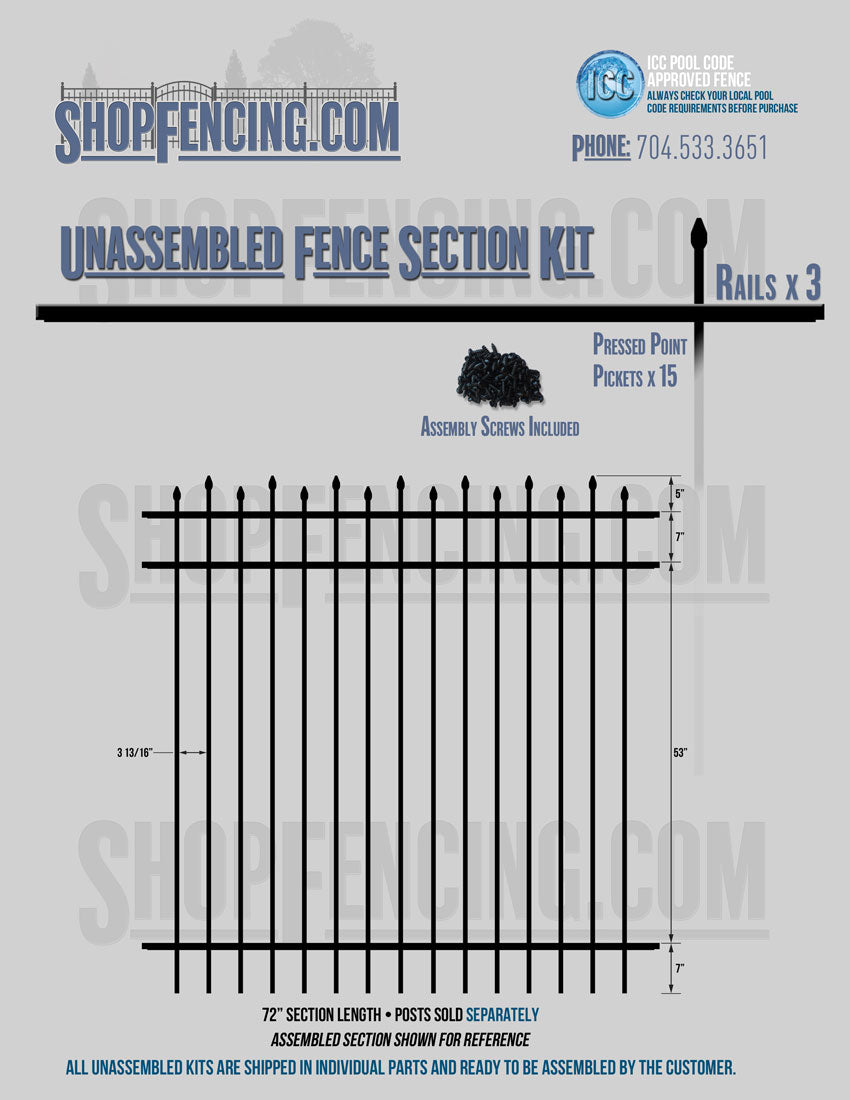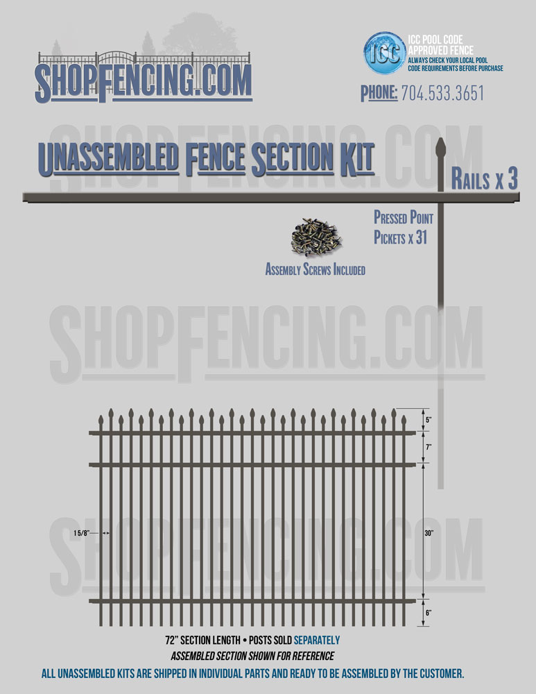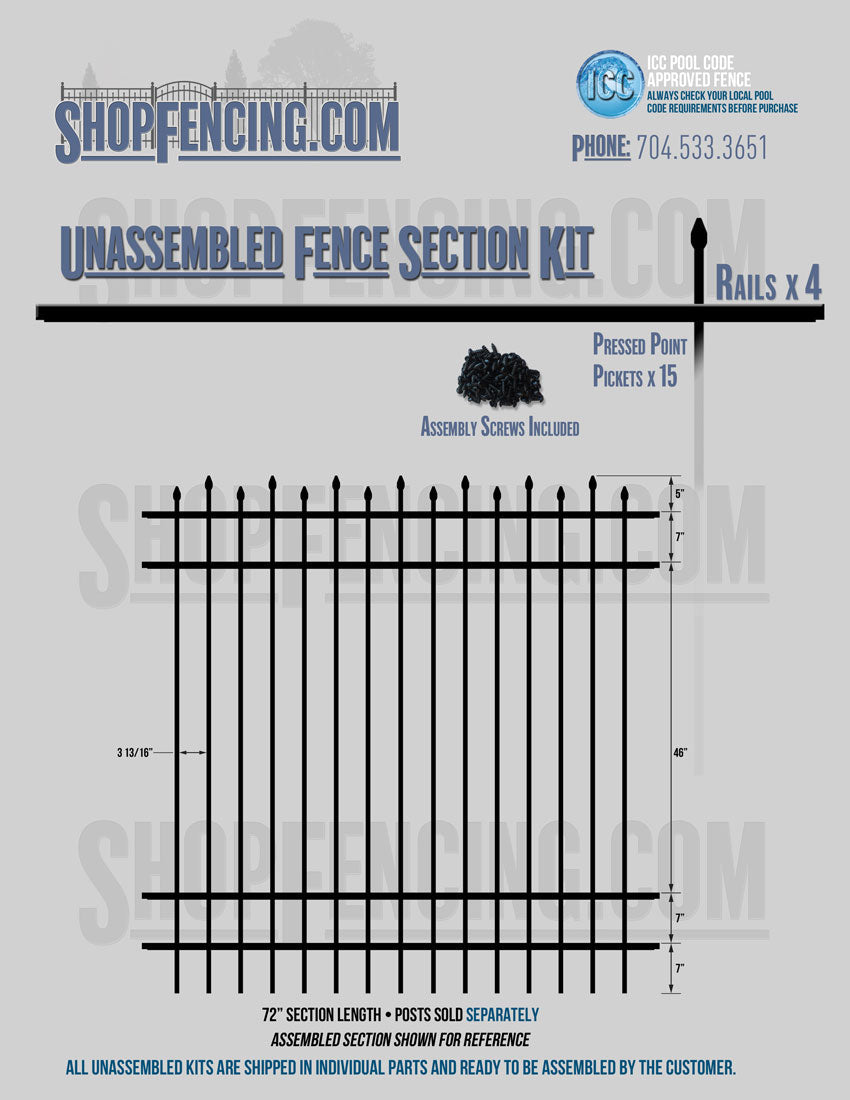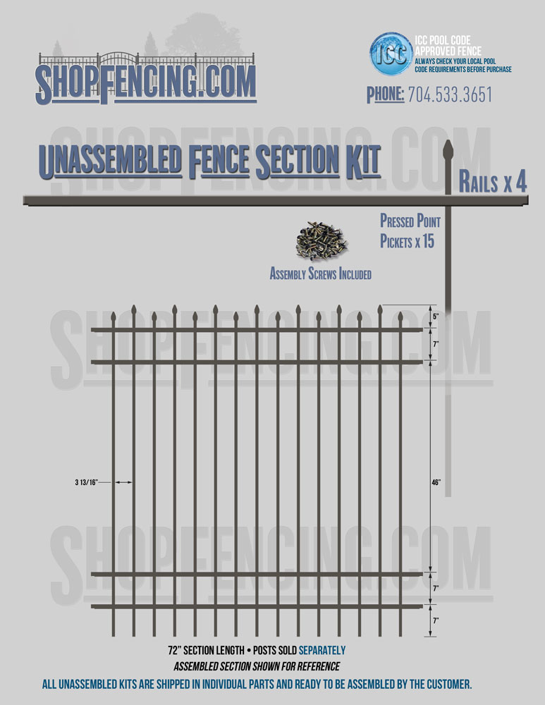 Assembled Fence Sections are completed fence sections ready for installation. All pickets are fastened to the rails and all rails are spaced to fit the matching style posts. Unassembled Fence Sections are shipped to you in kit form. Each kit will include rails, pickets and screws. For example, a Standard Picket, 3 Rail Fence Section kit would include, 3 Rails, 15 Pickets and 45 Screws. Please note that the assembly of fence sections is a labor intensive process. See our Assembly Instructions HERE.