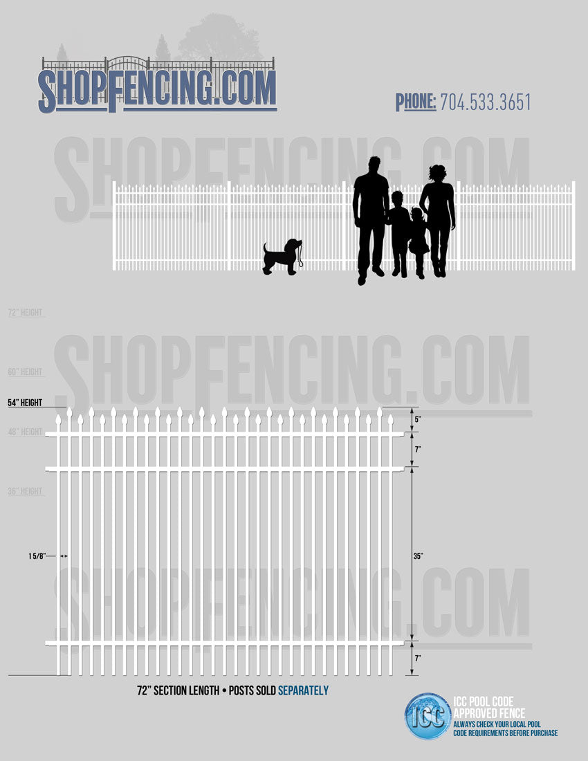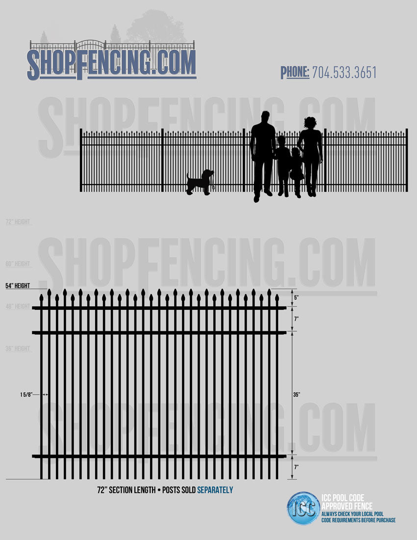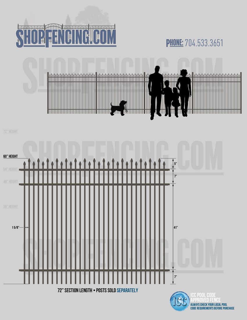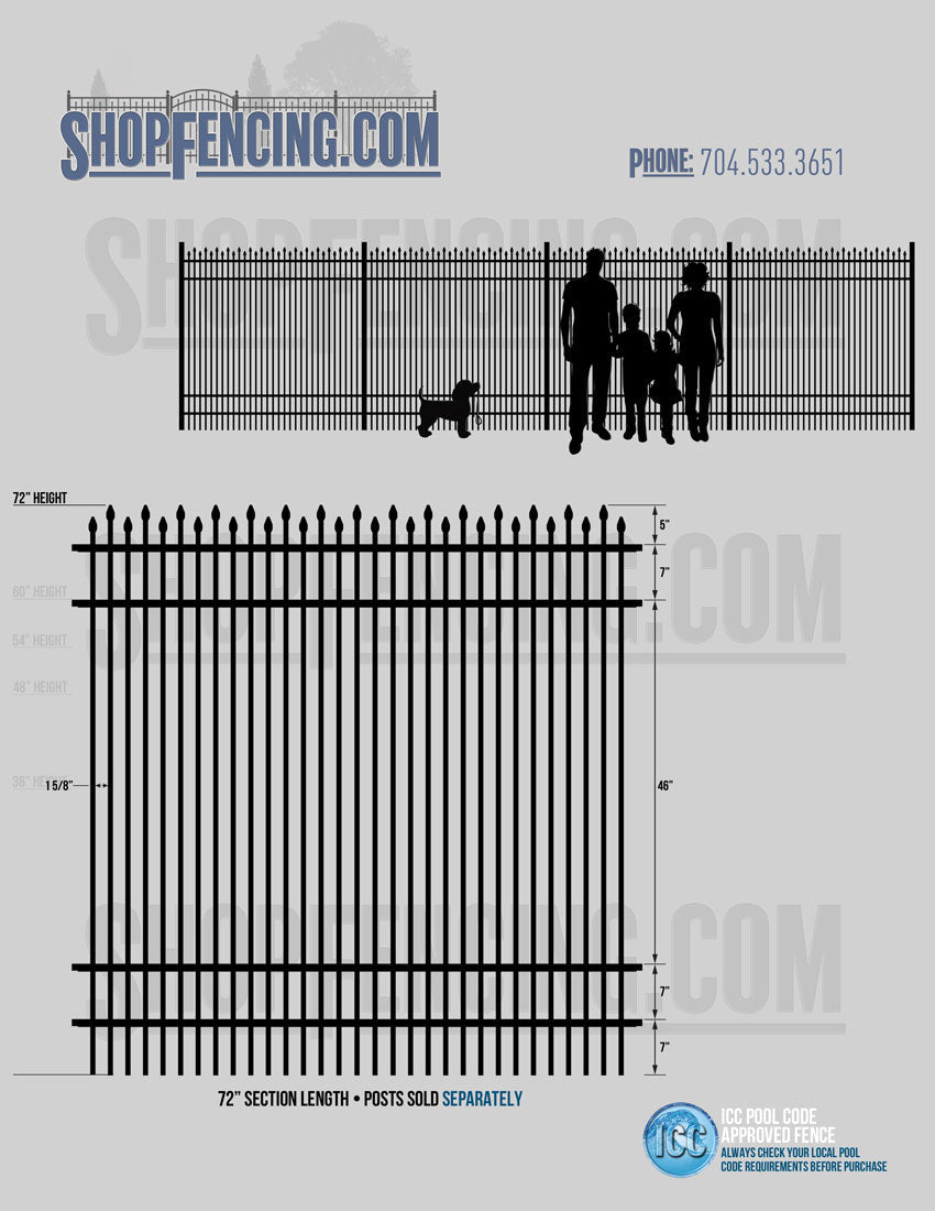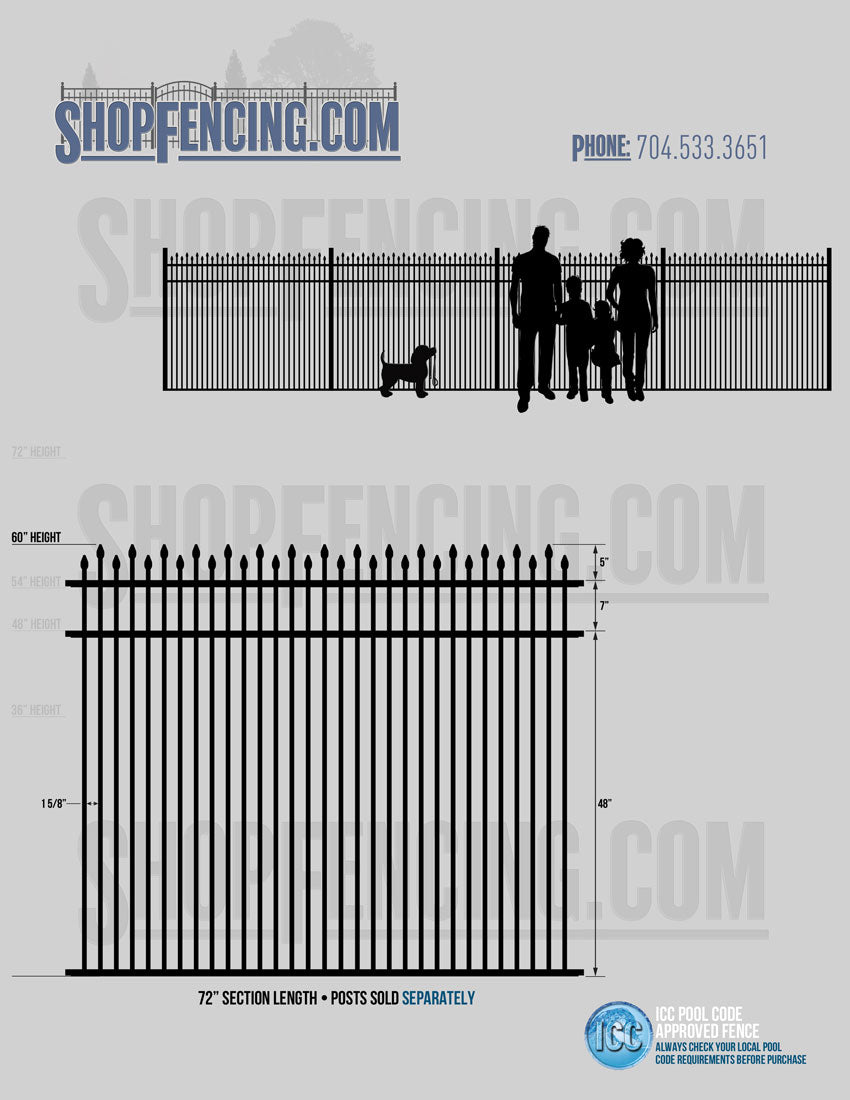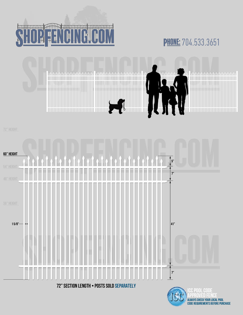 Standard Picket Design: 60" Flush Bottom and 72" Heights. Double Picket Design: 48", 54", 60" and 72" Heights. Check your local pool codes before purchasing.