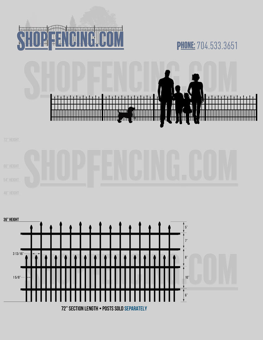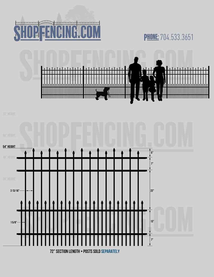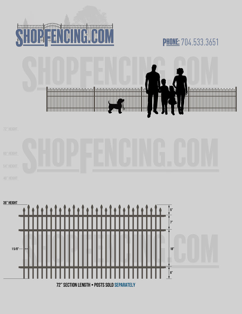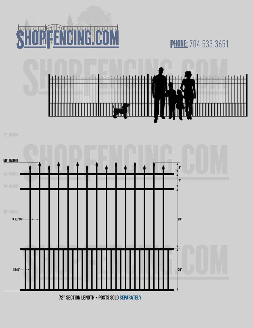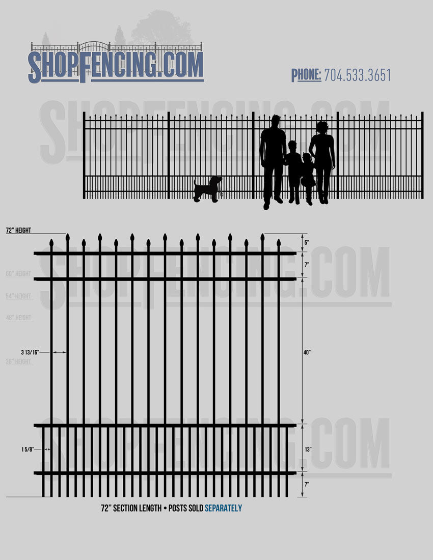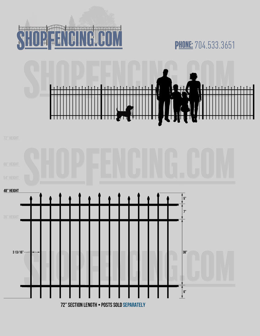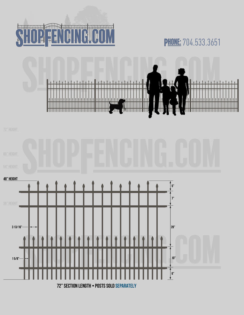 Standard Picket Design: 60" Flush Bottom and 72" Heights. Double Picket Design: 48", 54", 60" and 72" Heights. Check your local pool codes before purchasing.