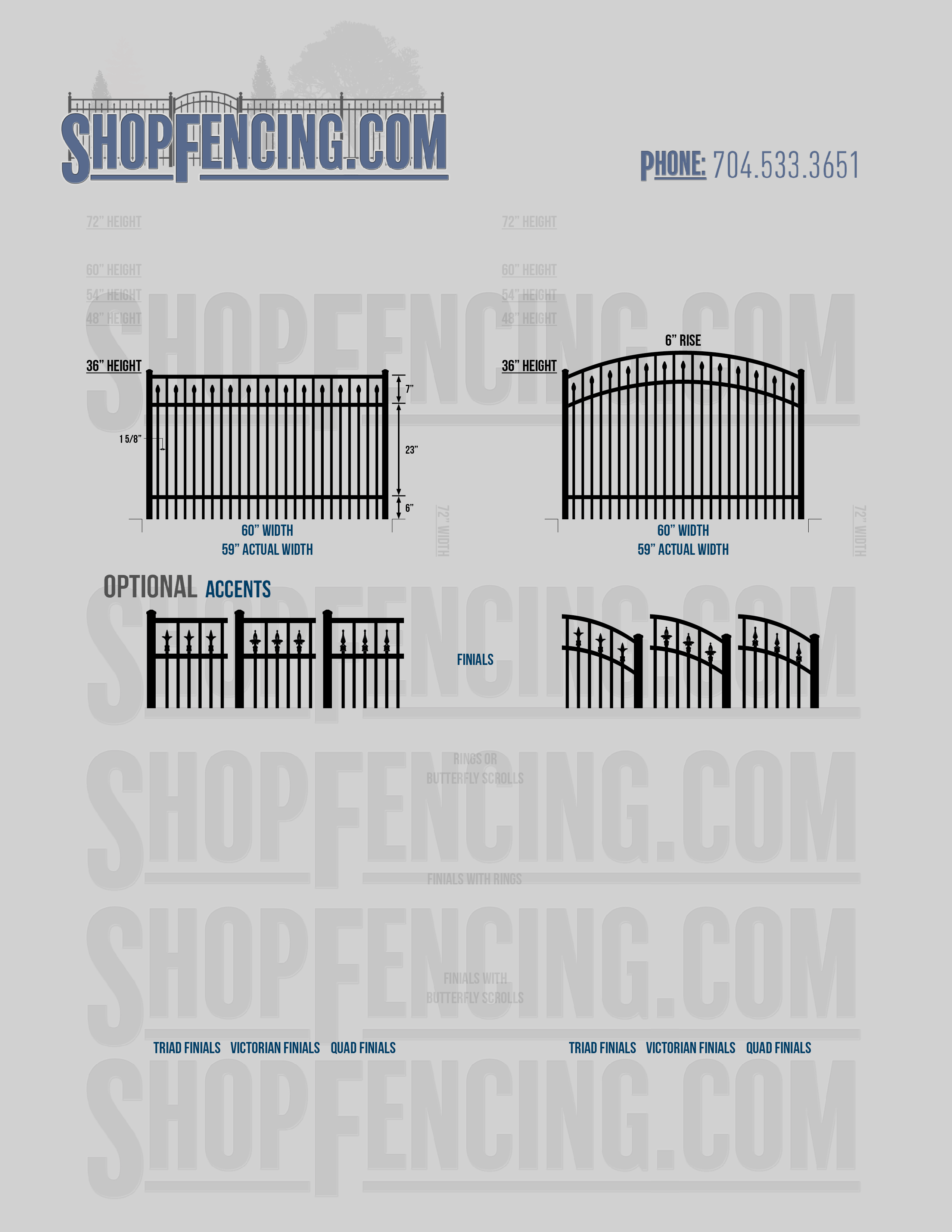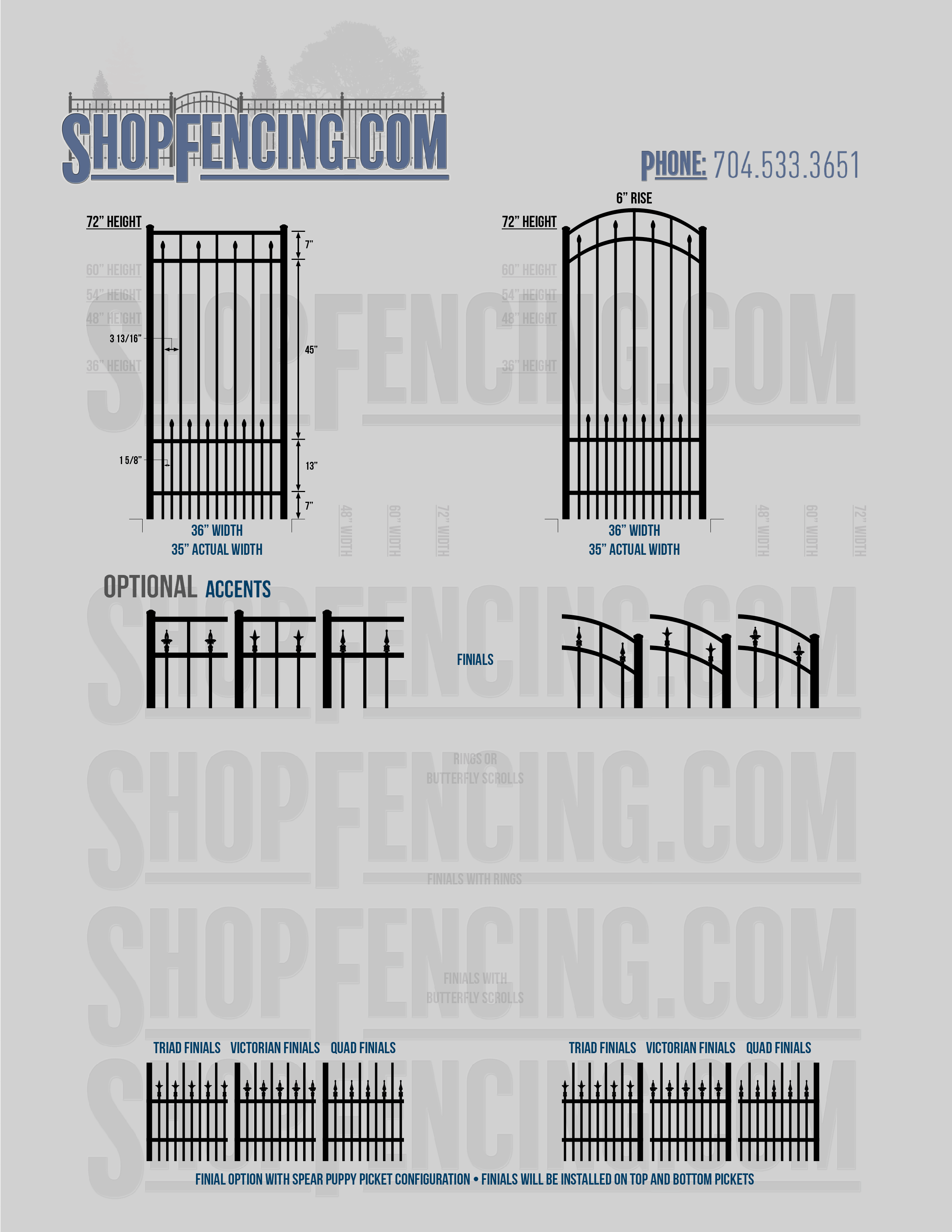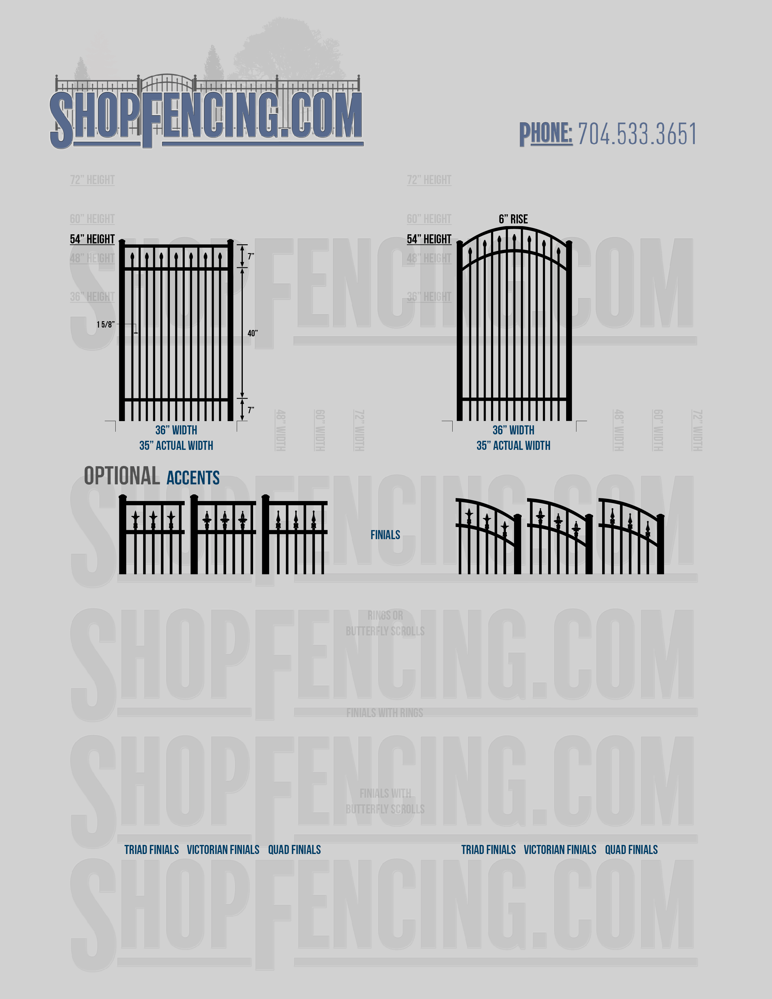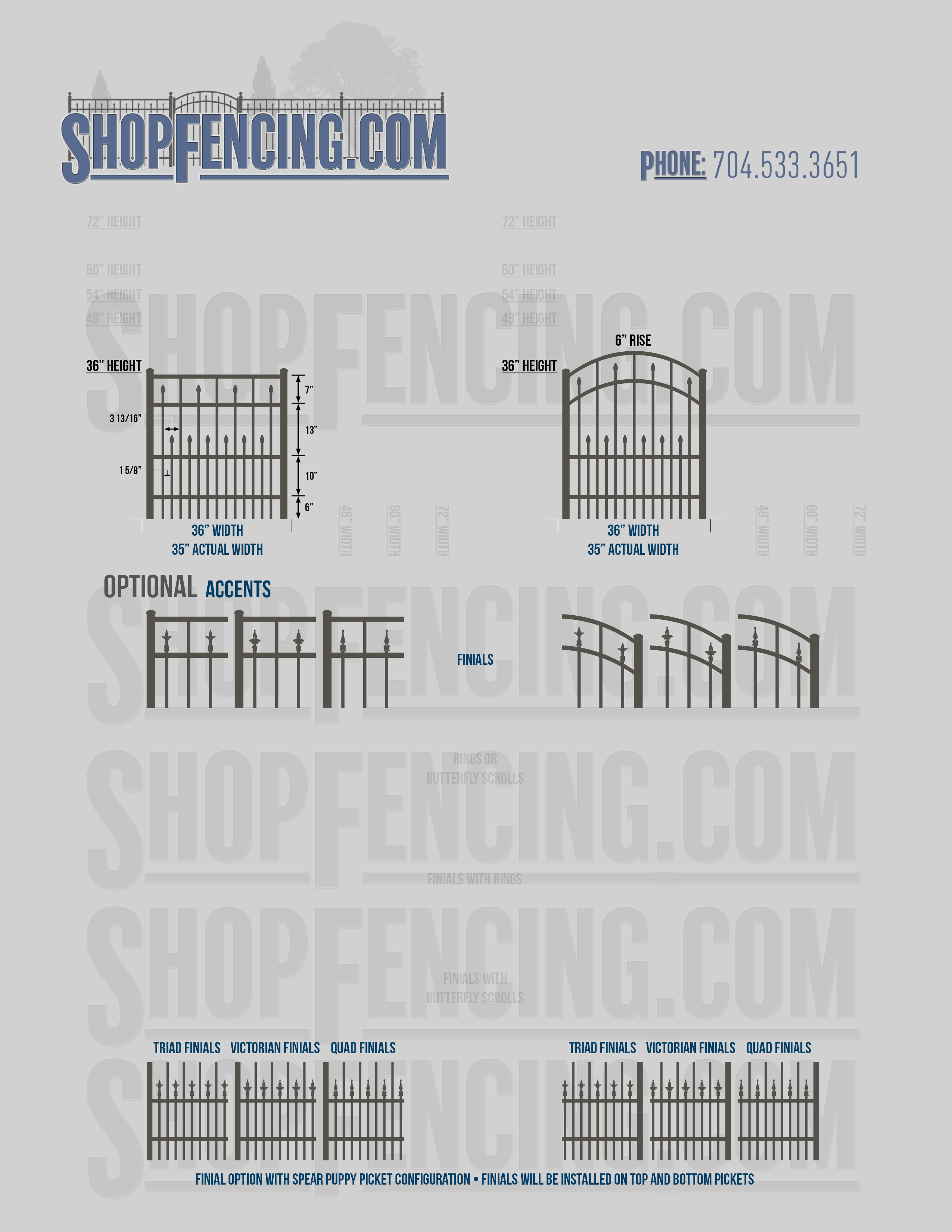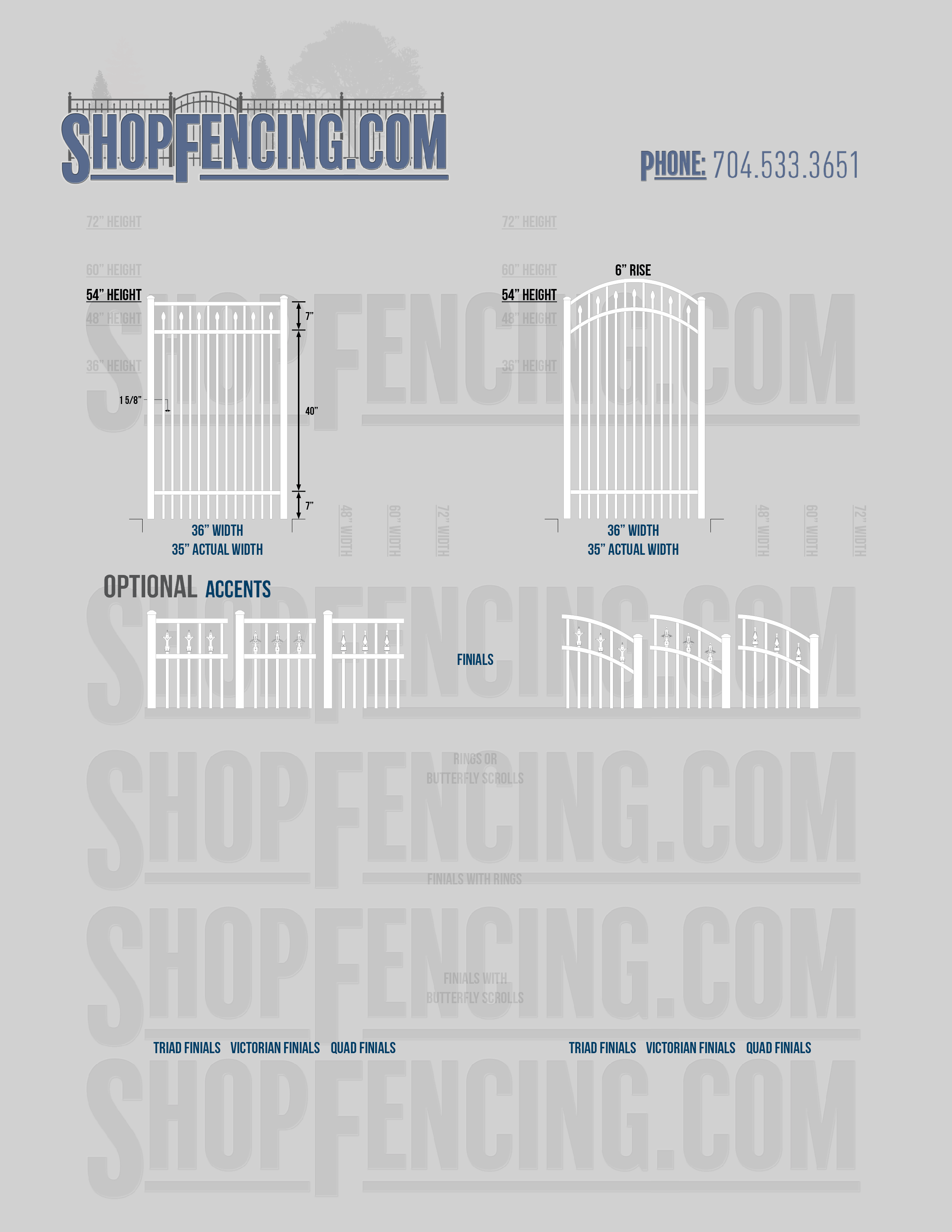 Accent Upgrades: When you add these options, gates will ship with the finials, rings or scrolls installed. PLEASE NOTE: Triad and Victorian finials cannot be installed on double picket fence sections and gates. Rings and scrolls cannot be installed on double picket fence sections and gates.