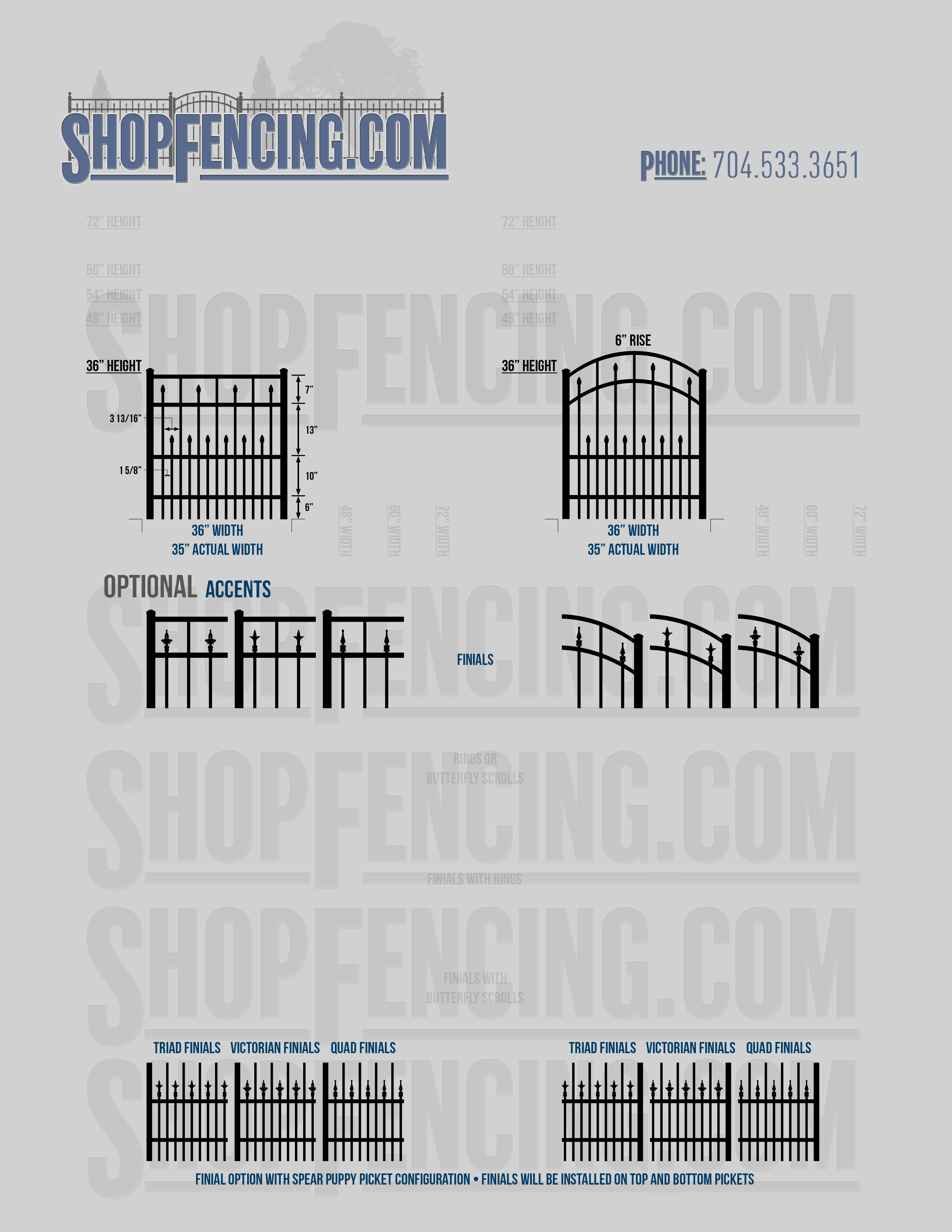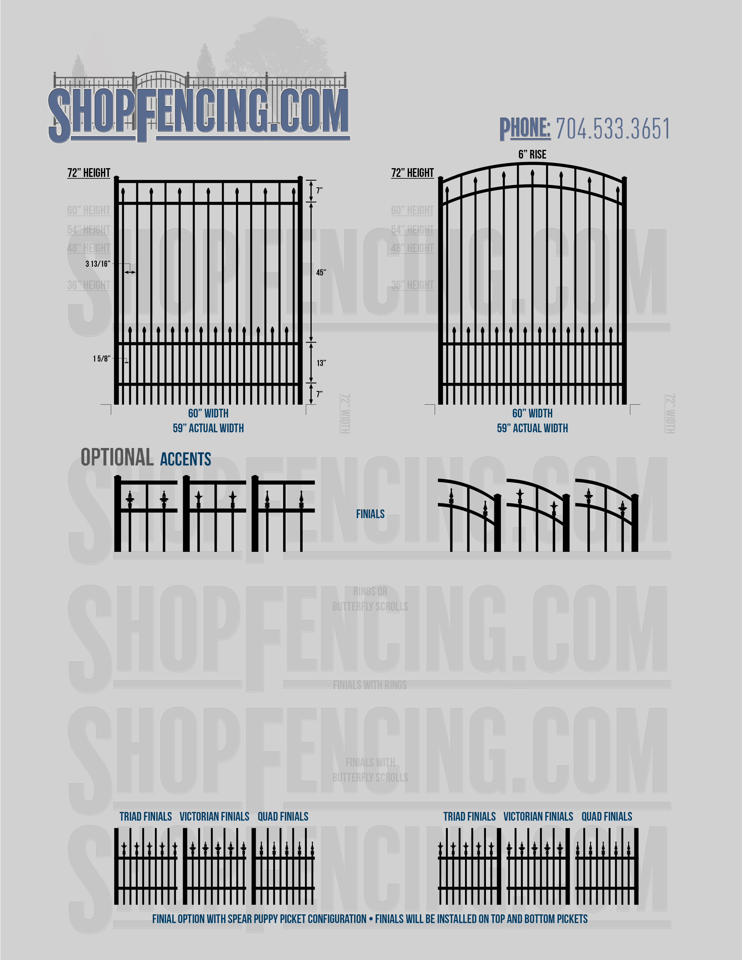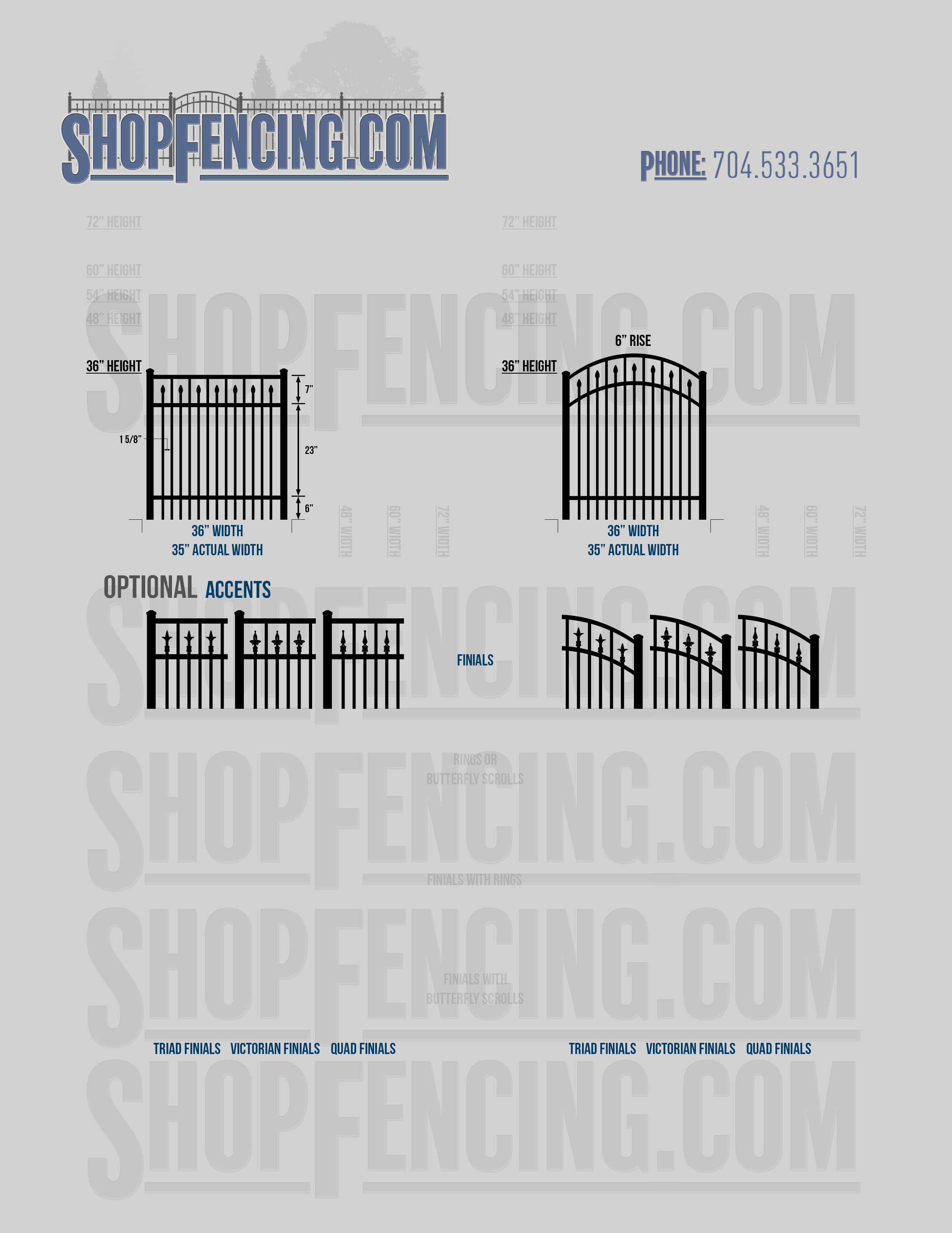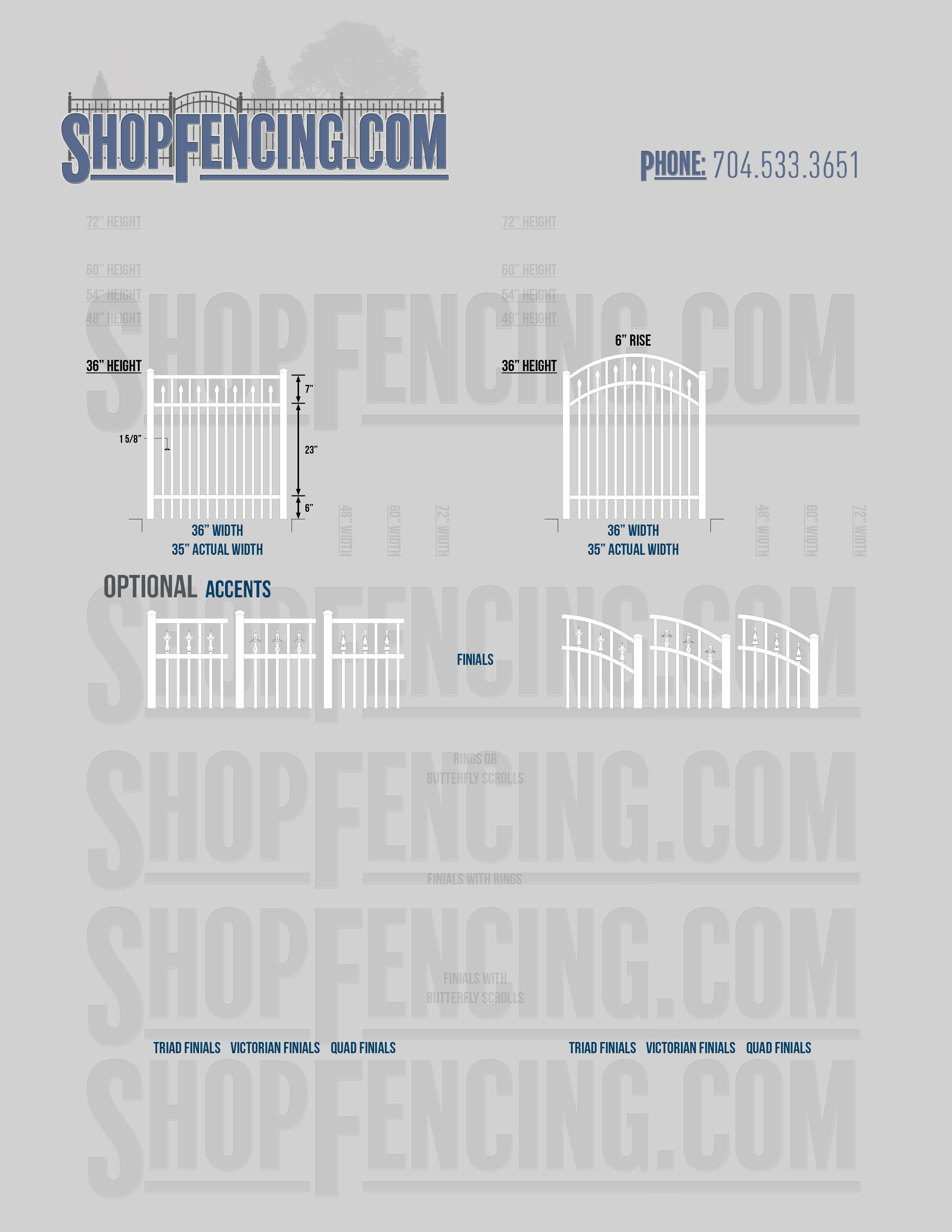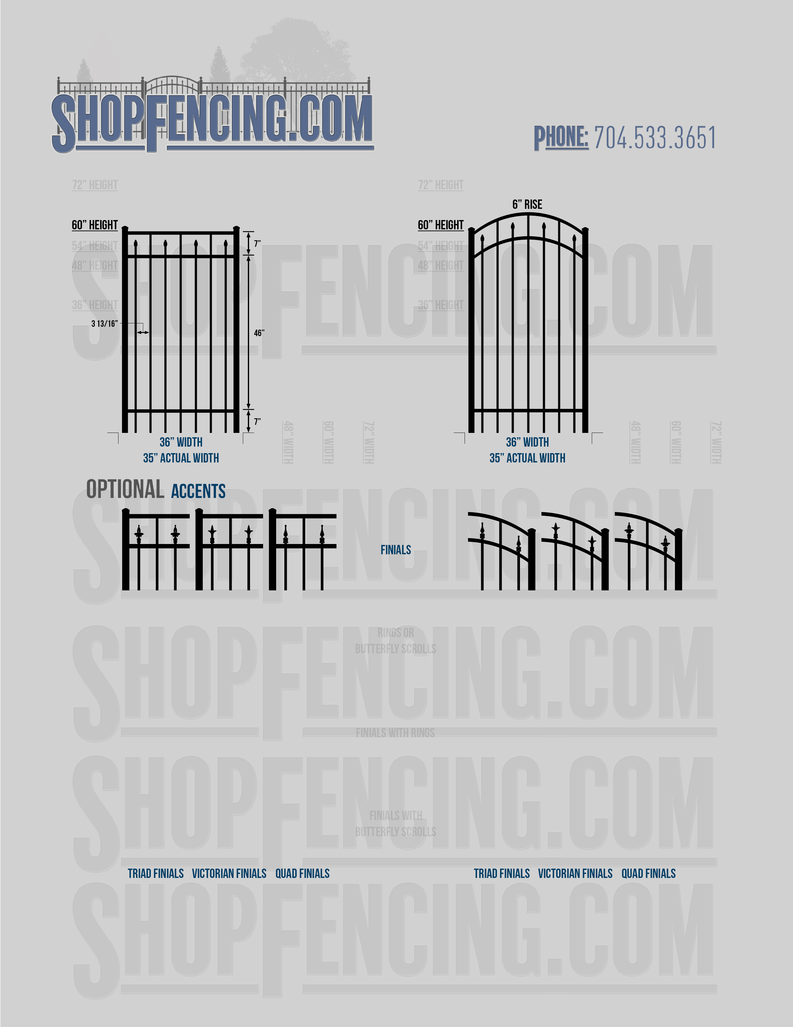 Accent Upgrades: When you add these options, gates will ship with the finials, rings or scrolls installed. PLEASE NOTE: Triad and Victorian finials cannot be installed on double picket fence sections and gates. Rings and scrolls cannot be installed on double picket fence sections and gates.