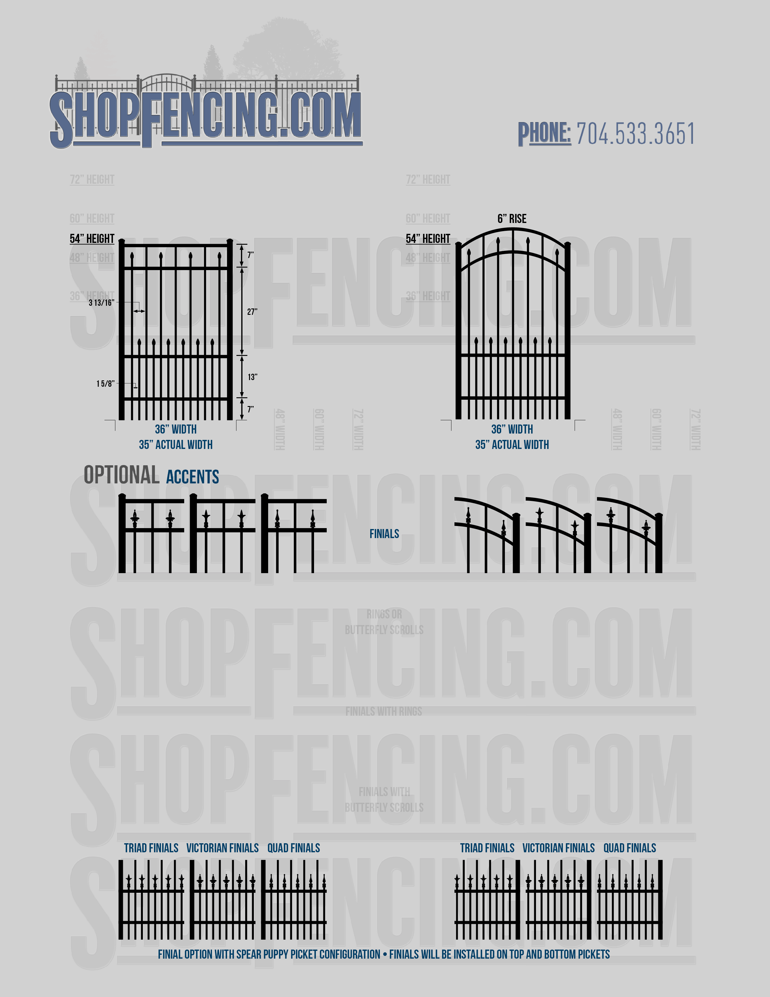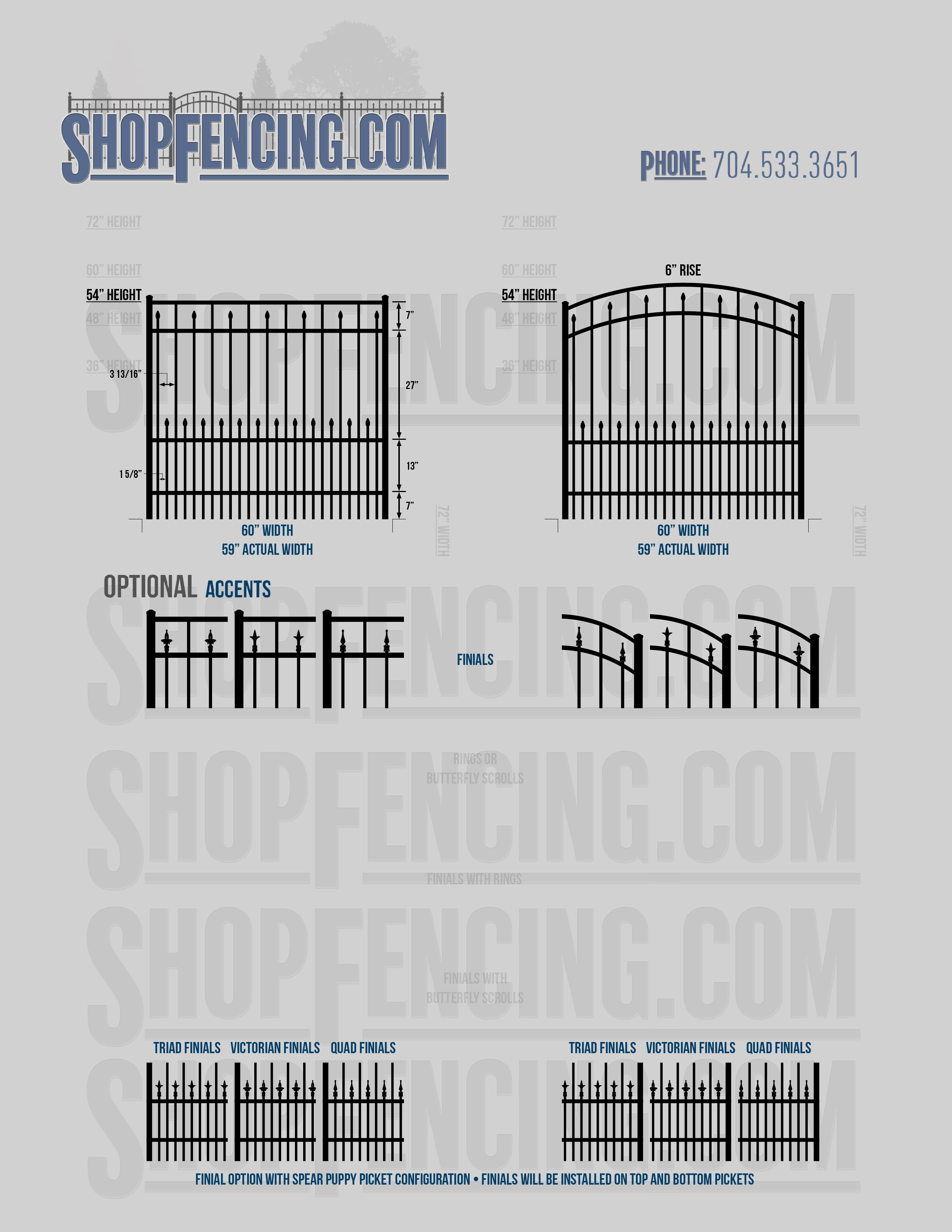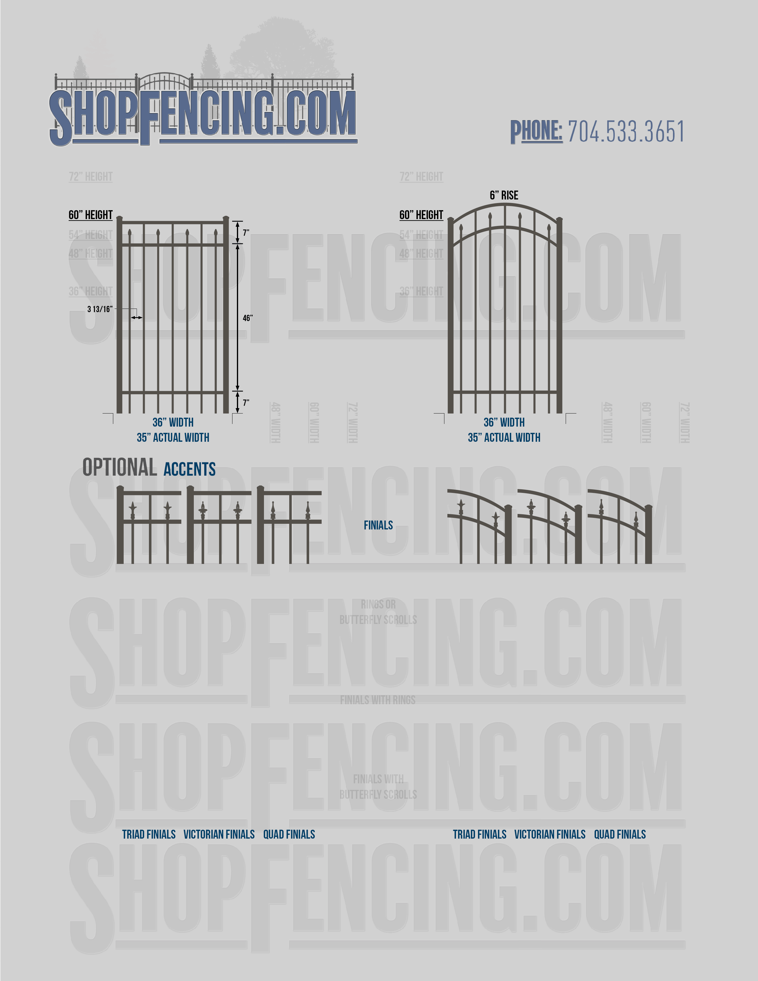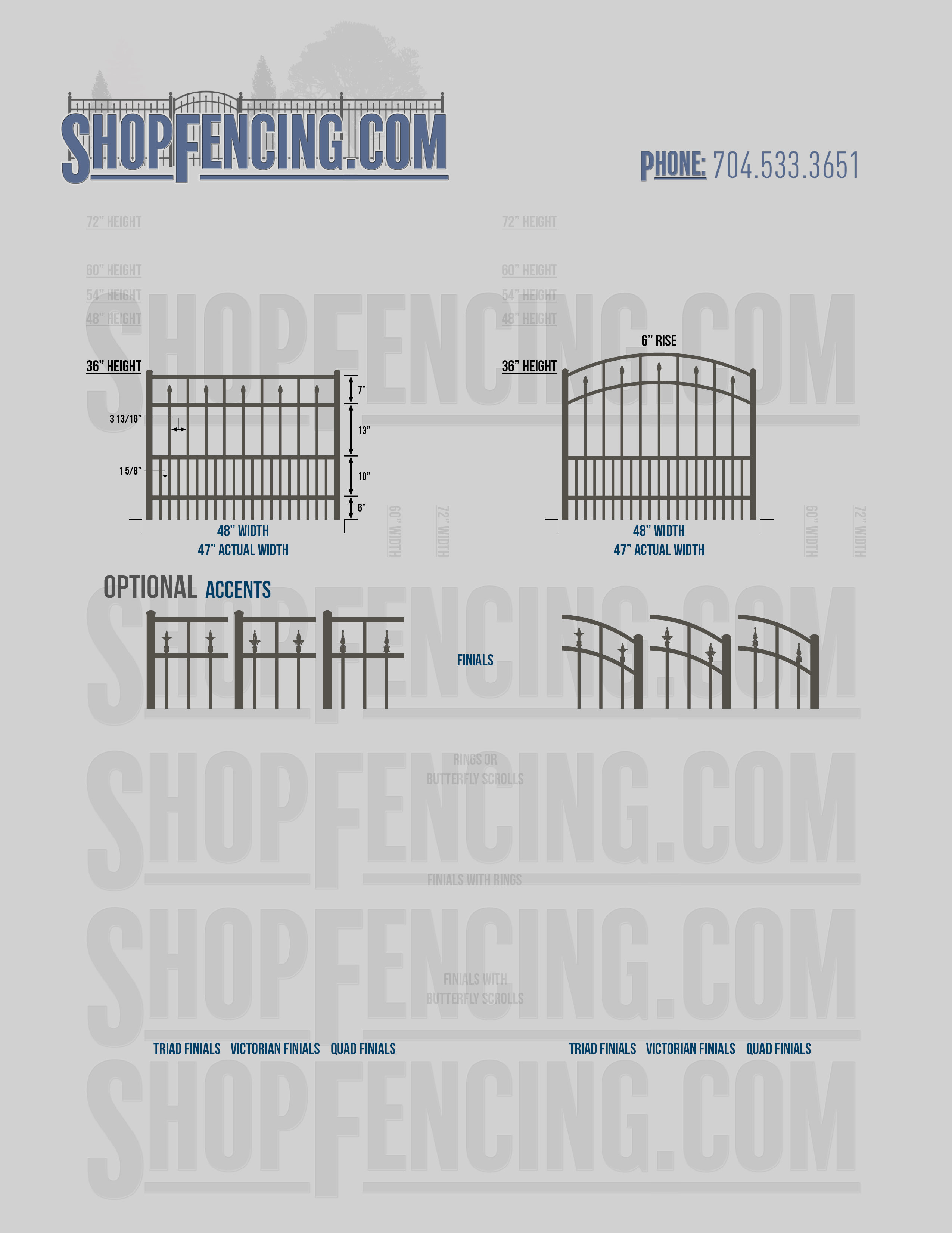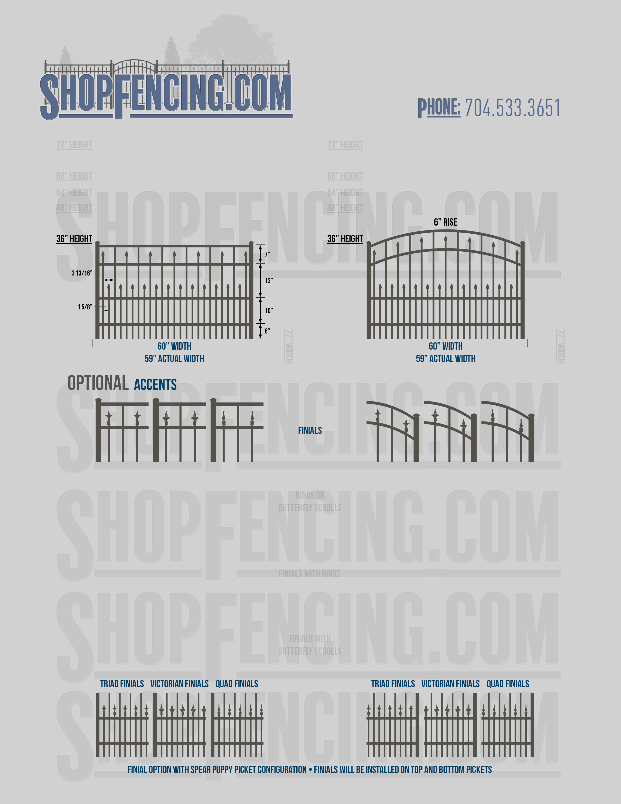 Accent Upgrades: When you add these options, gates will ship with the finials, rings or scrolls installed. PLEASE NOTE: Triad and Victorian finials cannot be installed on double picket fence sections and gates. Rings and scrolls cannot be installed on double picket fence sections and gates.
