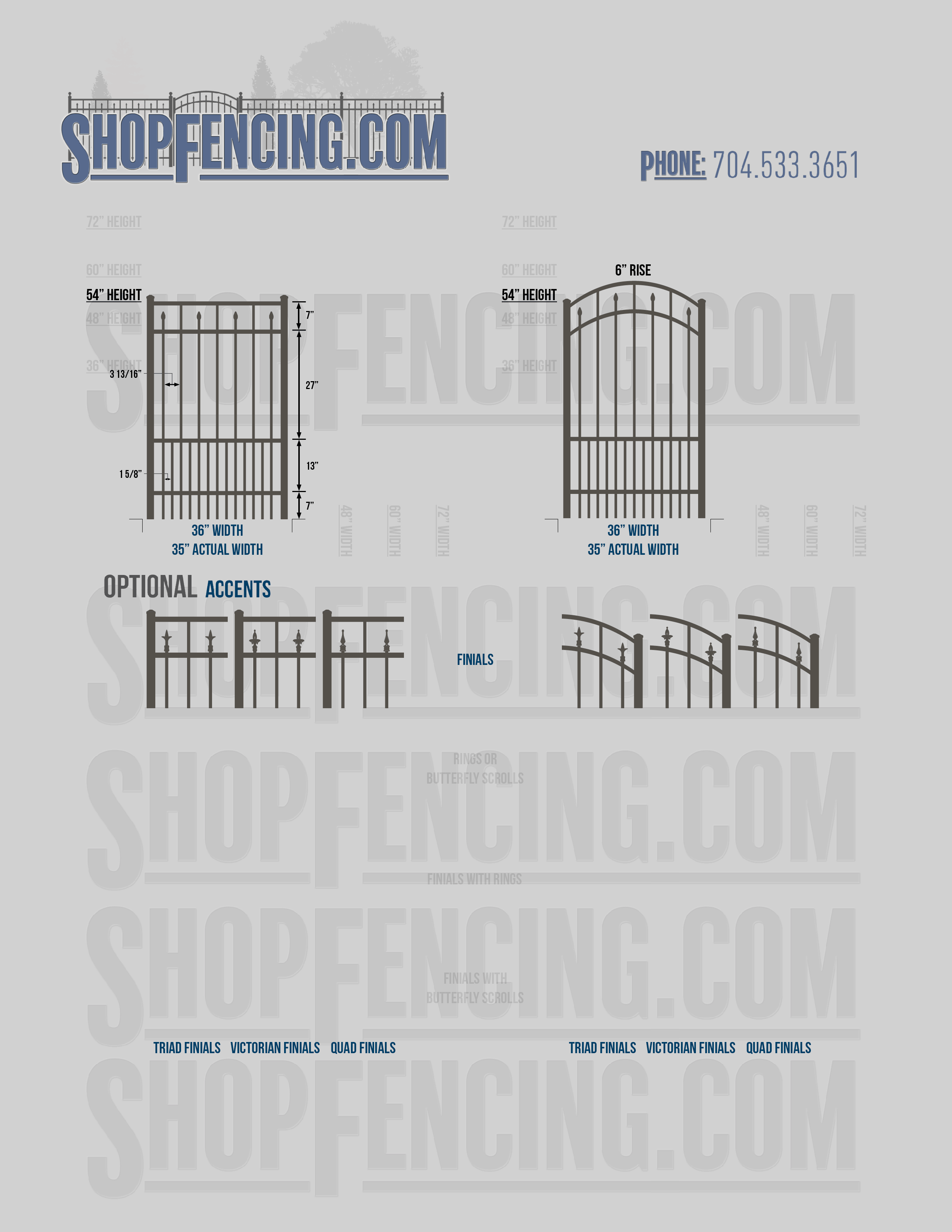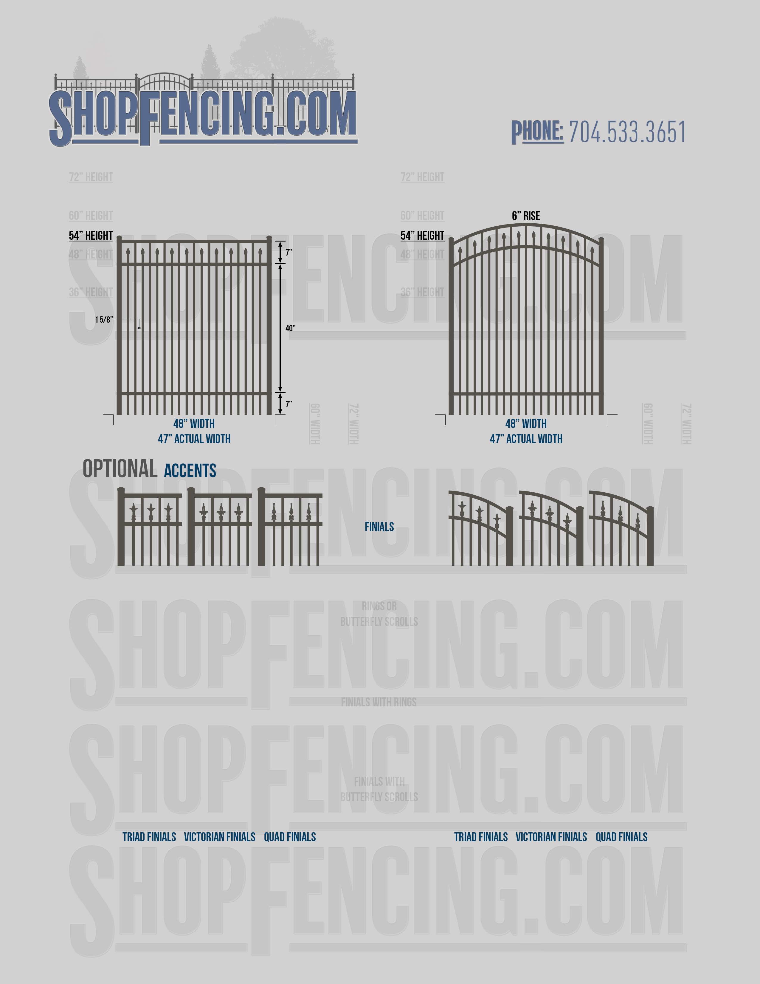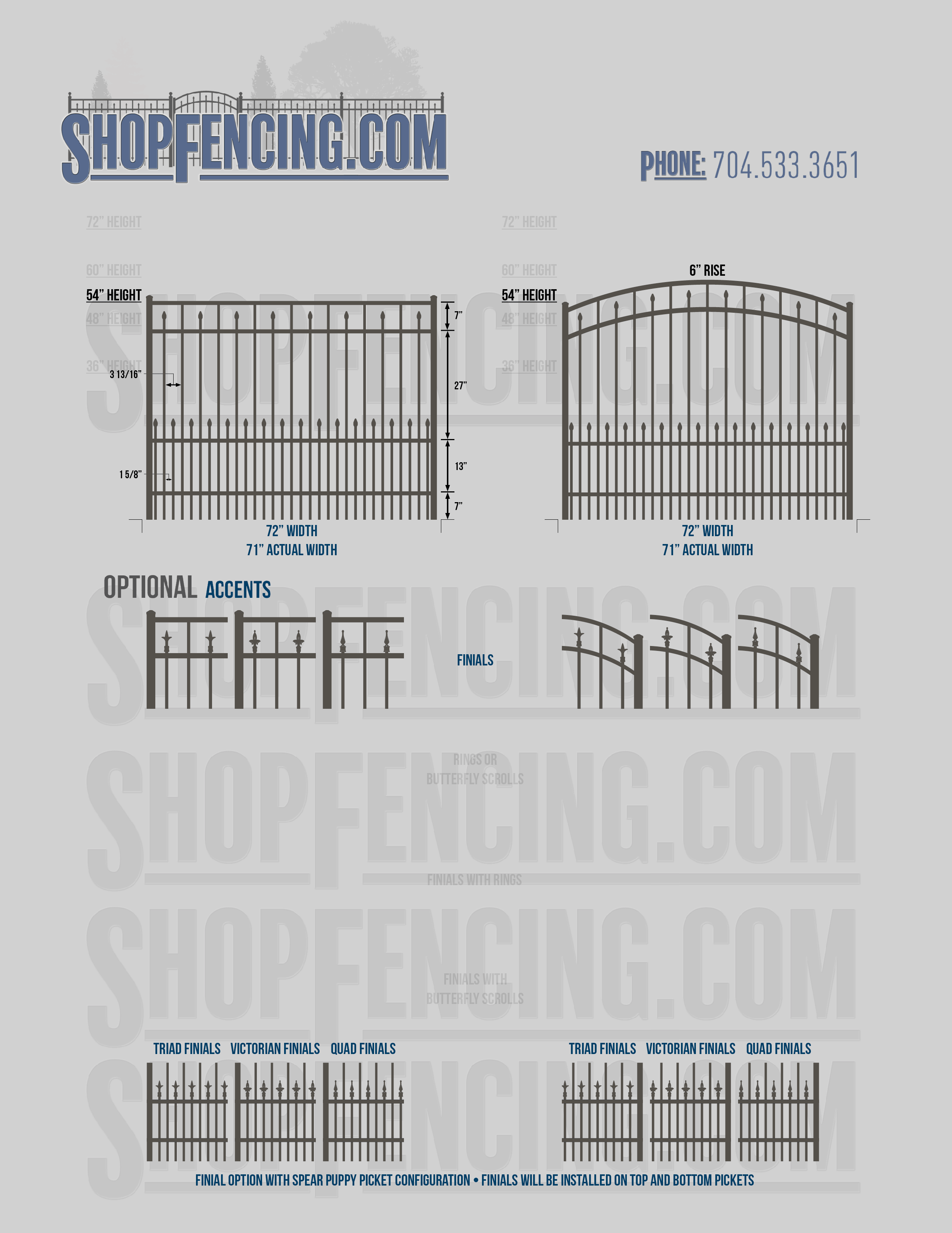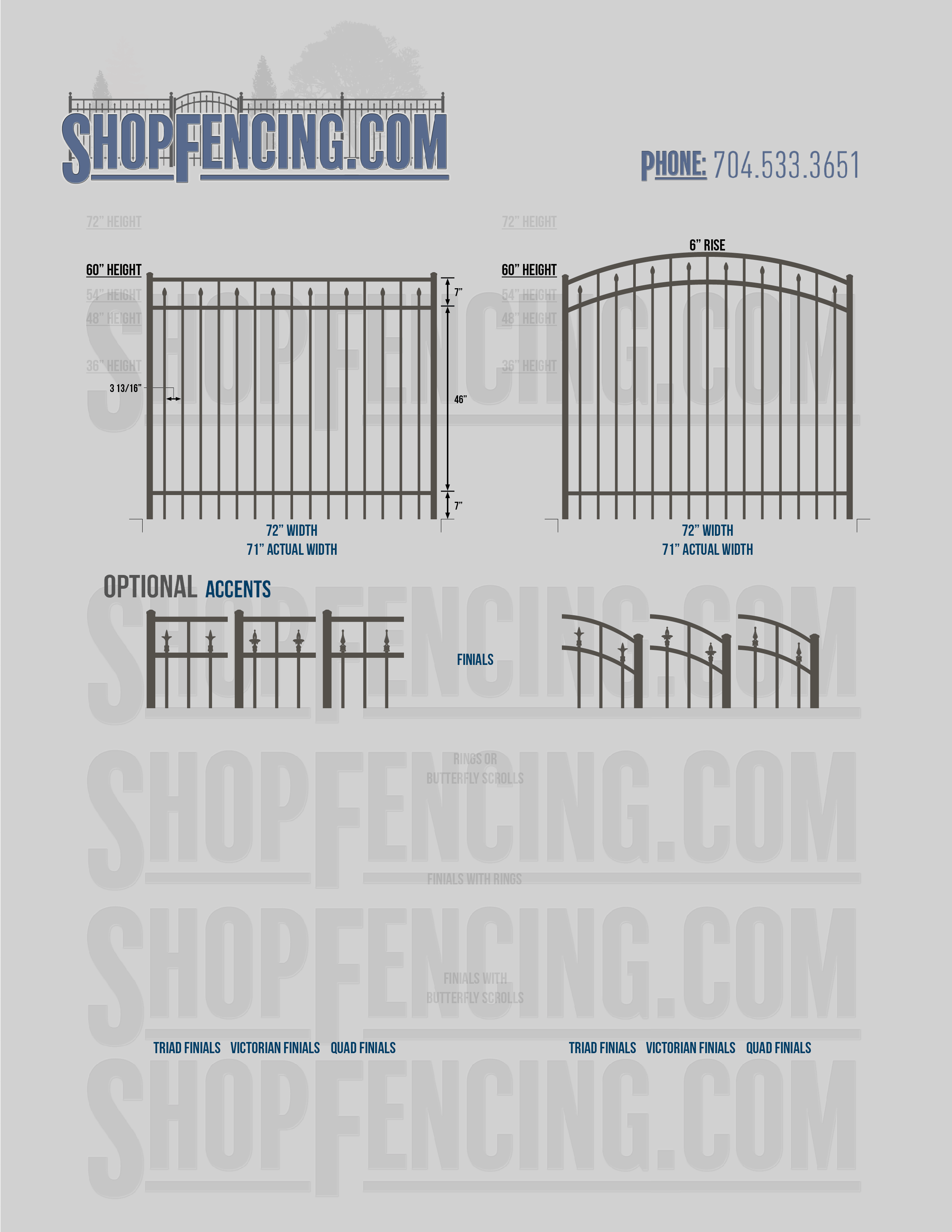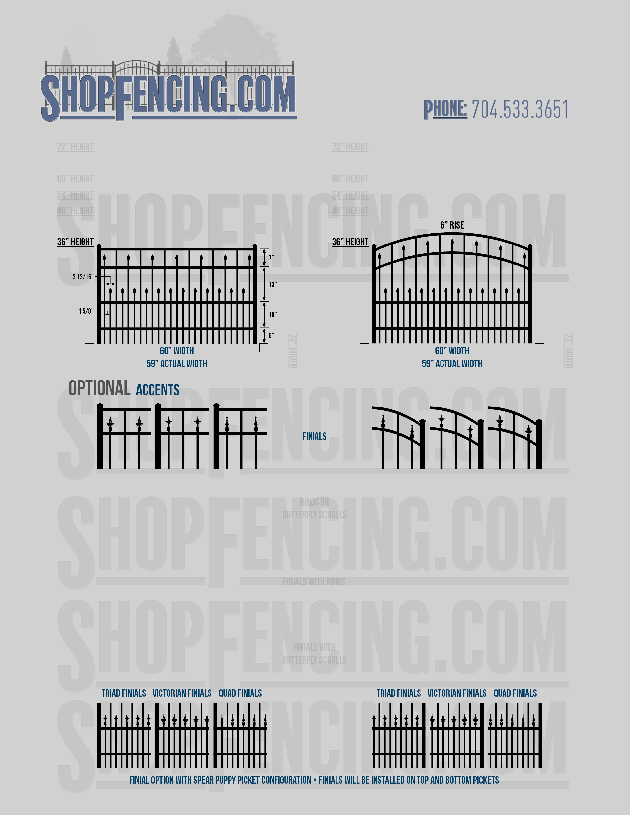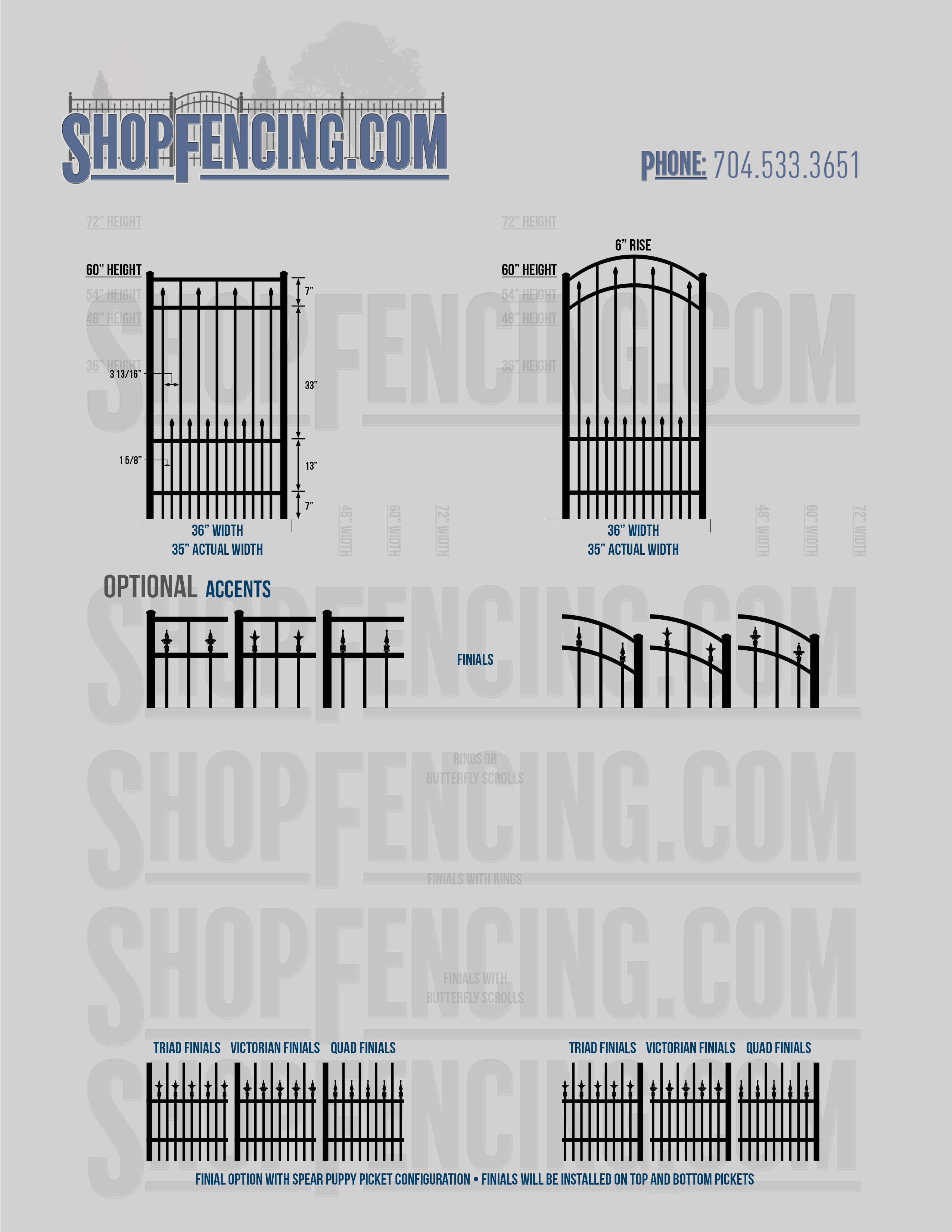 Accent Upgrades: When you add these options, gates will ship with the finials, rings or scrolls installed. PLEASE NOTE: Triad and Victorian finials cannot be installed on double picket fence sections and gates. Rings and scrolls cannot be installed on double picket fence sections and gates.