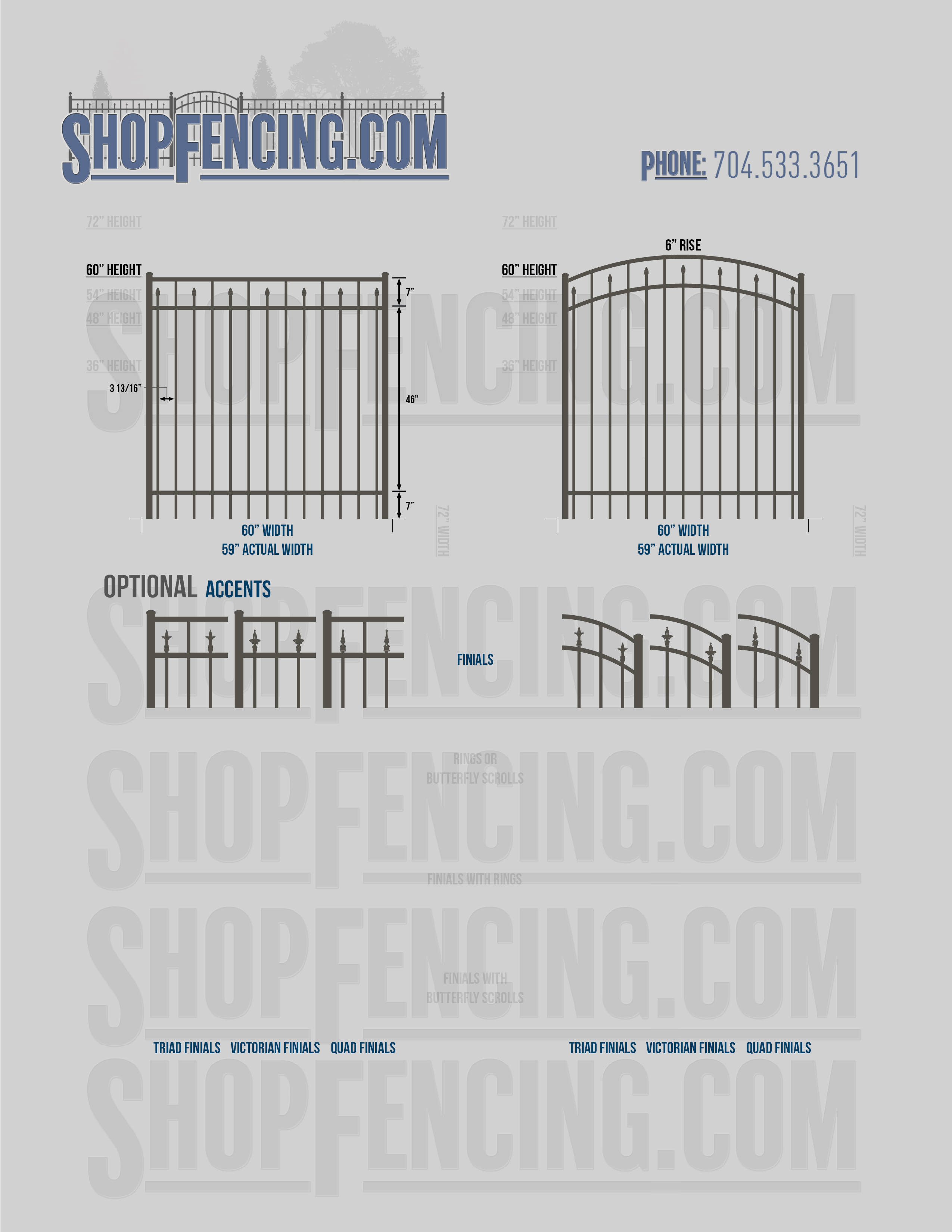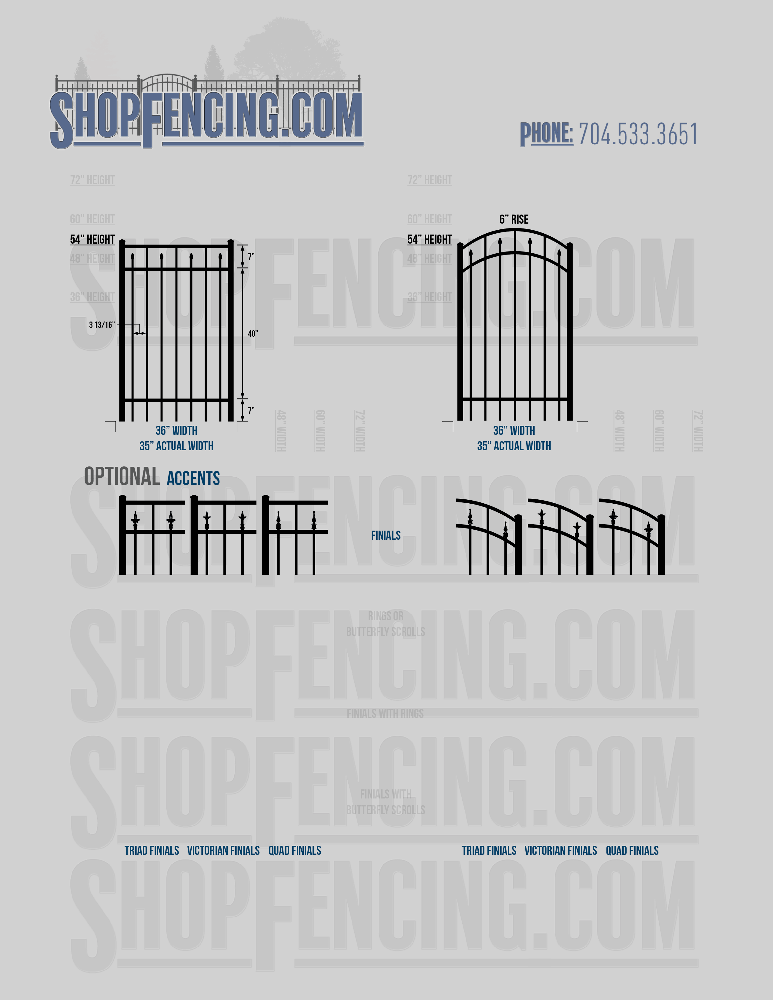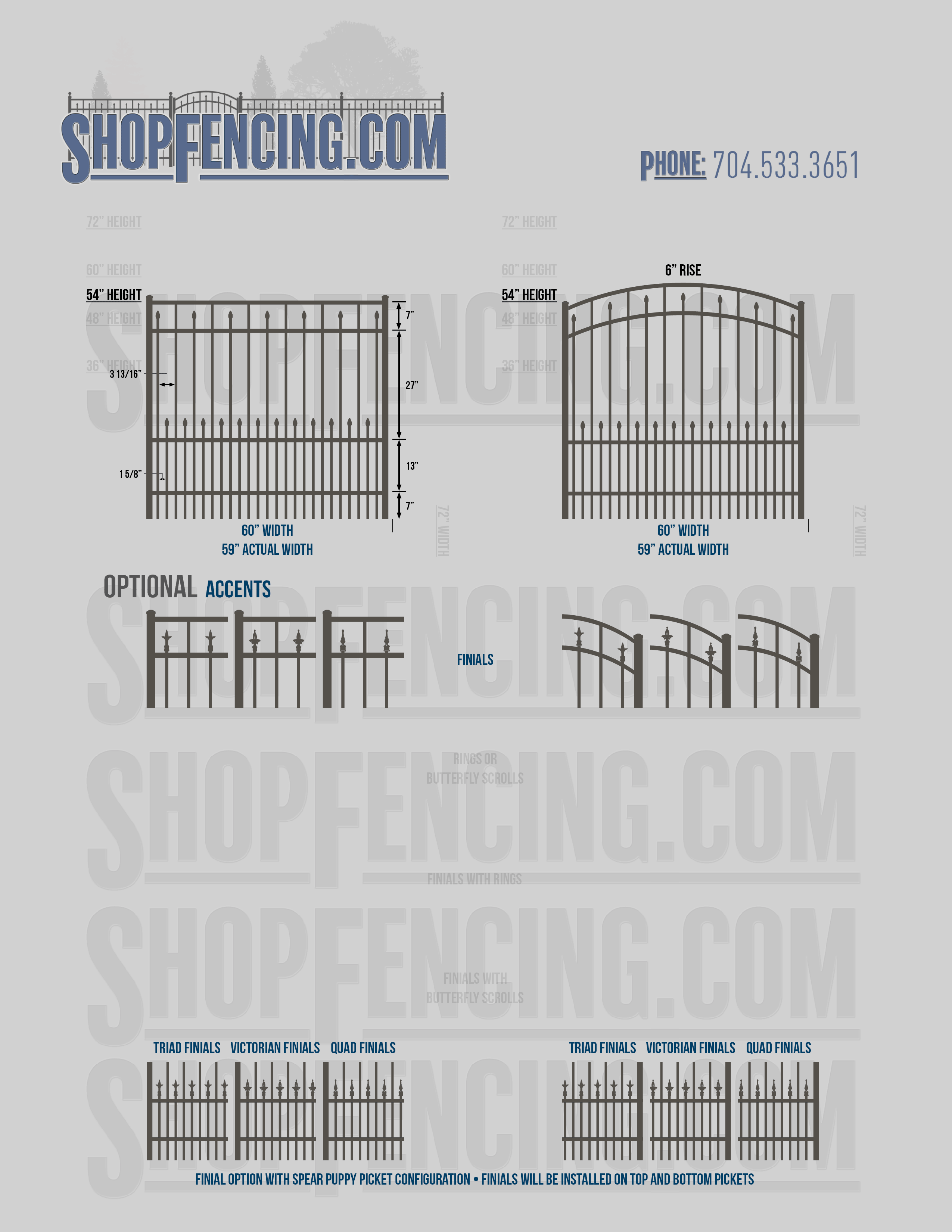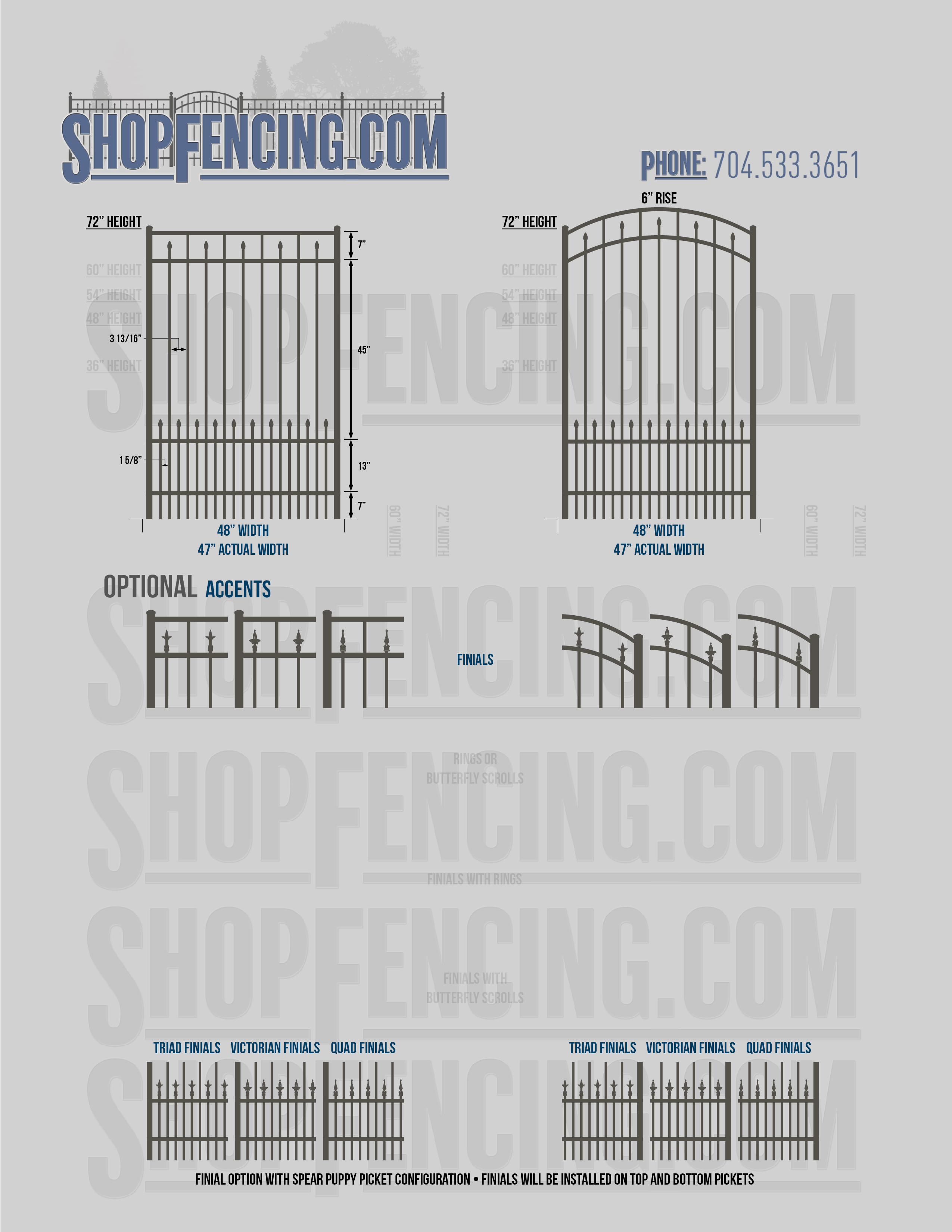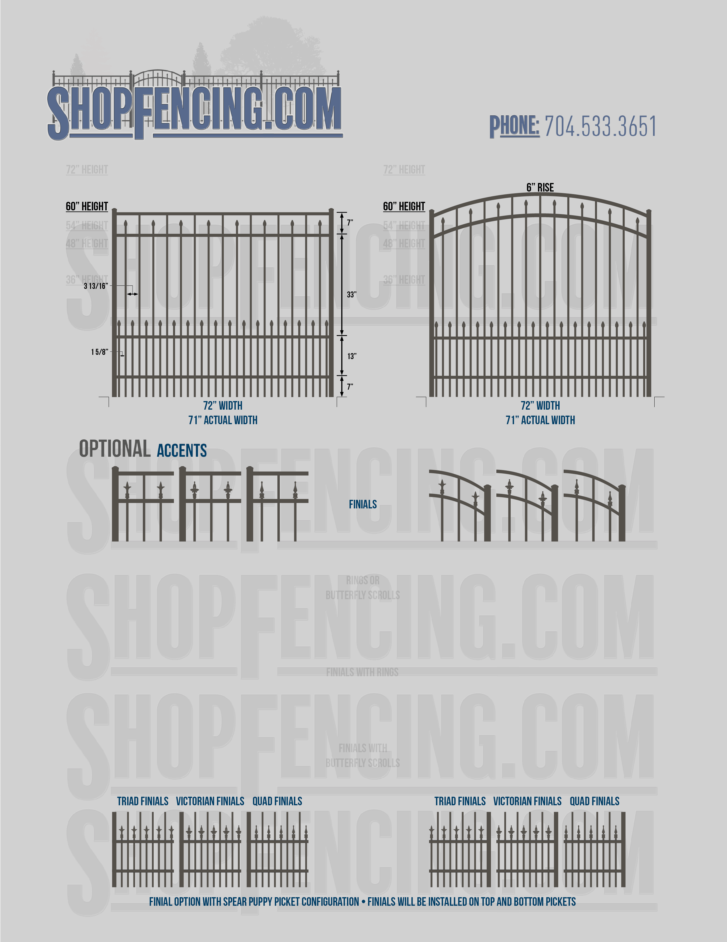 Accent Upgrades: When you add these options, gates will ship with the finials, rings or scrolls installed. PLEASE NOTE: Triad and Victorian finials cannot be installed on double picket fence sections and gates. Rings and scrolls cannot be installed on double picket fence sections and gates.
