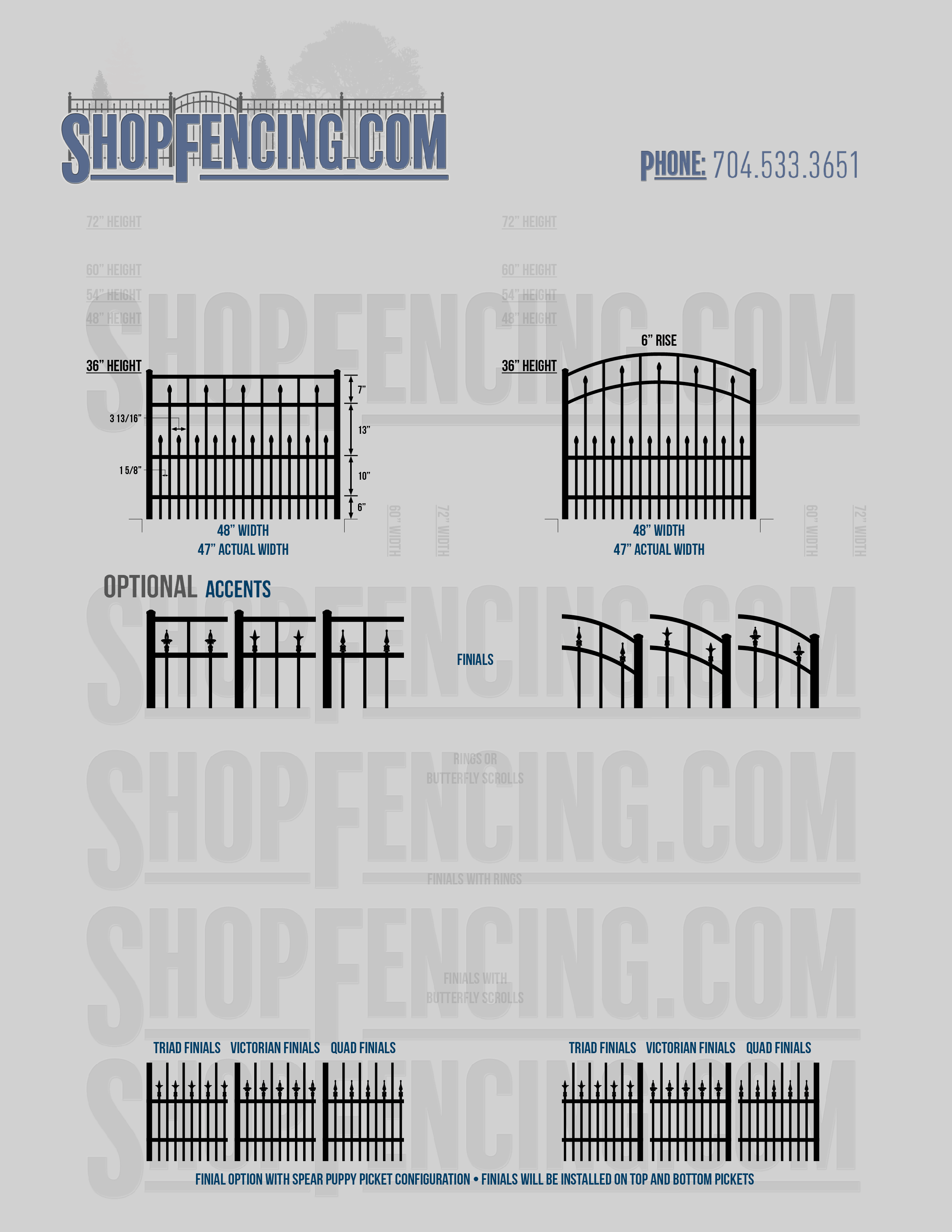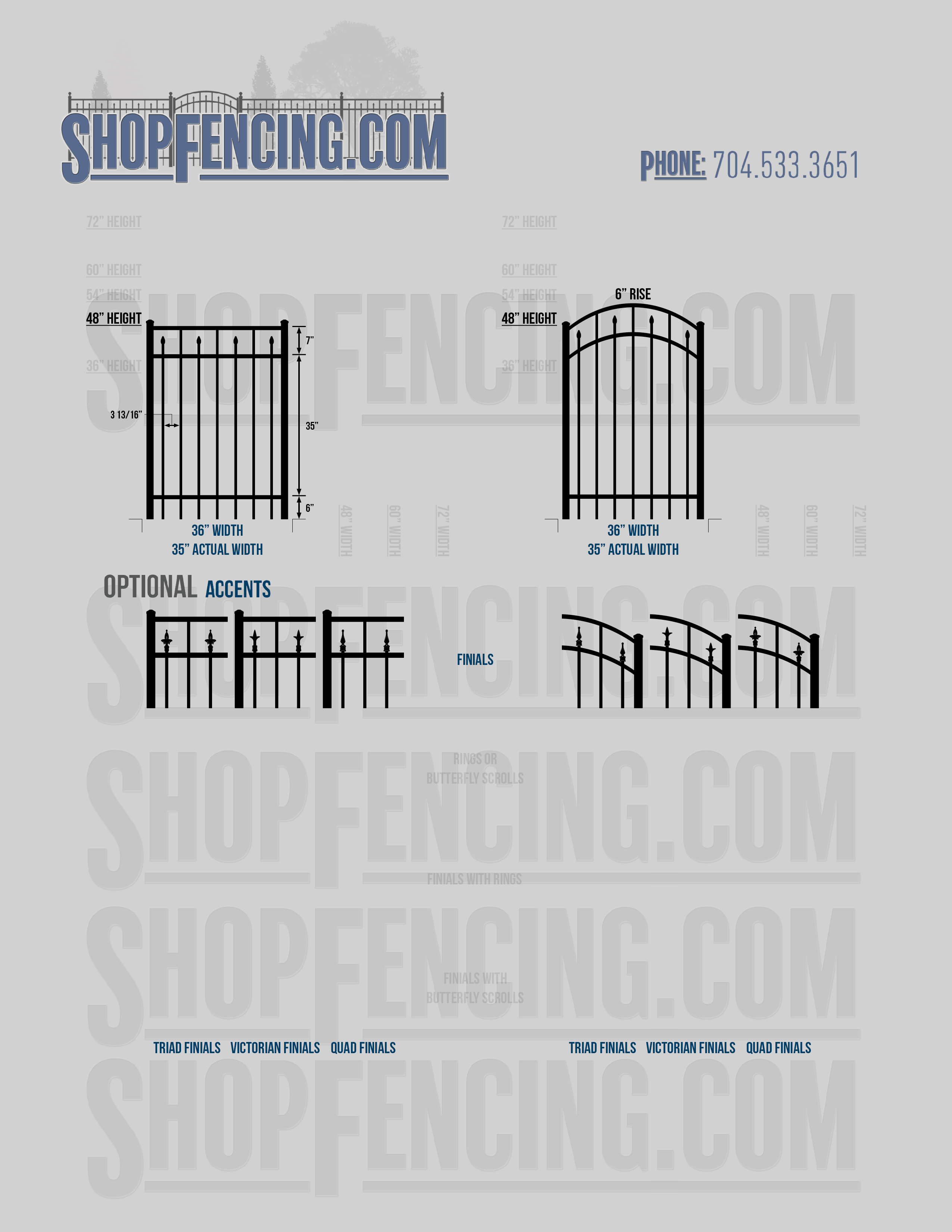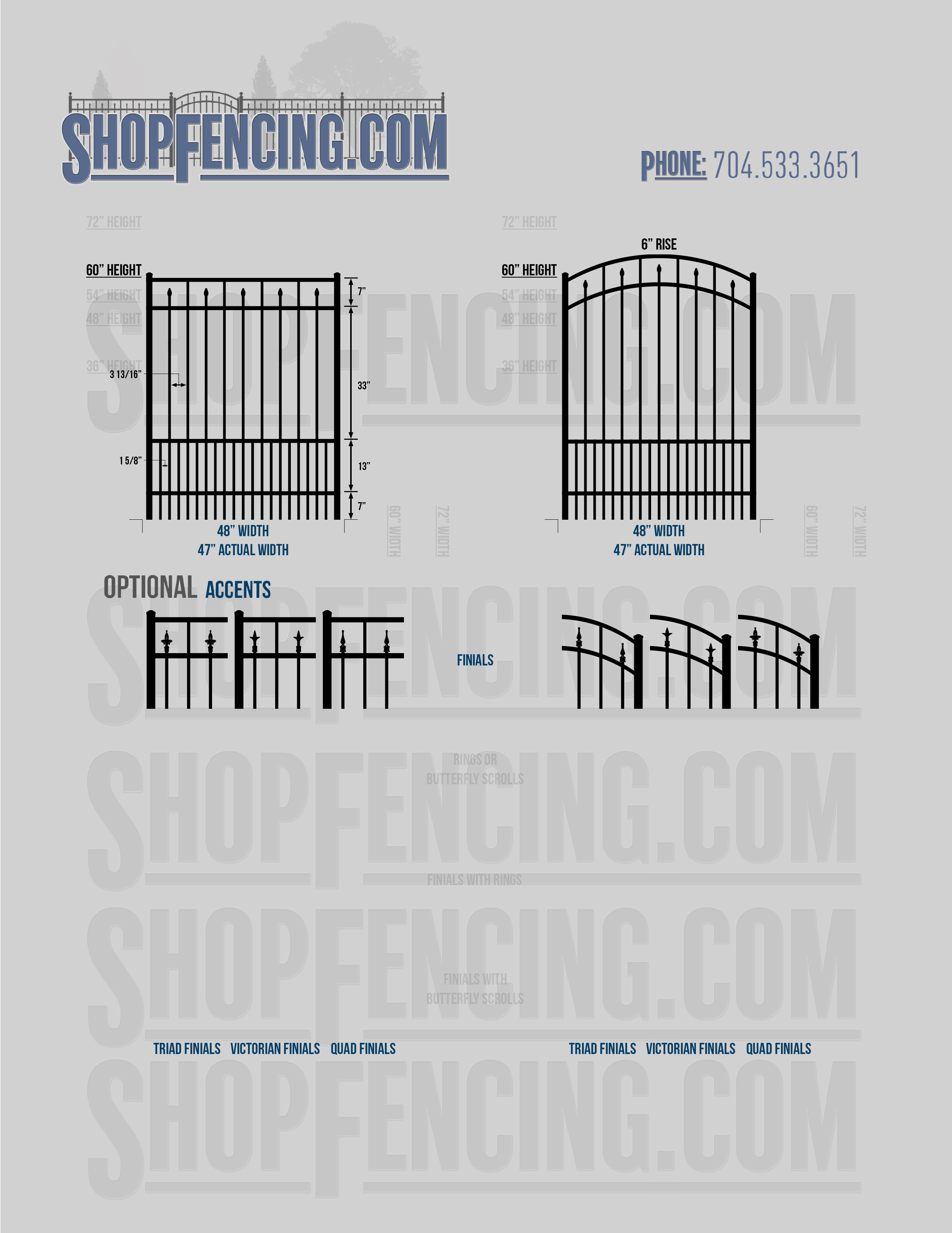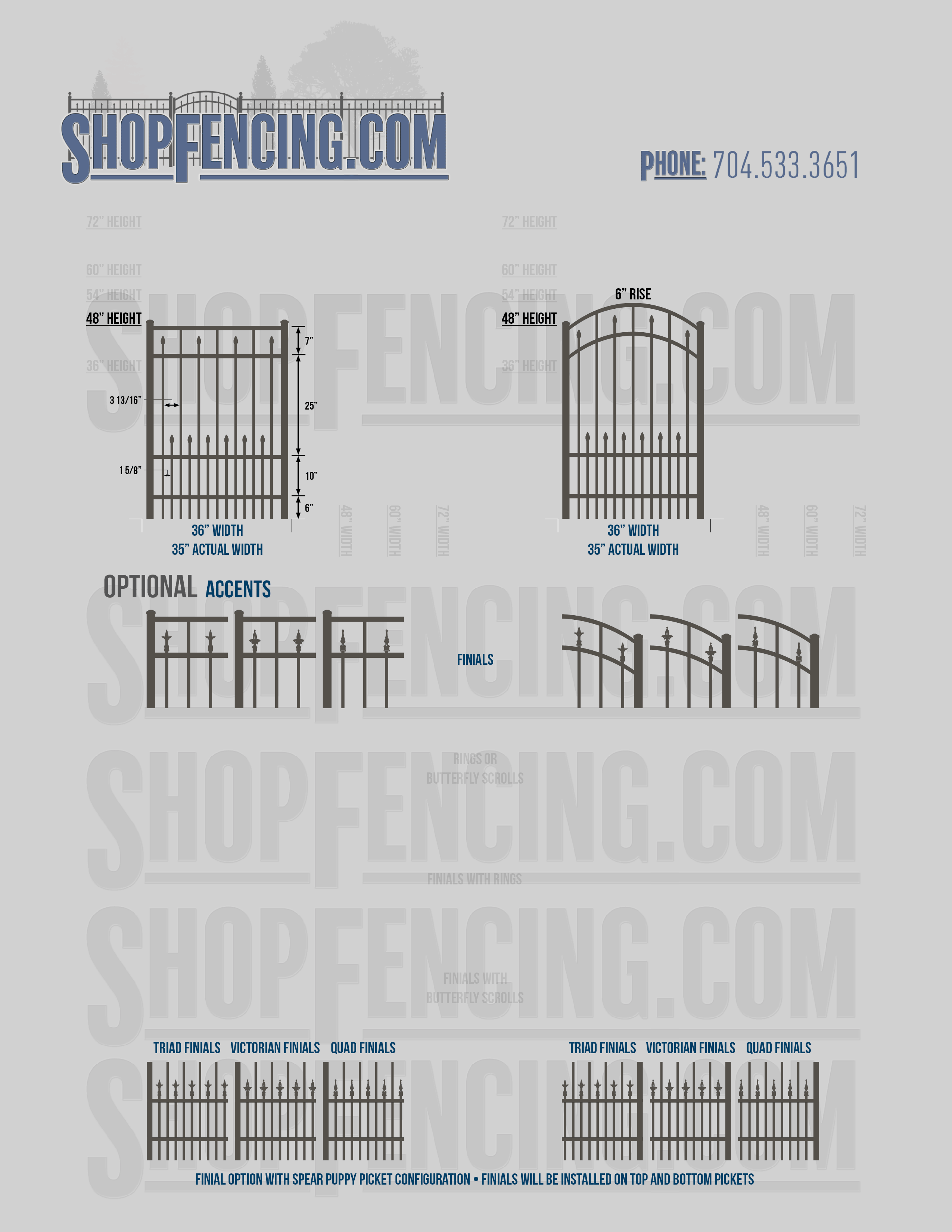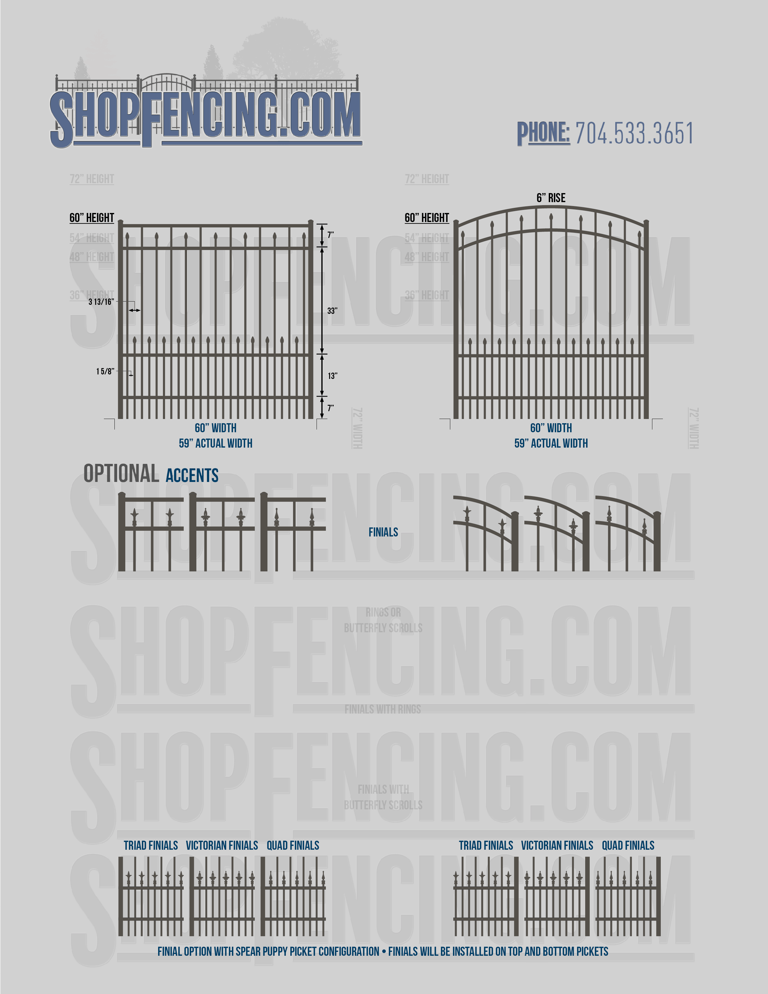 Accent Upgrades: When you add these options, gates will ship with the finials, rings or scrolls installed. PLEASE NOTE: Triad and Victorian finials cannot be installed on double picket fence sections and gates. Rings and scrolls cannot be installed on double picket fence sections and gates.