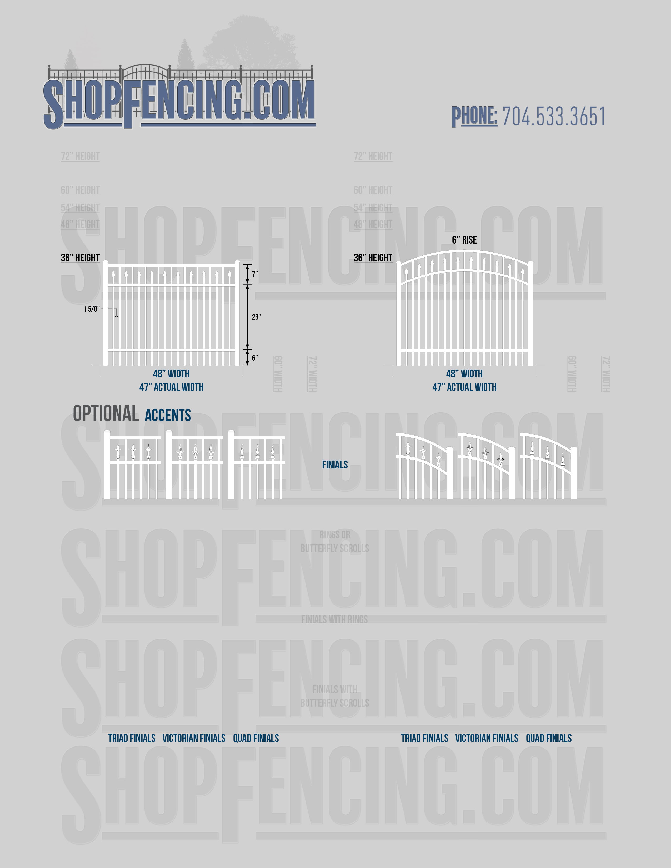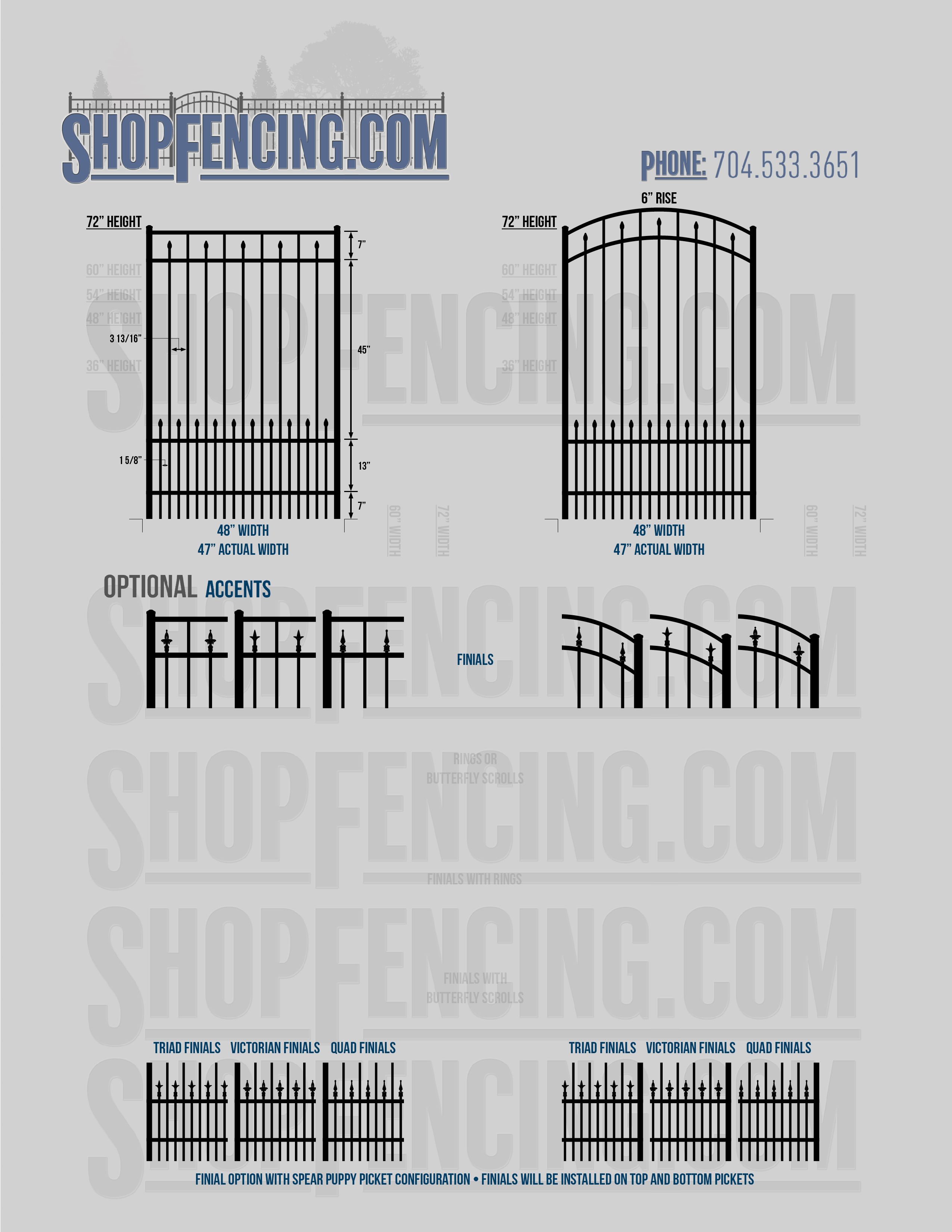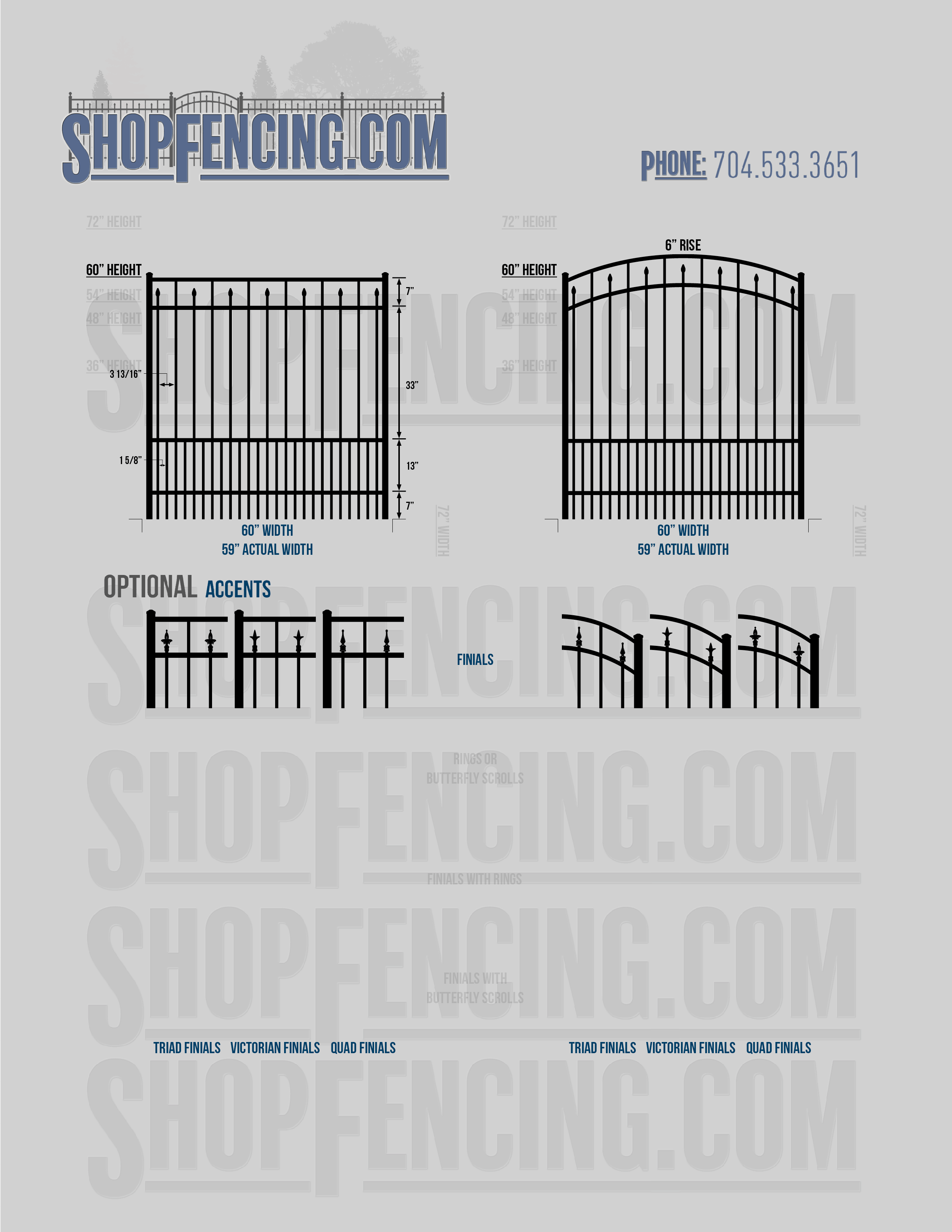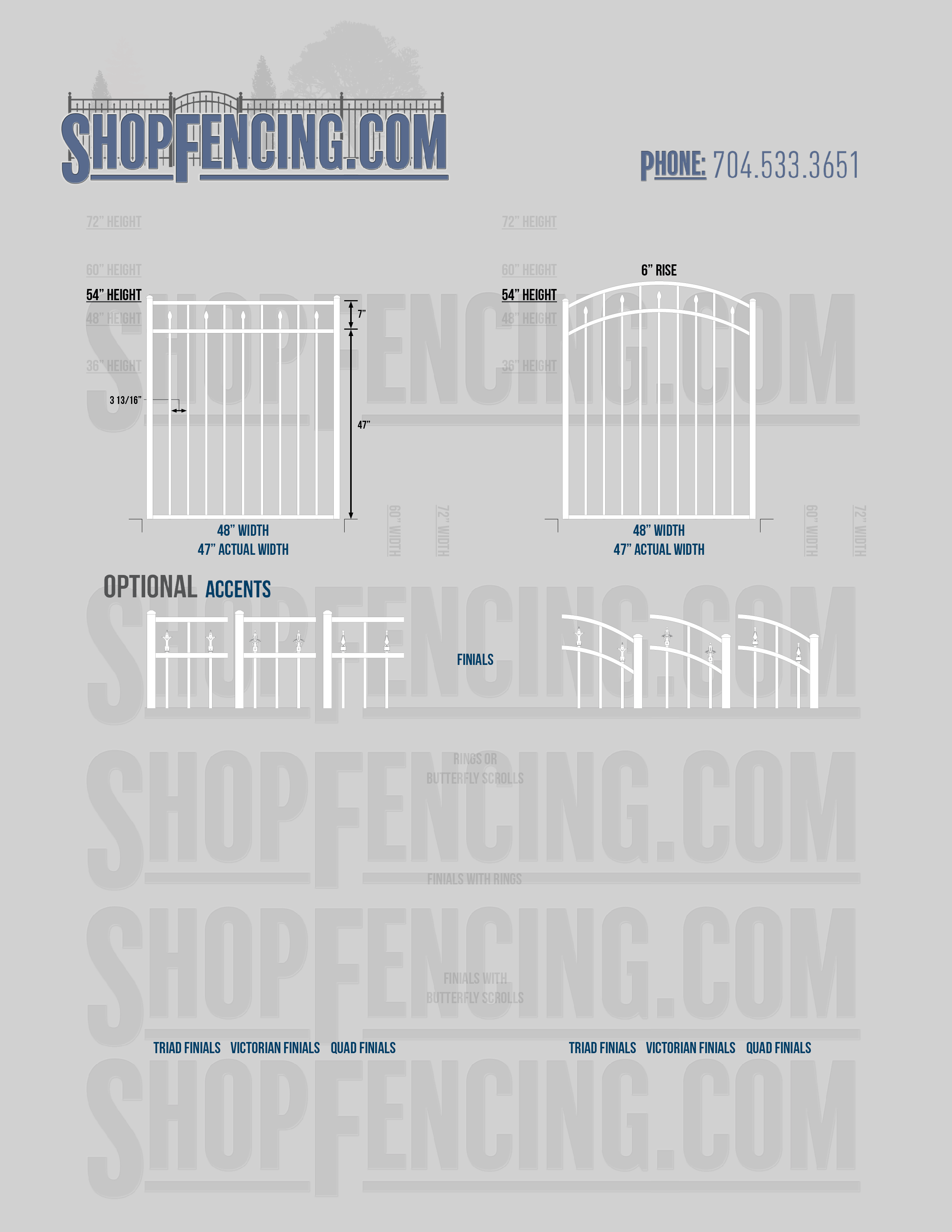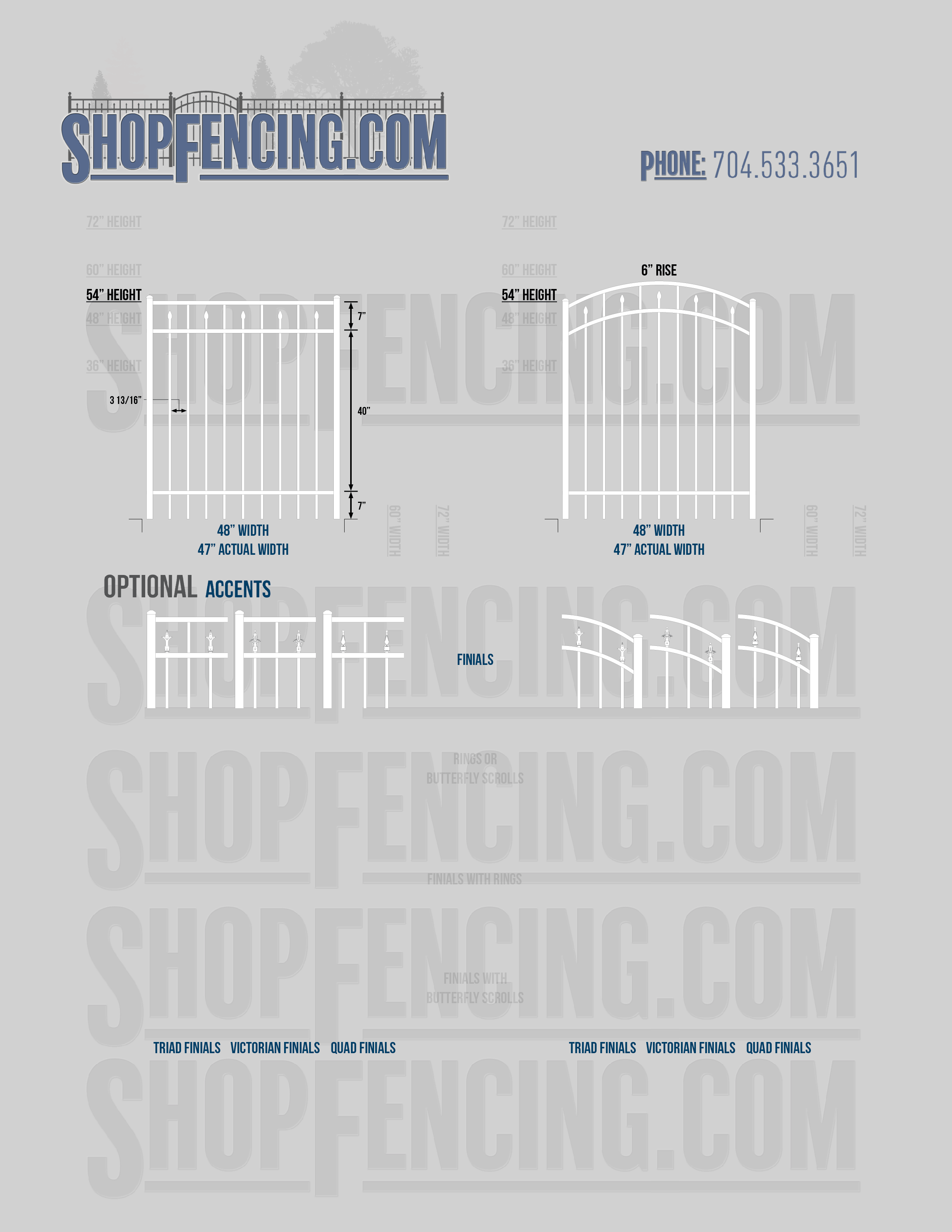 Accent Upgrades: When you add these options, gates will ship with the finials, rings or scrolls installed. PLEASE NOTE: Triad and Victorian finials cannot be installed on double picket fence sections and gates. Rings and scrolls cannot be installed on double picket fence sections and gates.