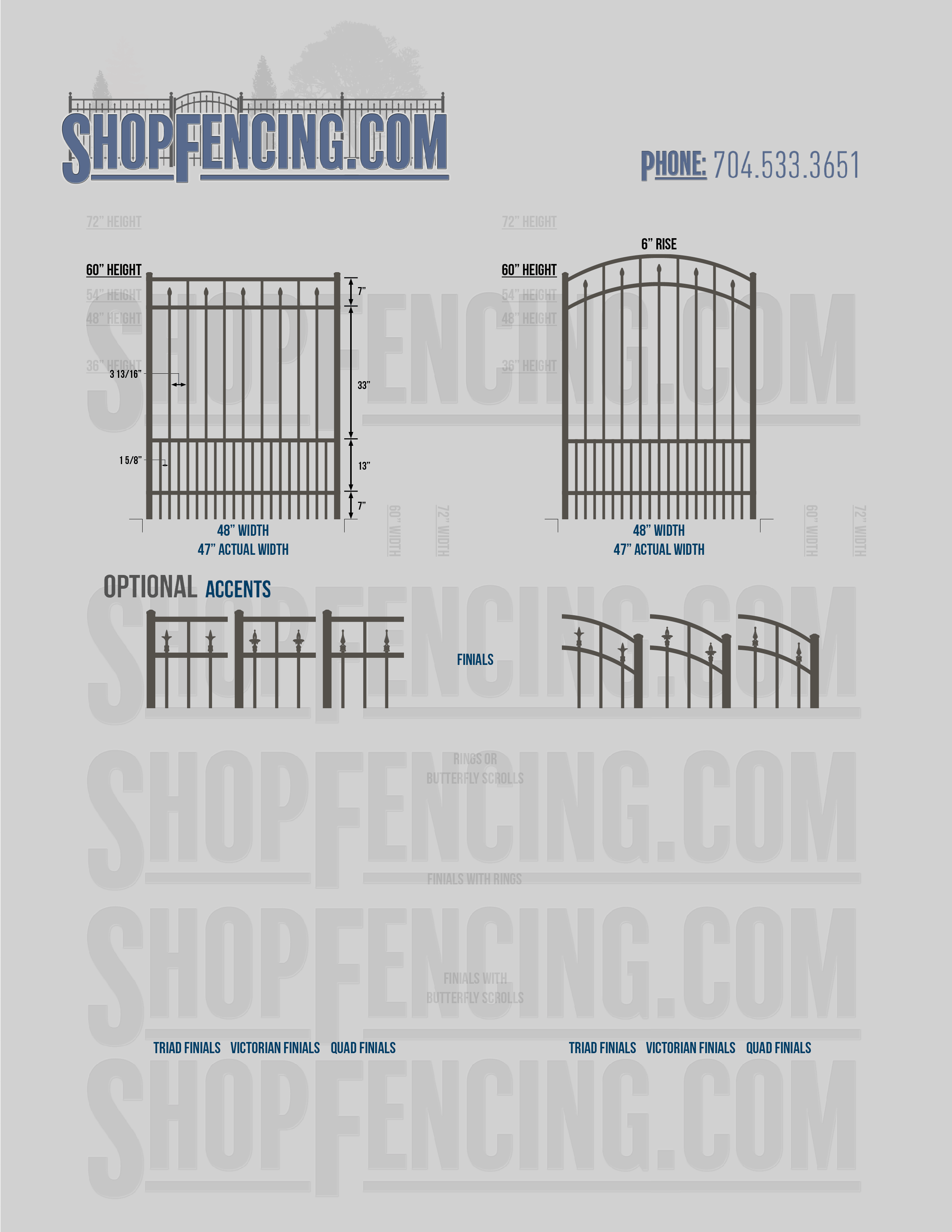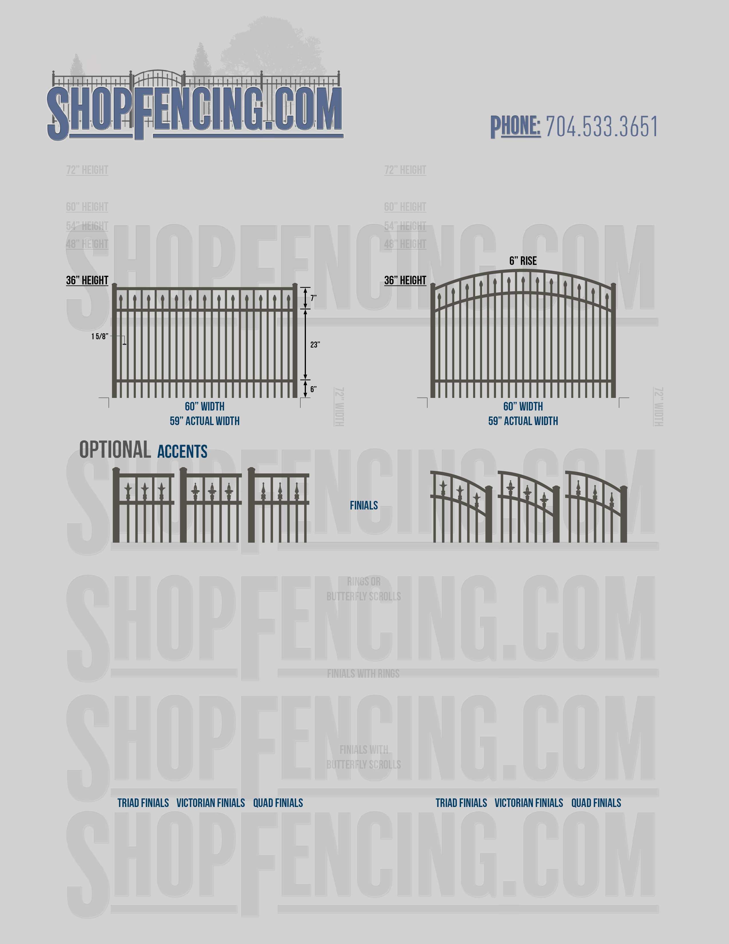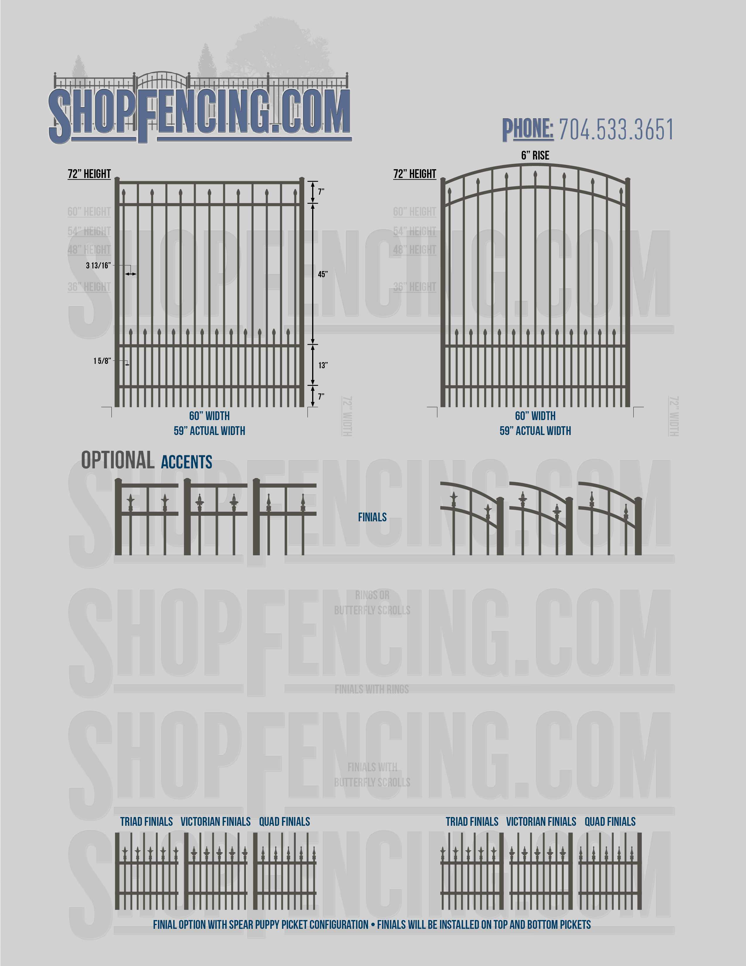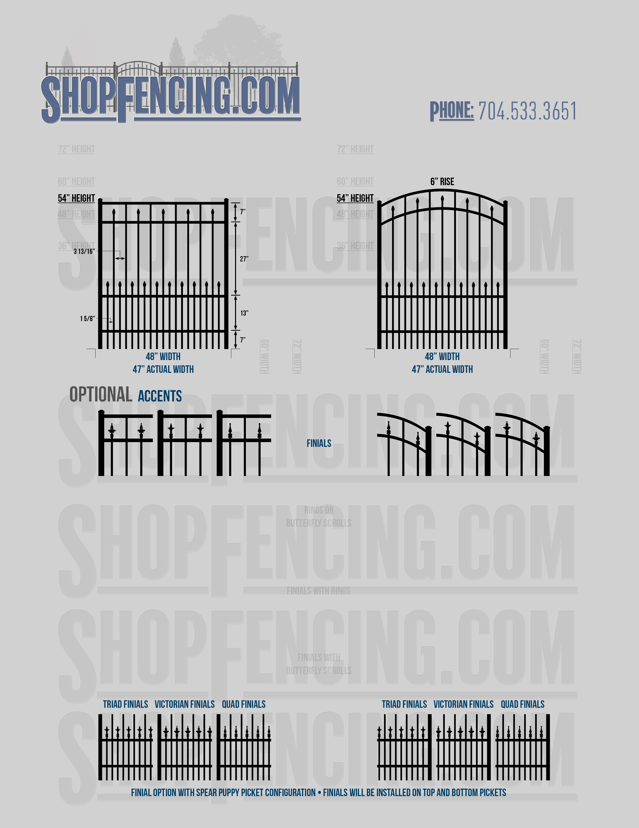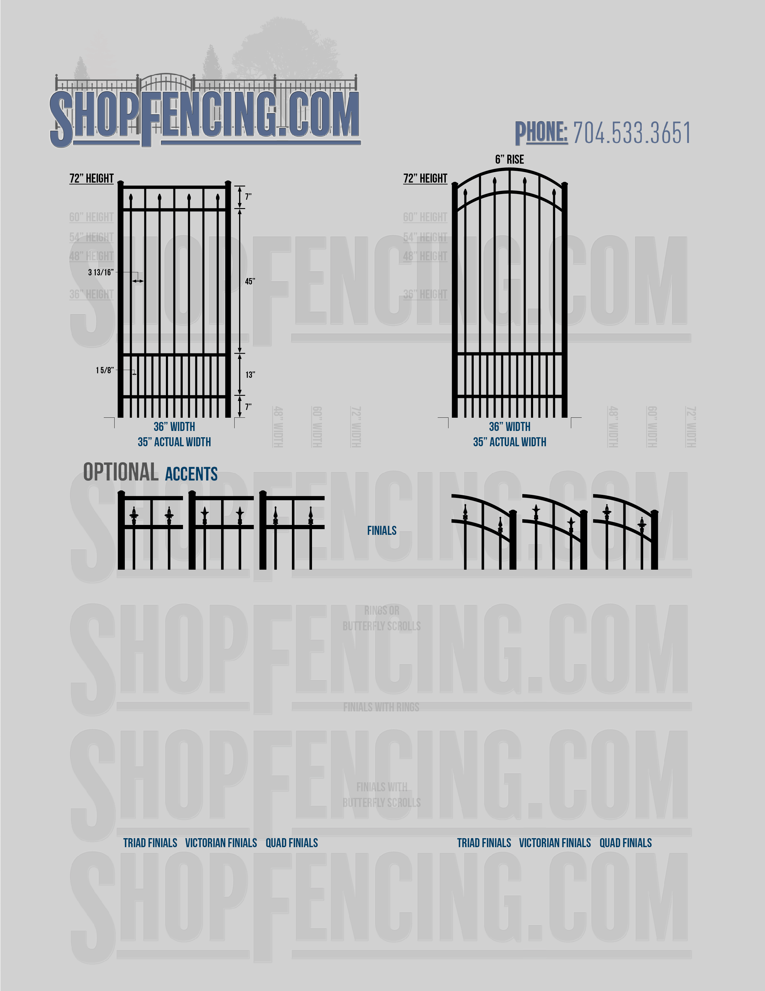 Accent Upgrades: When you add these options, gates will ship with the finials, rings or scrolls installed. PLEASE NOTE: Triad and Victorian finials cannot be installed on double picket fence sections and gates. Rings and scrolls cannot be installed on double picket fence sections and gates.