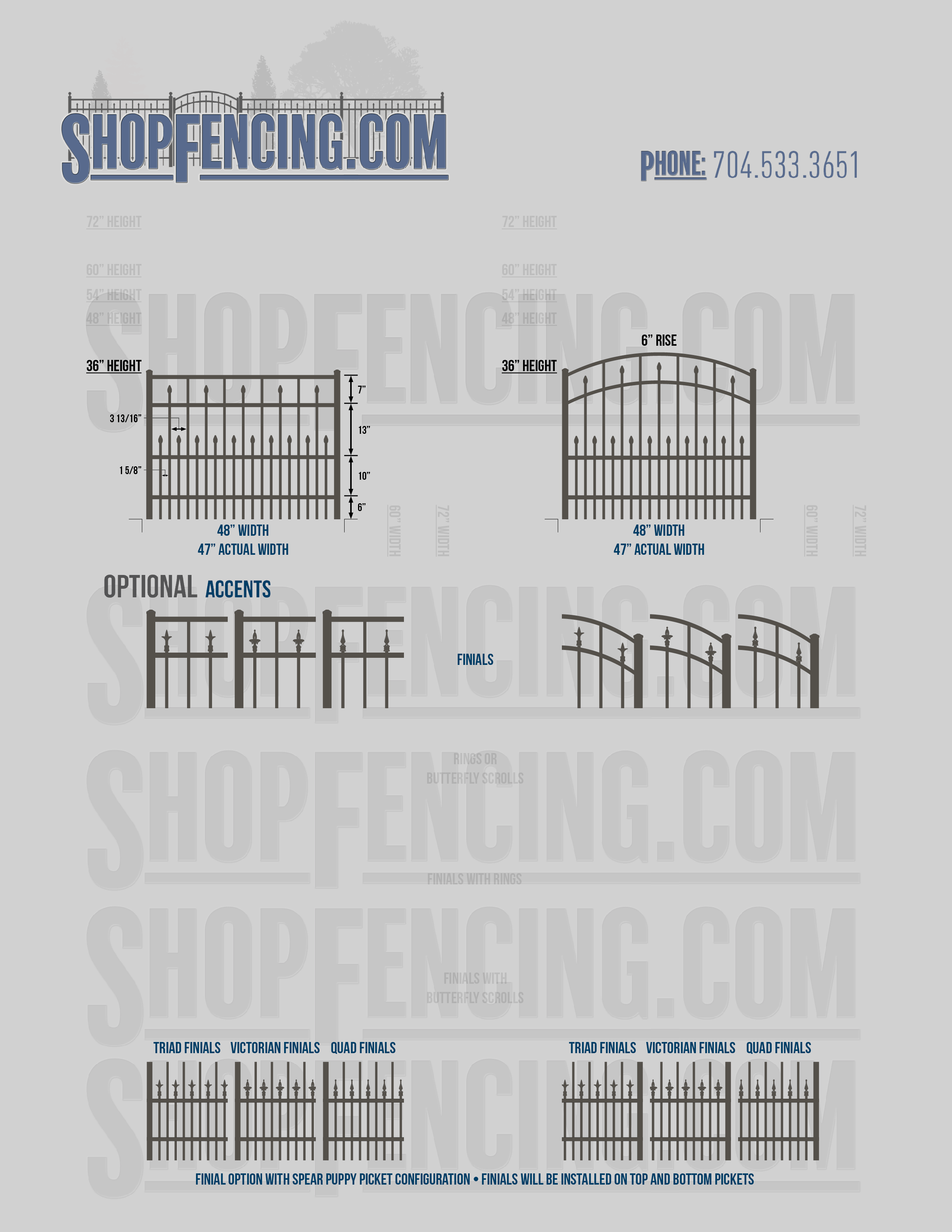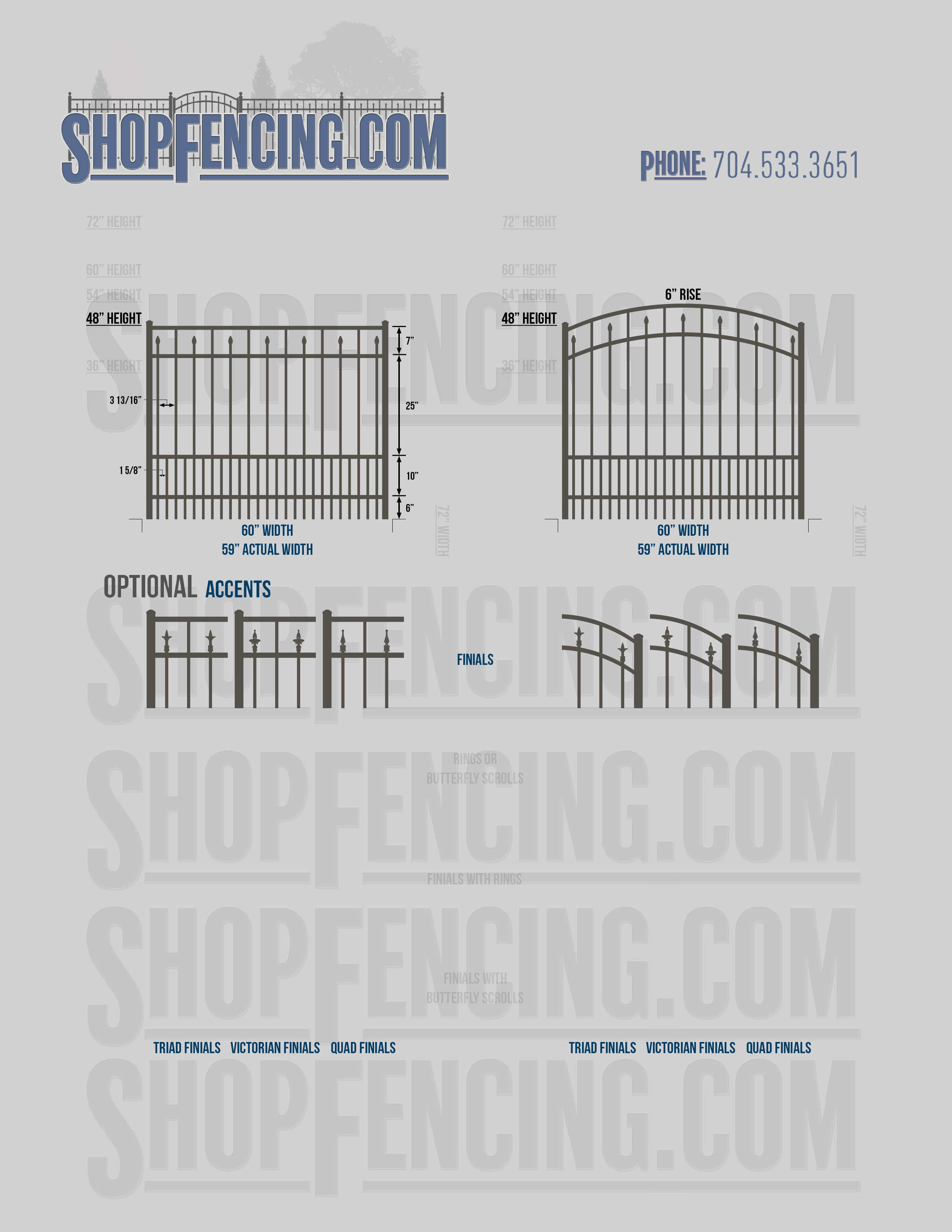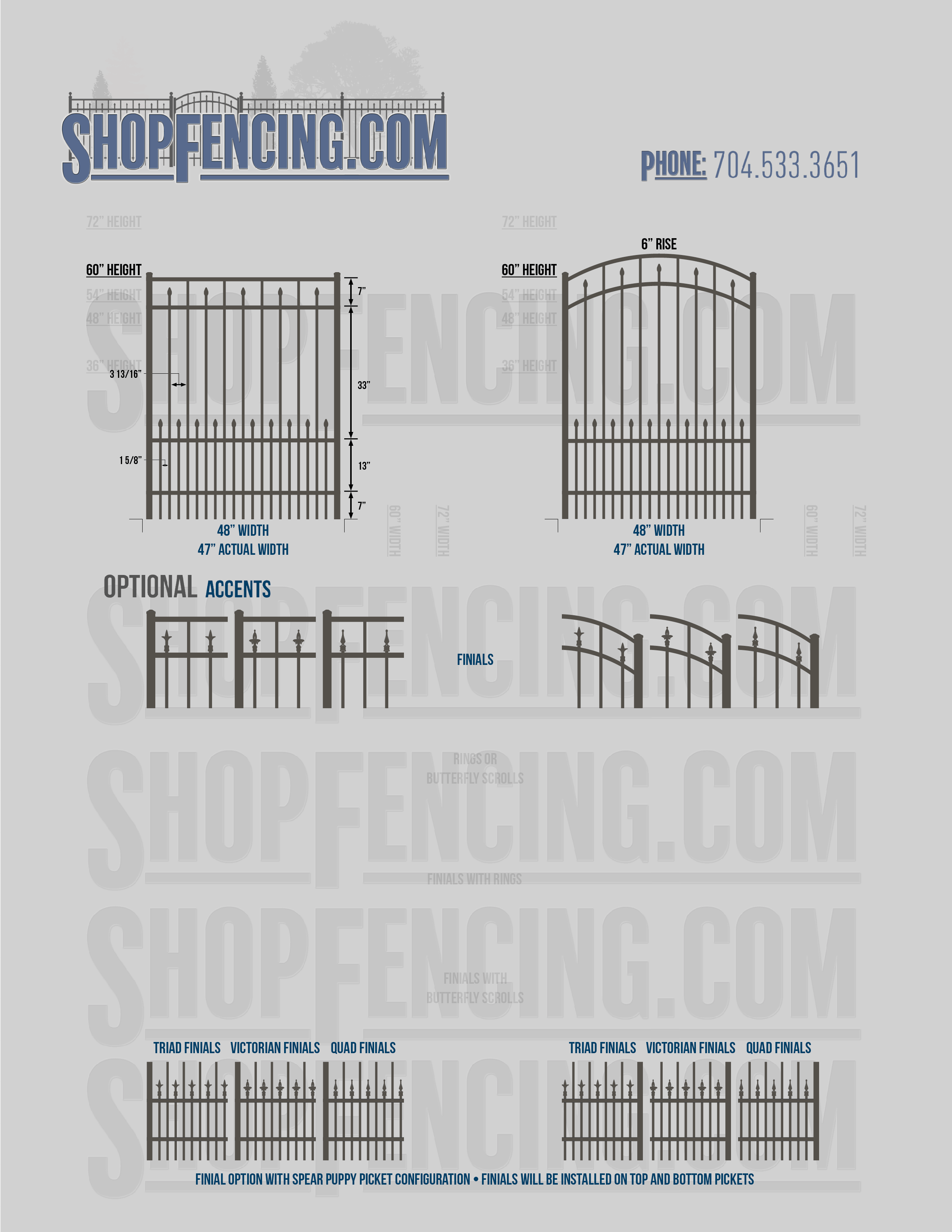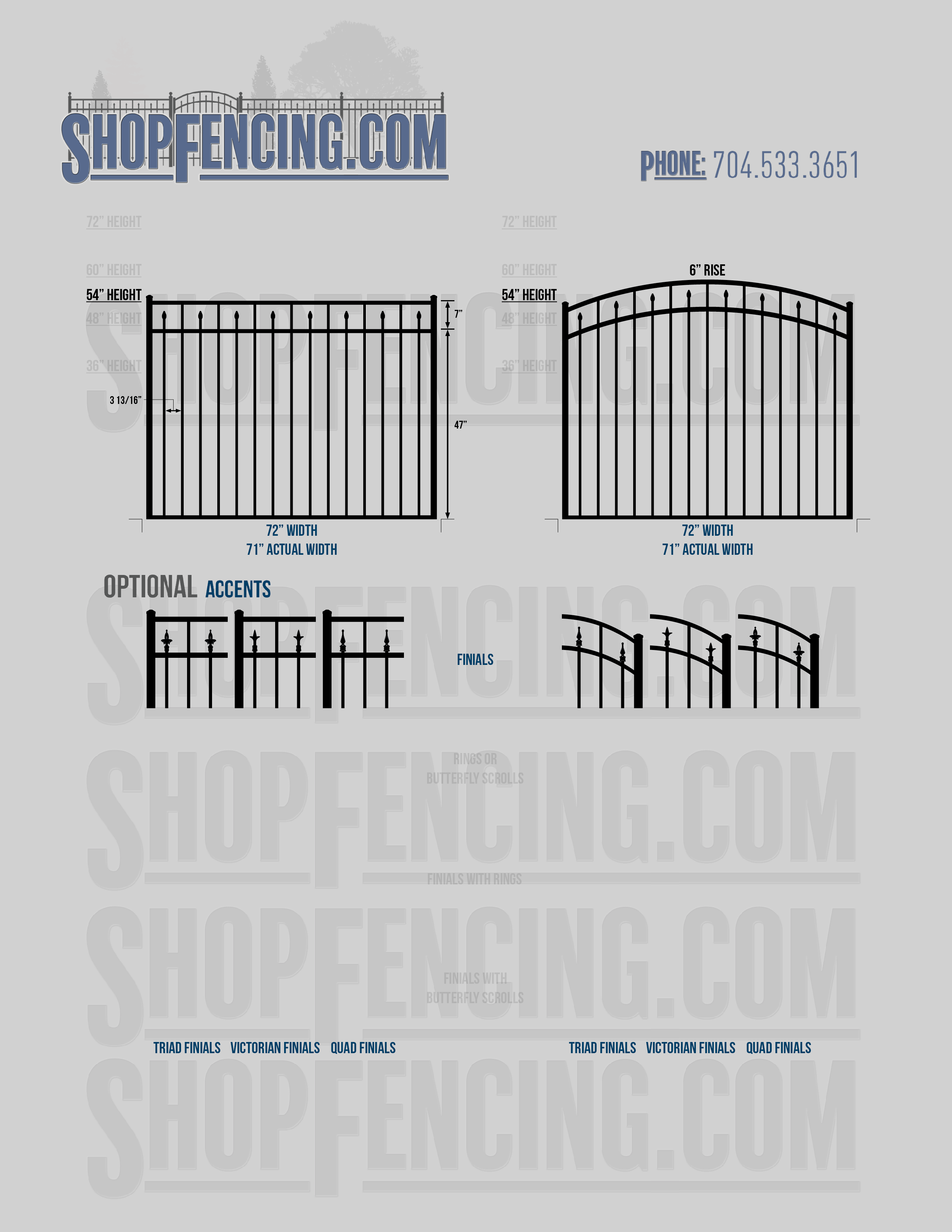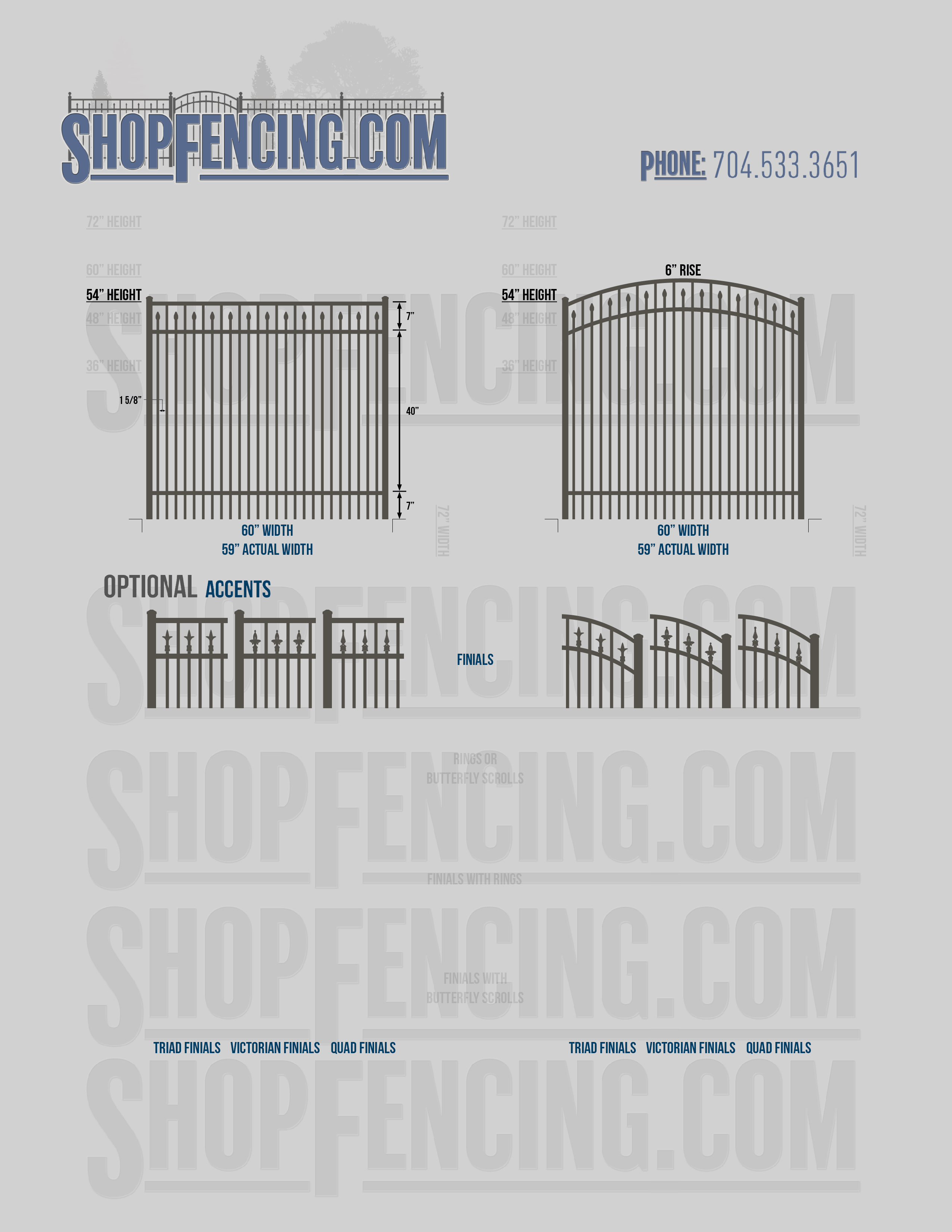 Accent Upgrades: When you add these options, gates will ship with the finials, rings or scrolls installed. PLEASE NOTE: Triad and Victorian finials cannot be installed on double picket fence sections and gates. Rings and scrolls cannot be installed on double picket fence sections and gates.