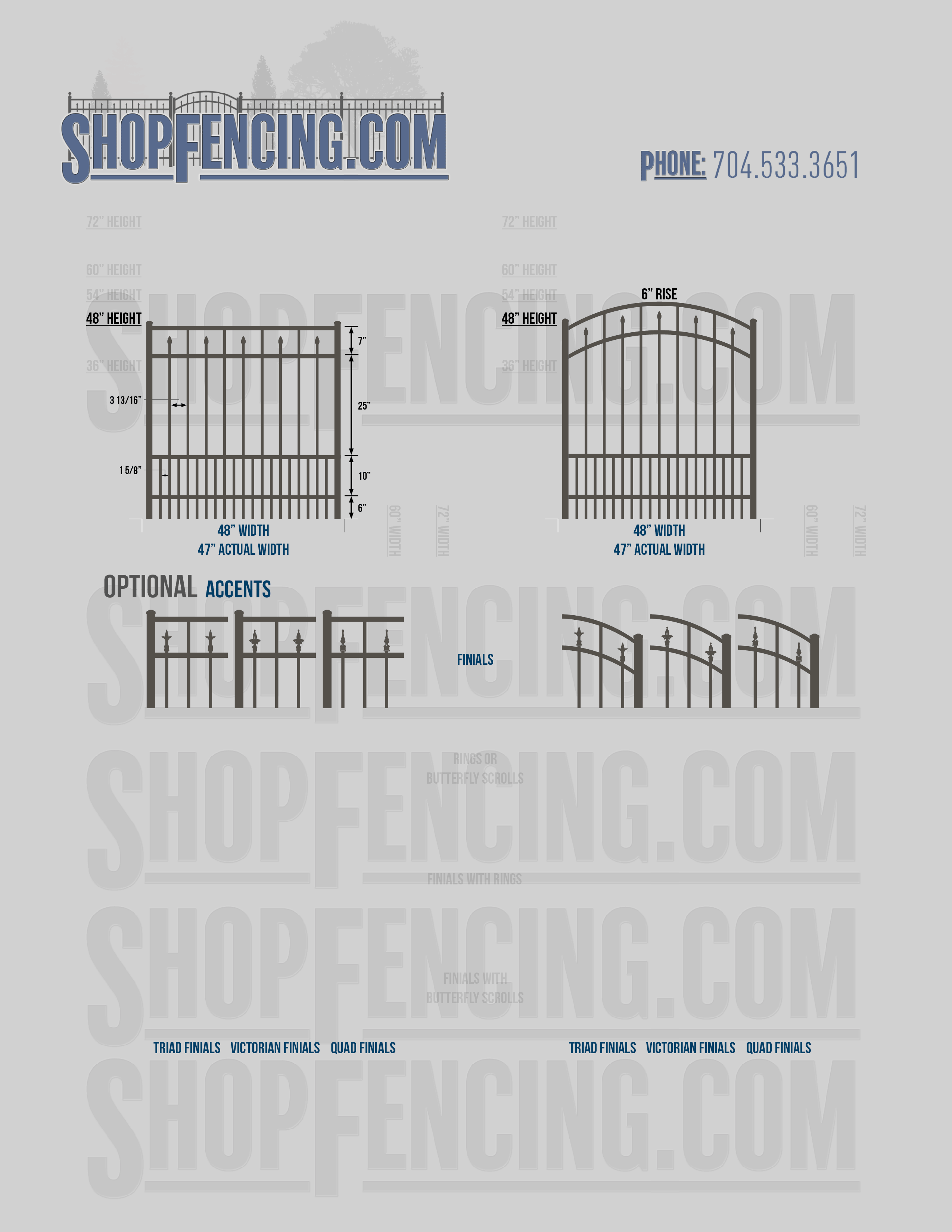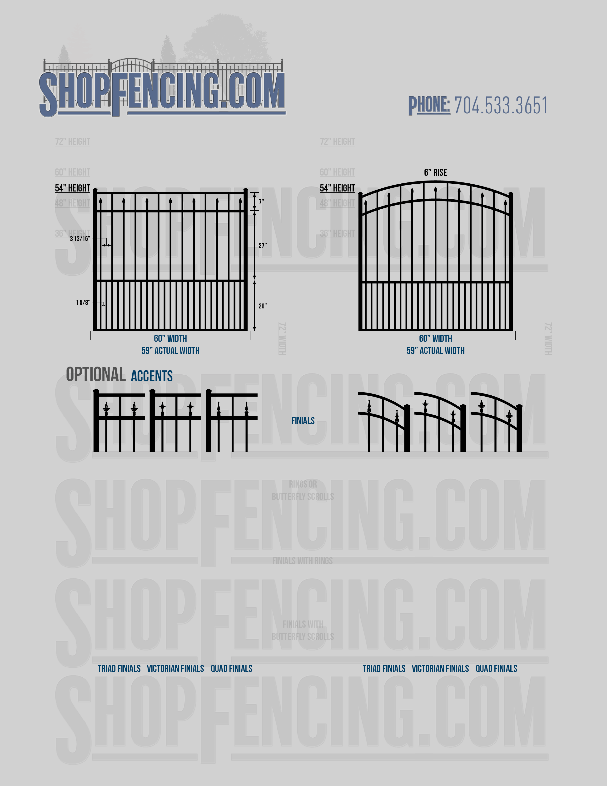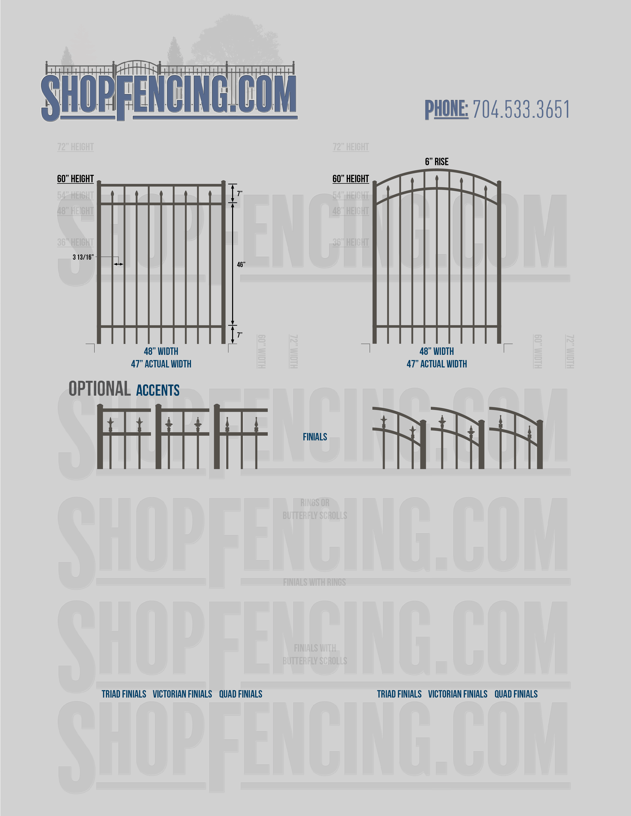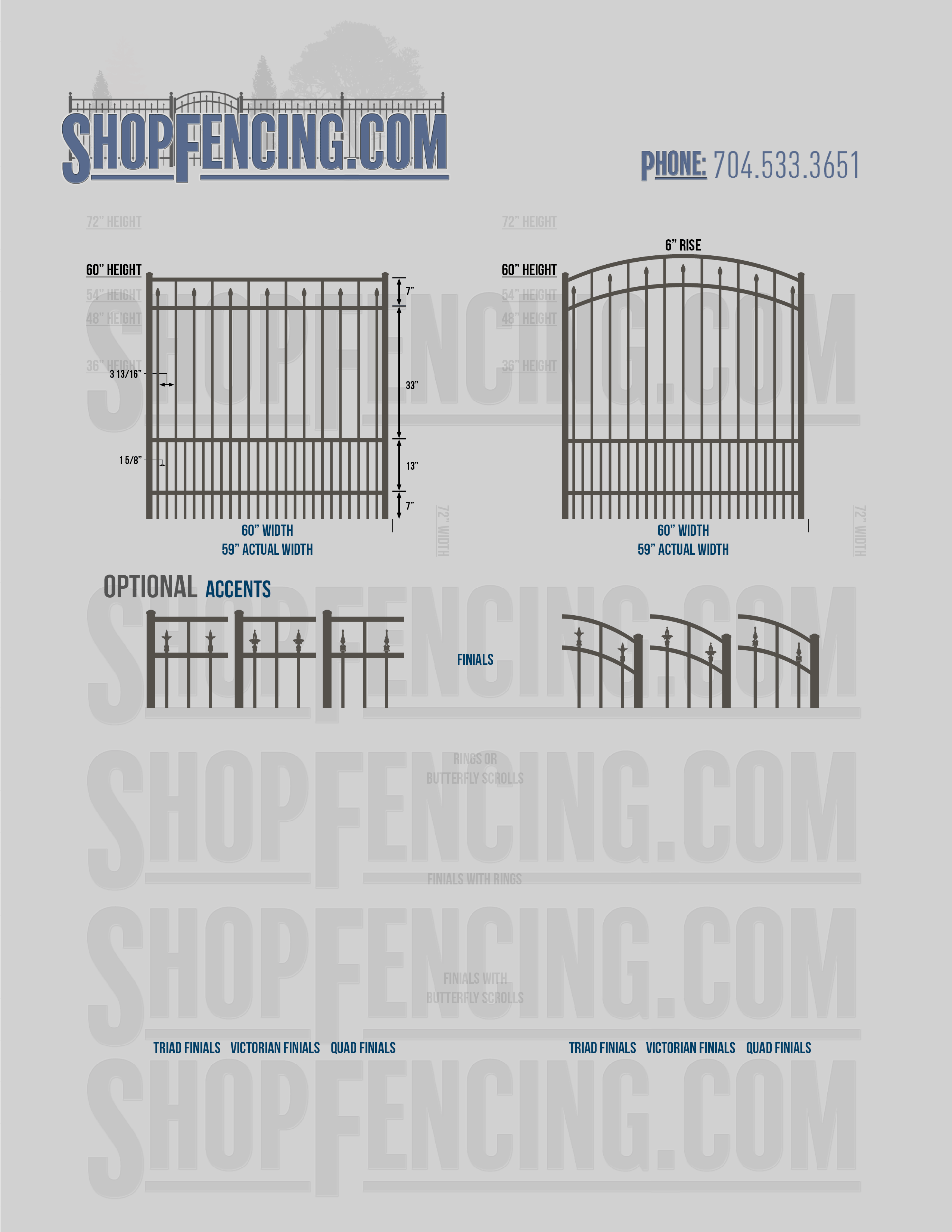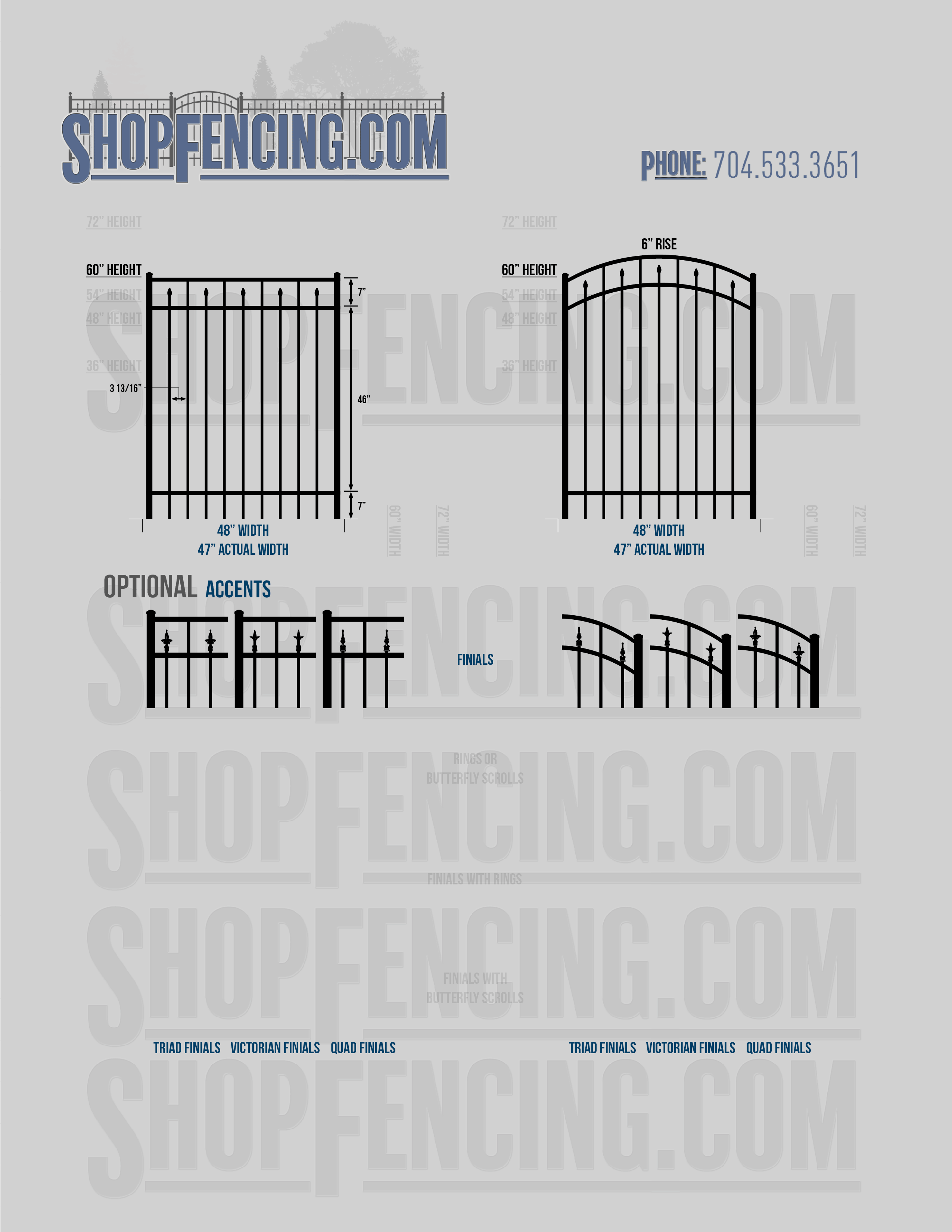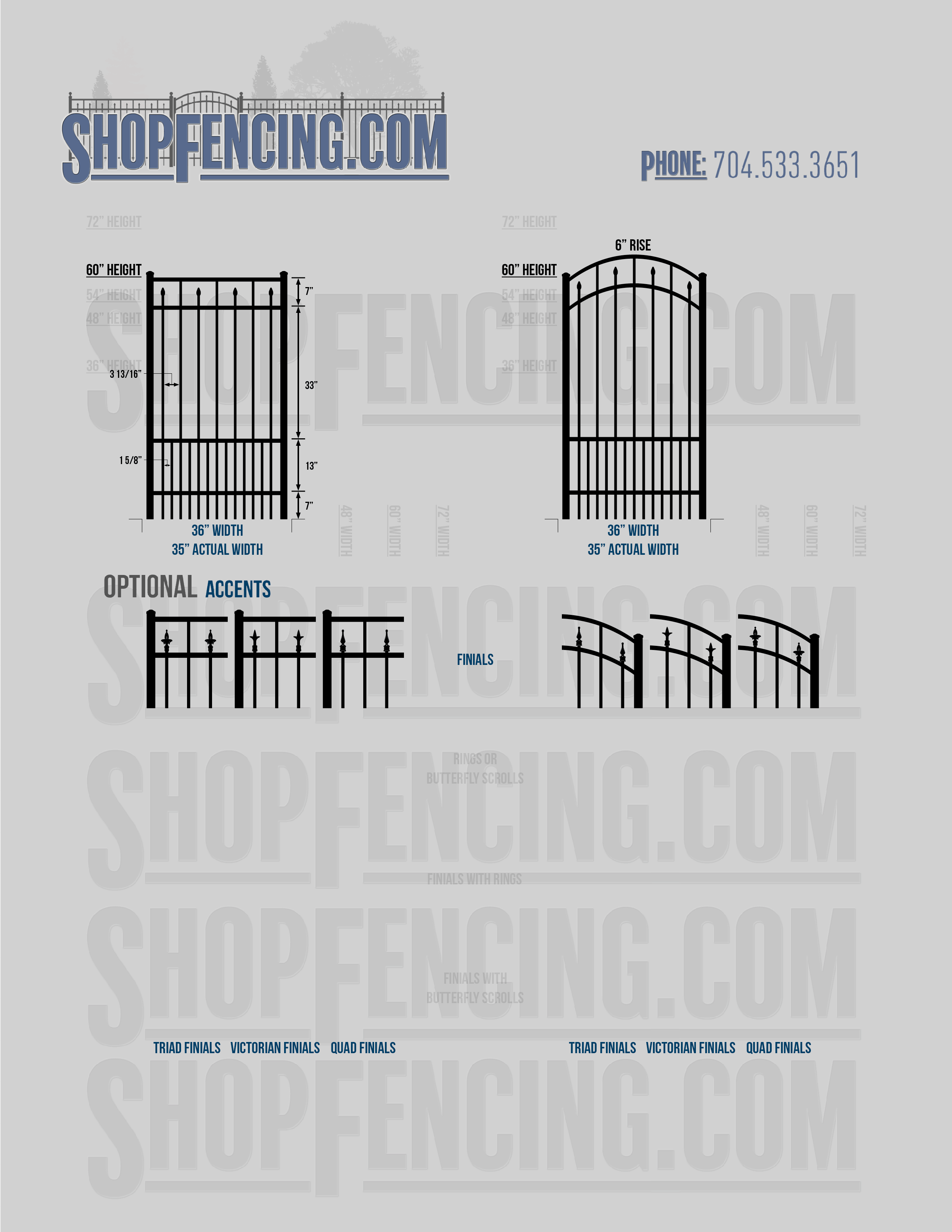 Accent Upgrades: When you add these options, gates will ship with the finials, rings or scrolls installed. PLEASE NOTE: Triad and Victorian finials cannot be installed on double picket fence sections and gates. Rings and scrolls cannot be installed on double picket fence sections and gates.