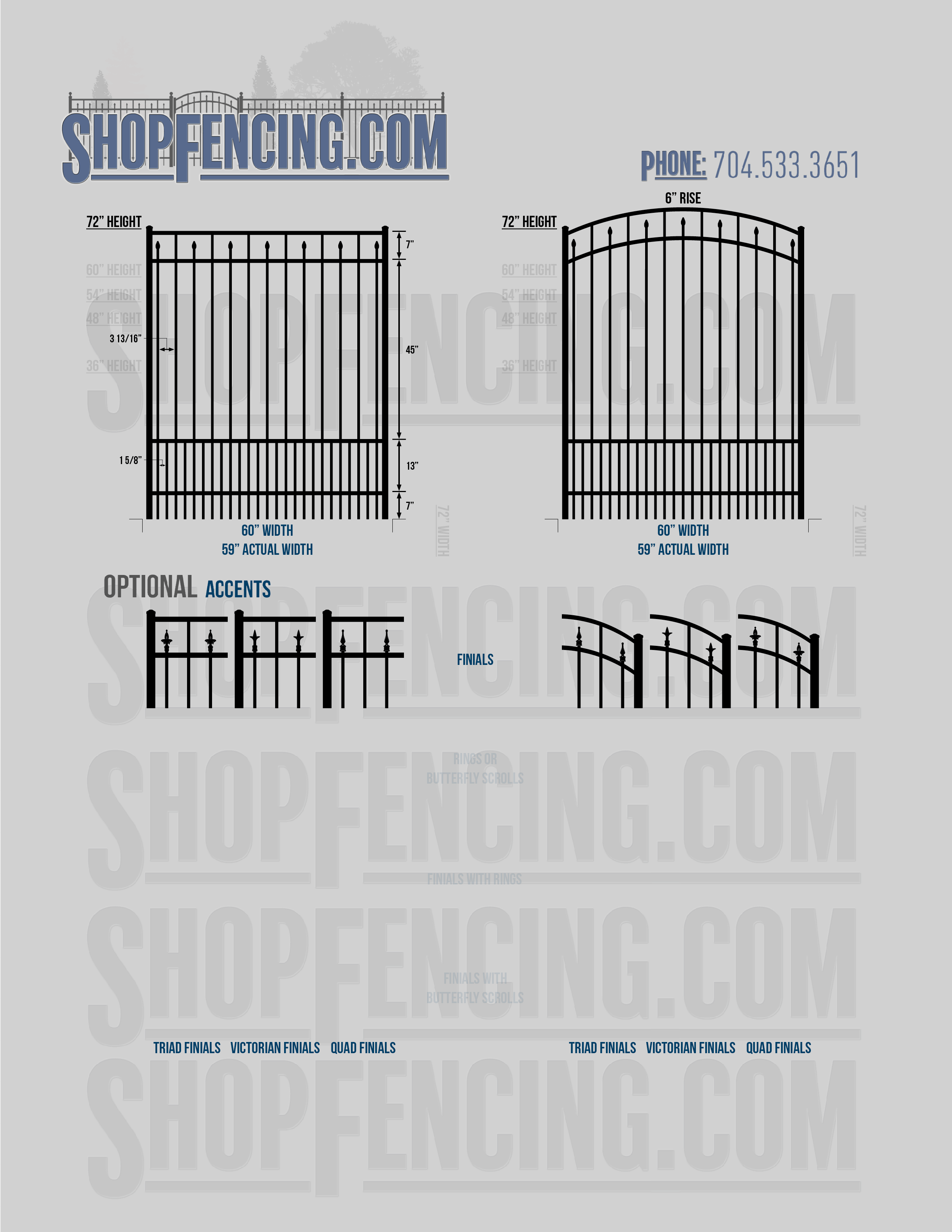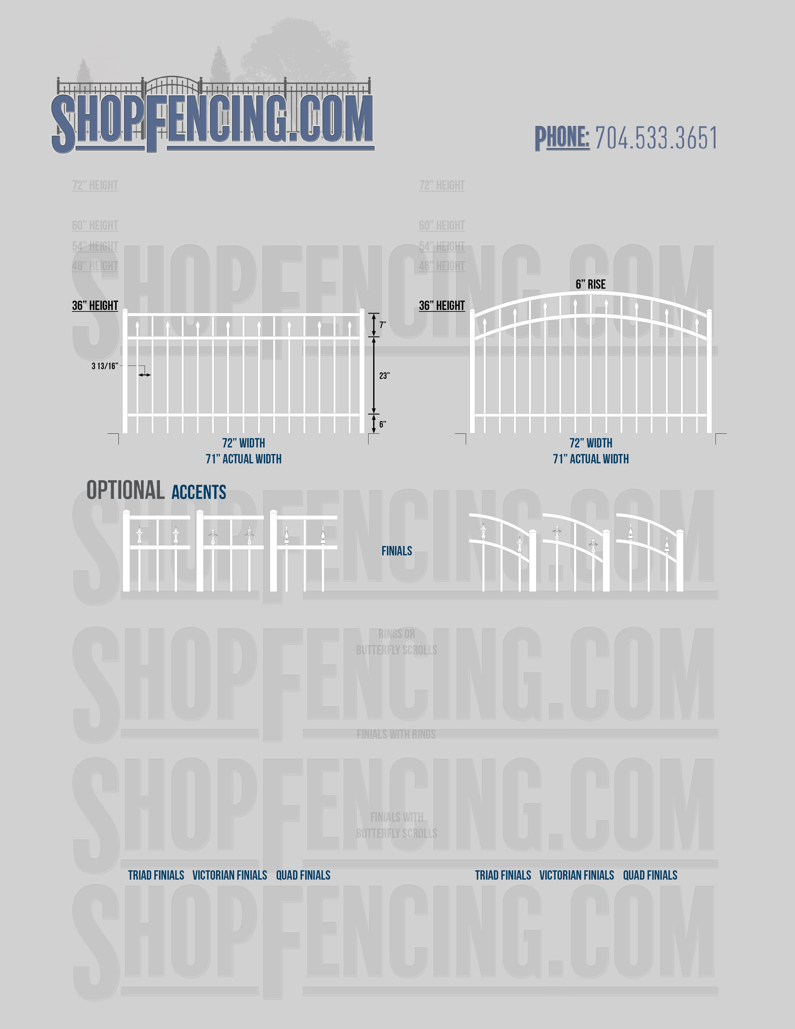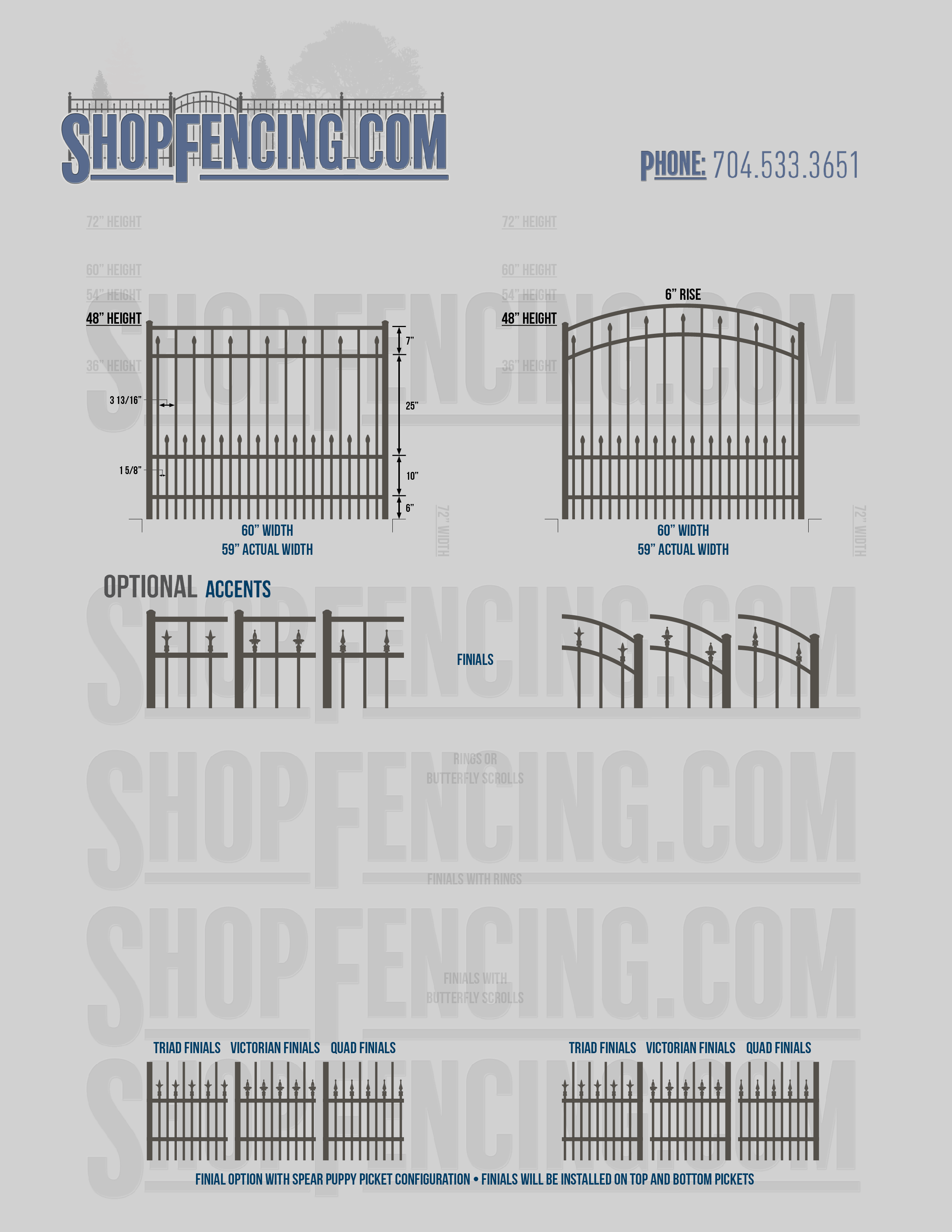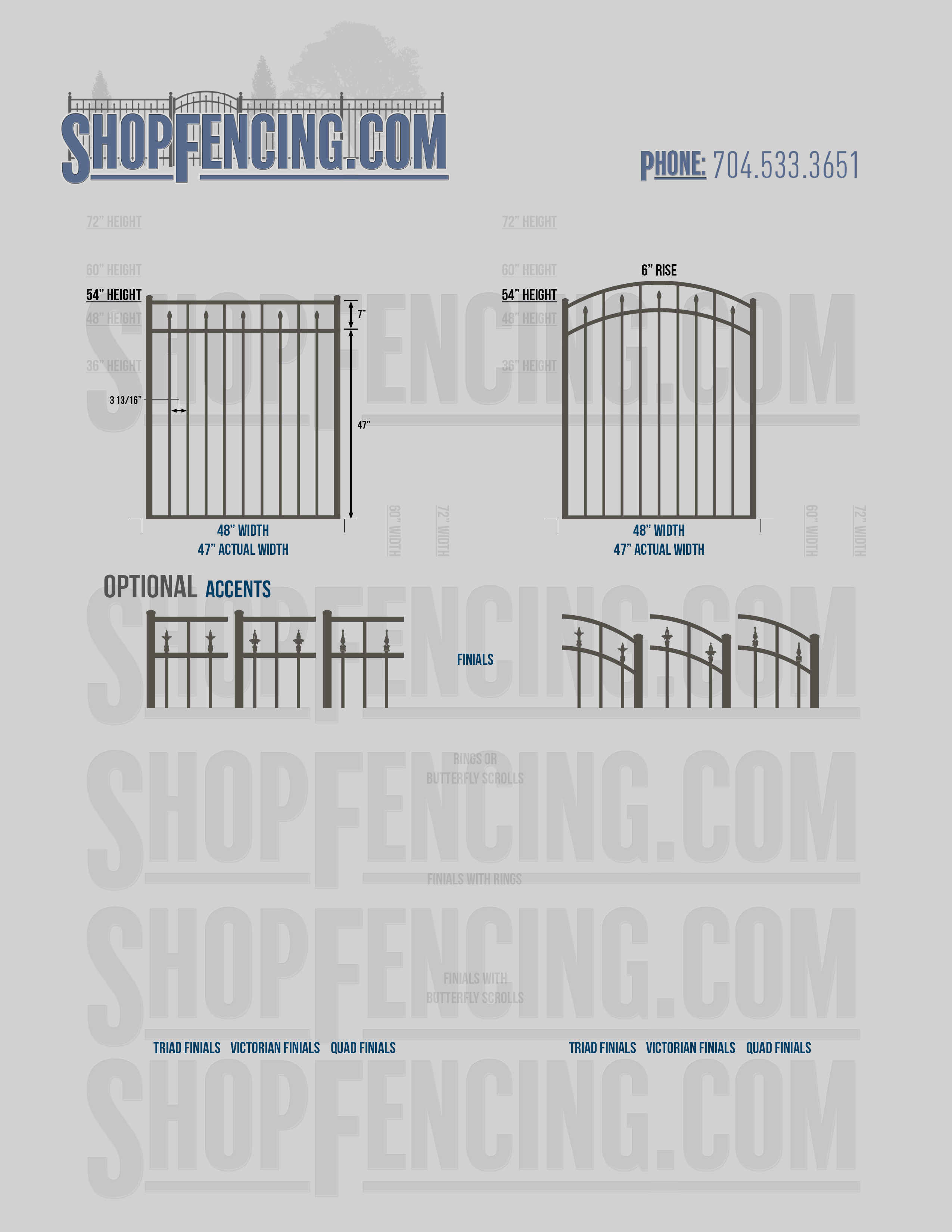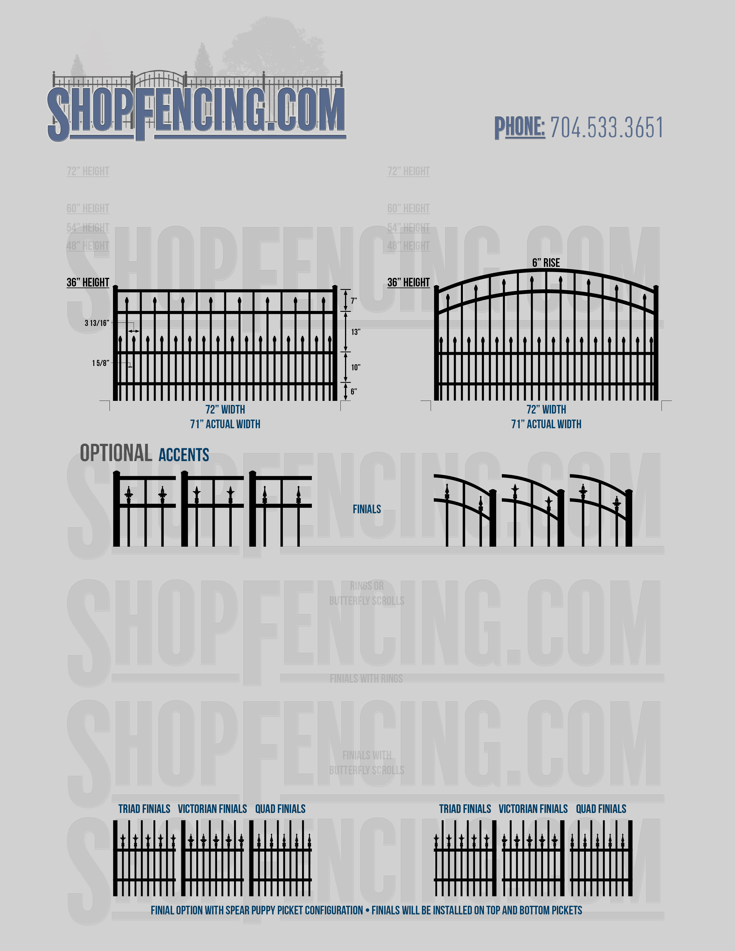 Accent Upgrades: When you add these options, gates will ship with the finials, rings or scrolls installed. PLEASE NOTE: Triad and Victorian finials cannot be installed on double picket fence sections and gates. Rings and scrolls cannot be installed on double picket fence sections and gates.
