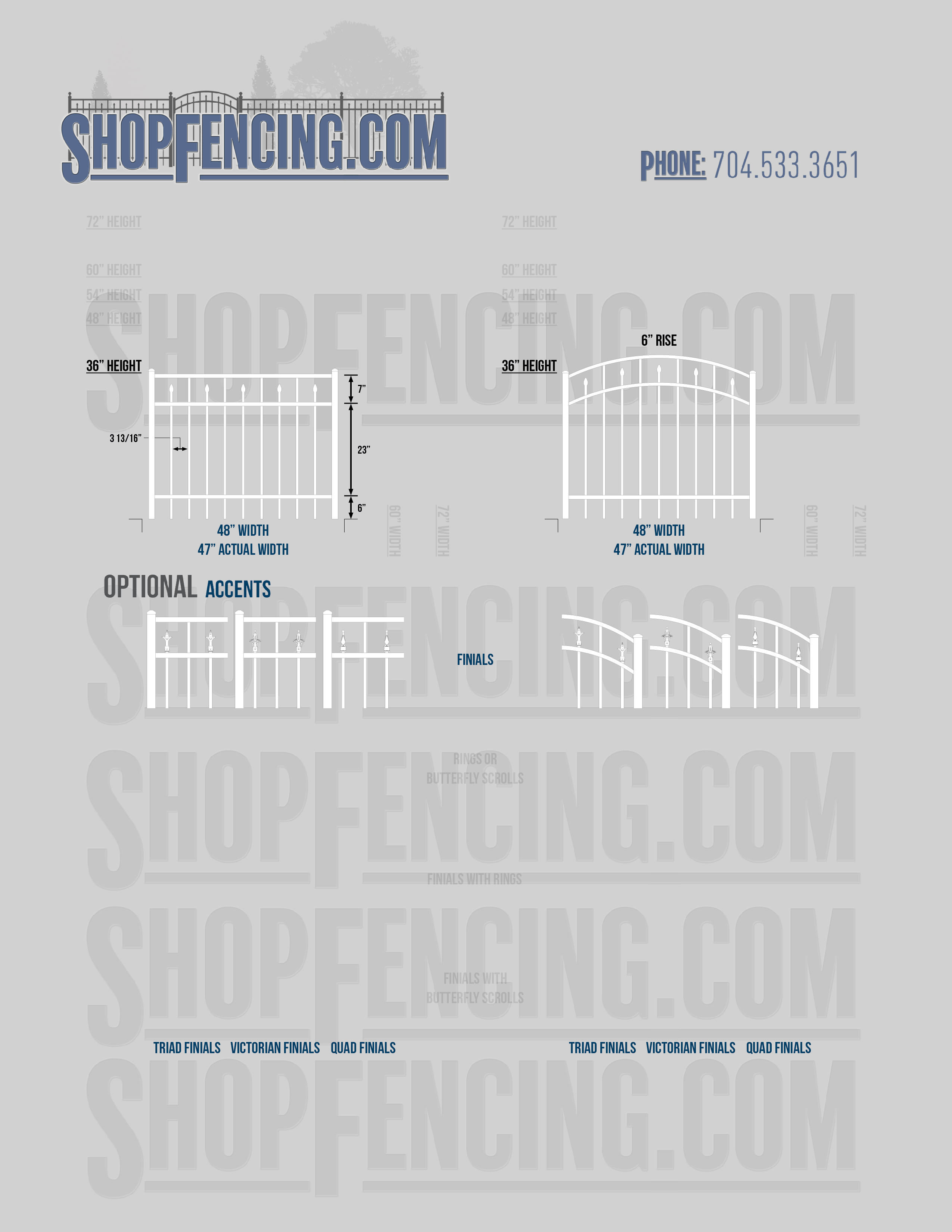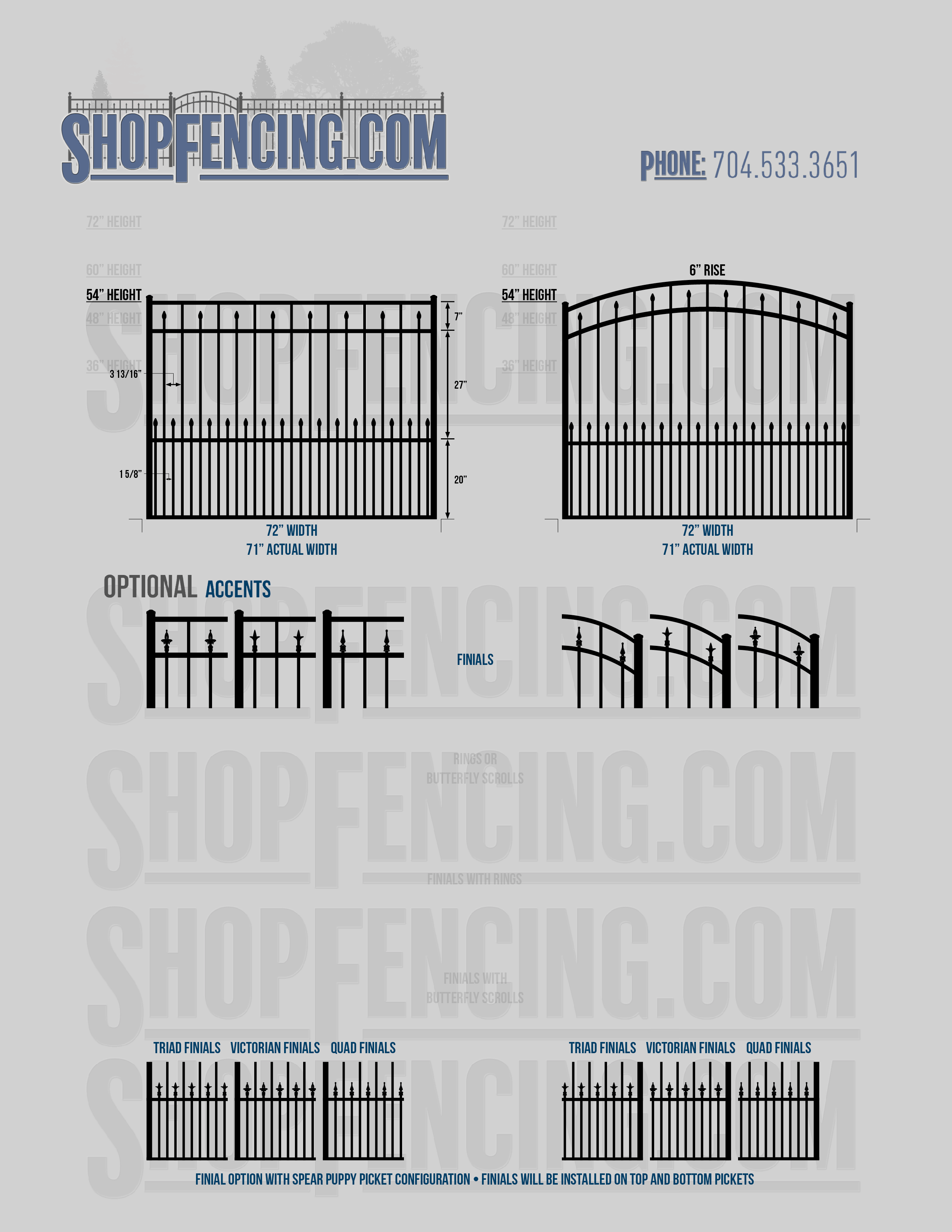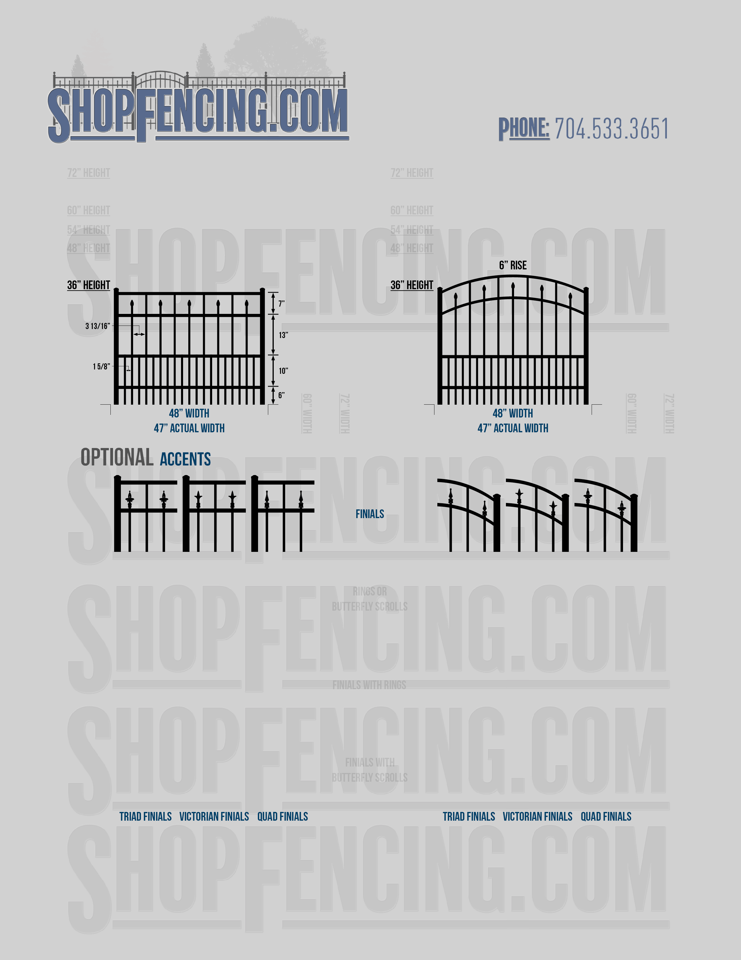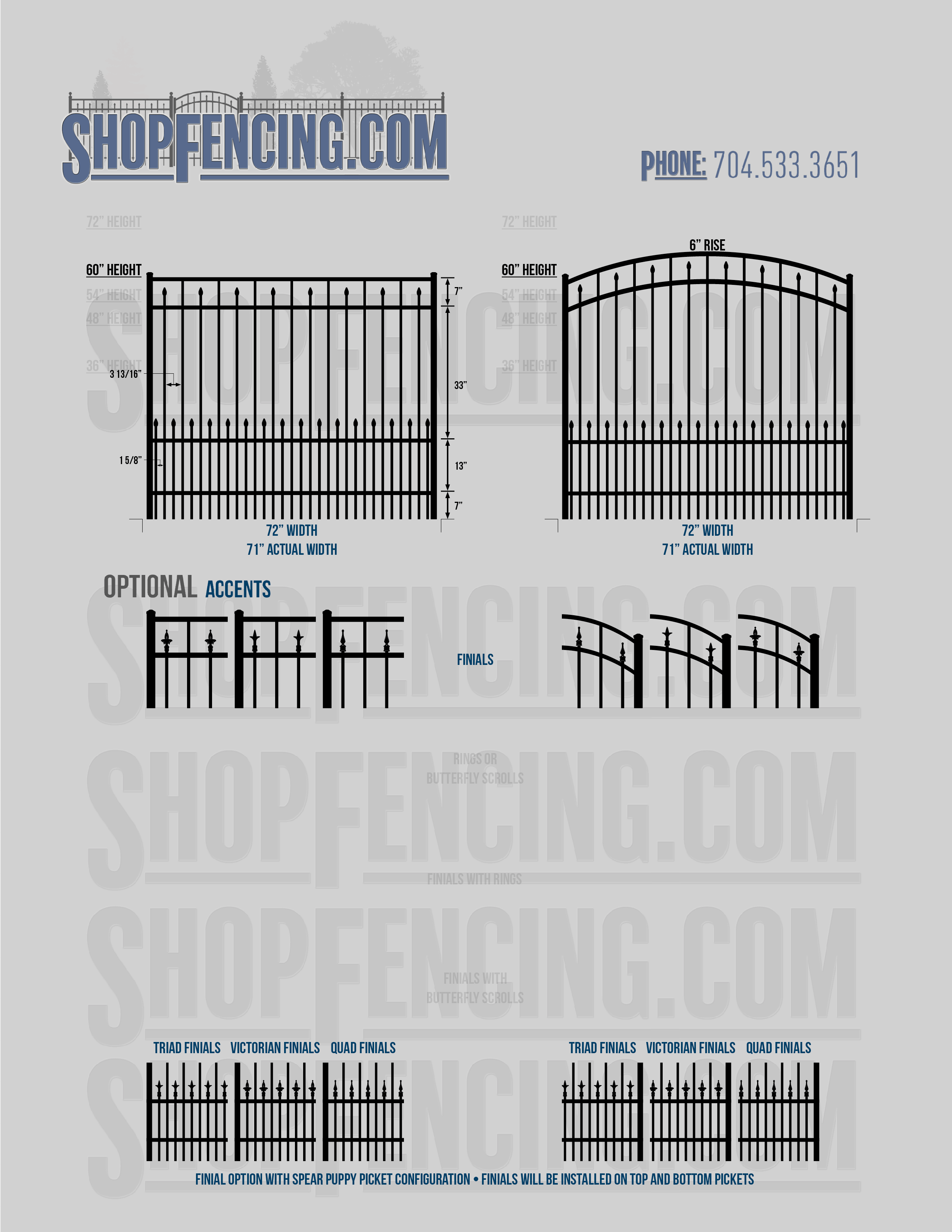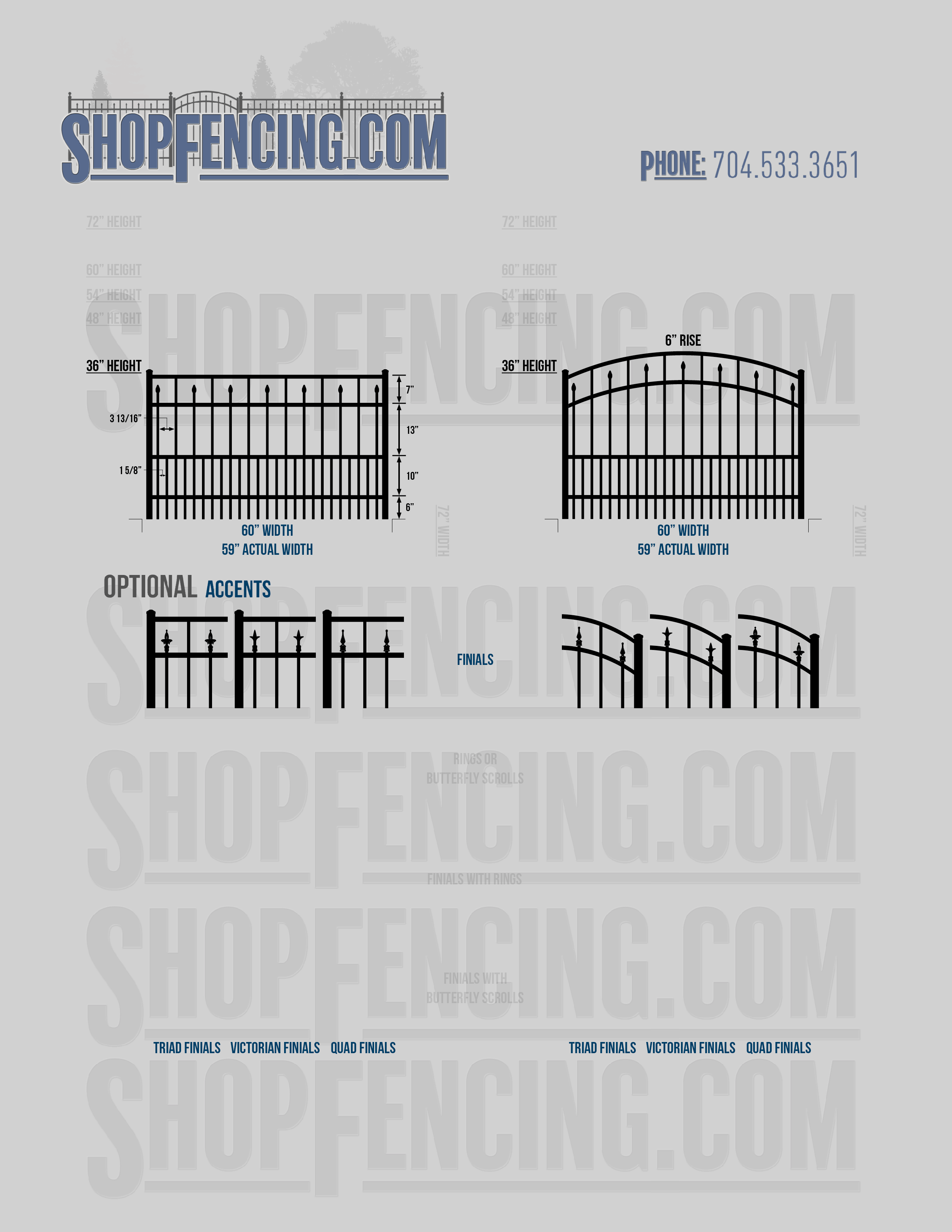 Accent Upgrades: When you add these options, gates will ship with the finials, rings or scrolls installed. PLEASE NOTE: Triad and Victorian finials cannot be installed on double picket fence sections and gates. Rings and scrolls cannot be installed on double picket fence sections and gates.