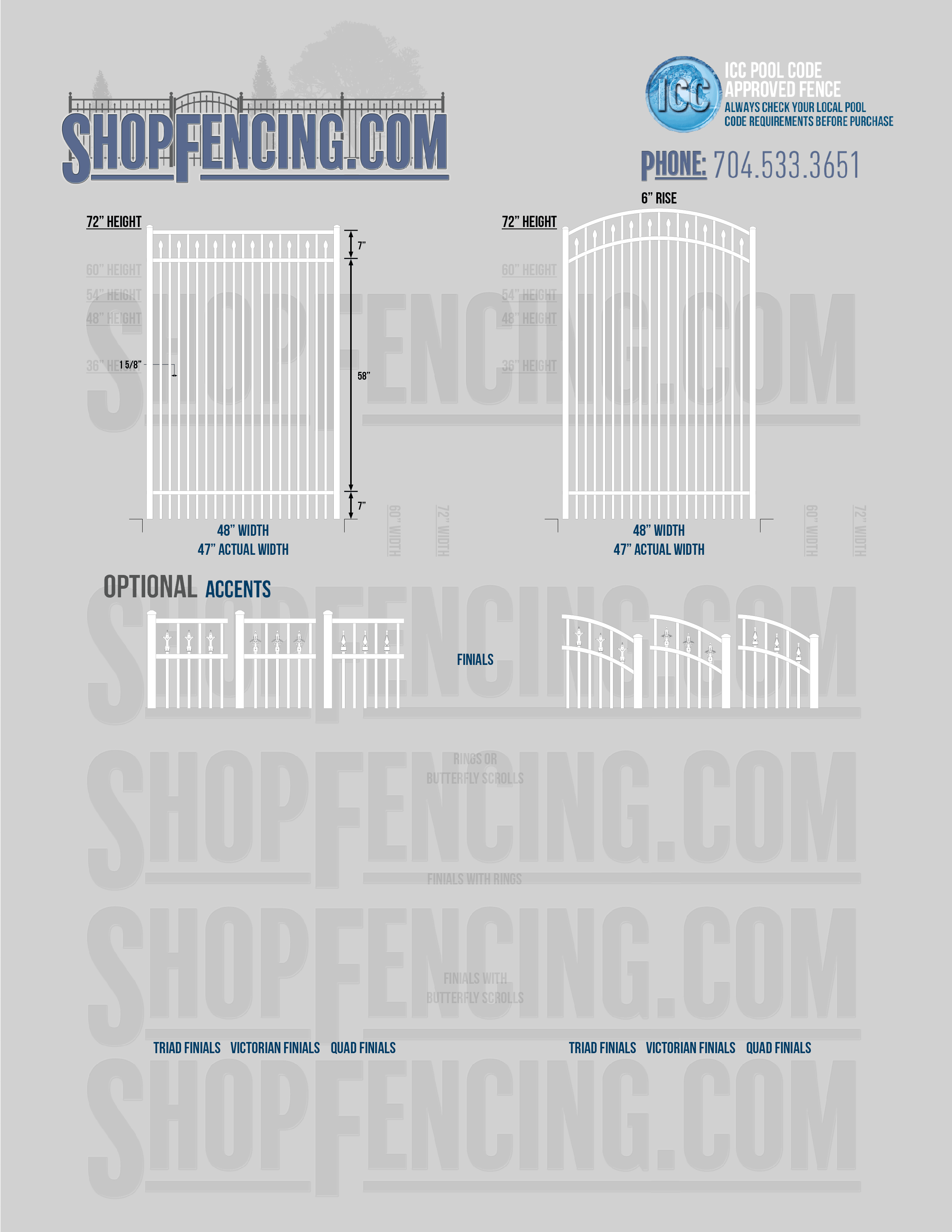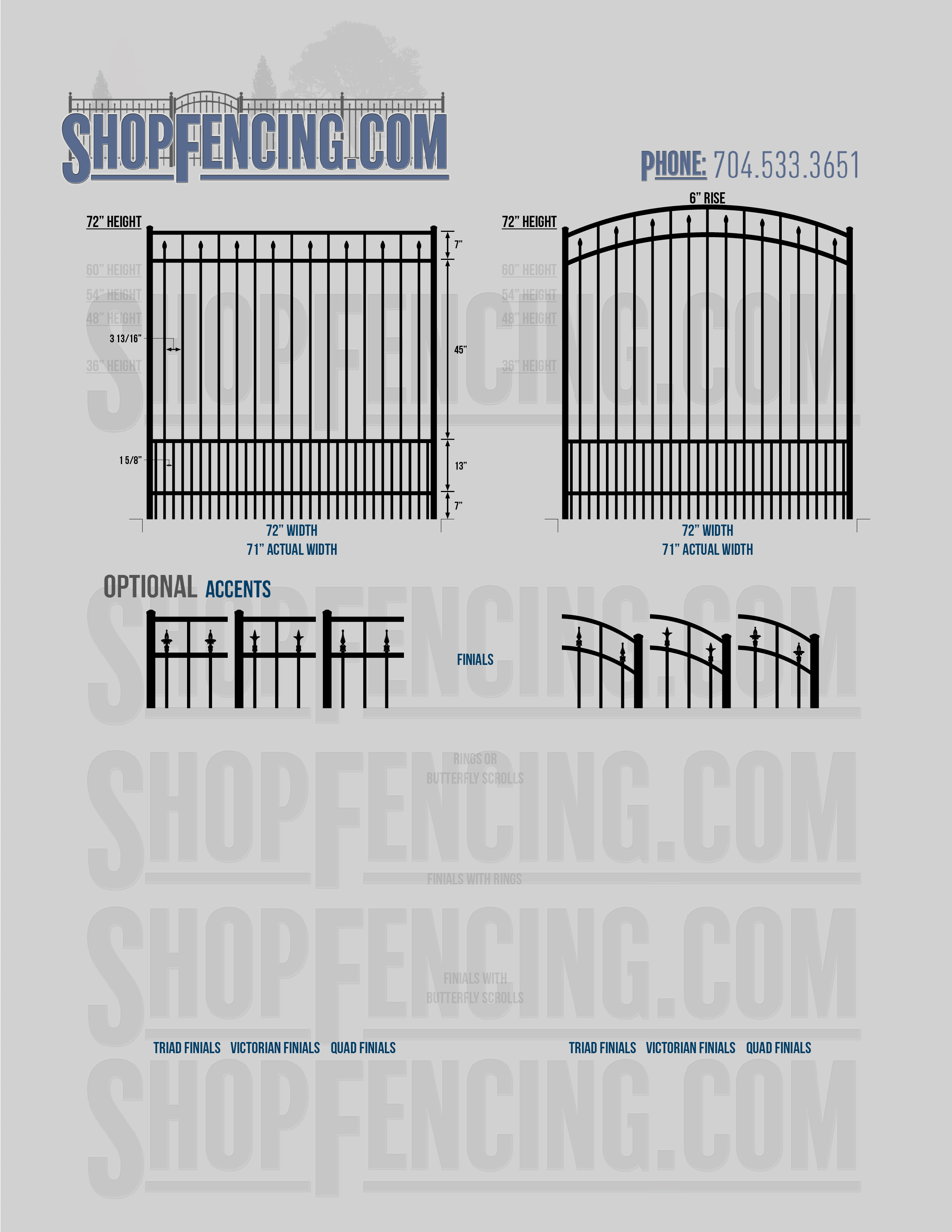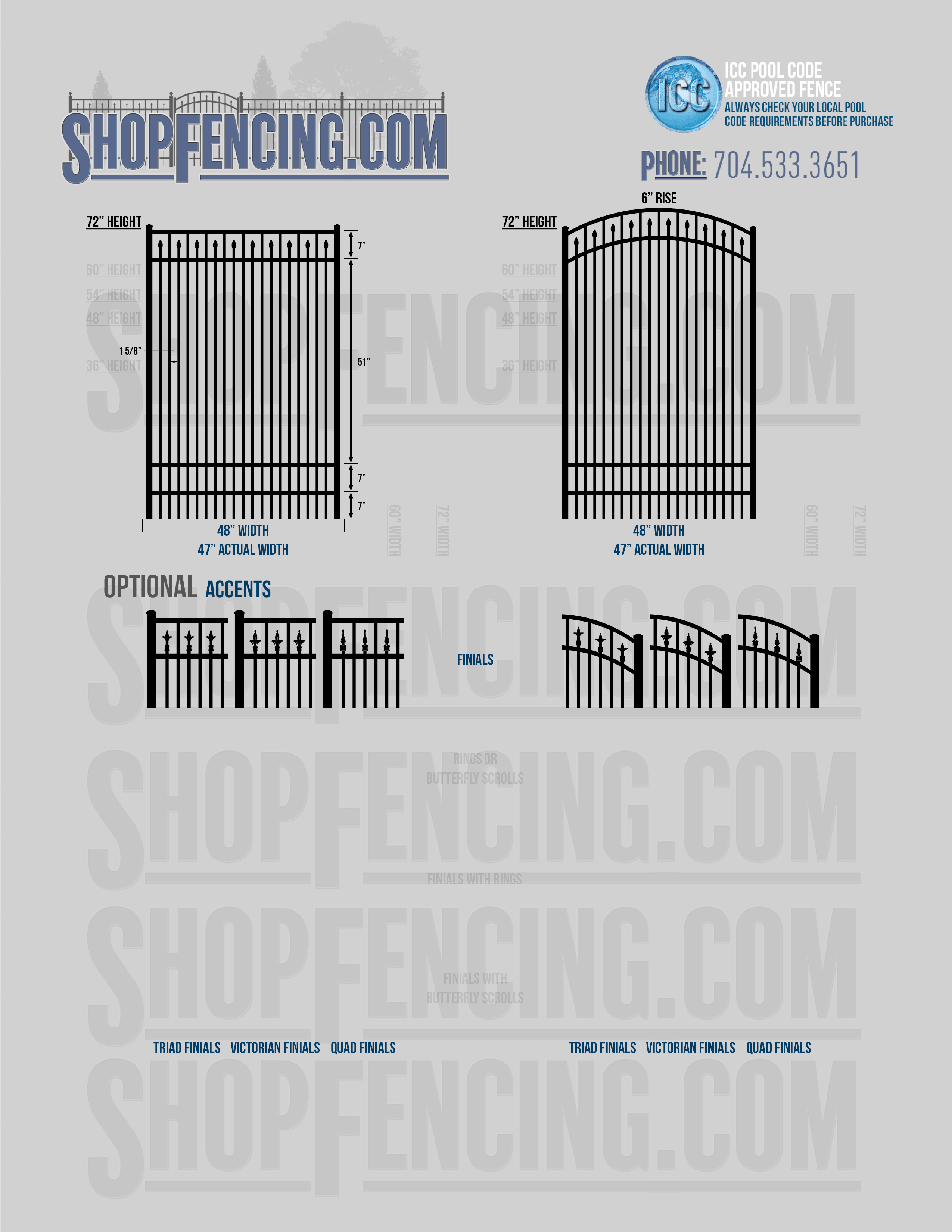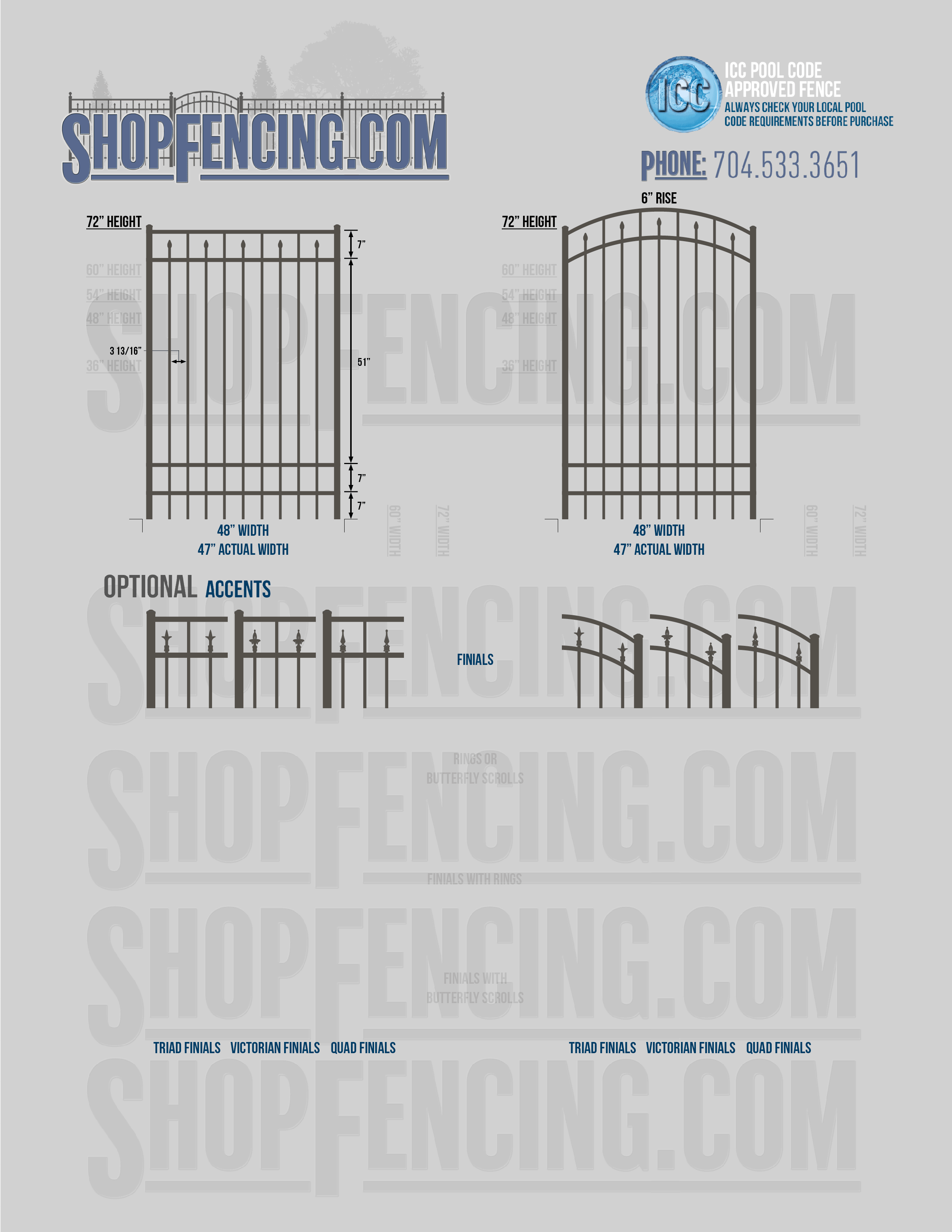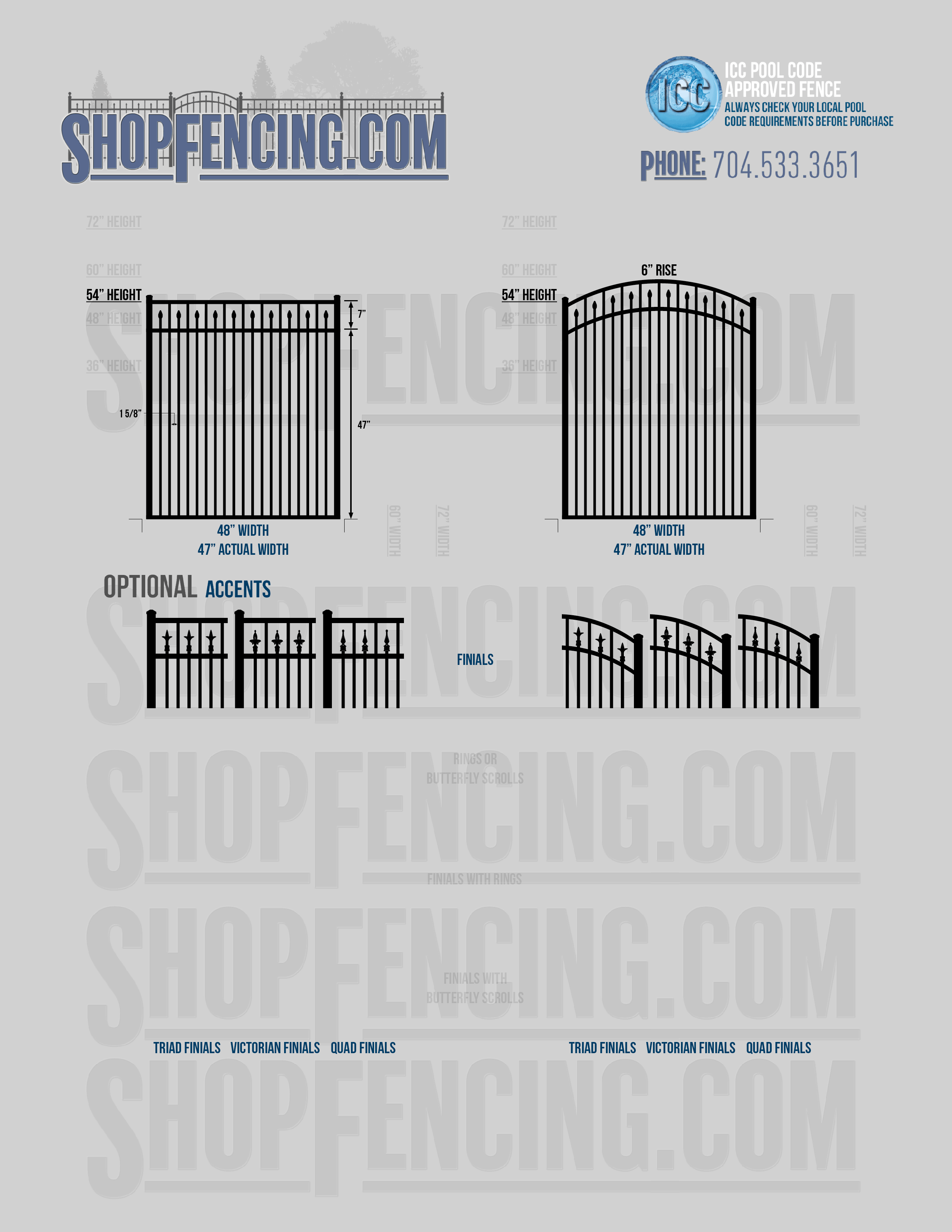 Accent Upgrades: When you add these options, gates will ship with the finials, rings or scrolls installed. PLEASE NOTE: Triad and Victorian finials cannot be installed on double picket fence sections and gates. Rings and scrolls cannot be installed on double picket fence sections and gates.