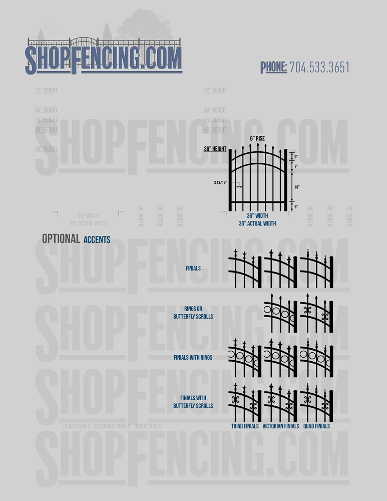 Accent Upgrades: When you add these options, gates will ship with the finials, rings or scrolls installed. PLEASE NOTE: Triad and Victorian finials cannot be installed on double picket fence sections and gates. Rings and scrolls cannot be installed on double picket fence sections and gates.