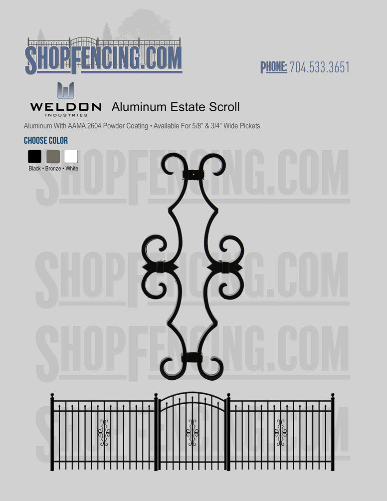 Weldon Industries Aluminum Estate ScrollMaterial: Aluminum & AAMA 2604 Powder CoatedSizes: 5/8" & 3/4" PicketsColors: Black, Bronze or White
