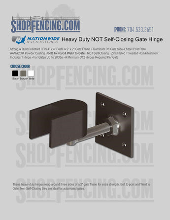 These heavy duty hinges wrap around three sides of a 2" gate frame for extra strength. Bolt to post and Weld to Gate. Non Self-Closing they are ideal for automated gates.
