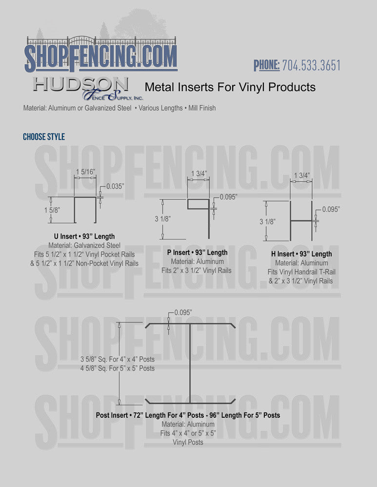Styles: 93" U Insert - 5 1/2" x 1 1/2" Rails • 93" P Insert - 3 1/2” x 2” Rails • 93" H Insert - Handrail "T" Rails & 3 1/2" x 2" Rails • 72" & 96" Post Insert - 4" or 5" Posts