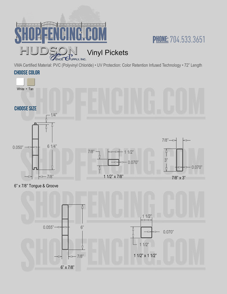 Vinyl Pickets Material: VMA Certified PVC Colors: White or Tan Sizes: 6" x 7/8" T&G • 1 1/2” x 7/8” • 7/8" x 3" • 6" x 7/8" • 1 1/2" Sq. Length: 72" (Can be easily cut to length) UV Protection: Color Retention Infused Technology