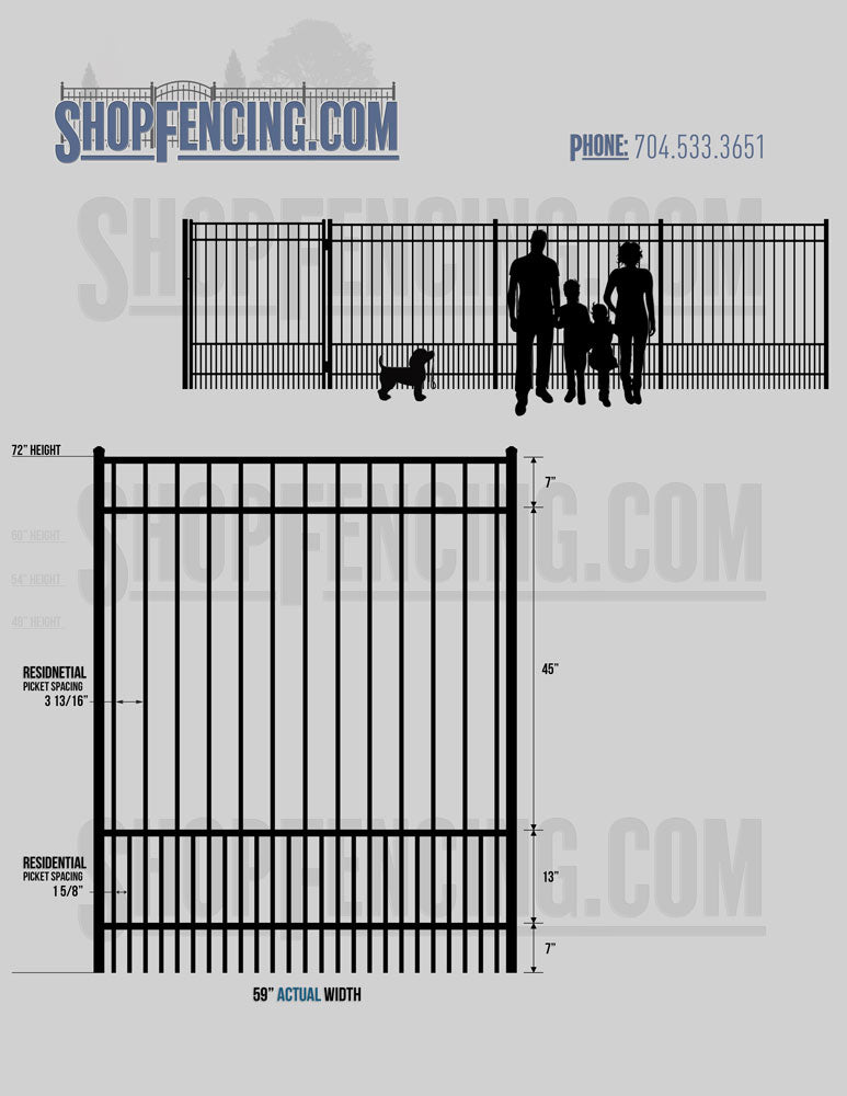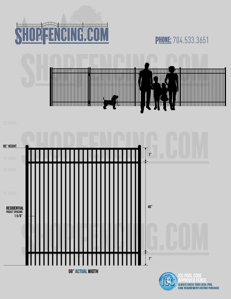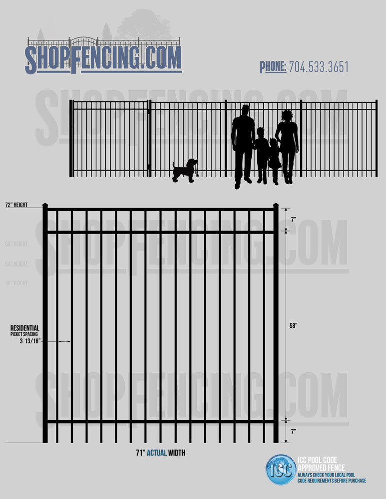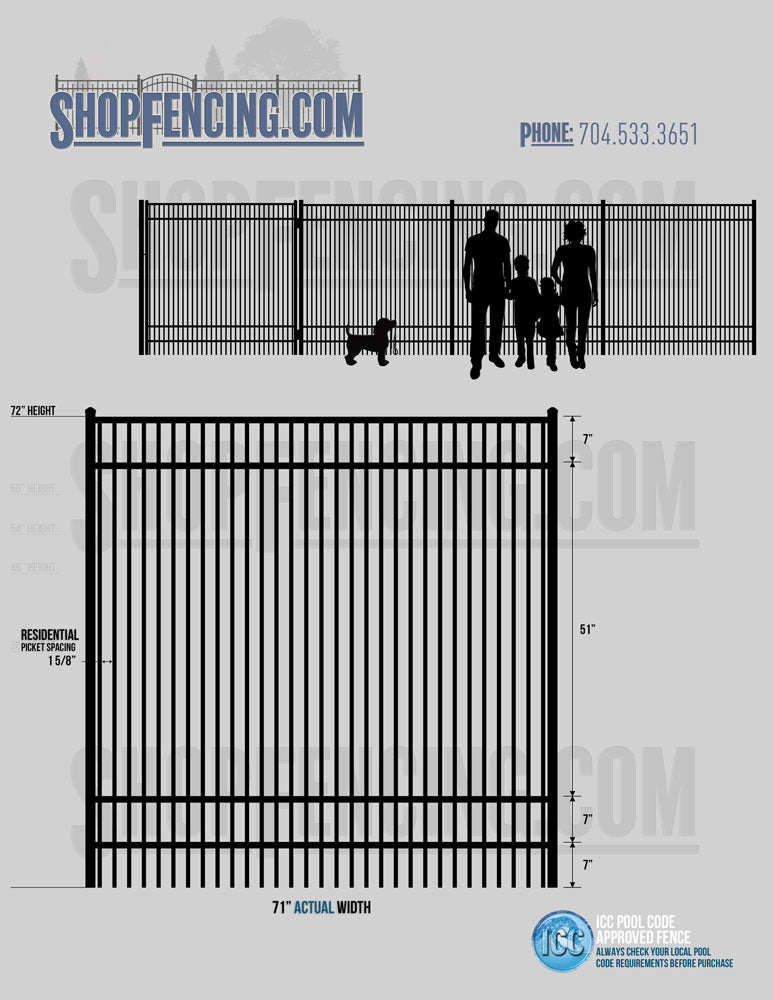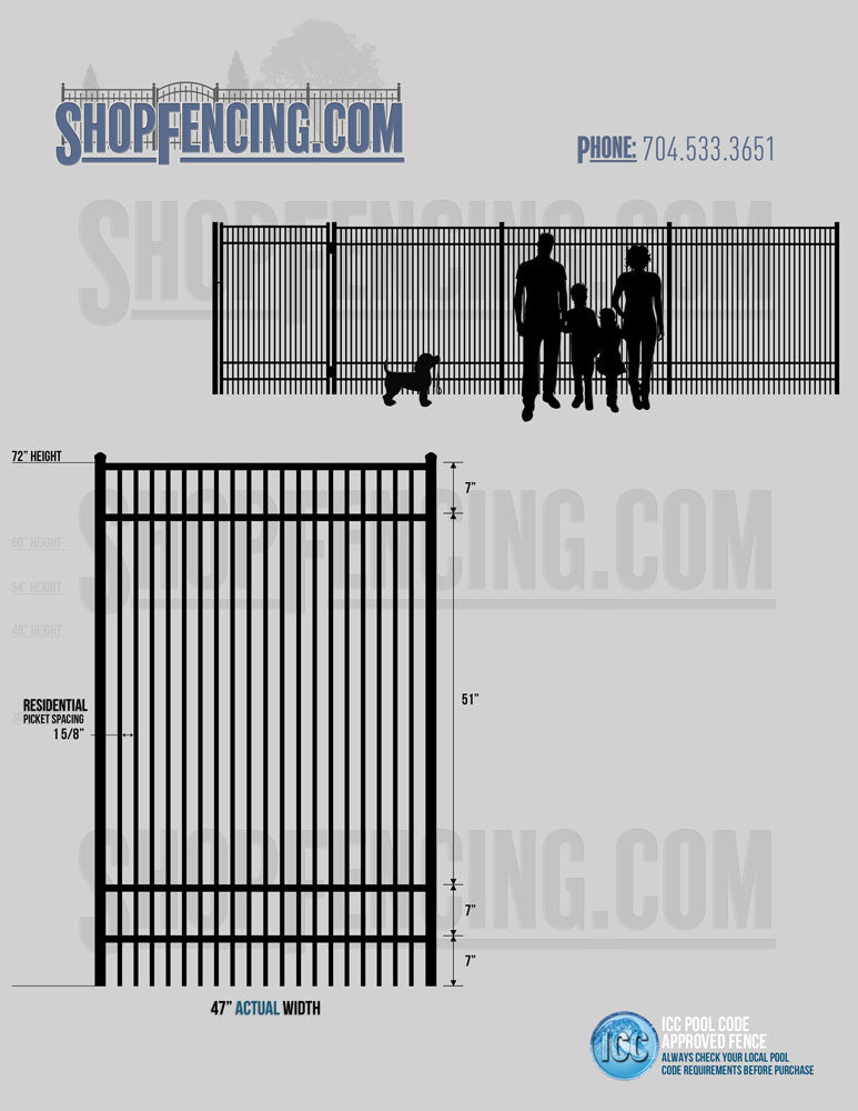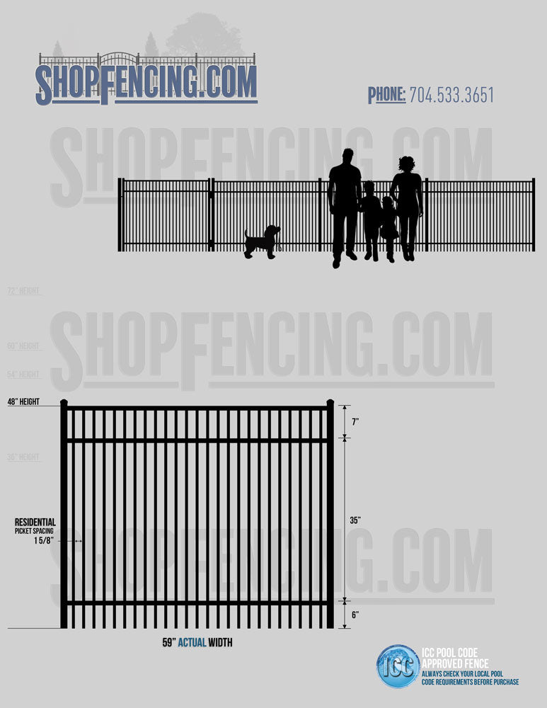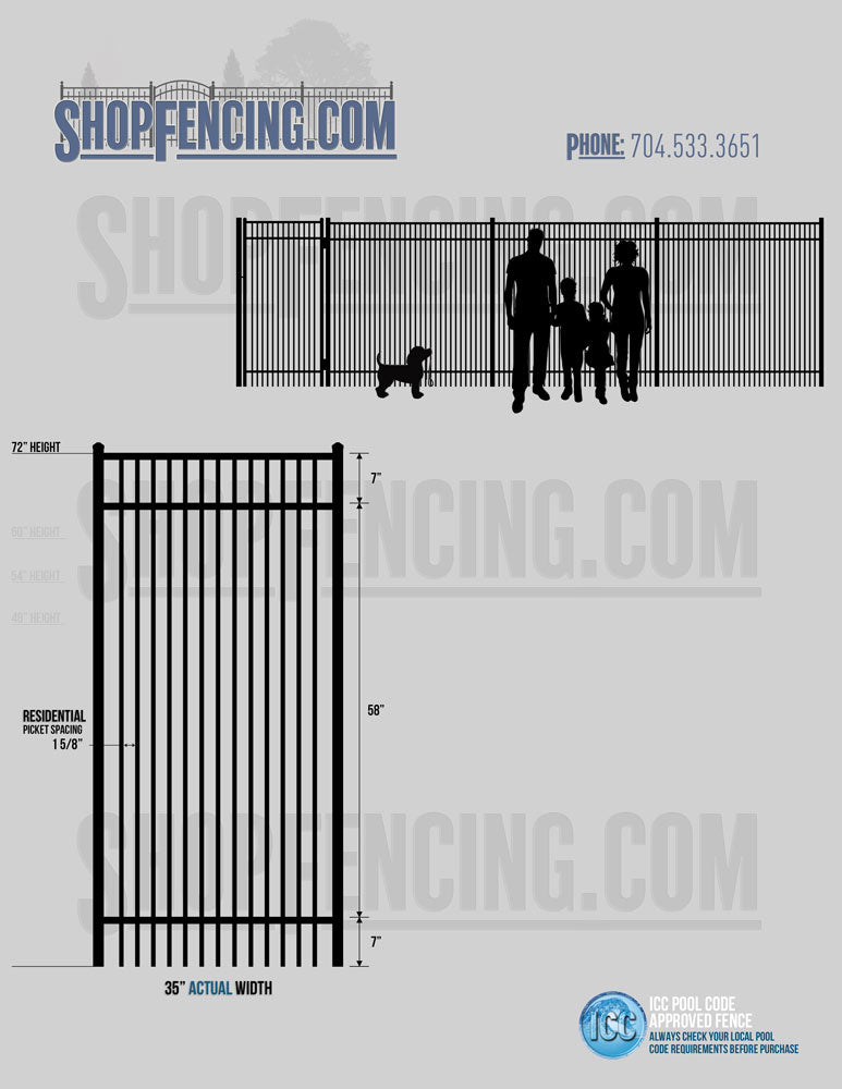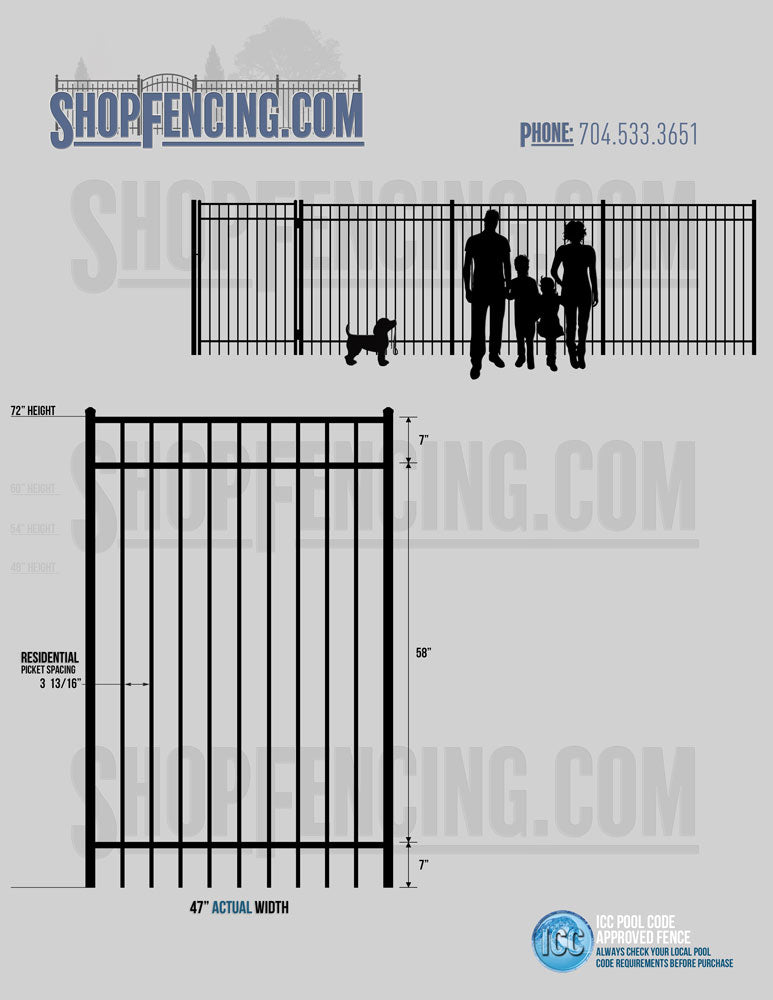 Standard Picket Design: 54" Flush Bottom, 60" and 72" Heights. Double Picket Design: 48", 54", 60" and 72" Heights. Check your local pool codes before purchasing.