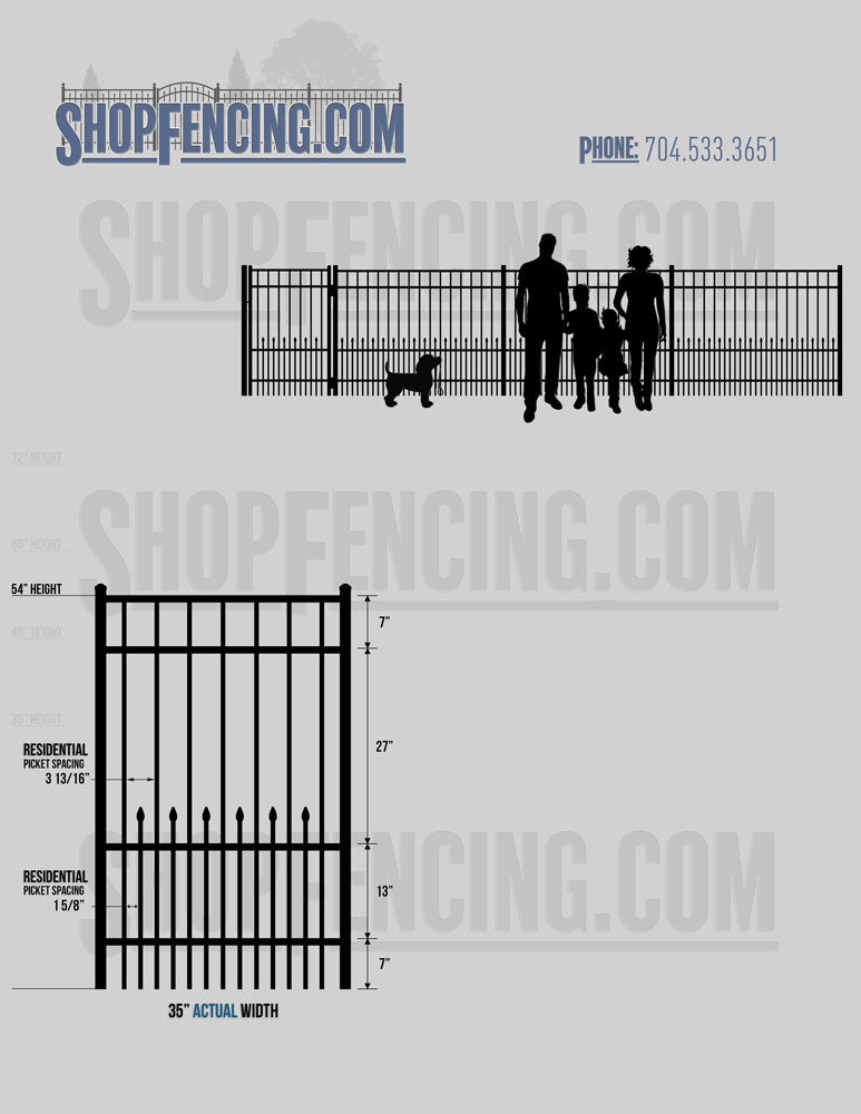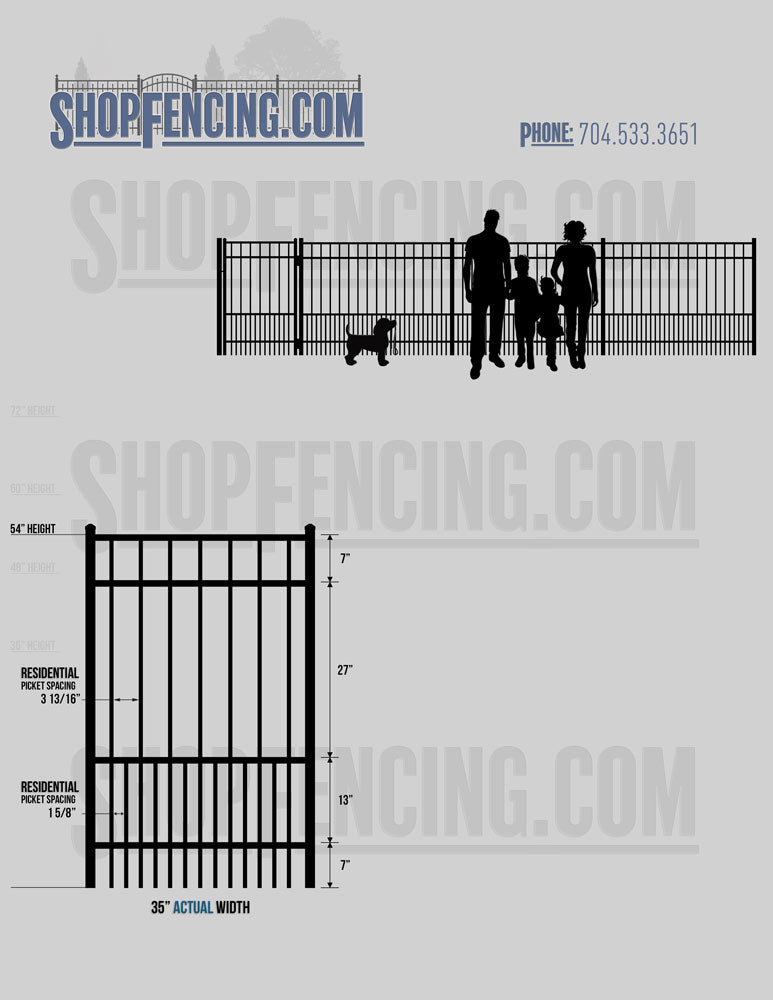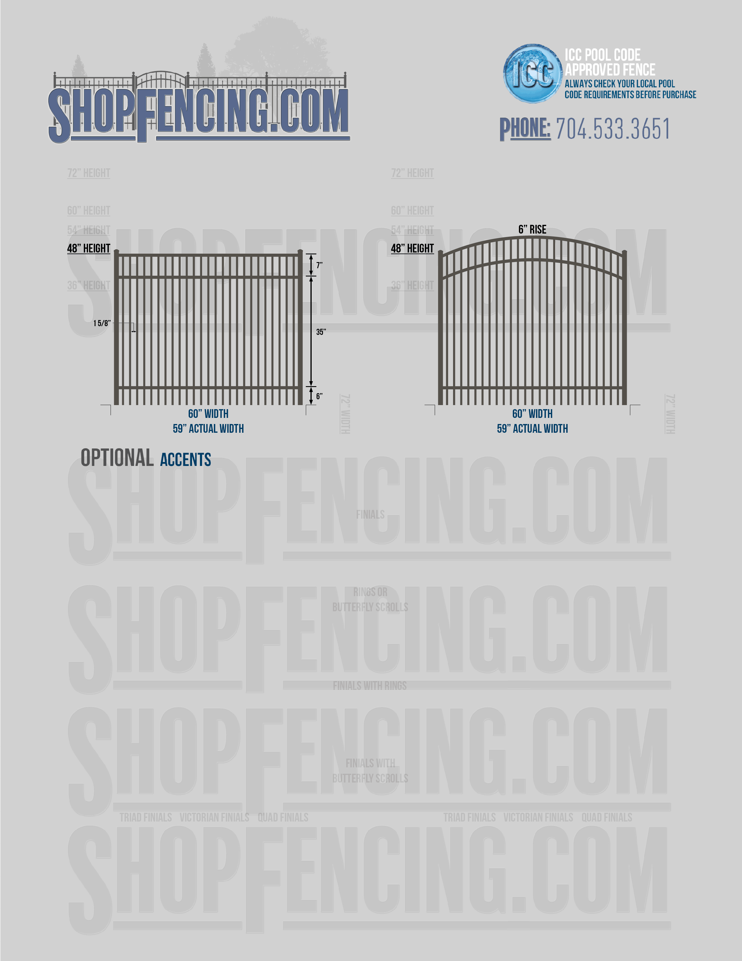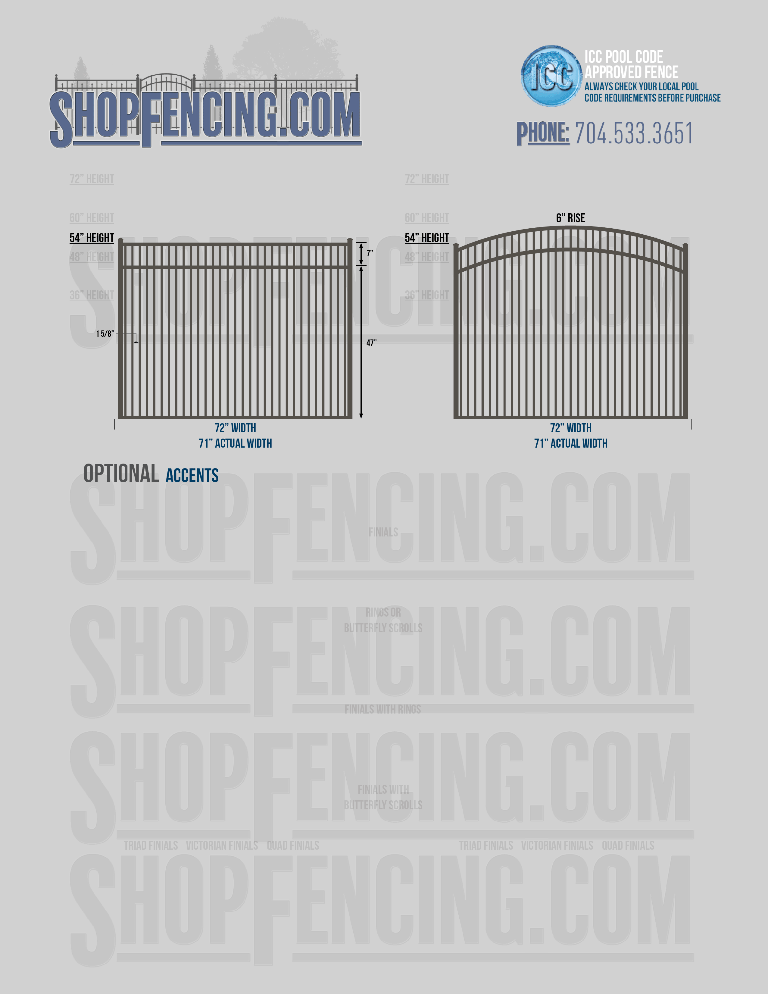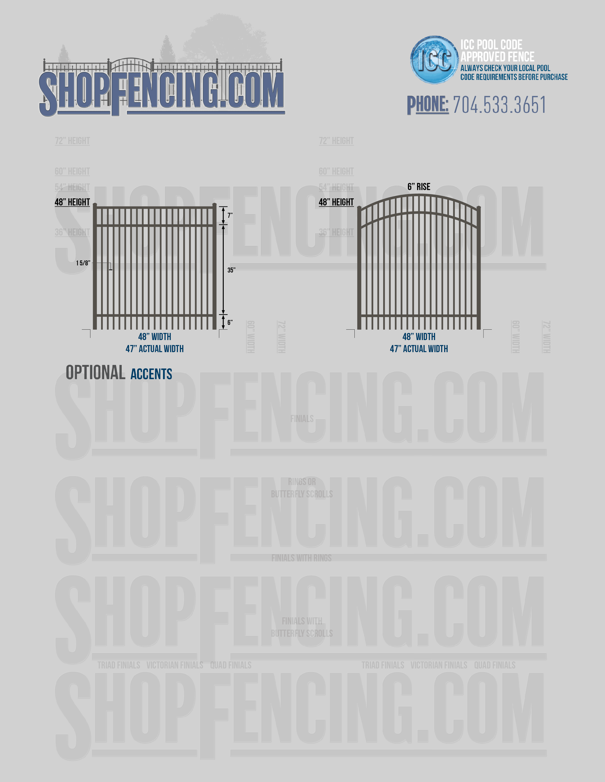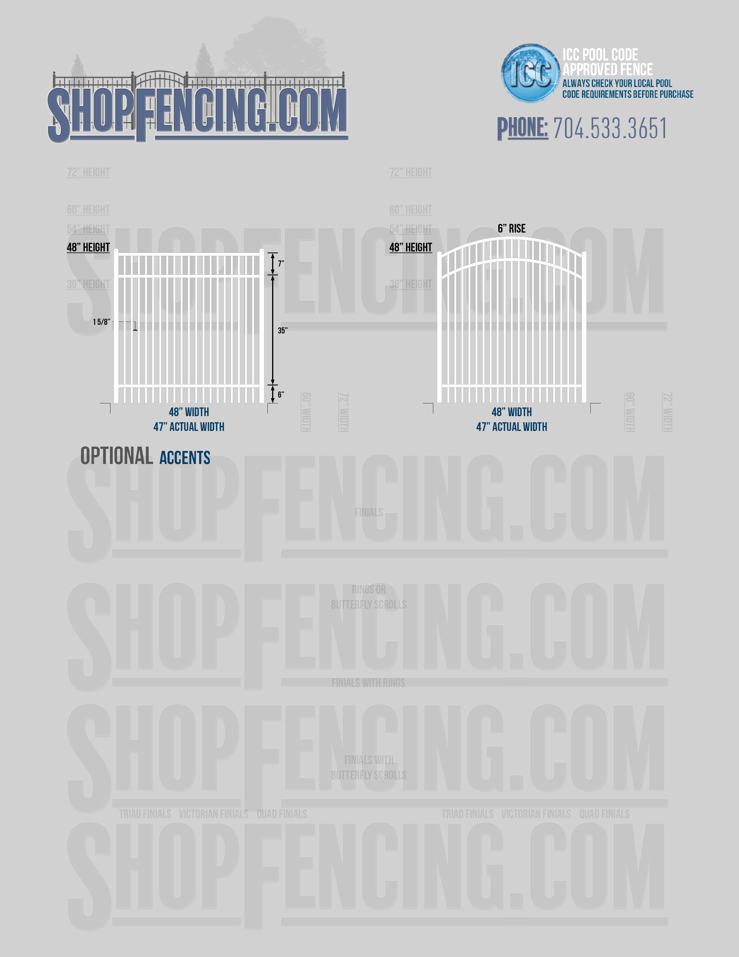 Standard Picket Design: 54" Flush Bottom, 60" and 72" Heights. Double Picket Design: 48", 54", 60" and 72" Heights. Check your local pool codes before purchasing.
