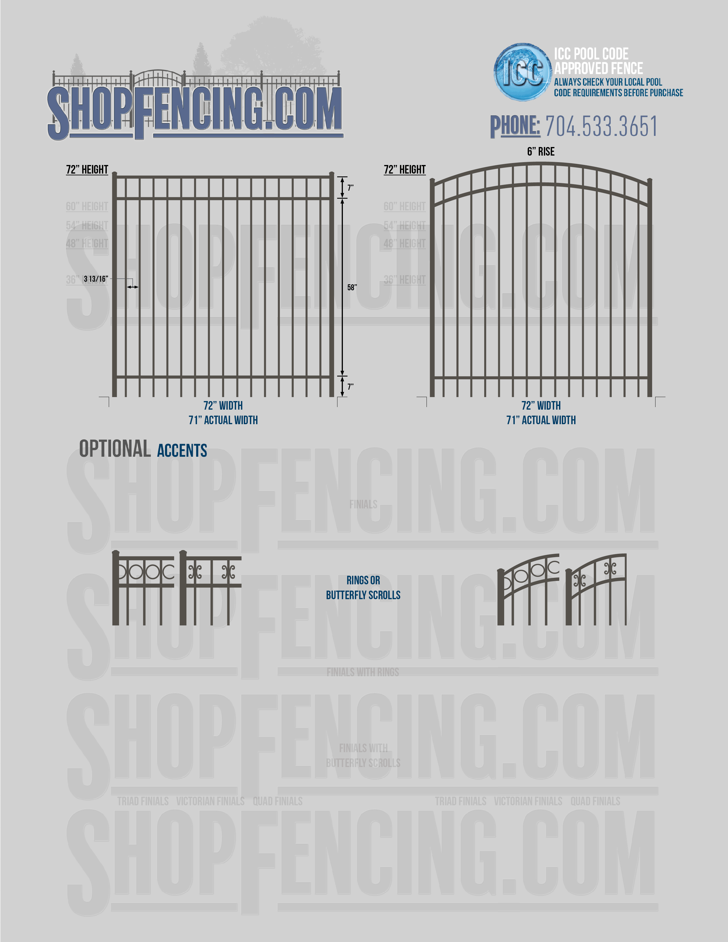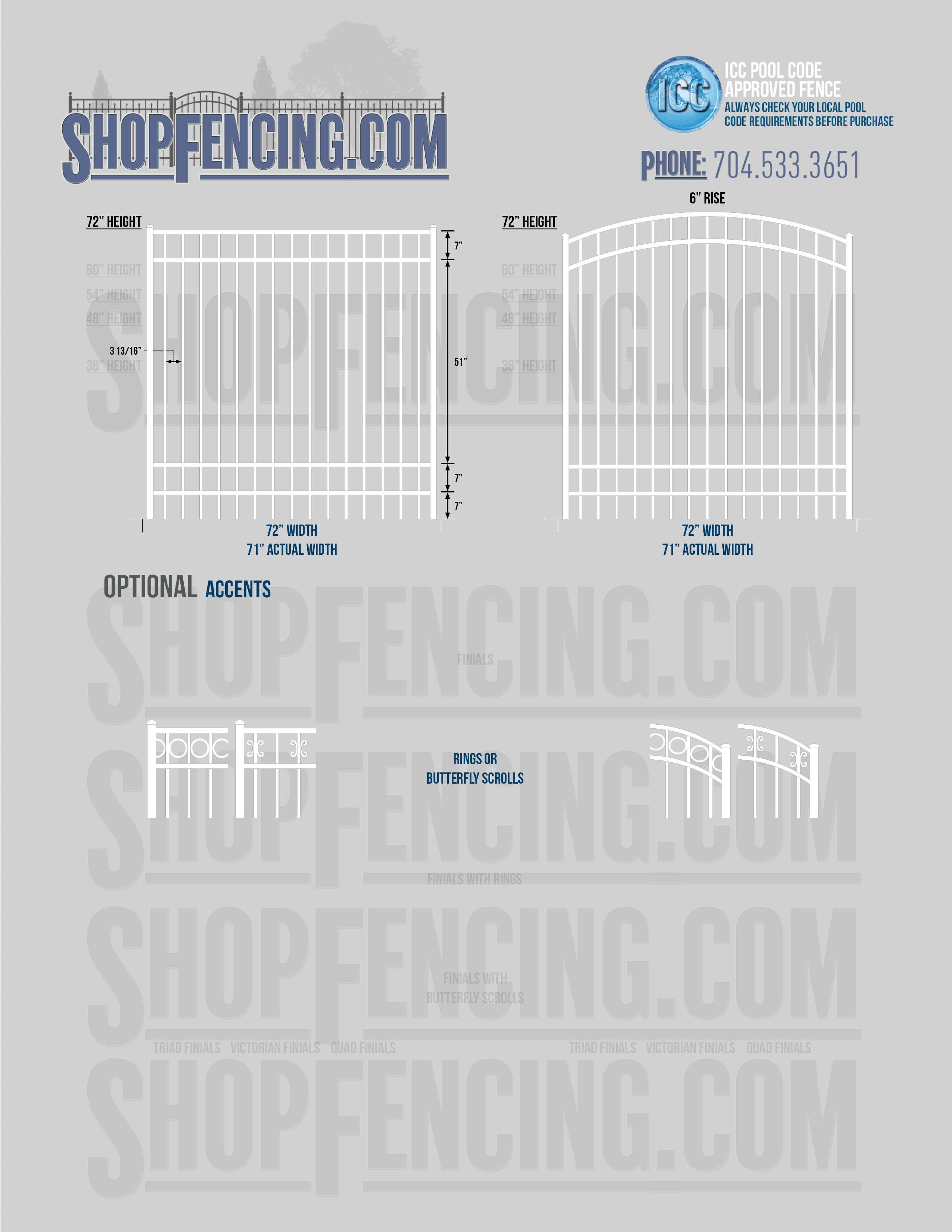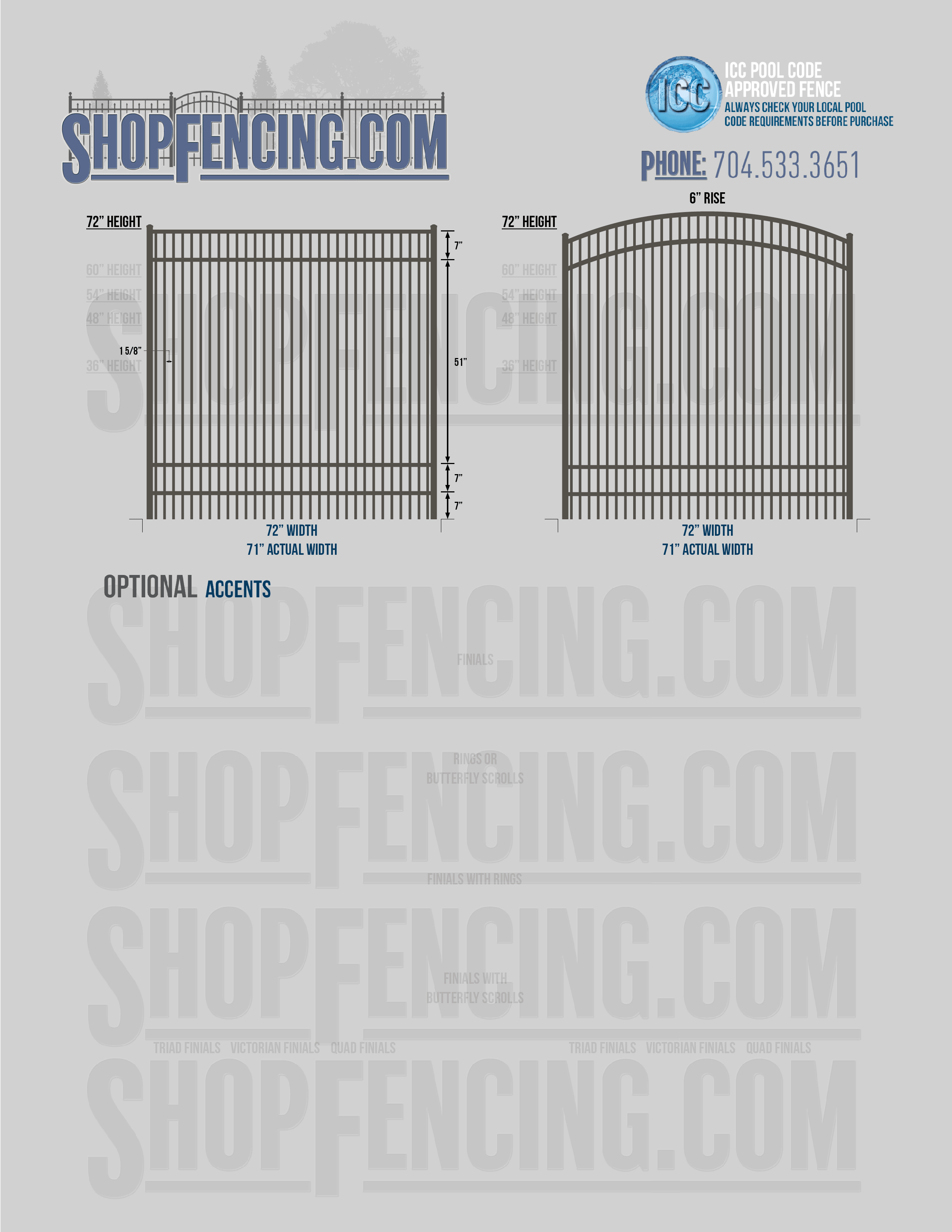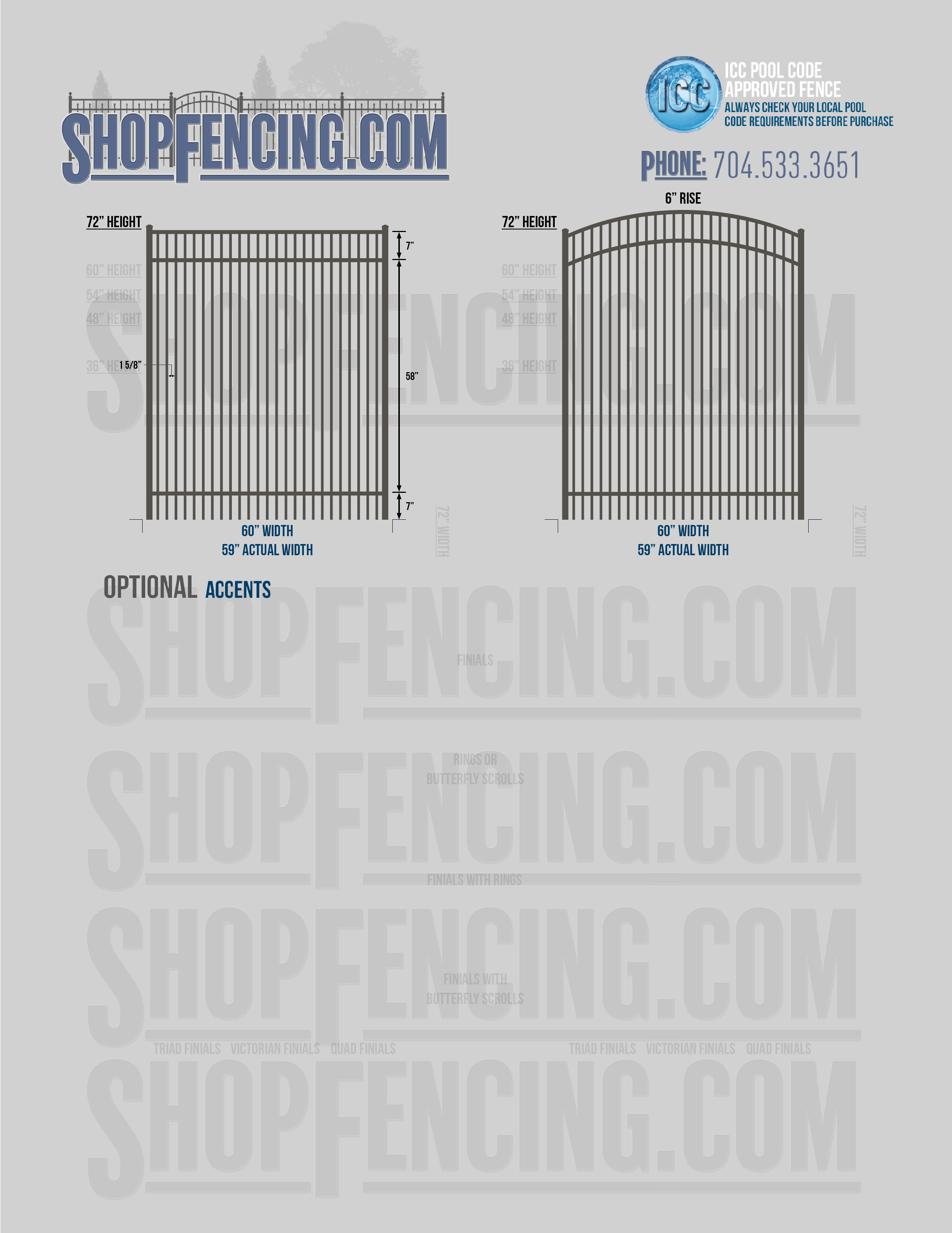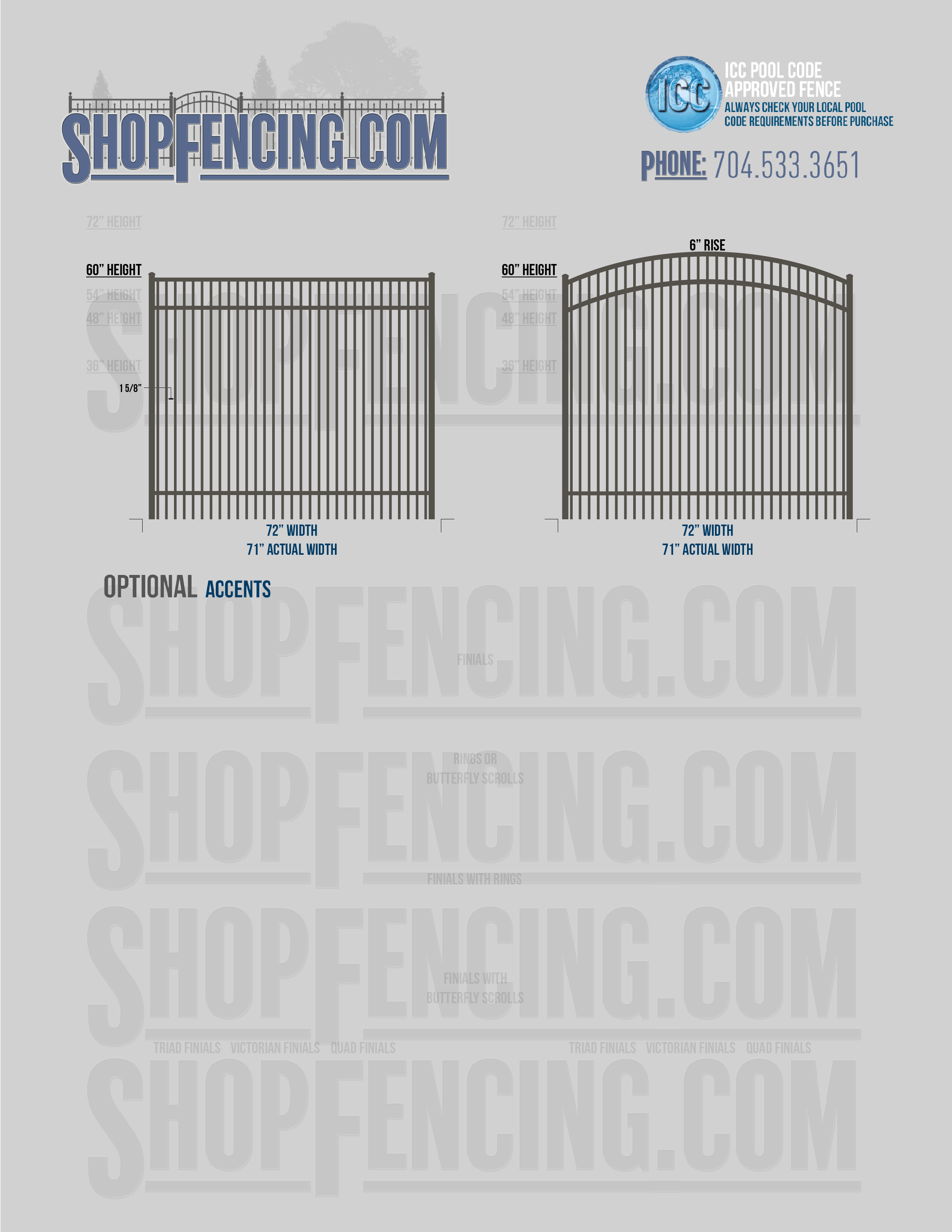 Standard Picket Design: 54" Flush Bottom, 60" and 72" Heights. Double Picket Design: 48", 54", 60" and 72" Heights. Check your local pool codes before purchasing.