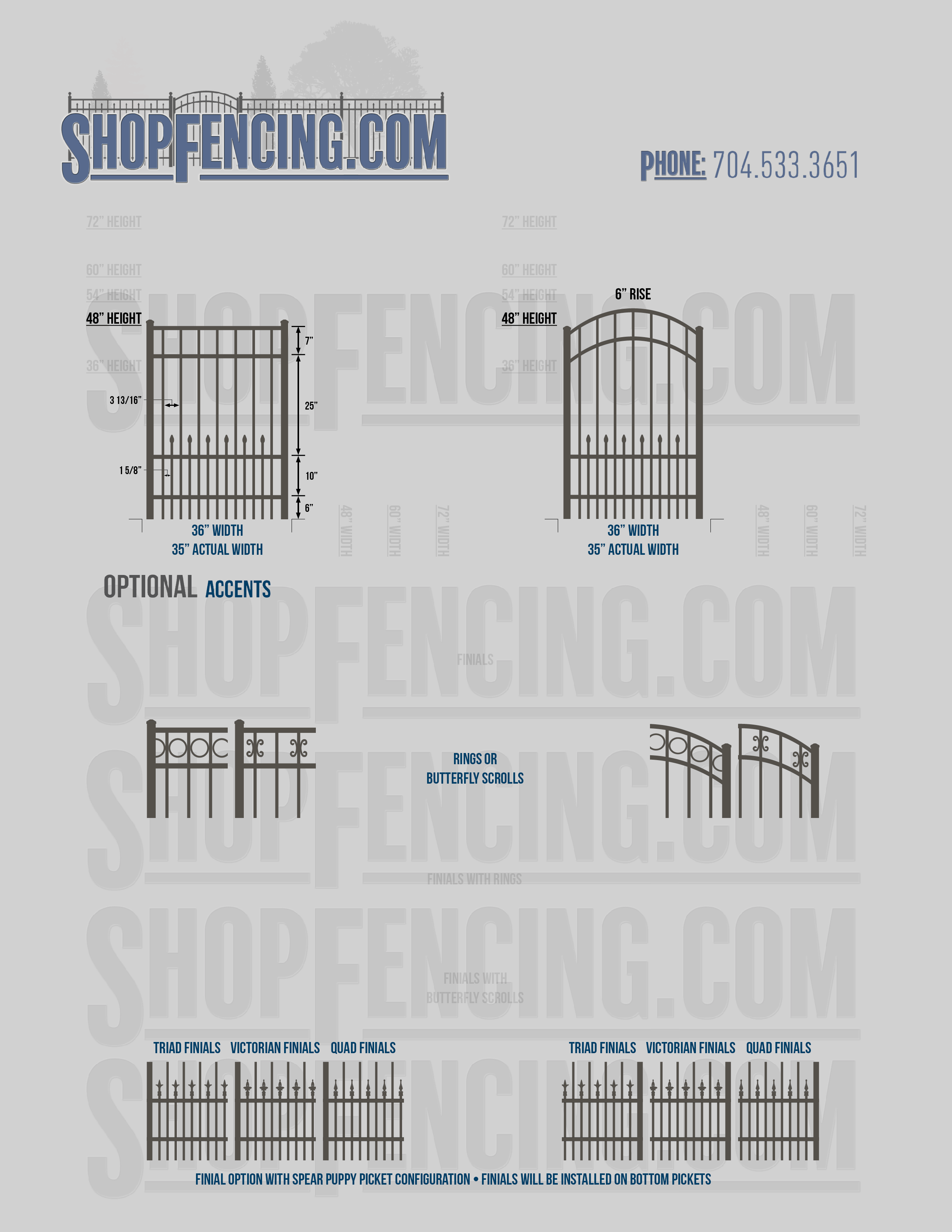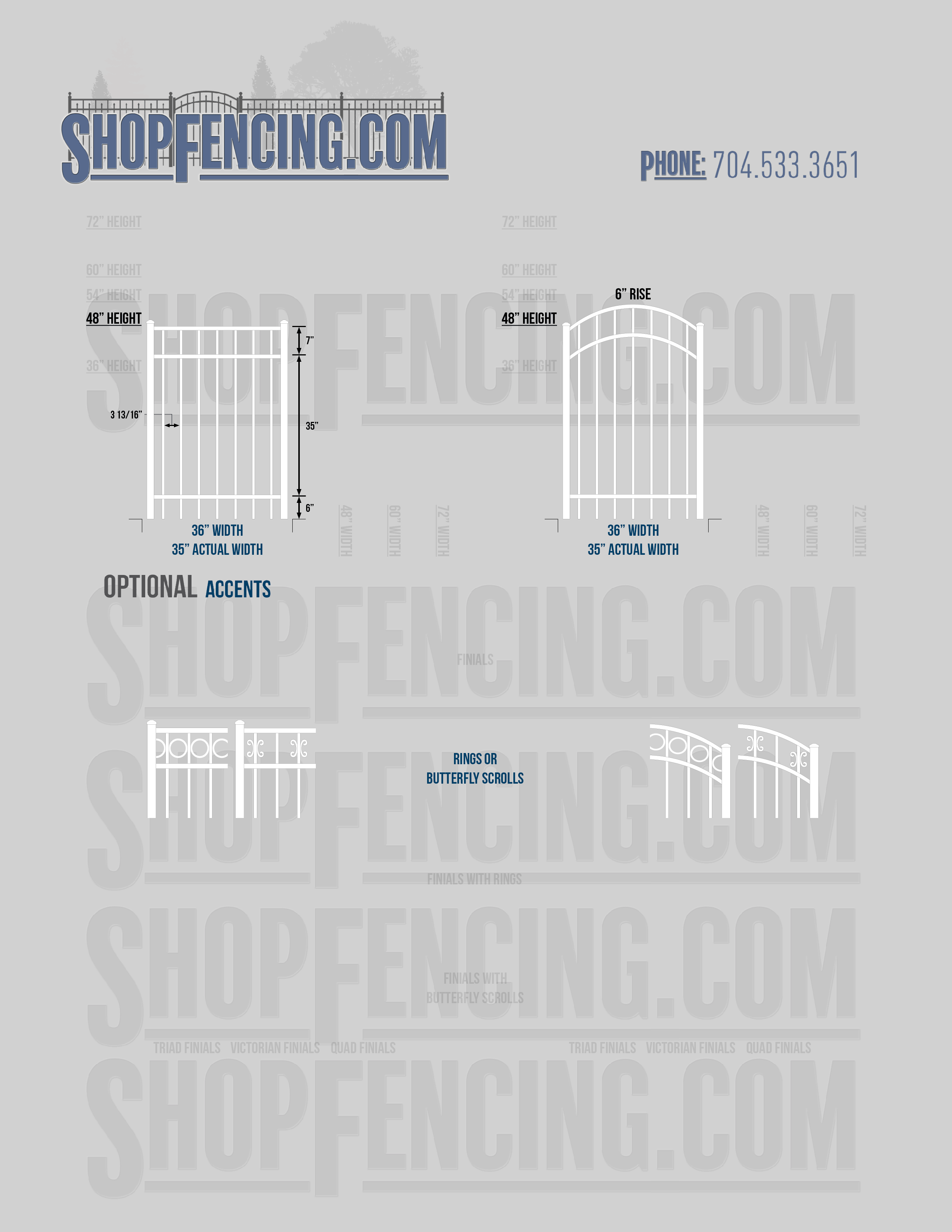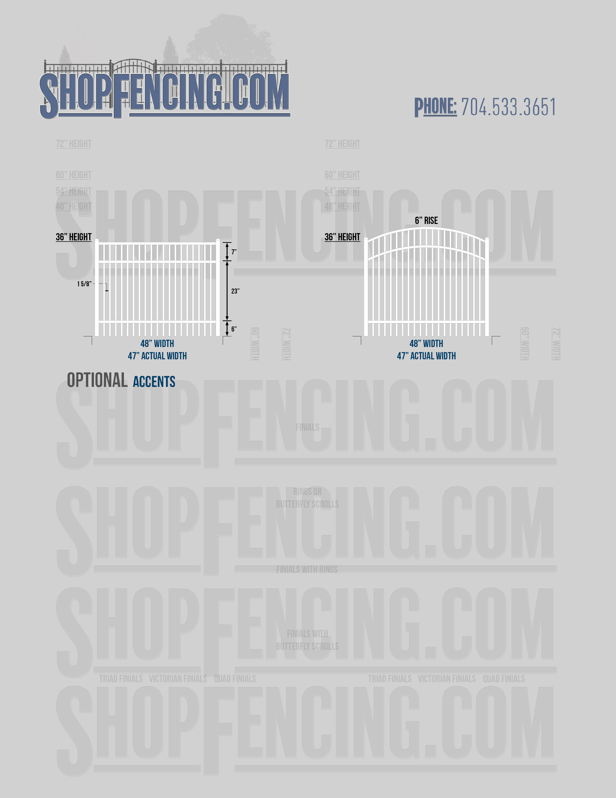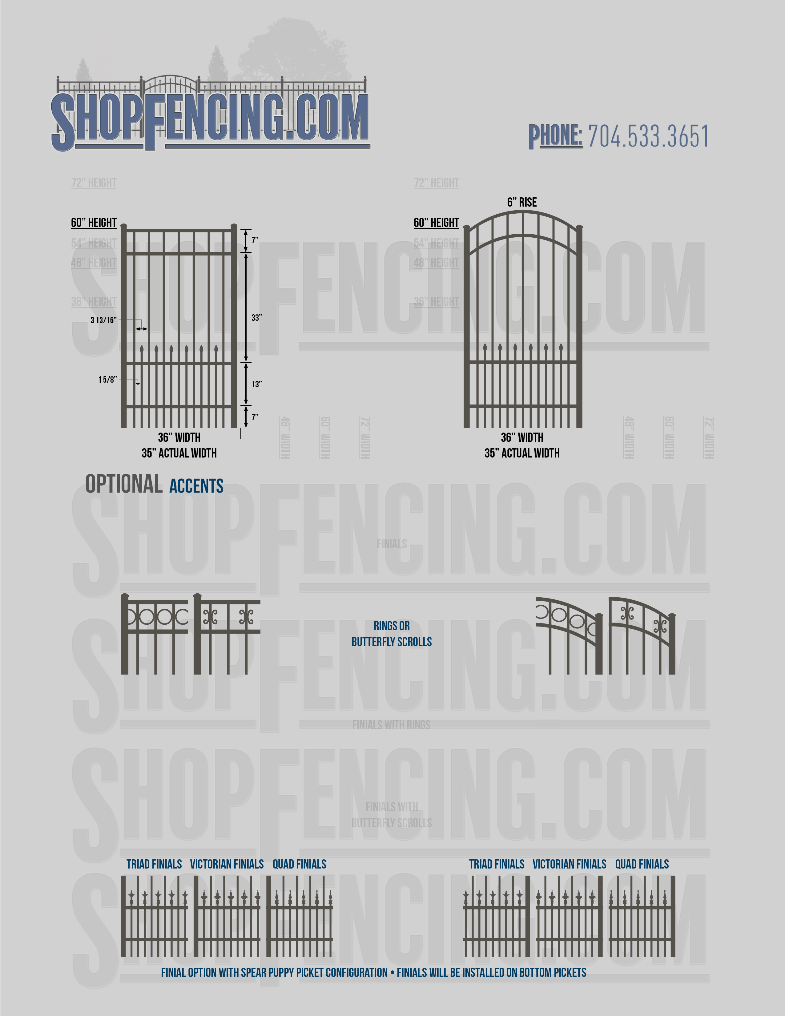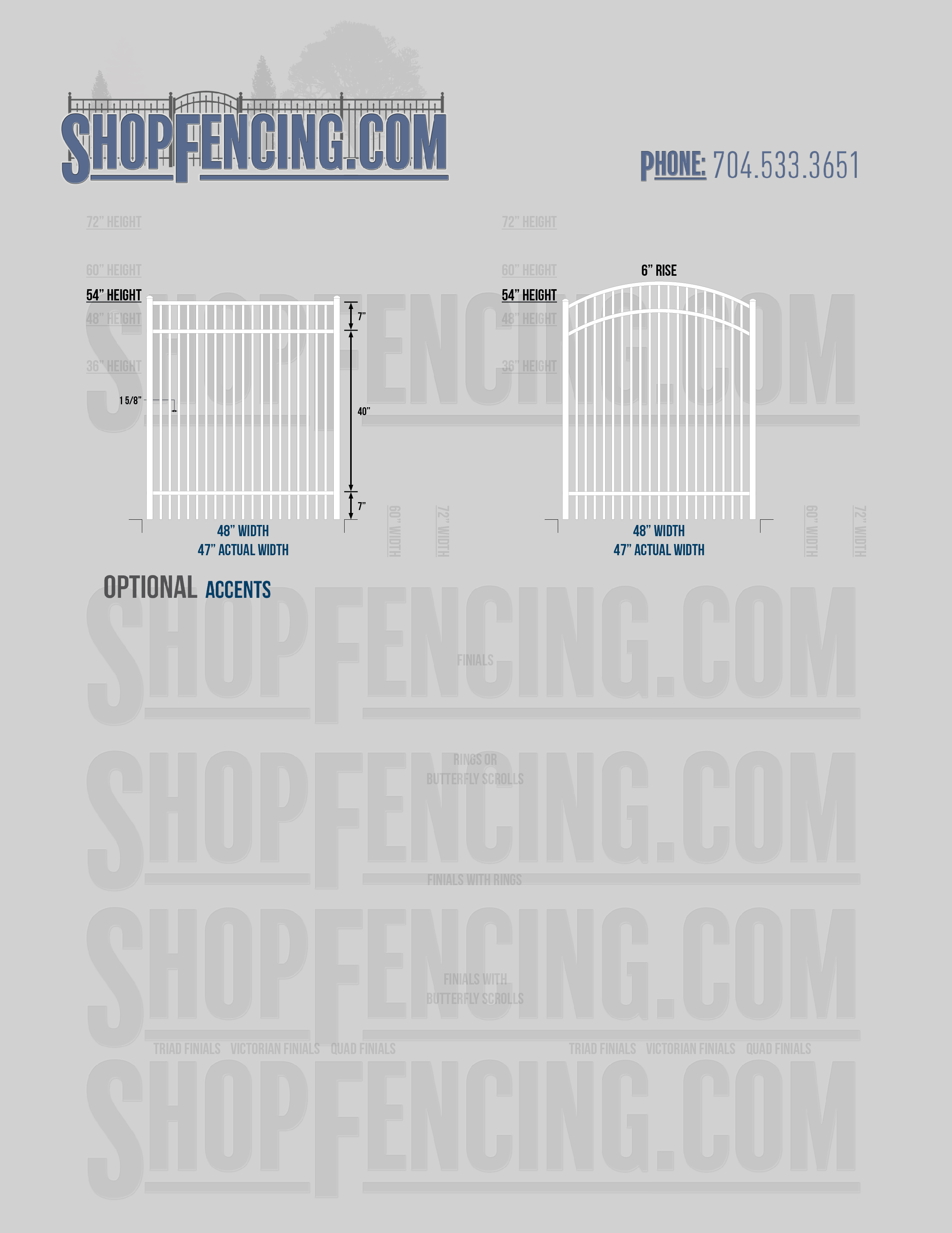 Accent Upgrades: When you add these options, gates will ship with the finials, rings or scrolls installed. PLEASE NOTE: Triad and Victorian finials cannot be installed on double picket fence sections and gates. Rings and scrolls cannot be installed on double picket fence sections and gates.