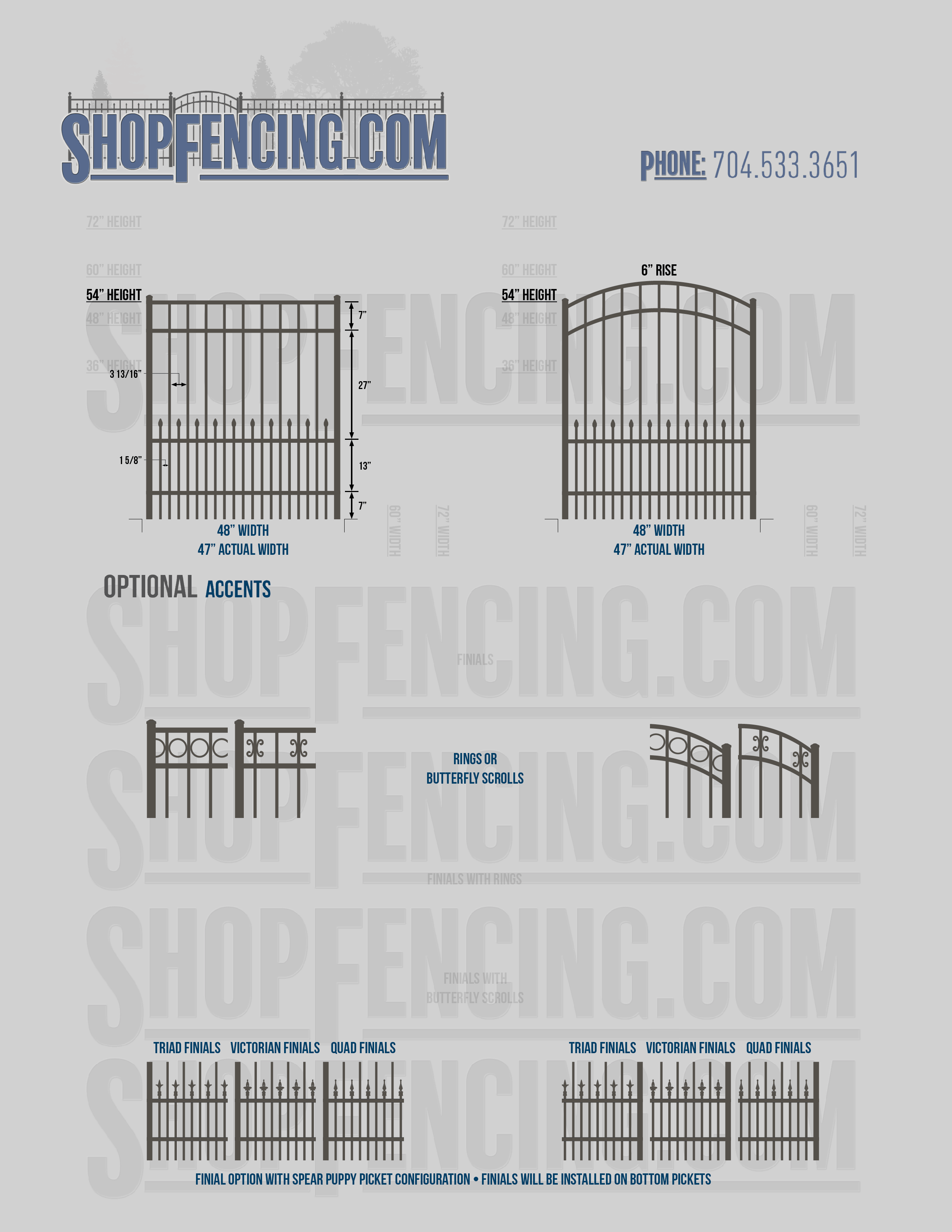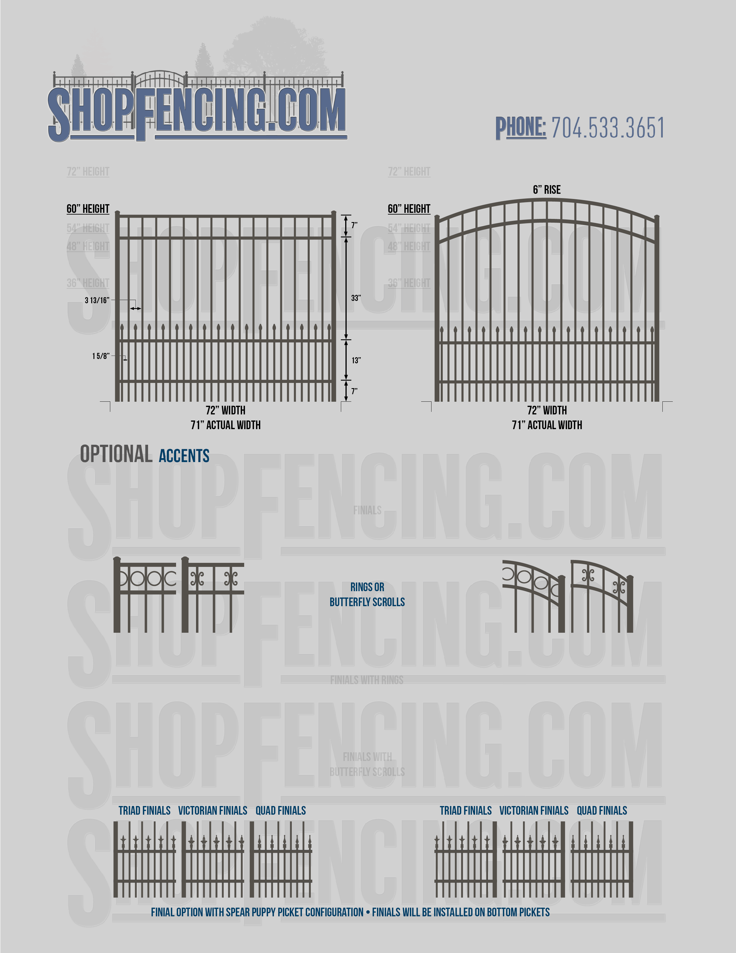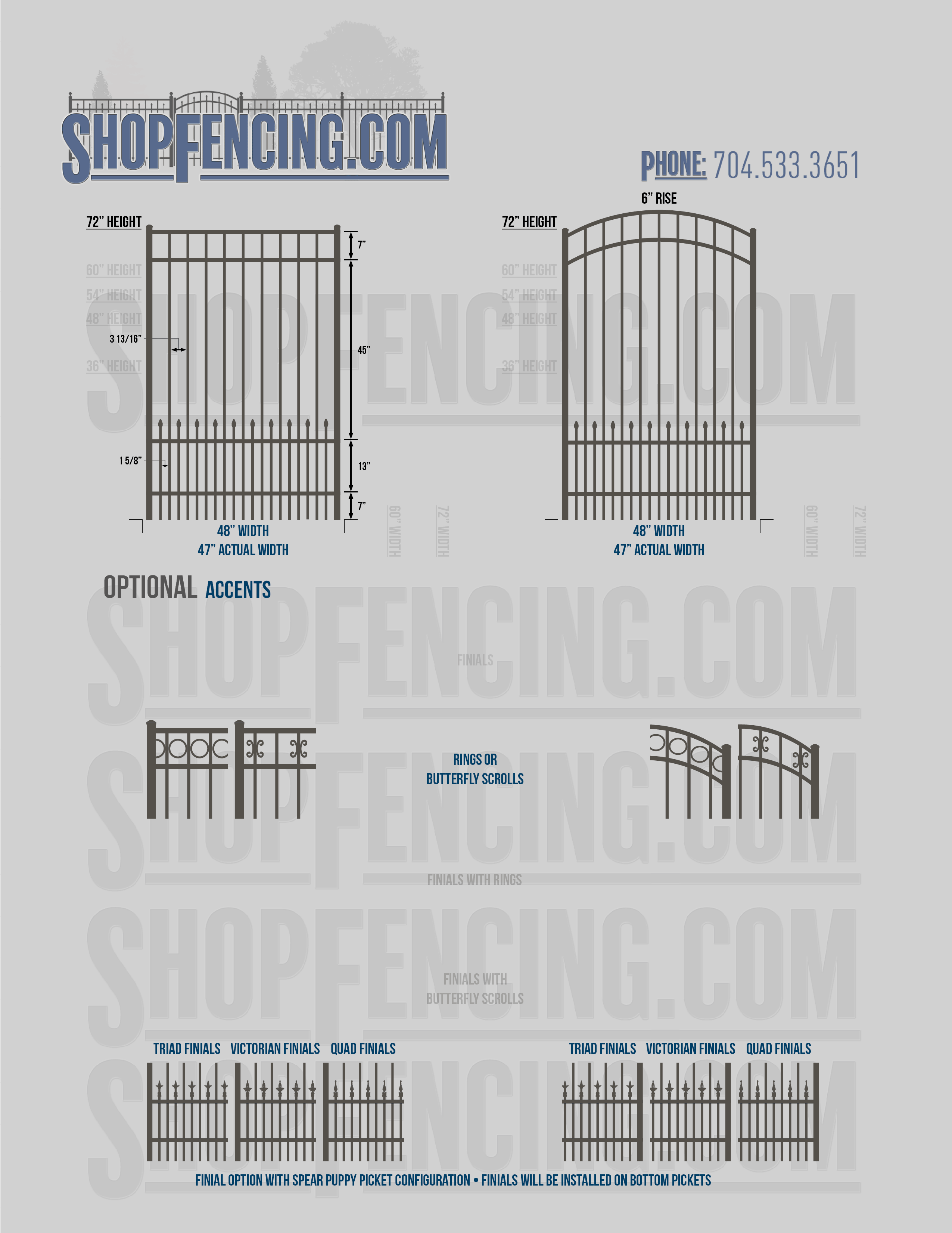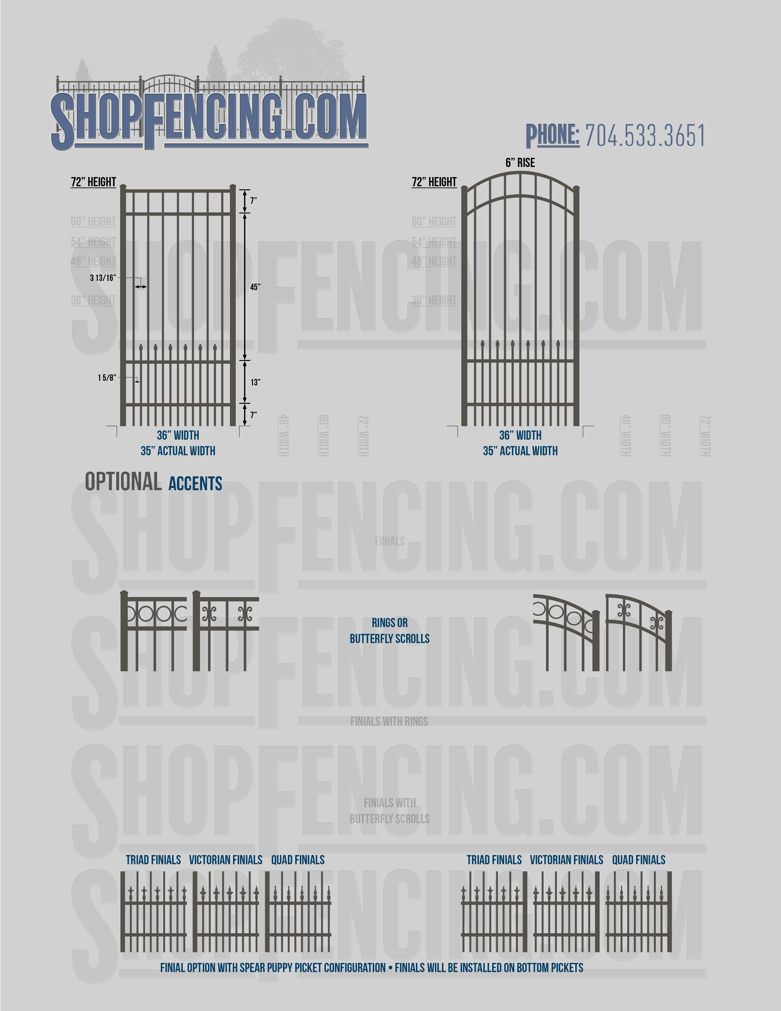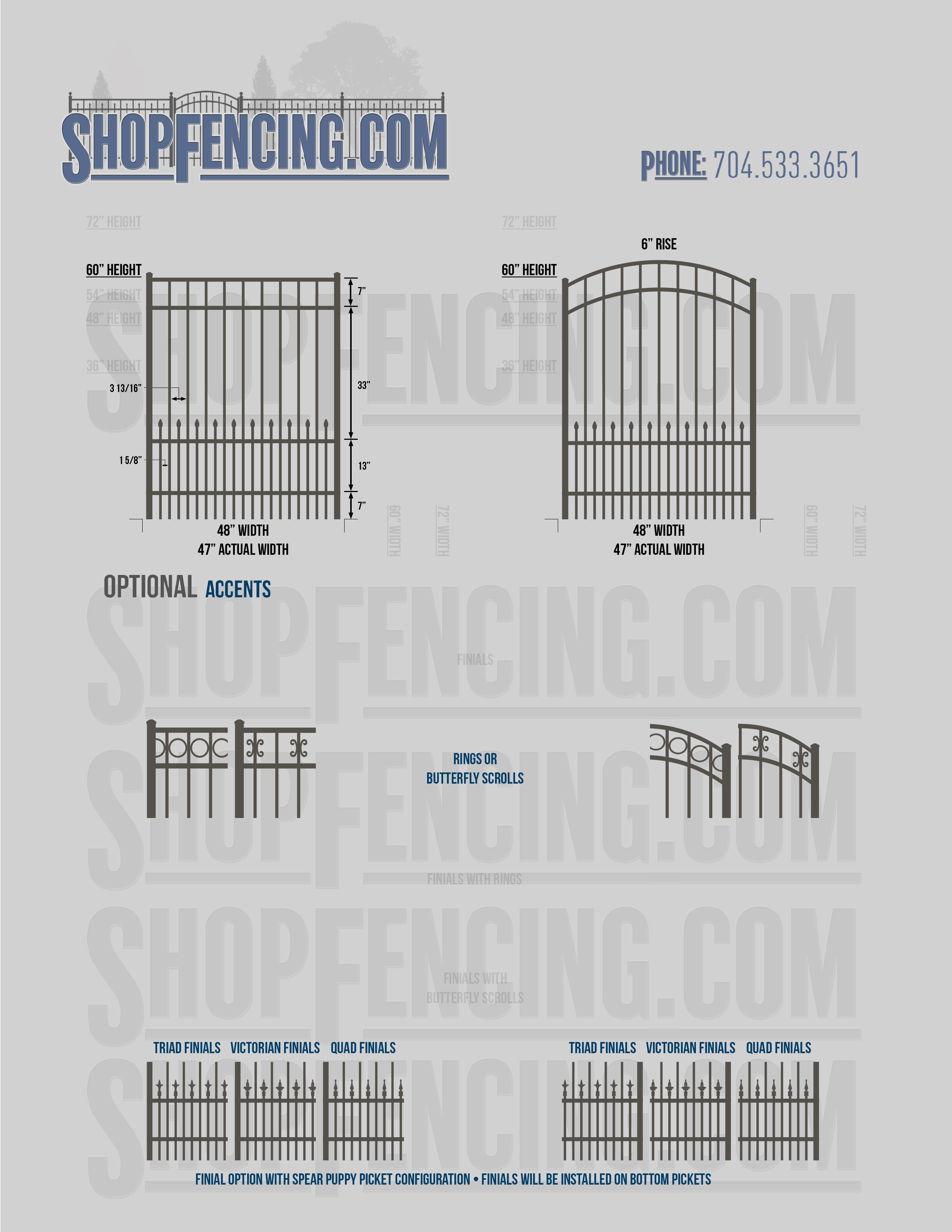 Accent Upgrades: When you add these options, gates will ship with the finials, rings or scrolls installed. PLEASE NOTE: Triad and Victorian finials cannot be installed on double picket fence sections and gates. Rings and scrolls cannot be installed on double picket fence sections and gates.