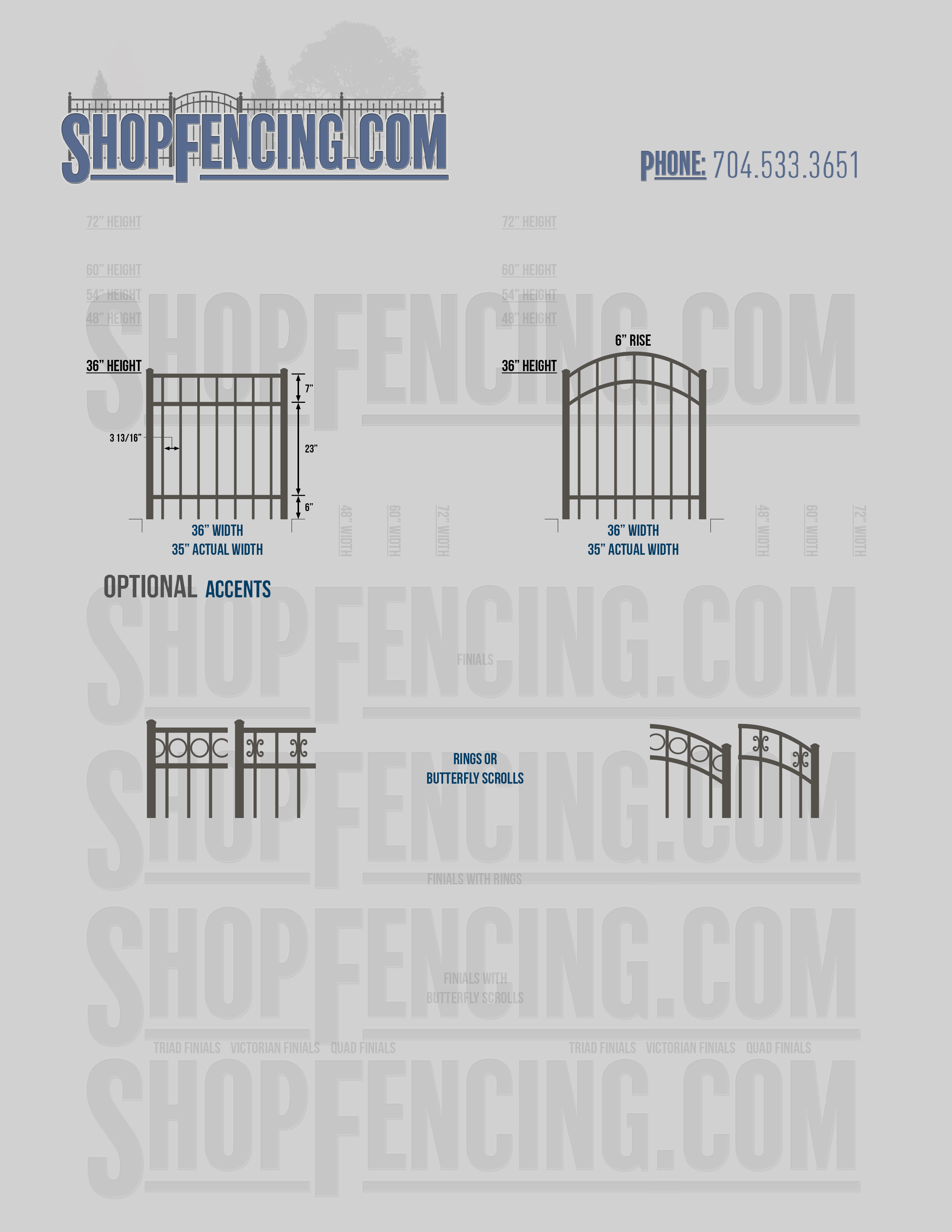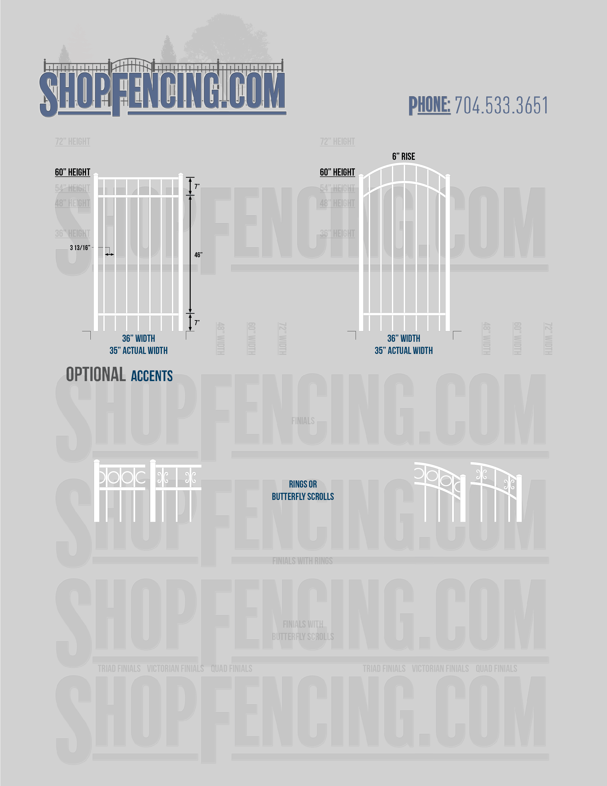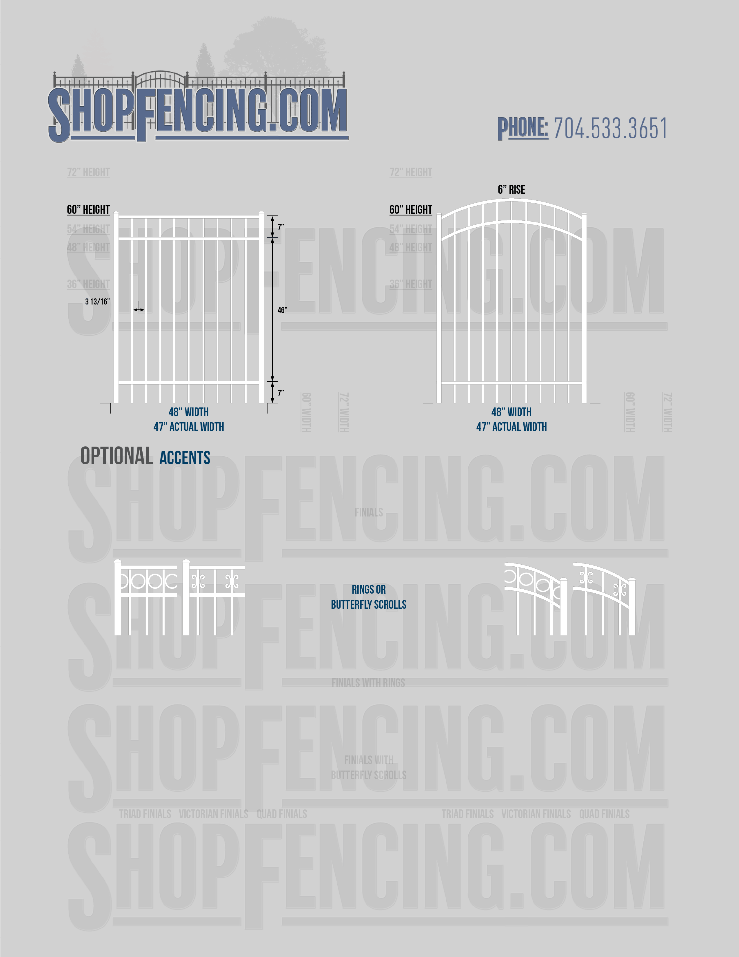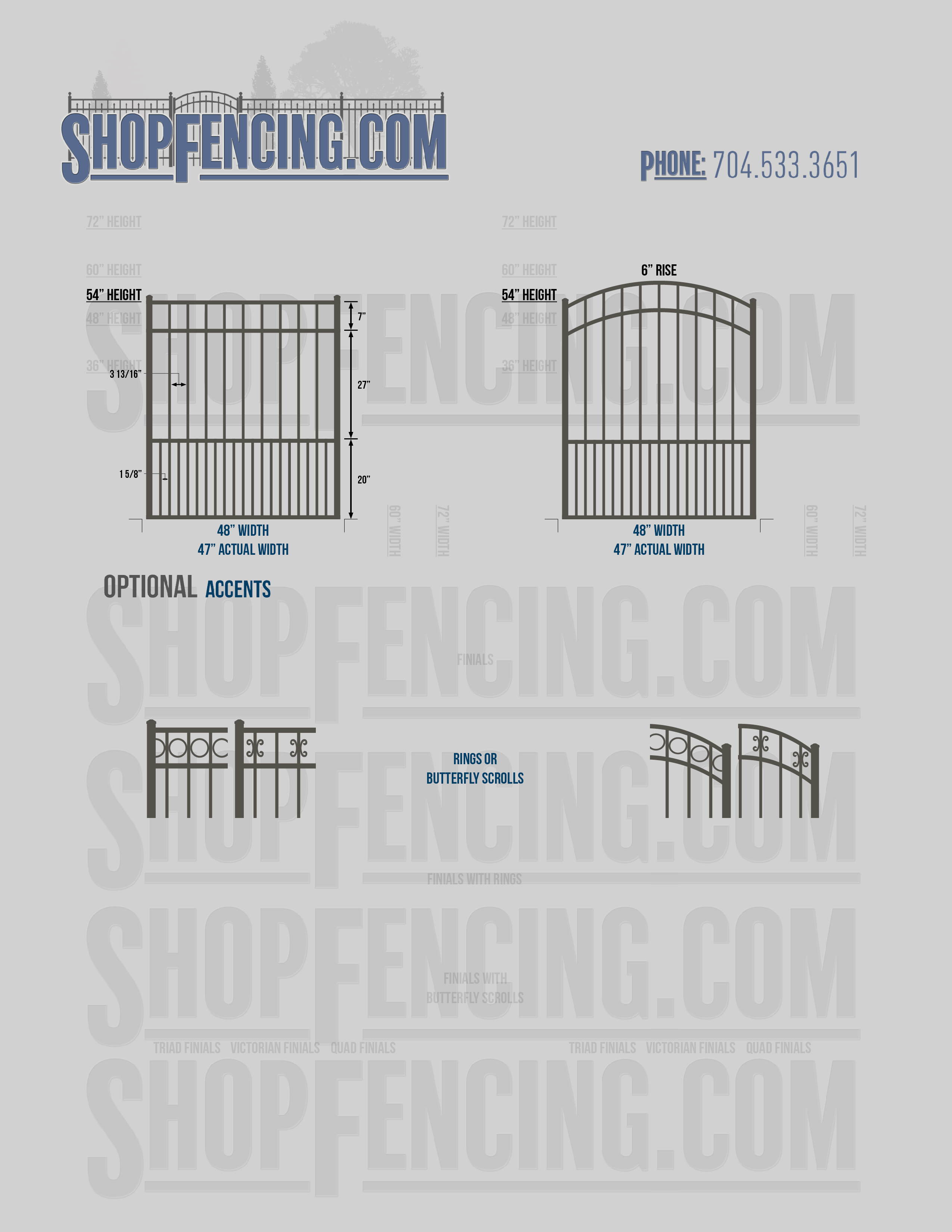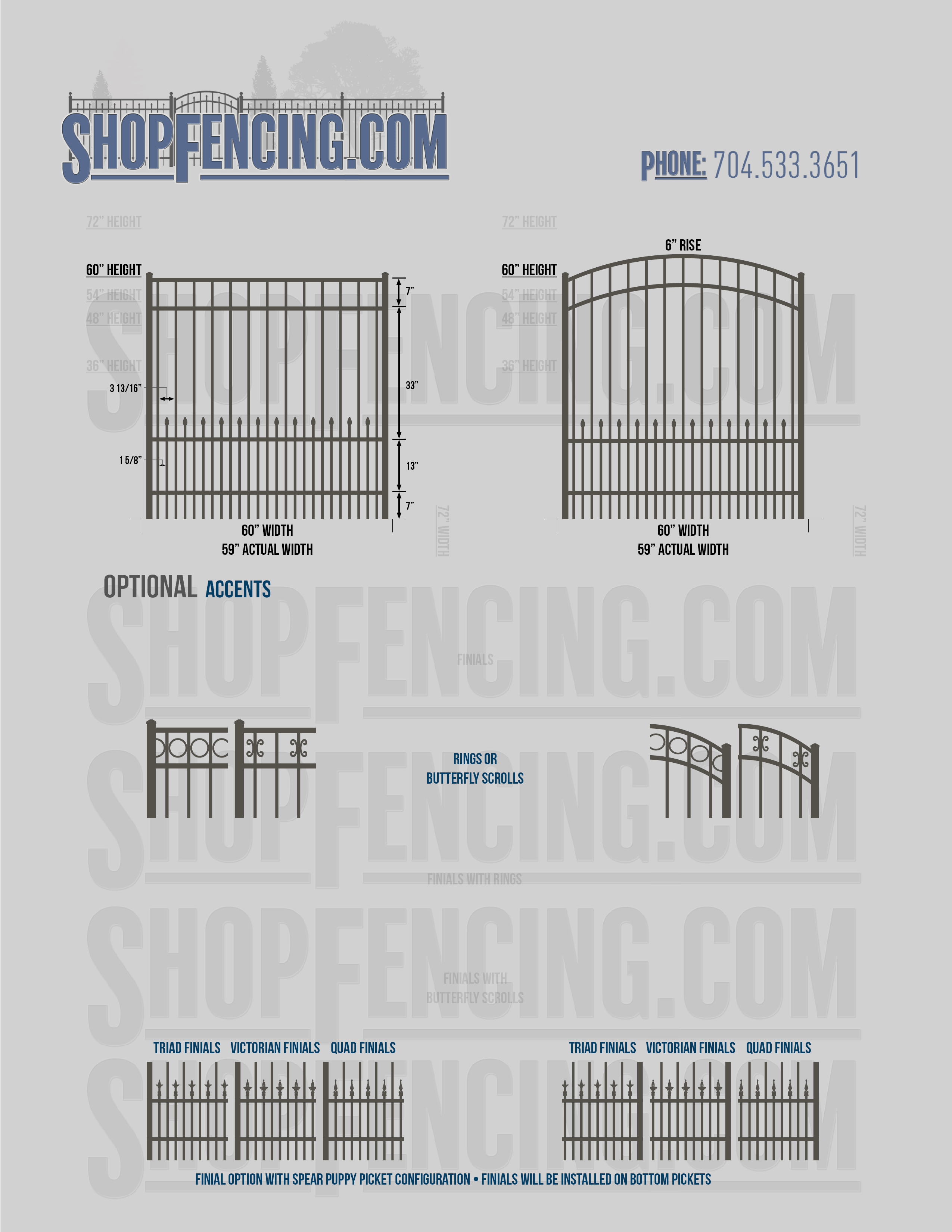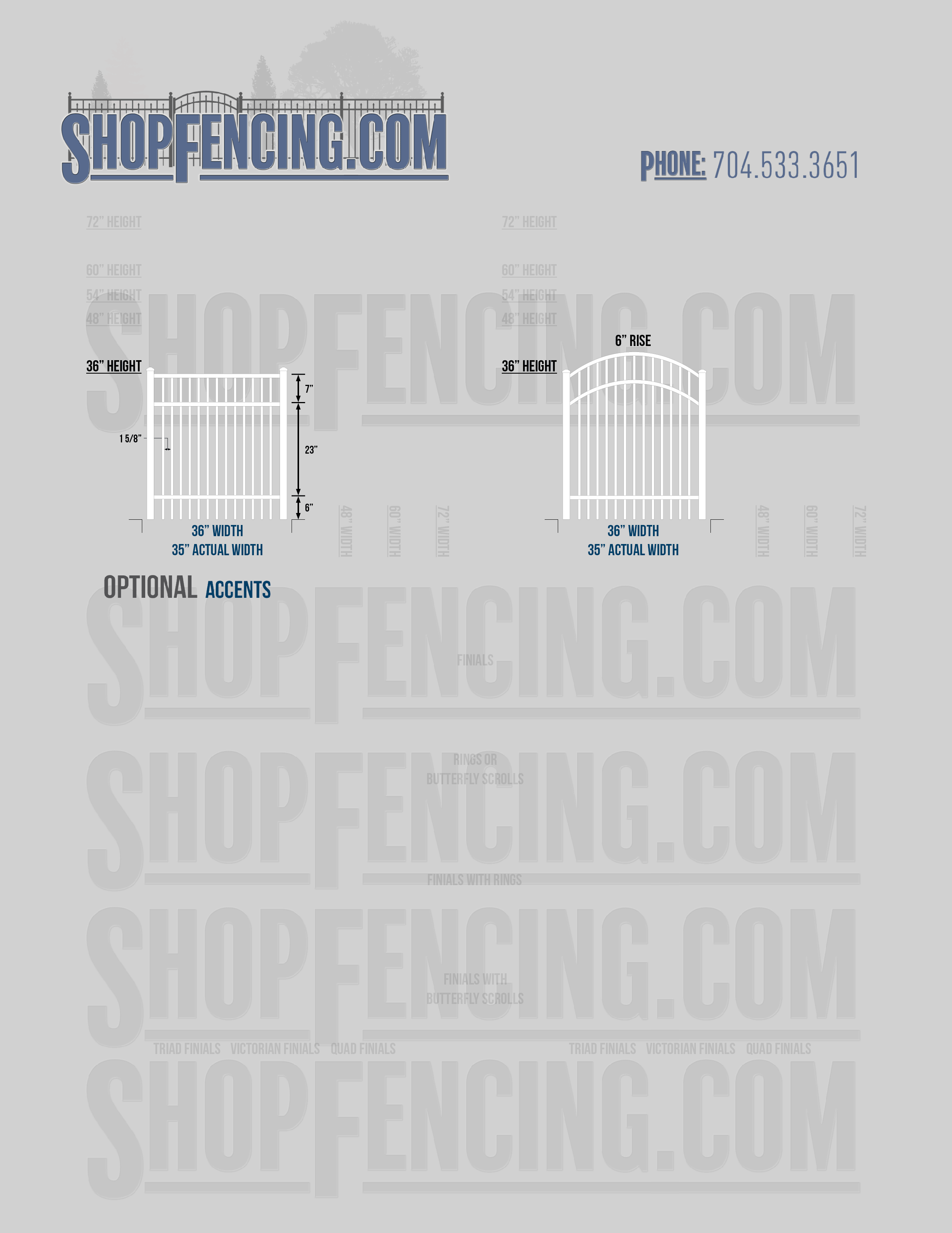 Accent Upgrades: When you add these options, gates will ship with the finials, rings or scrolls installed. PLEASE NOTE: Triad and Victorian finials cannot be installed on double picket fence sections and gates. Rings and scrolls cannot be installed on double picket fence sections and gates.