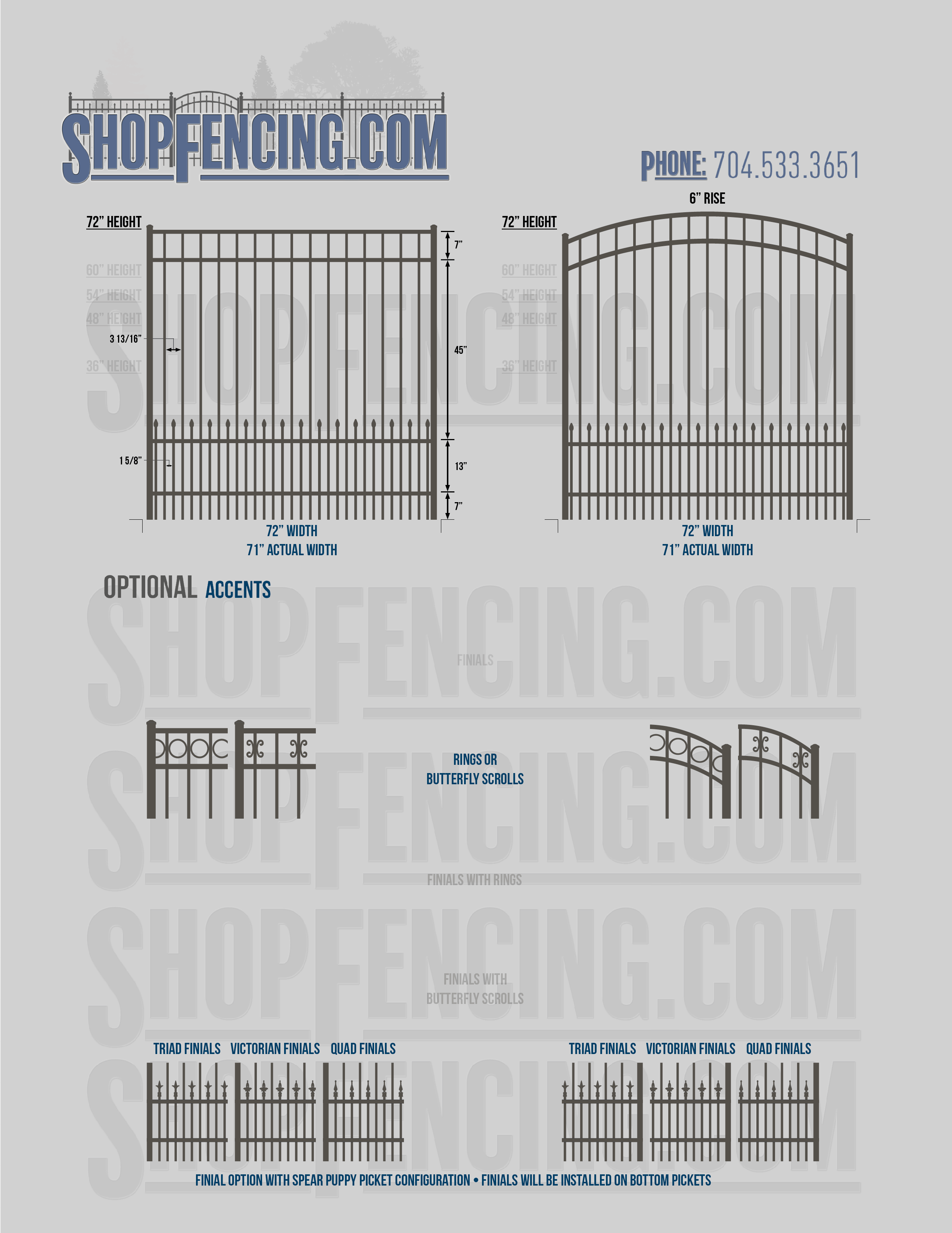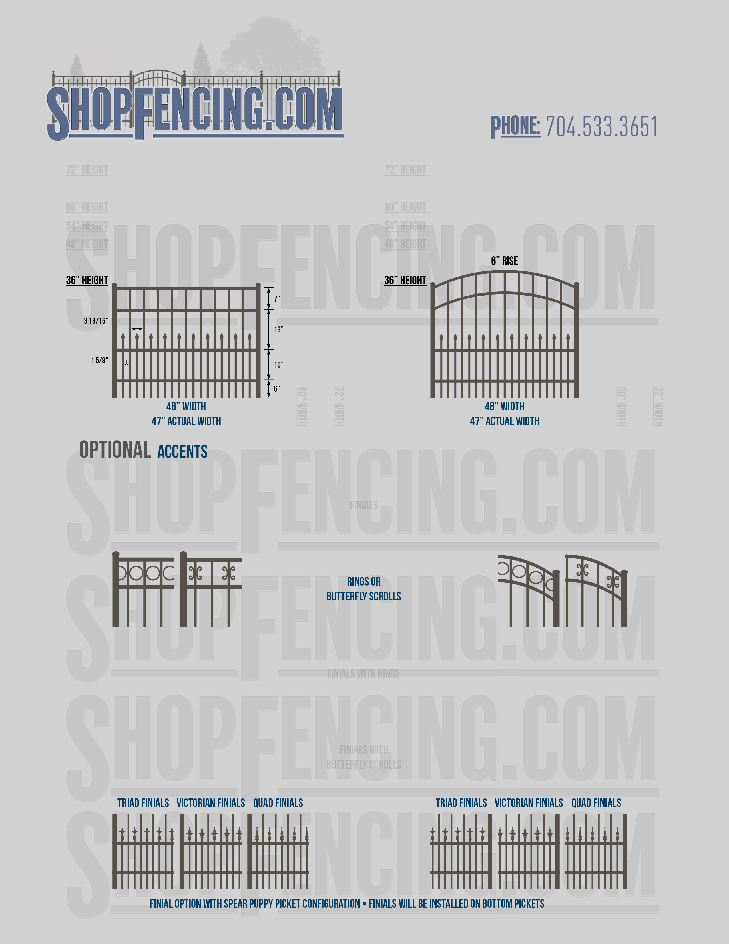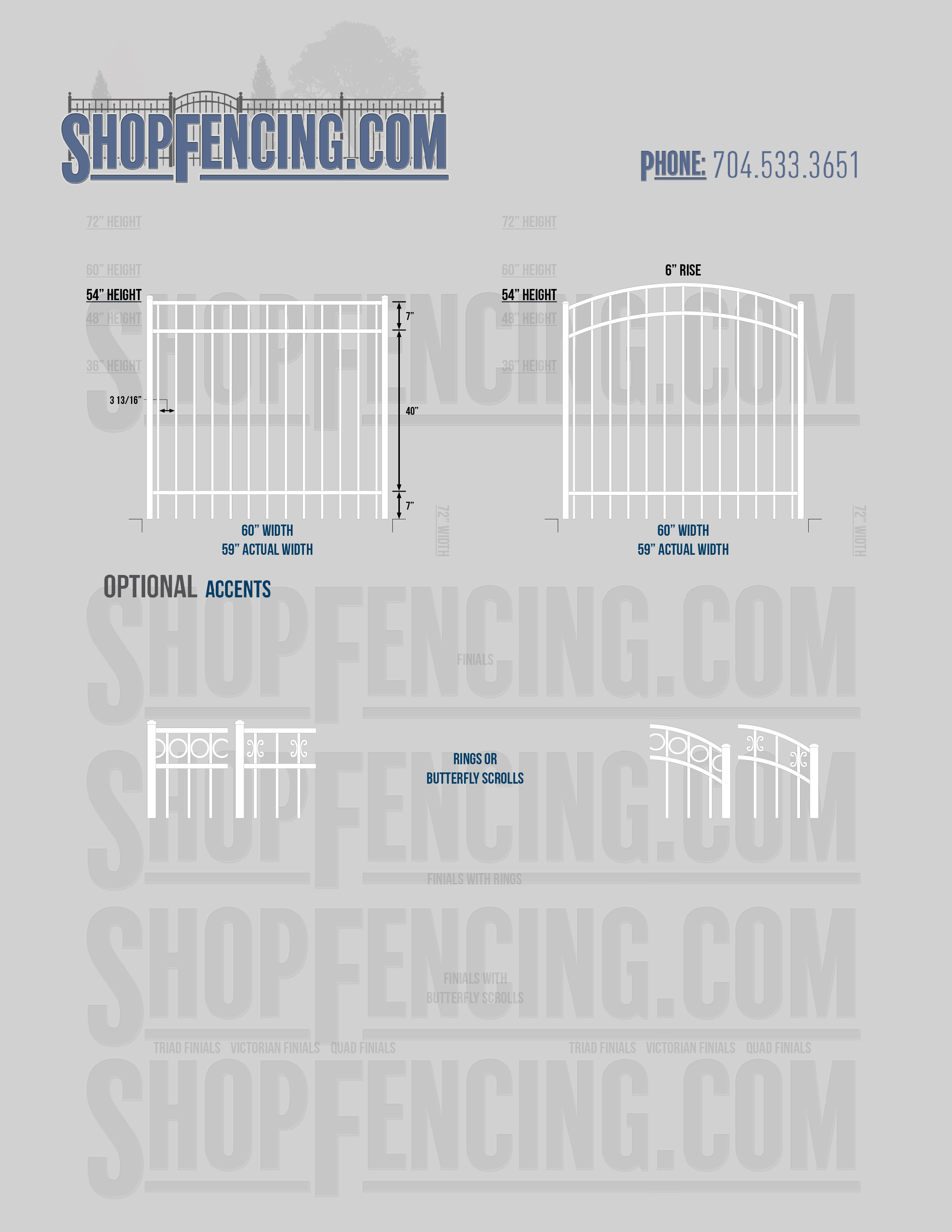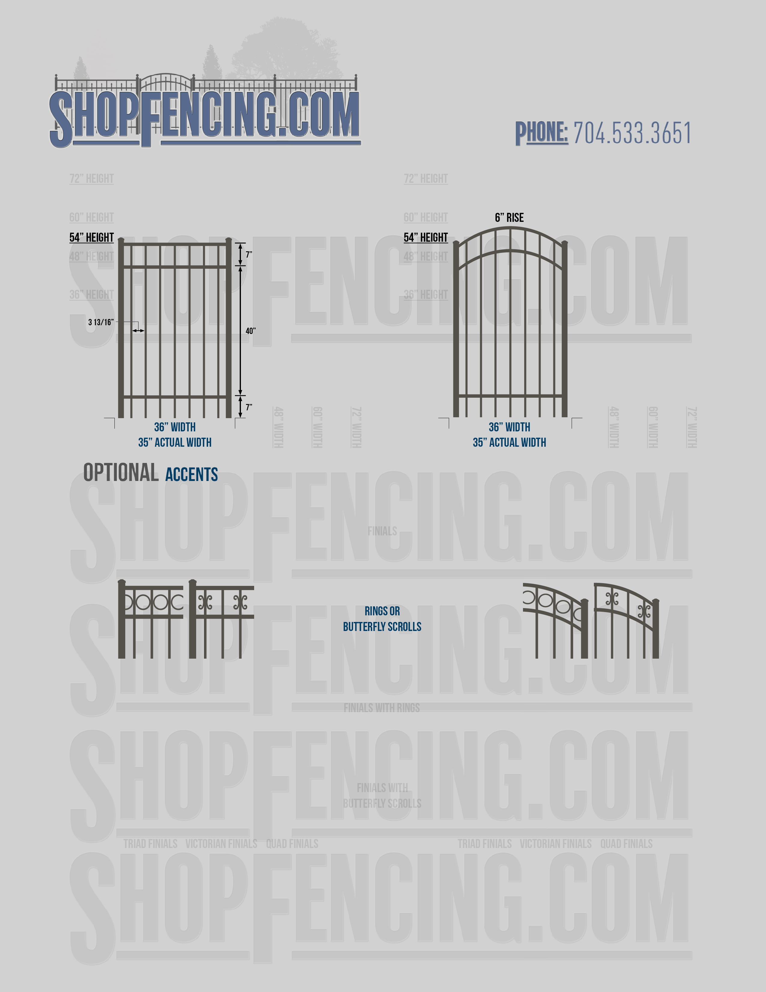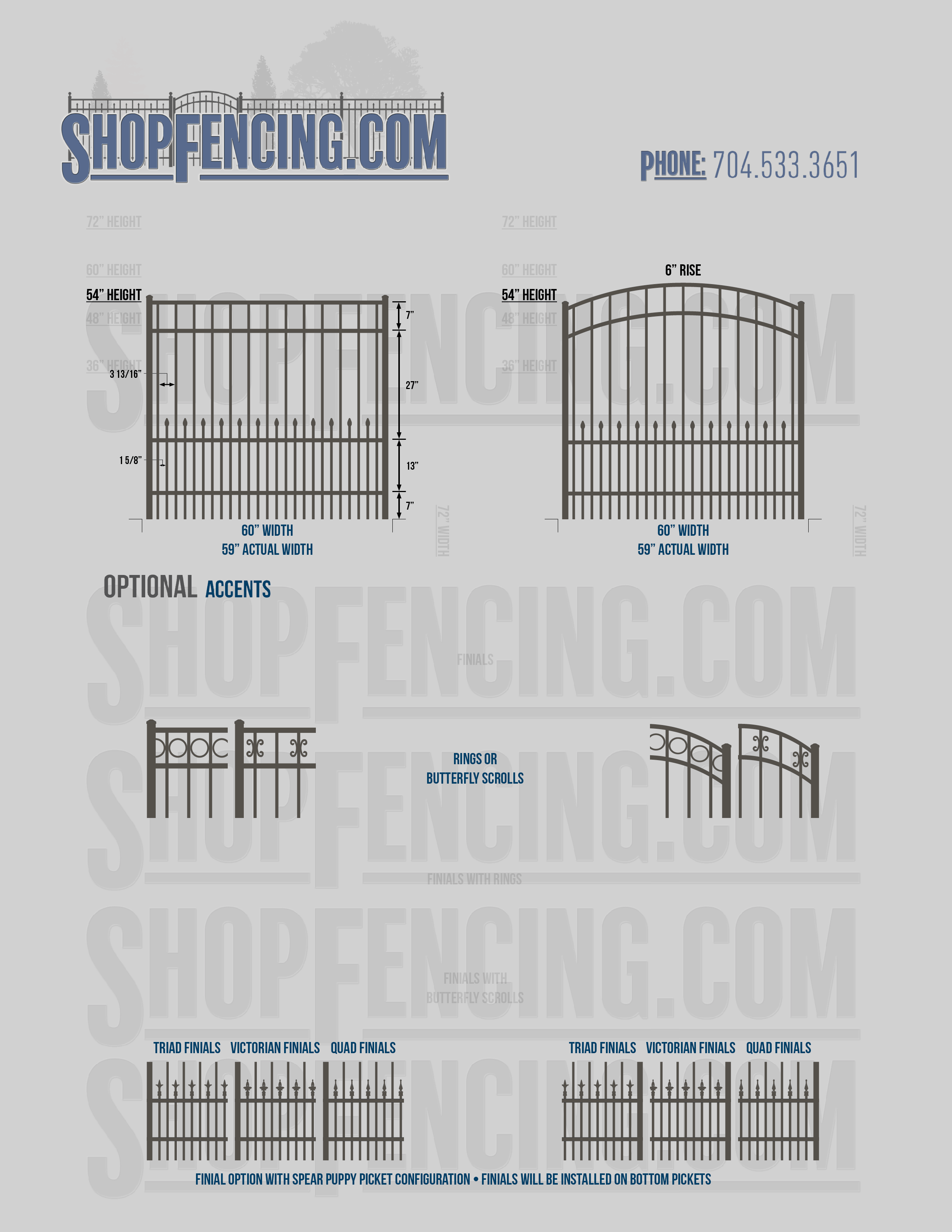 Accent Upgrades: When you add these options, gates will ship with the finials, rings or scrolls installed. PLEASE NOTE: Triad and Victorian finials cannot be installed on double picket fence sections and gates. Rings and scrolls cannot be installed on double picket fence sections and gates.