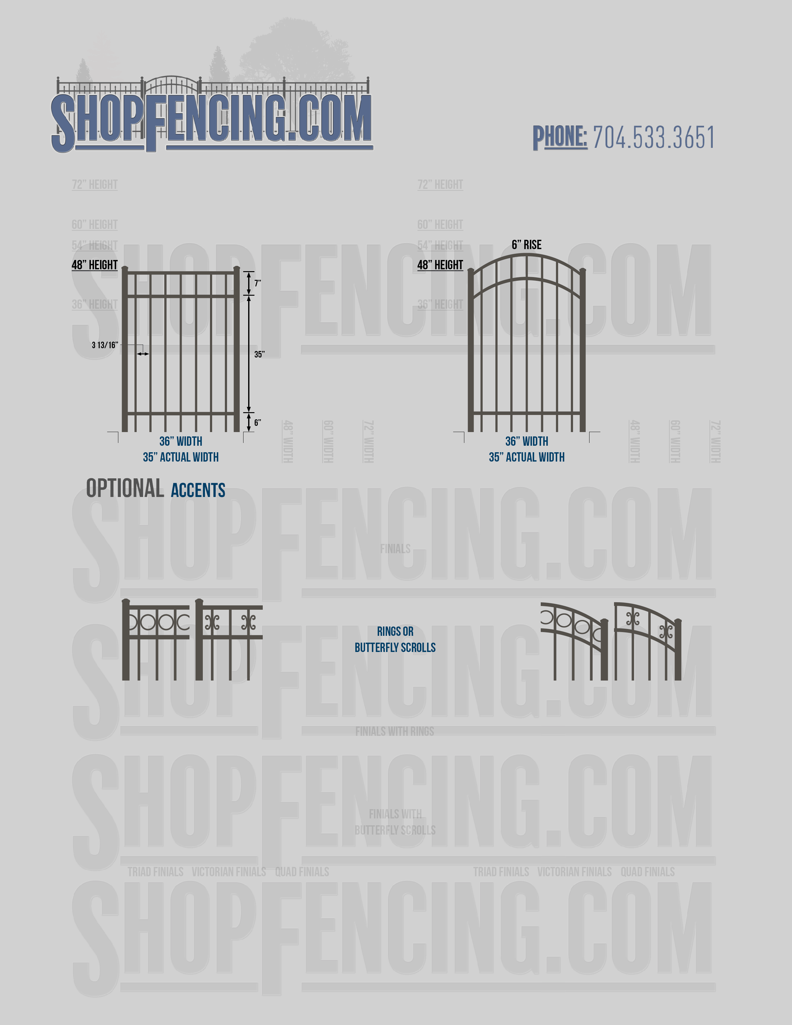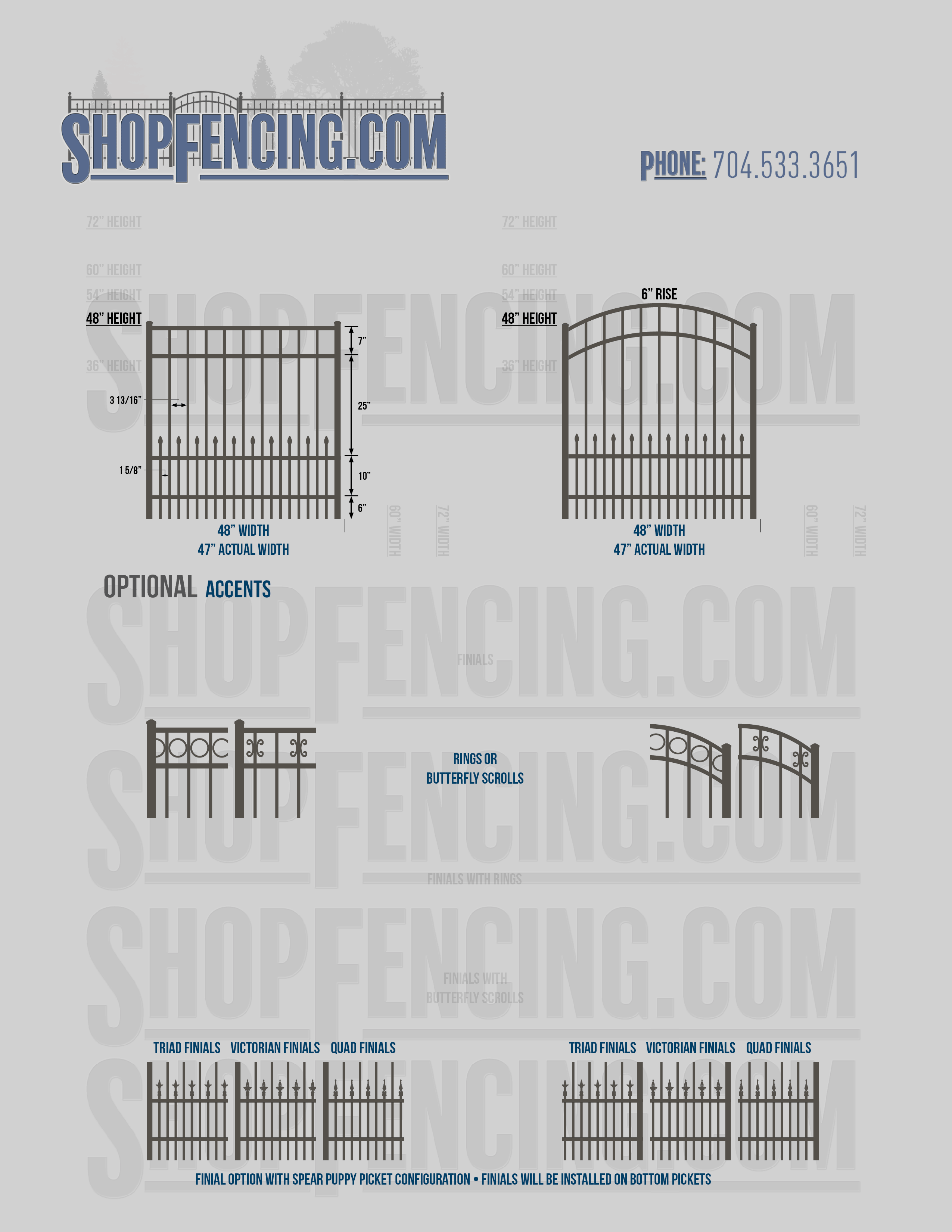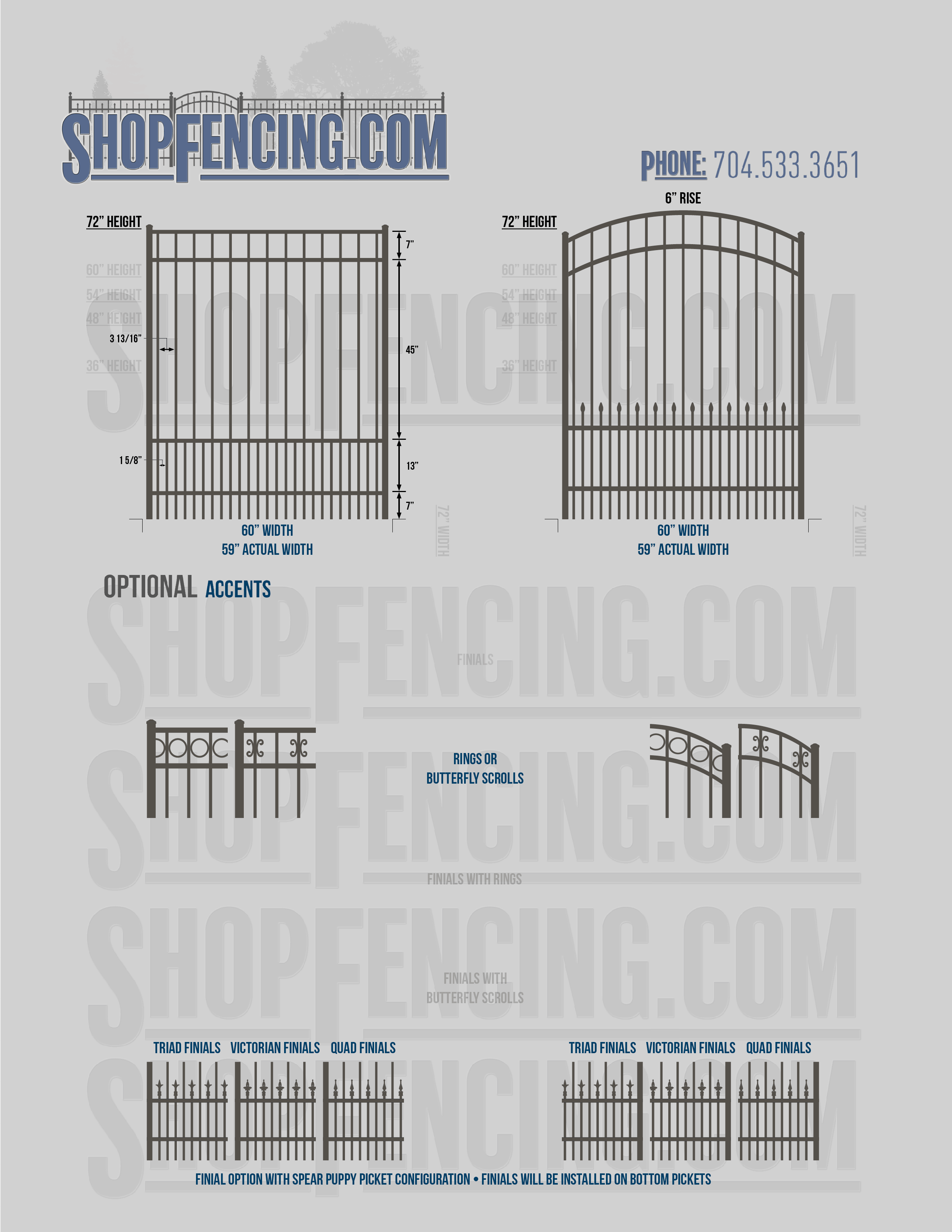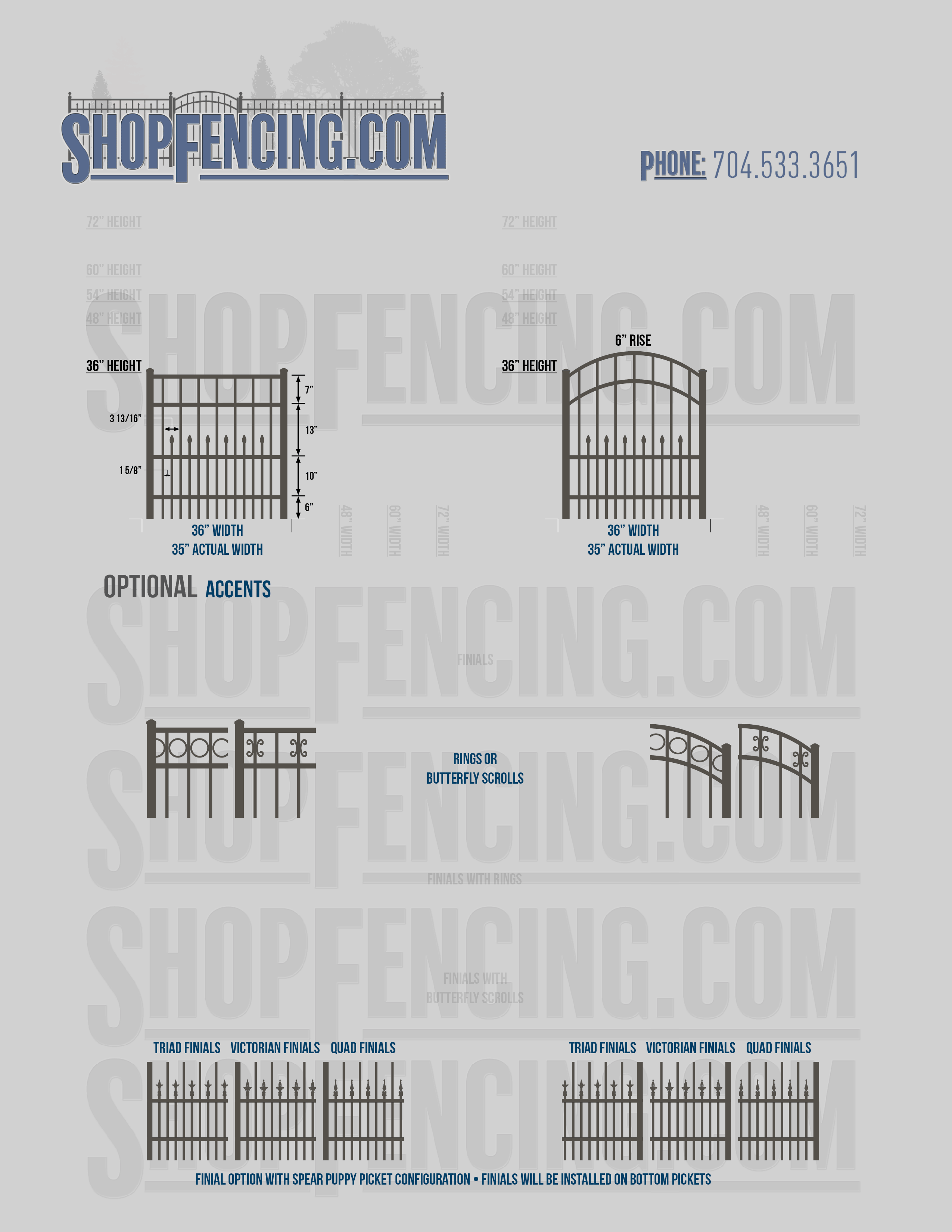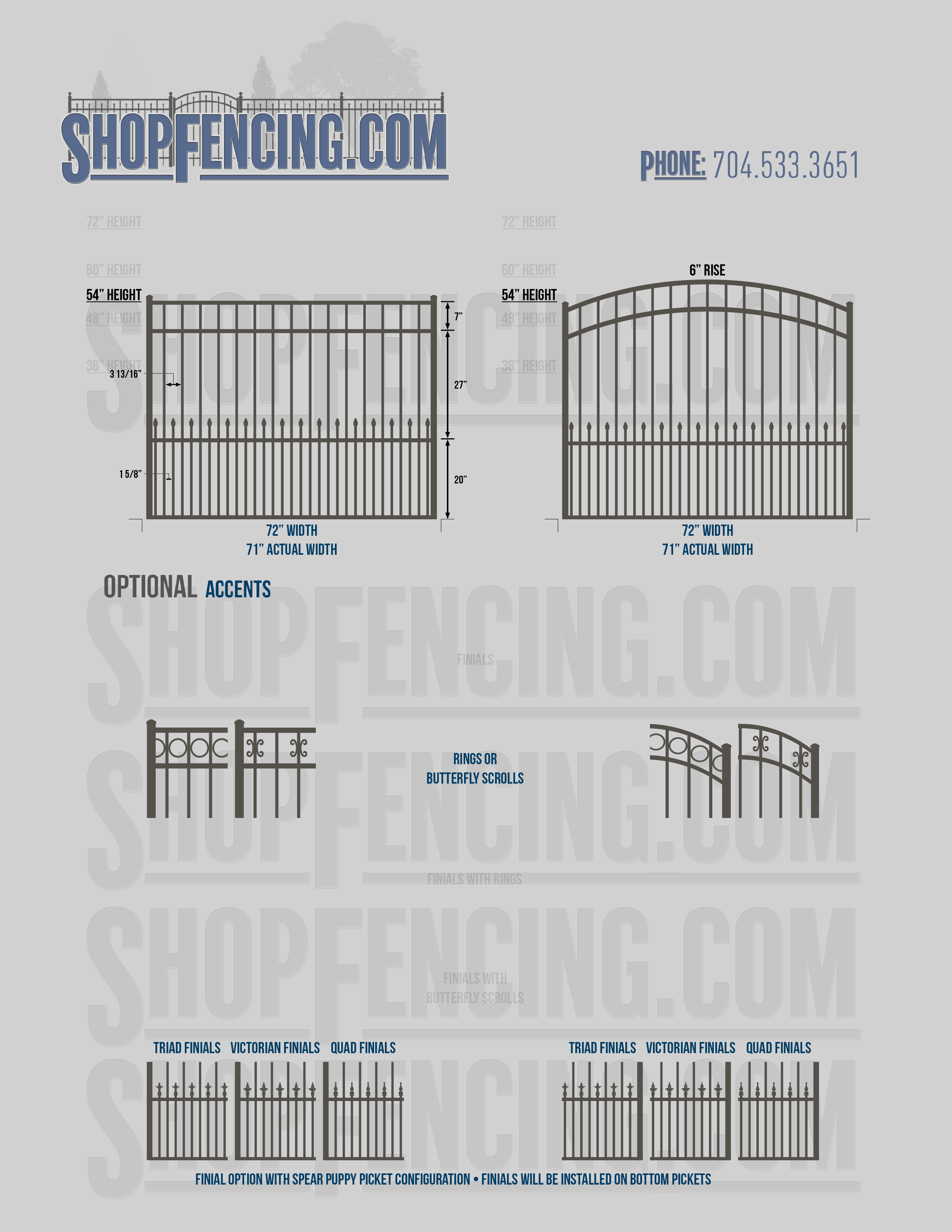 Accent Upgrades: When you add these options, gates will ship with the finials, rings or scrolls installed. PLEASE NOTE: Triad and Victorian finials cannot be installed on double picket fence sections and gates. Rings and scrolls cannot be installed on double picket fence sections and gates.