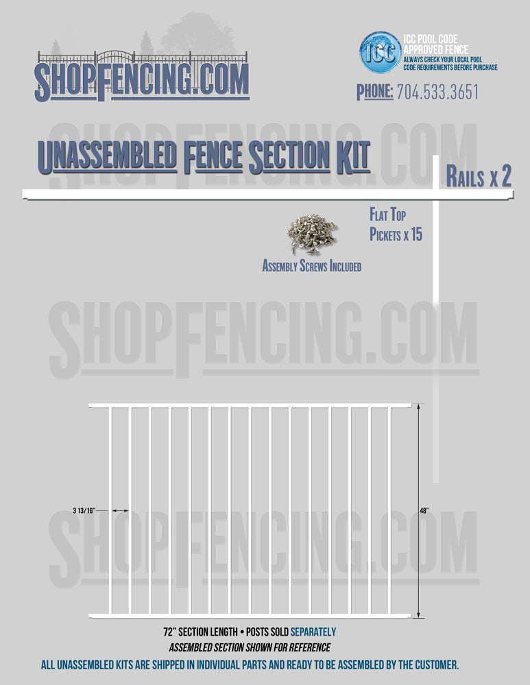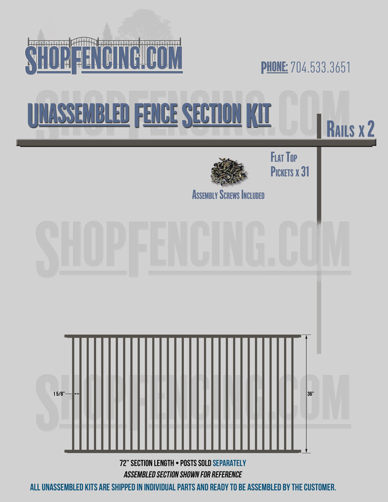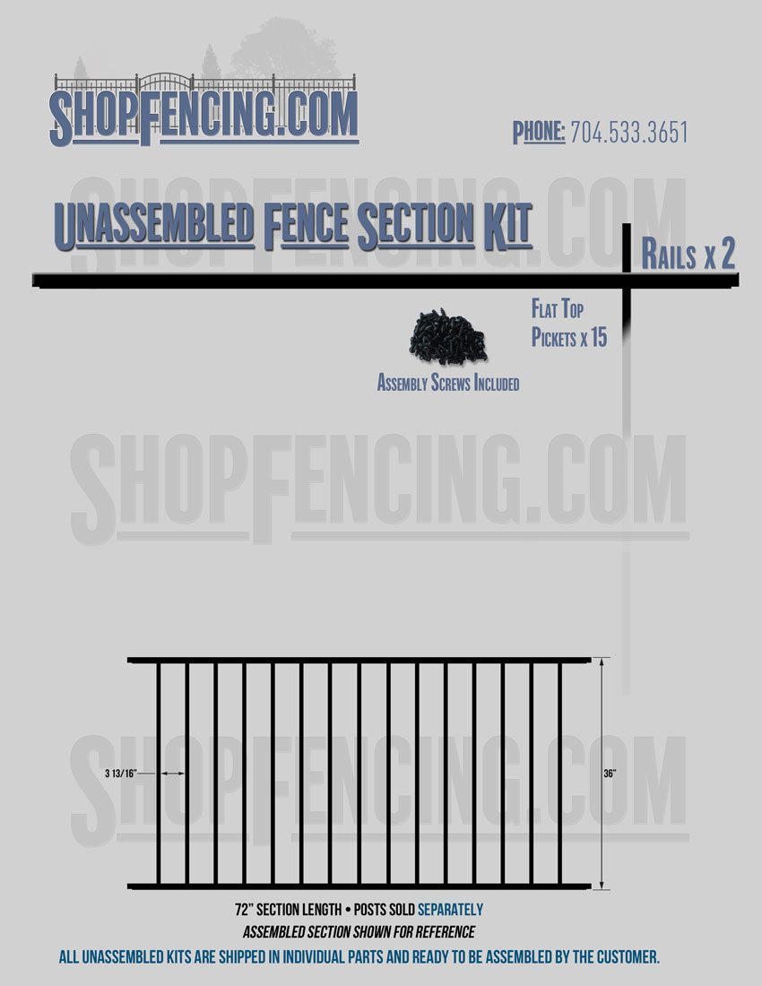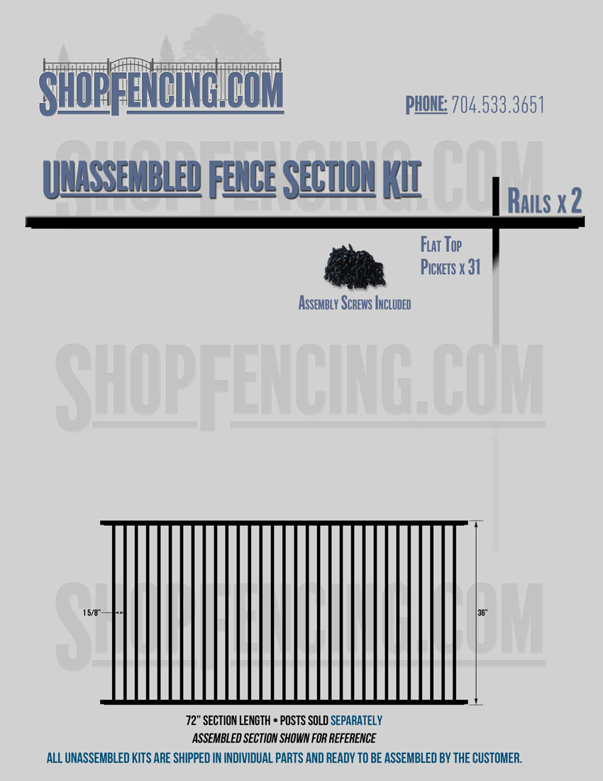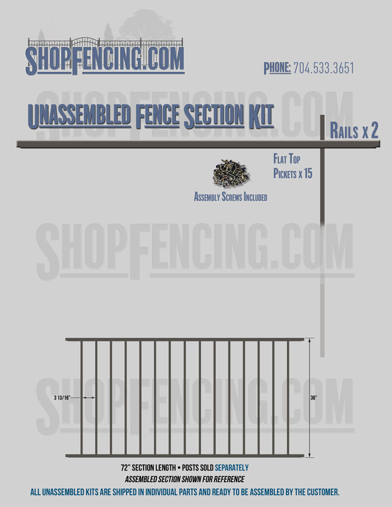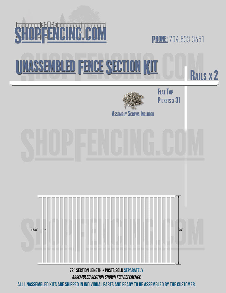 Assembled Fence Sections are completed fence sections ready for installation. All pickets are fastened to the rails and all rails are spaced to fit the matching style posts. Unassembled Fence Sections are shipped to you in kit form. Each kit will include rails, pickets and screws. For example, a Standard Picket, 3 Rail Fence Section kit would include, 3 Rails, 15 Pickets and 45 Screws. Please note that the assembly of fence sections is a labor intensive process. See our Assembly Instructions HERE.