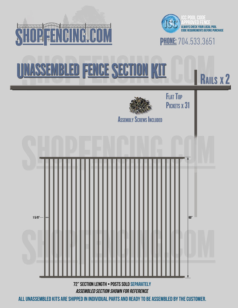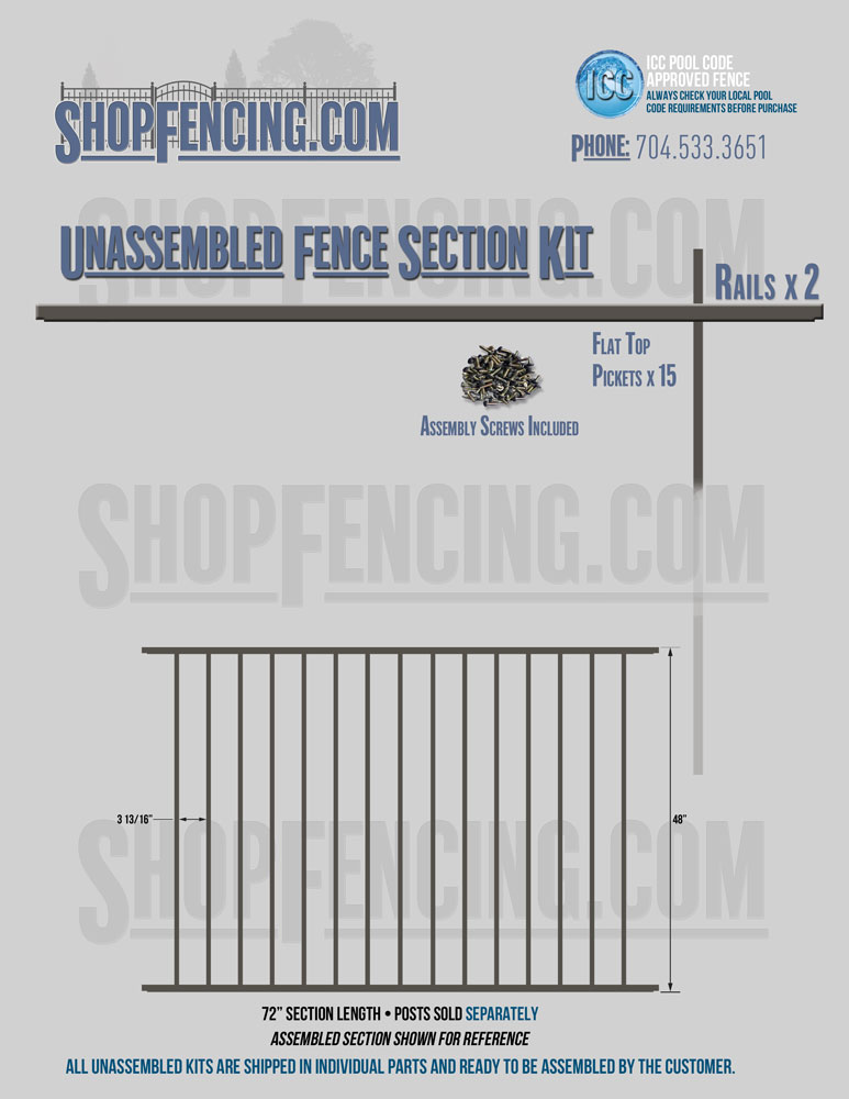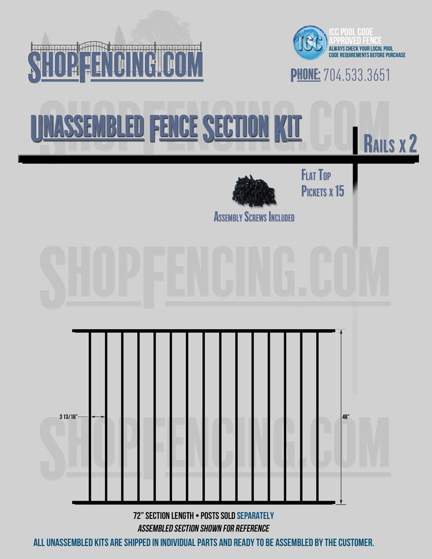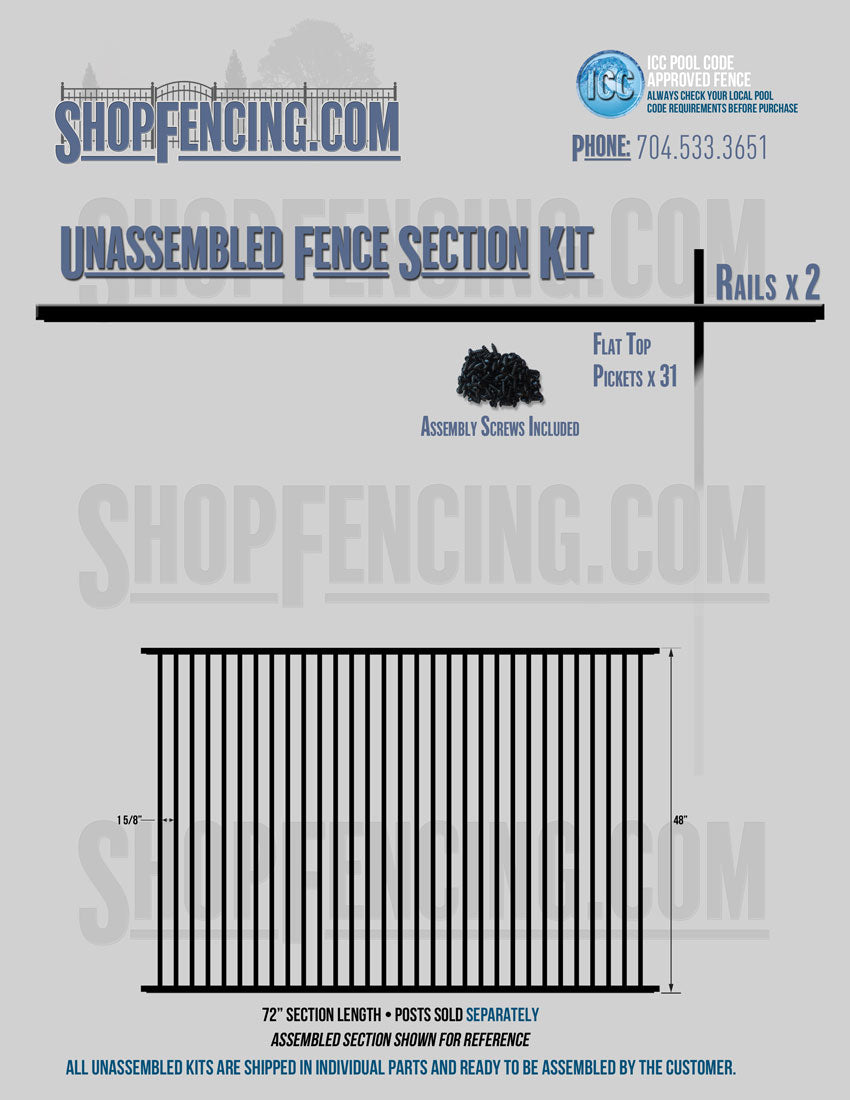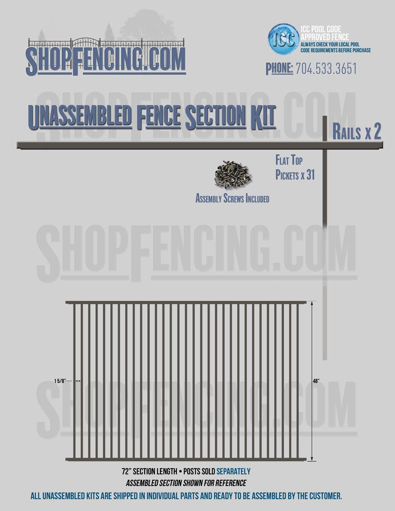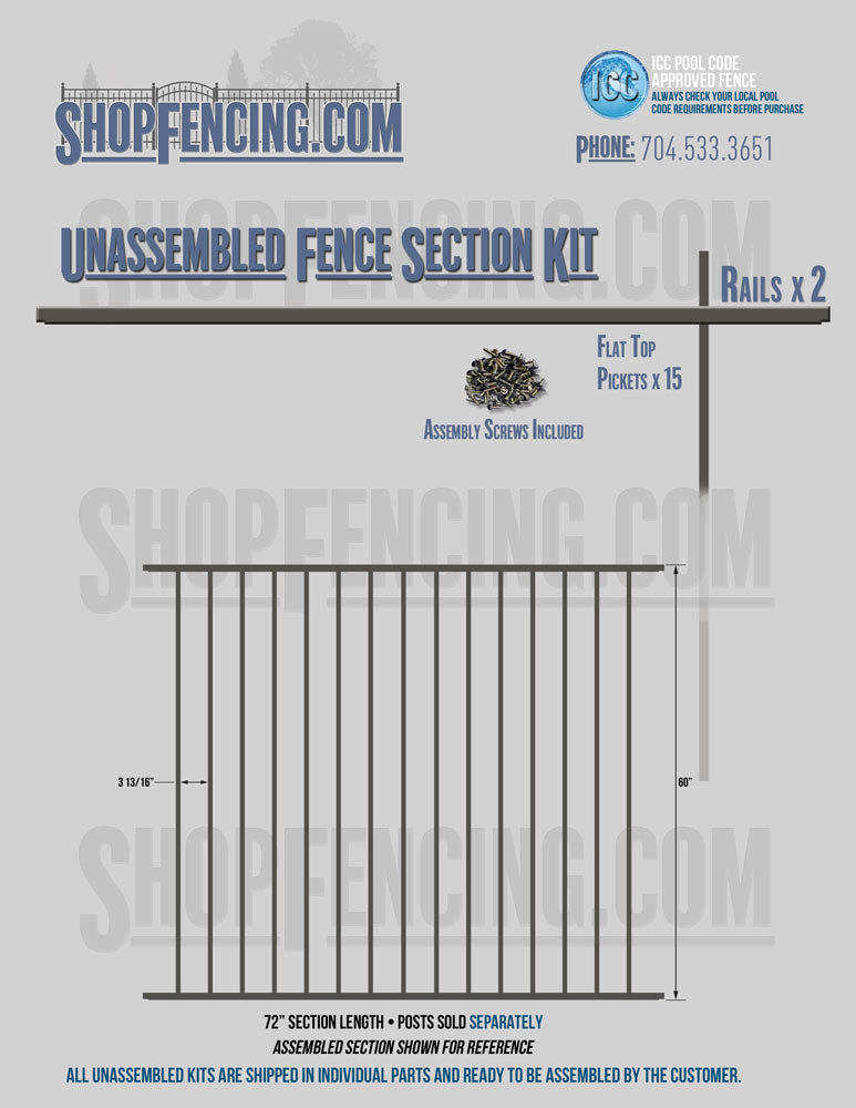 Assembled Fence Sections are completed fence sections ready for installation. All pickets are fastened to the rails and all rails are spaced to fit the matching style posts. Unassembled Fence Sections are shipped to you in kit form. Each kit will include rails, pickets and screws. For example, a Standard Picket, 3 Rail Fence Section kit would include, 3 Rails, 15 Pickets and 45 Screws. Please note that the assembly of fence sections is a labor intensive process. See our Assembly Instructions HERE.