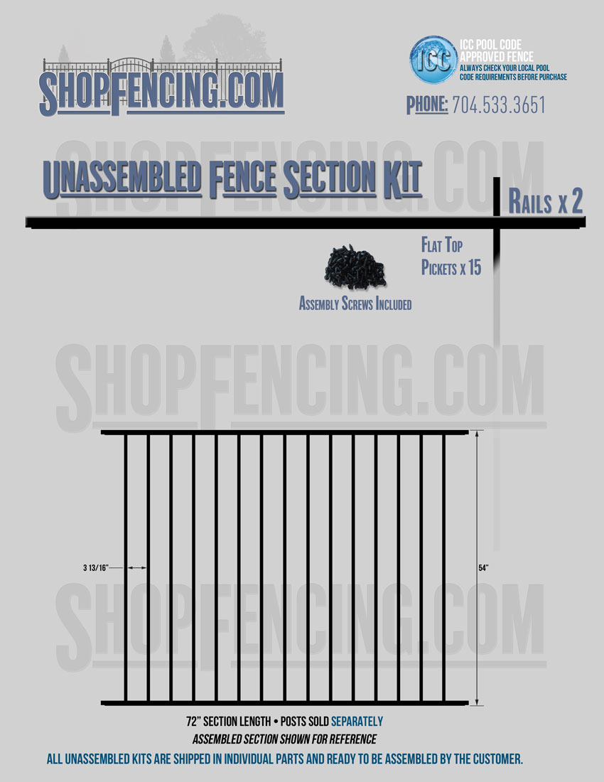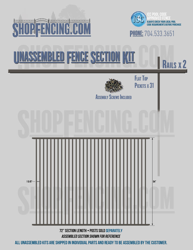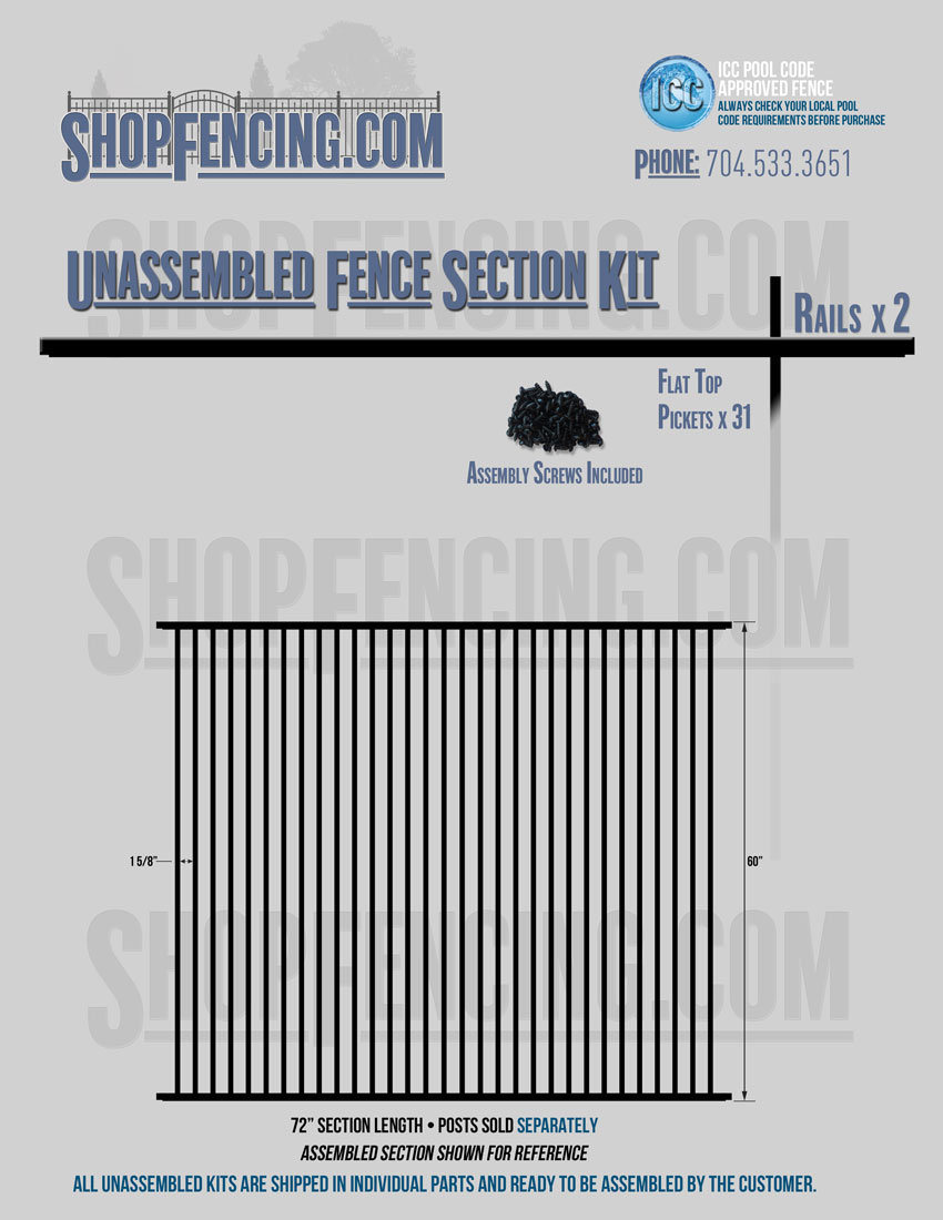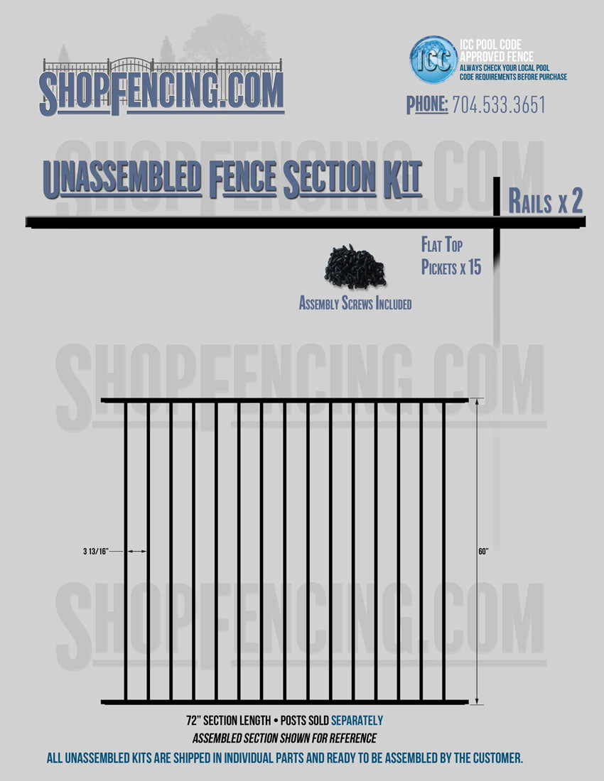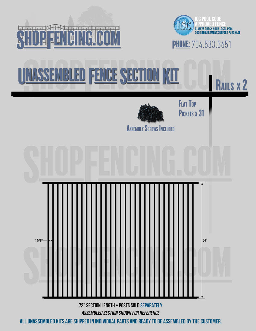 Assembled Fence Sections are completed fence sections ready for installation. All pickets are fastened to the rails and all rails are spaced to fit the matching style posts. Unassembled Fence Sections are shipped to you in kit form. Each kit will include rails, pickets and screws. For example, a Standard Picket, 3 Rail Fence Section kit would include, 3 Rails, 15 Pickets and 45 Screws. Please note that the assembly of fence sections is a labor intensive process. See our Assembly Instructions HERE.