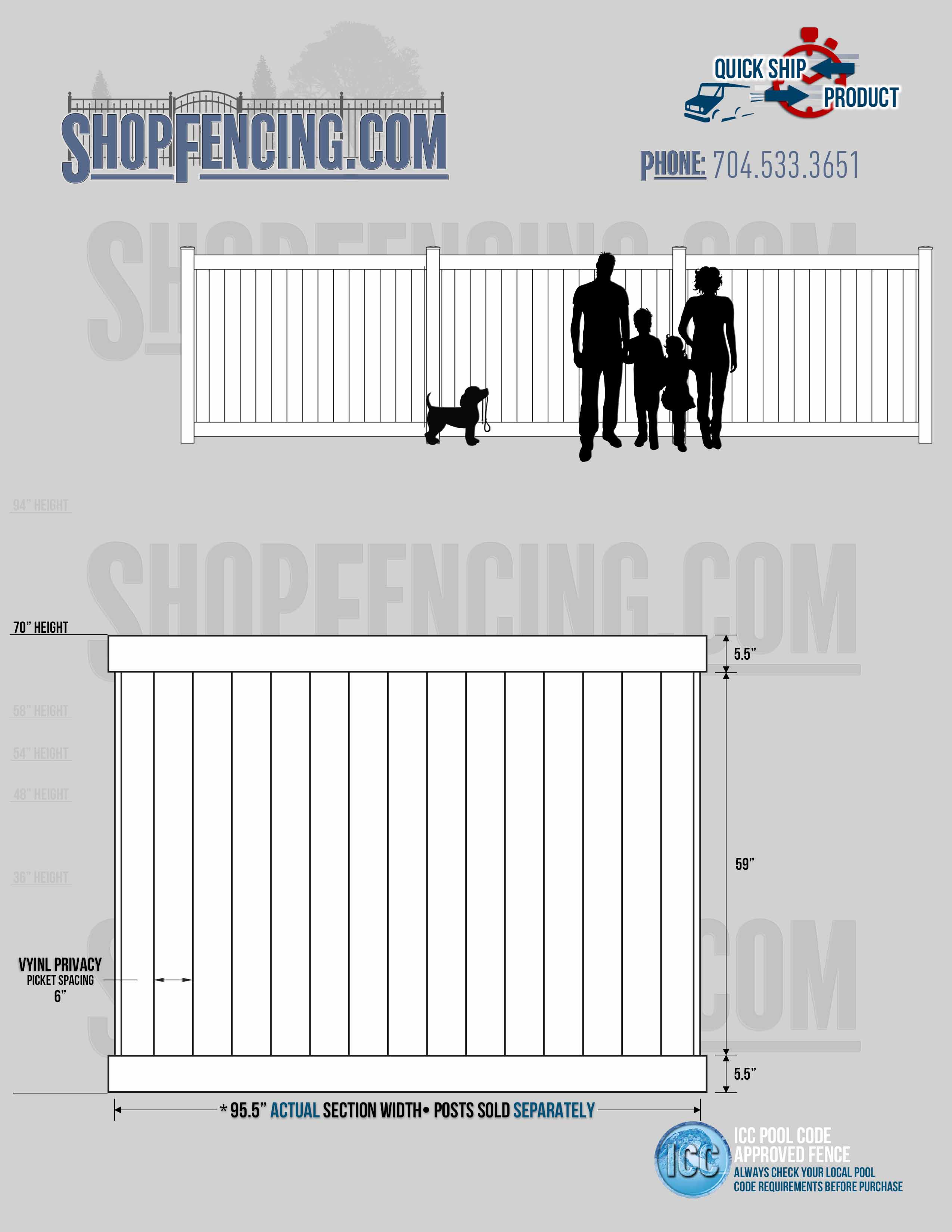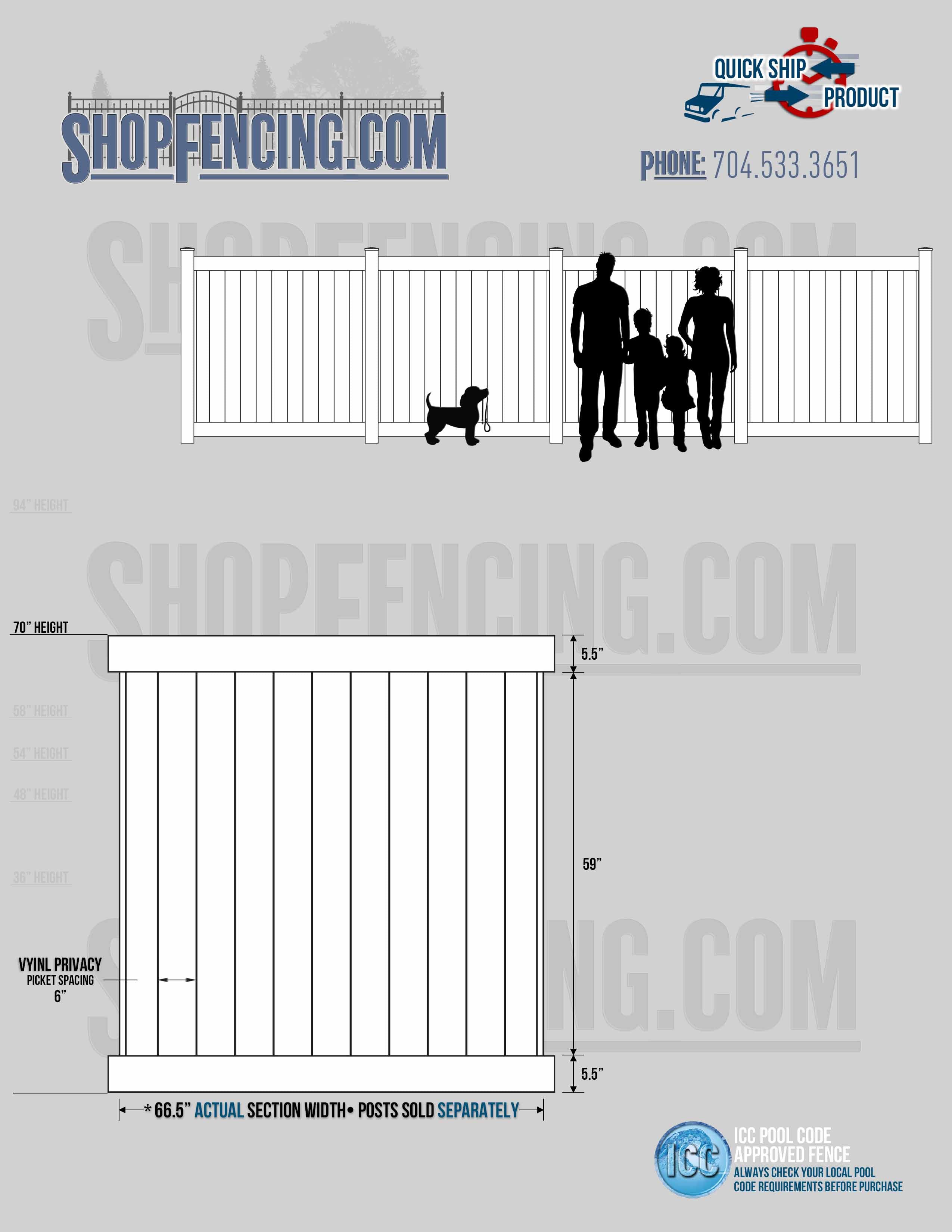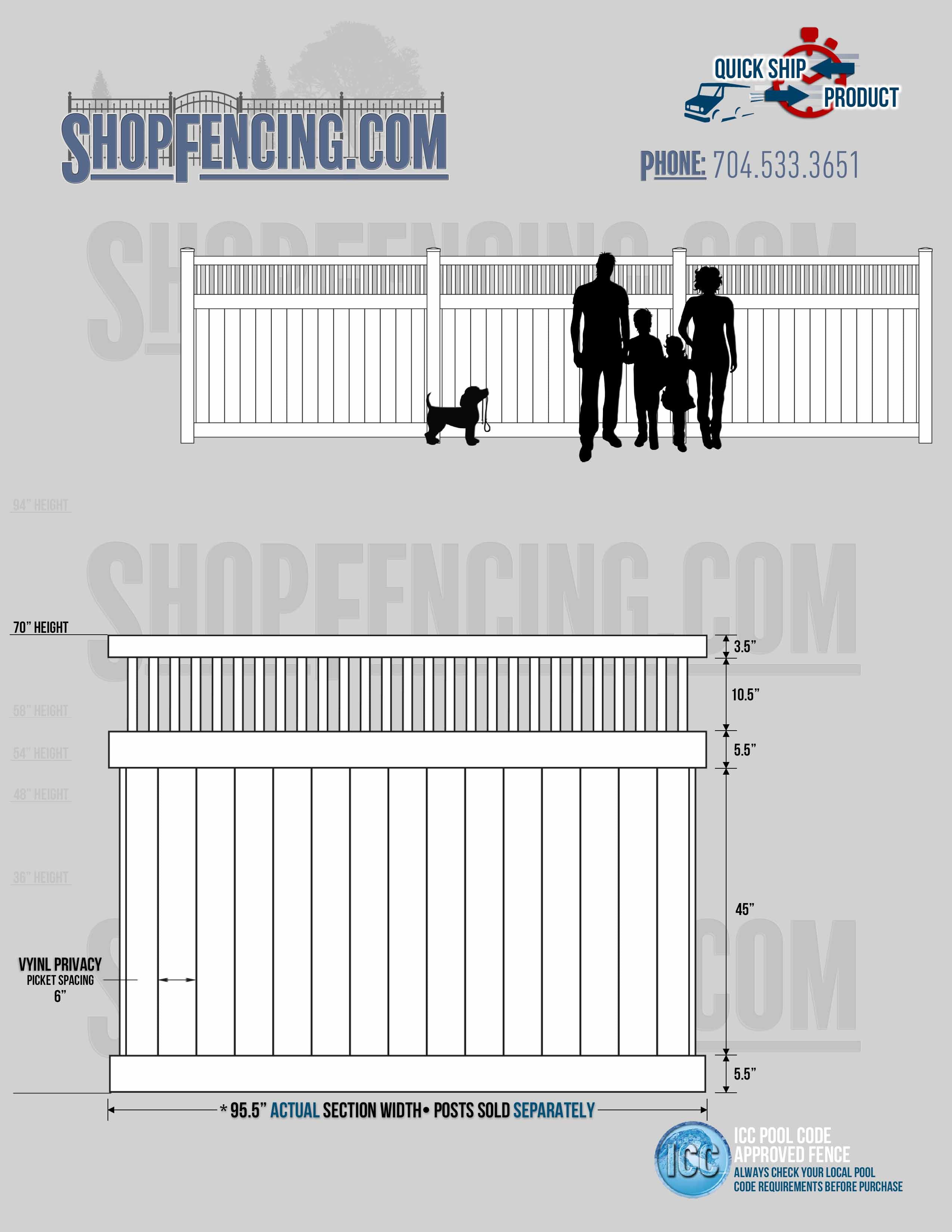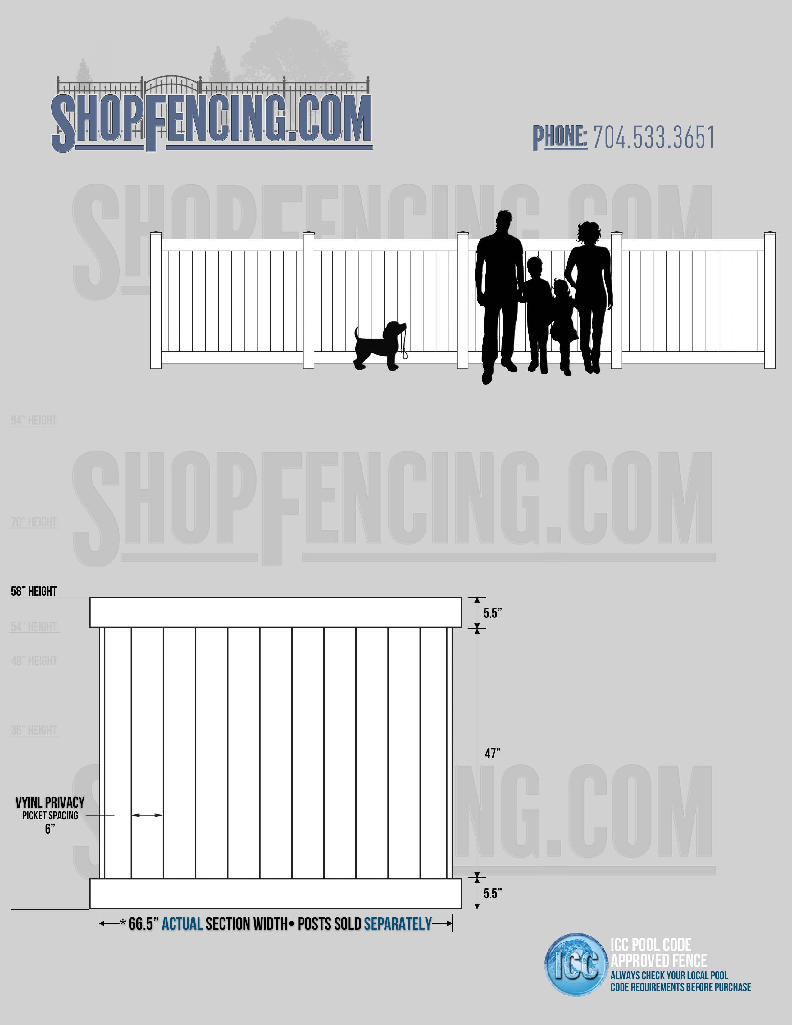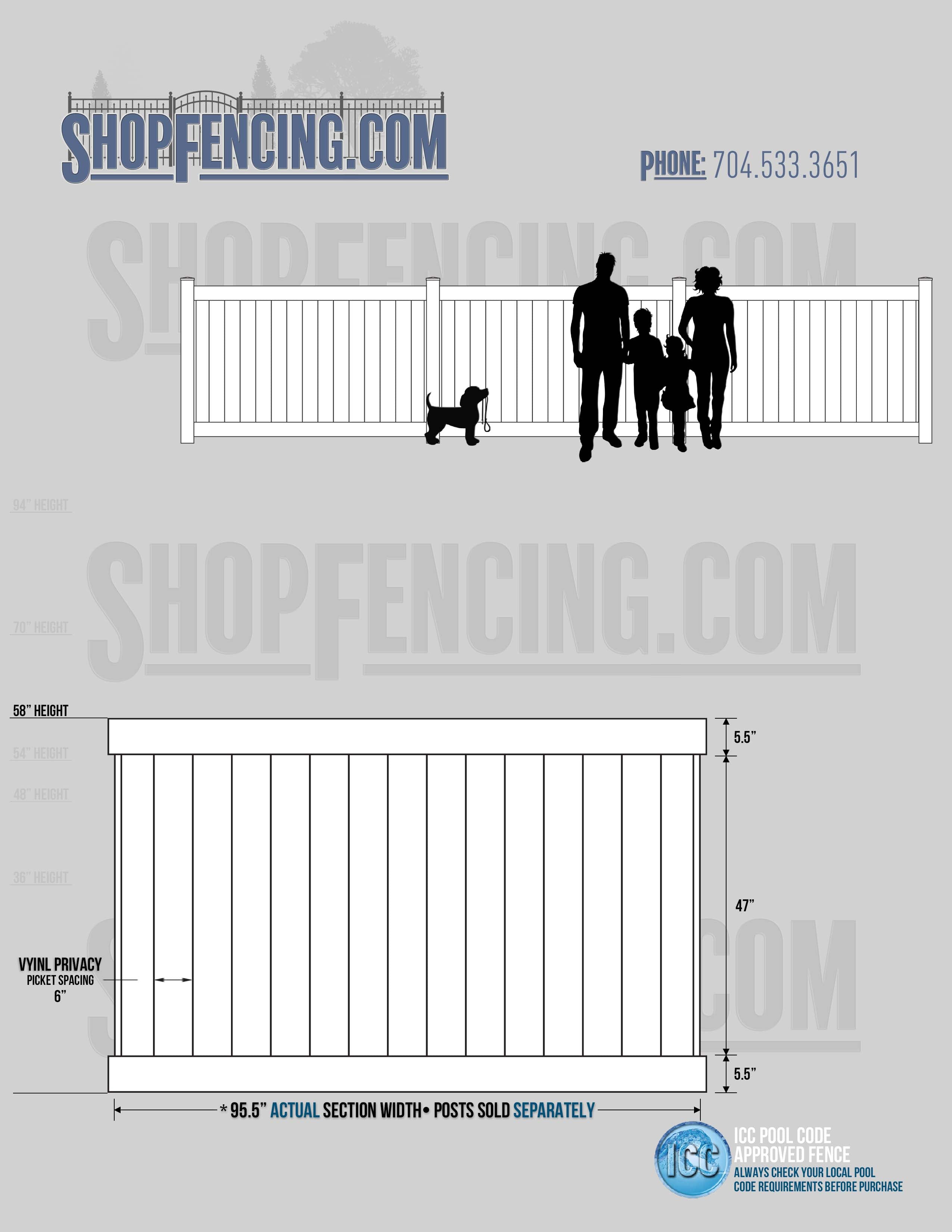 - Privacy Vinyl Fencing ICC Pool Code Approved Heights: All Styles: 60", 72" and 96" Heights. Check your local pool codes before purchasing.